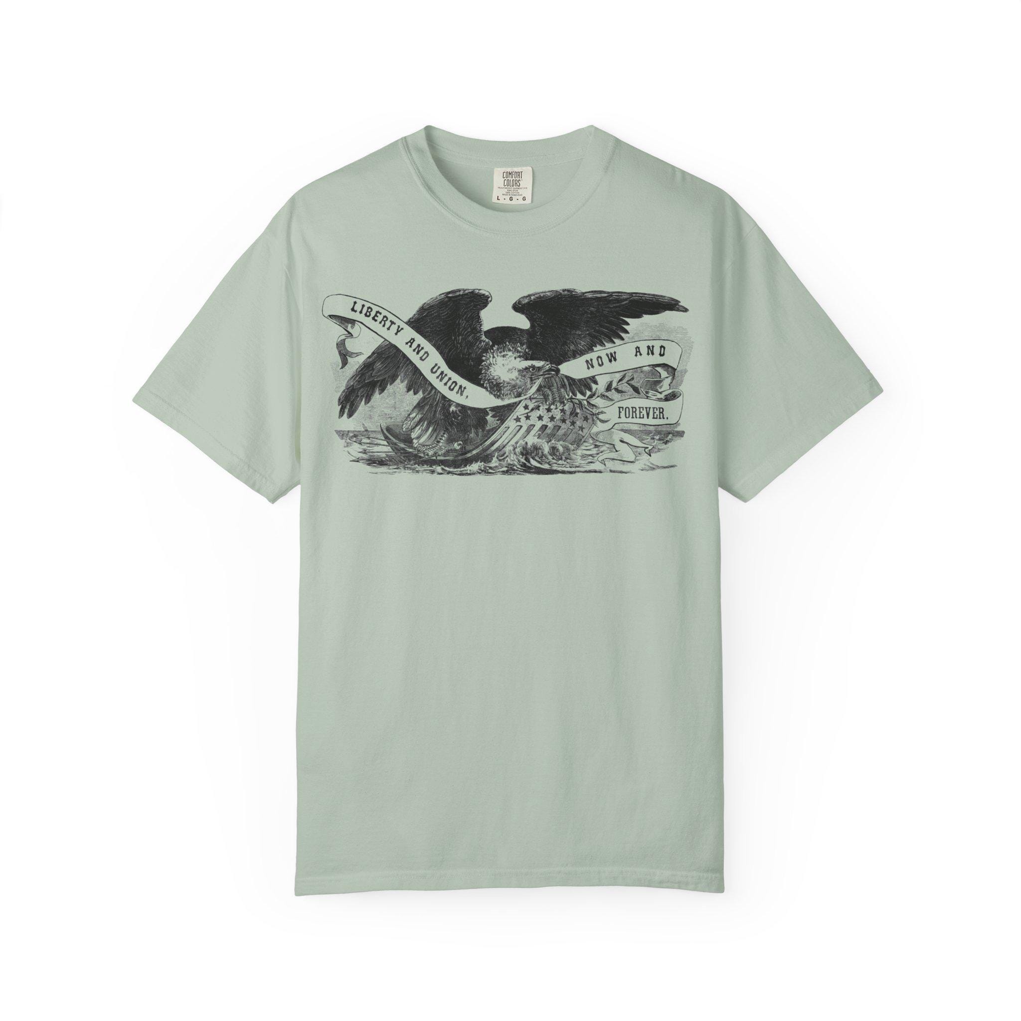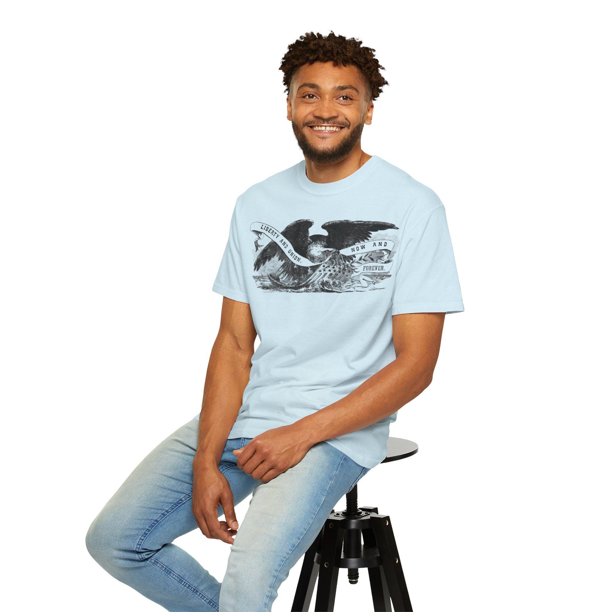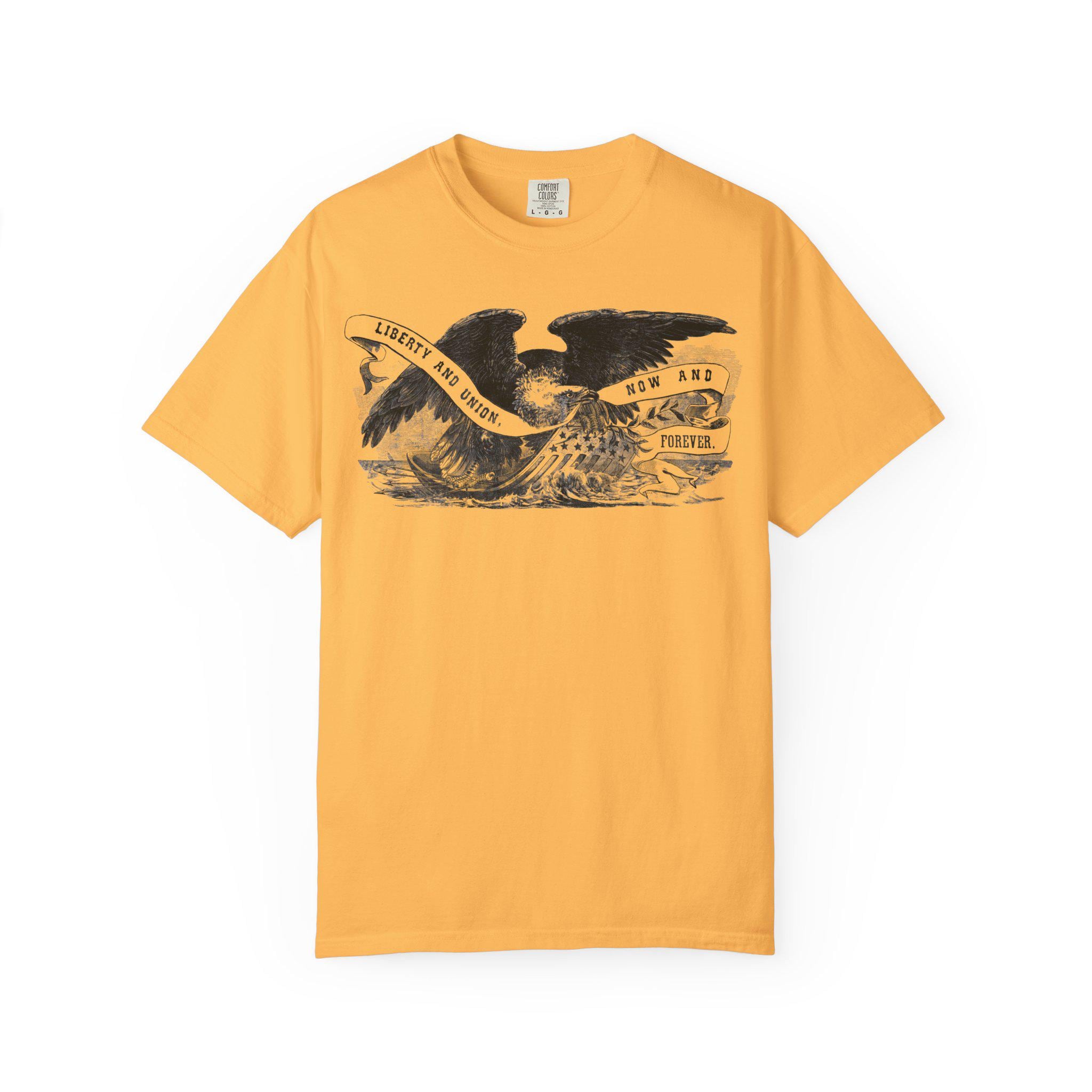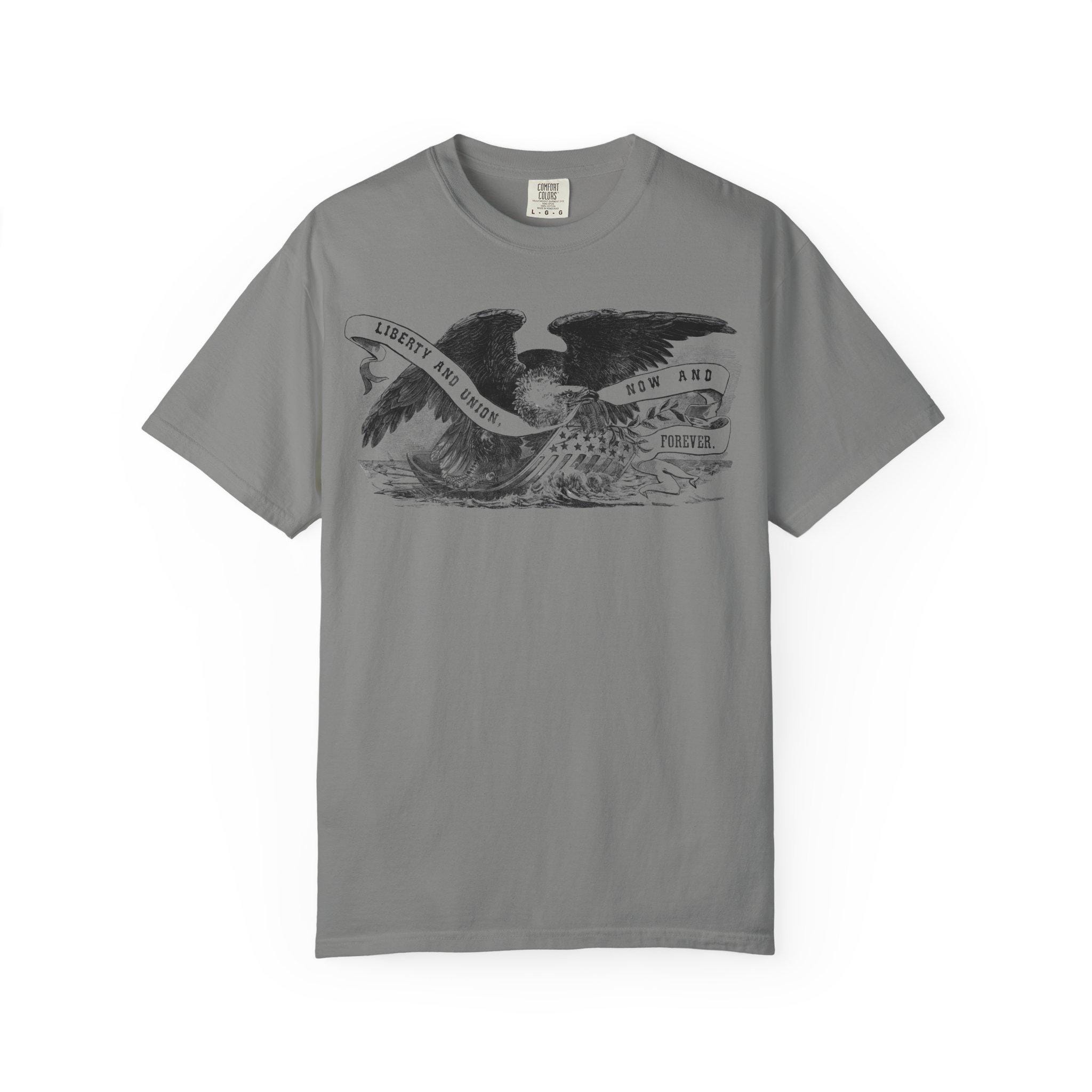 This T-shirt features a famous woodcut design by Pelouze & Son, with a motif from a Civil War recruitment poster, showcasing an eagle holding a banner reading 'Liberty and Union, Now and Forever'. The garment-dyed fabric gives it a soft color and texture, making it perfect for history enthusiasts and patriotic individuals. Ideal for patriotic holidays and historical celebrations.