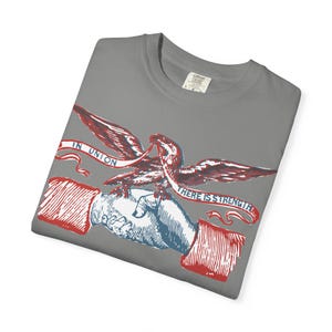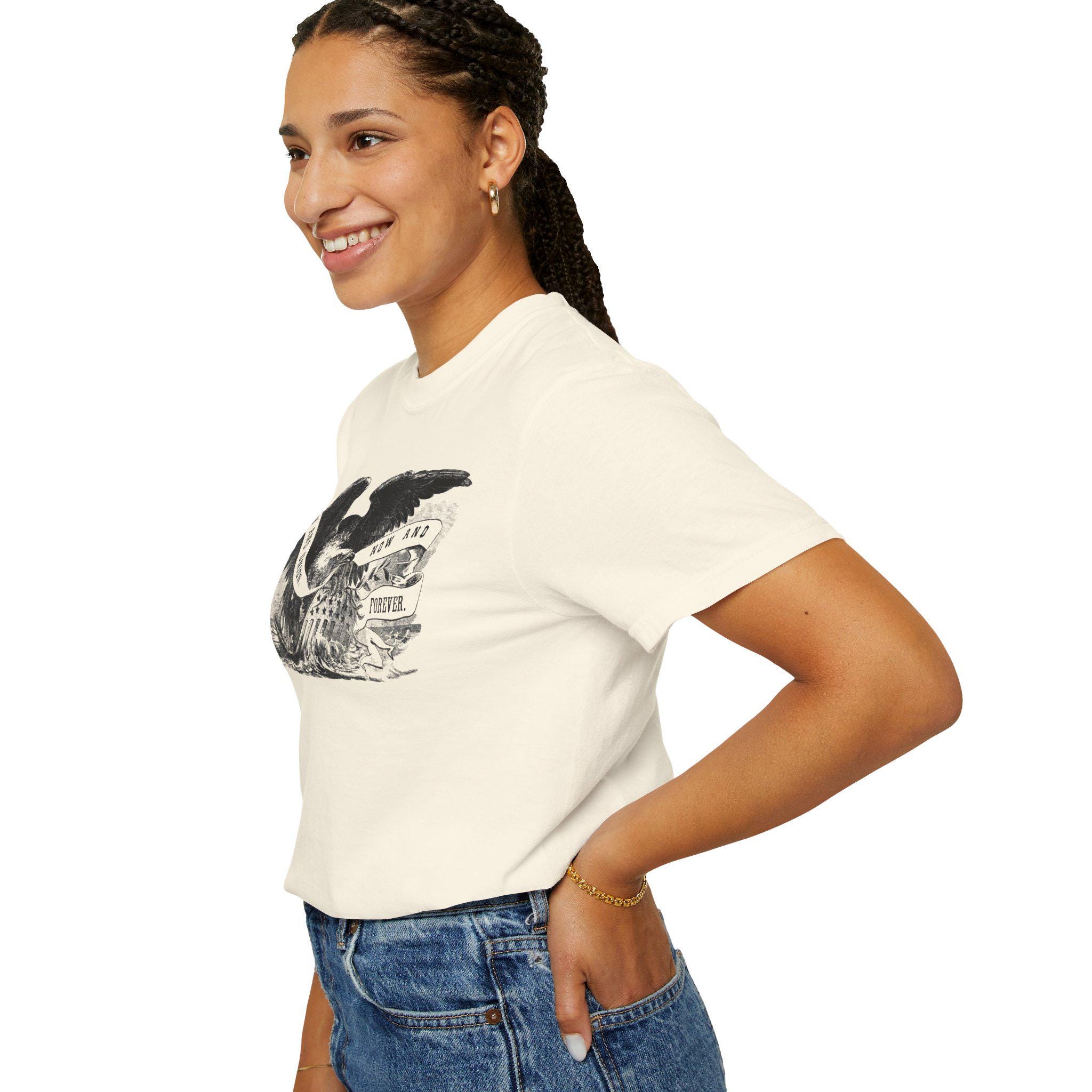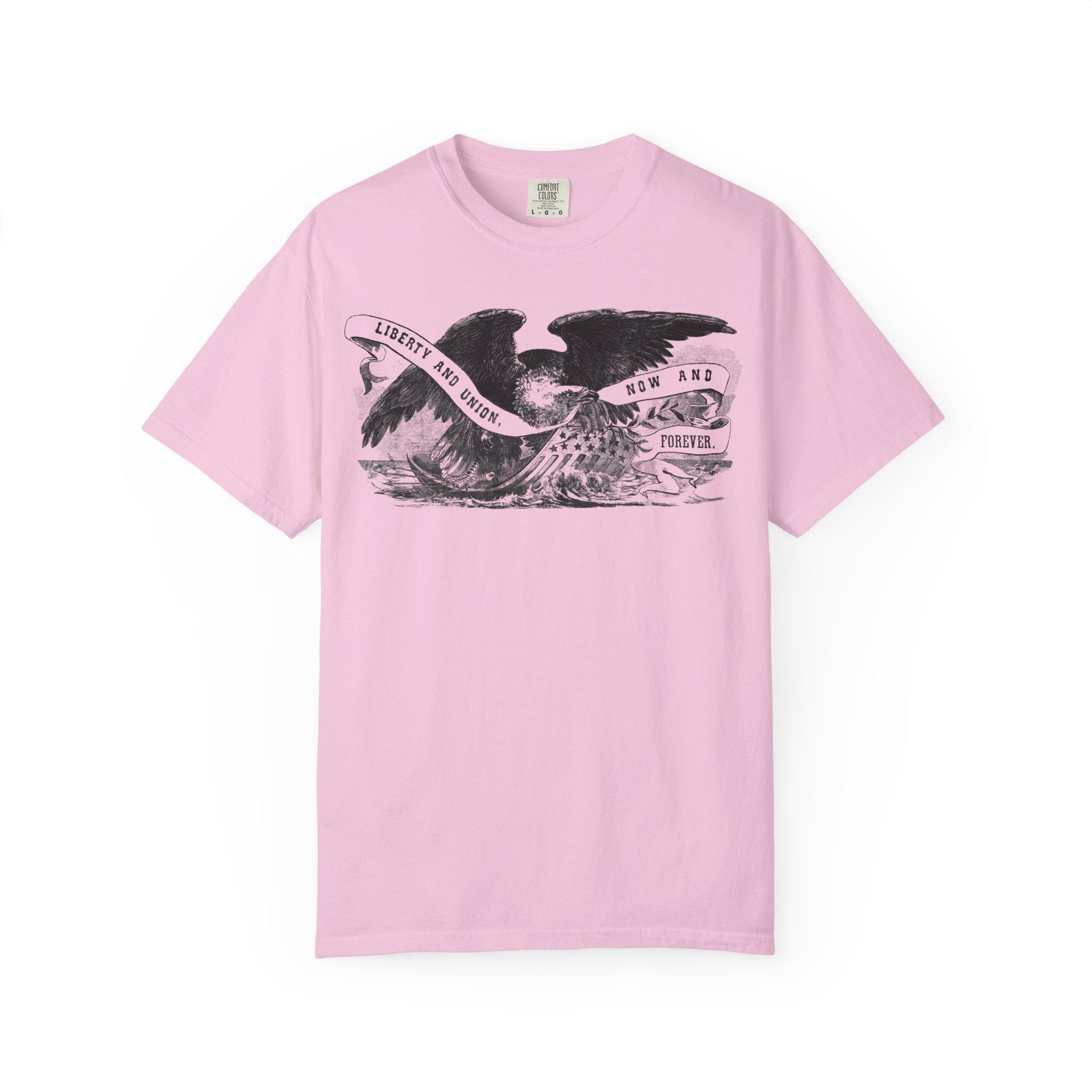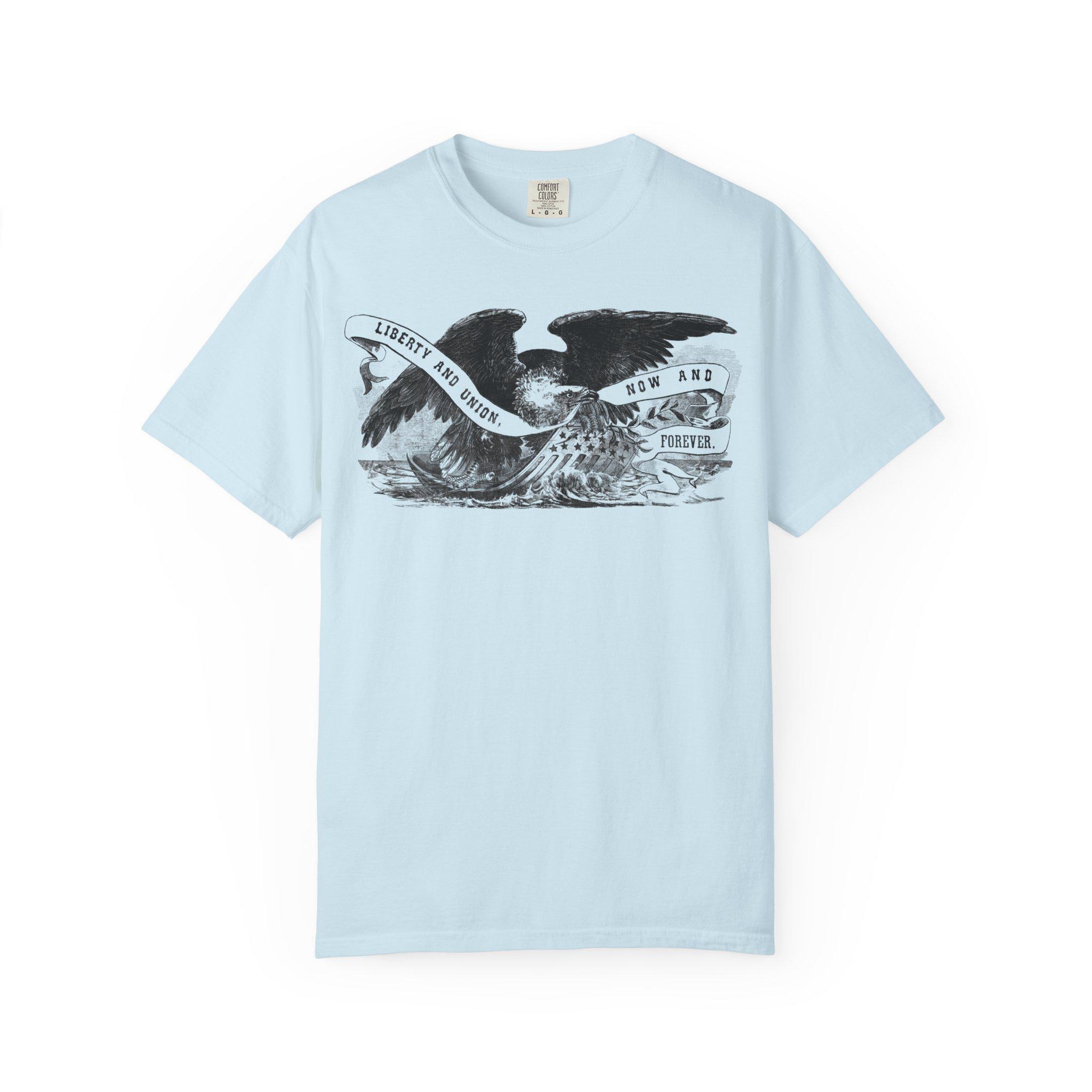 This T-shirt features a famous woodcut design by Pelouze & Son, with a motif from a Civil War recruitment poster, showcasing an eagle holding a banner reading 'Liberty and Union, Now and Forever'. The garment-dyed fabric gives it a soft color and texture, making it perfect for history enthusiasts and patriotic individuals. Ideal for patriotic holidays and historical celebrations.