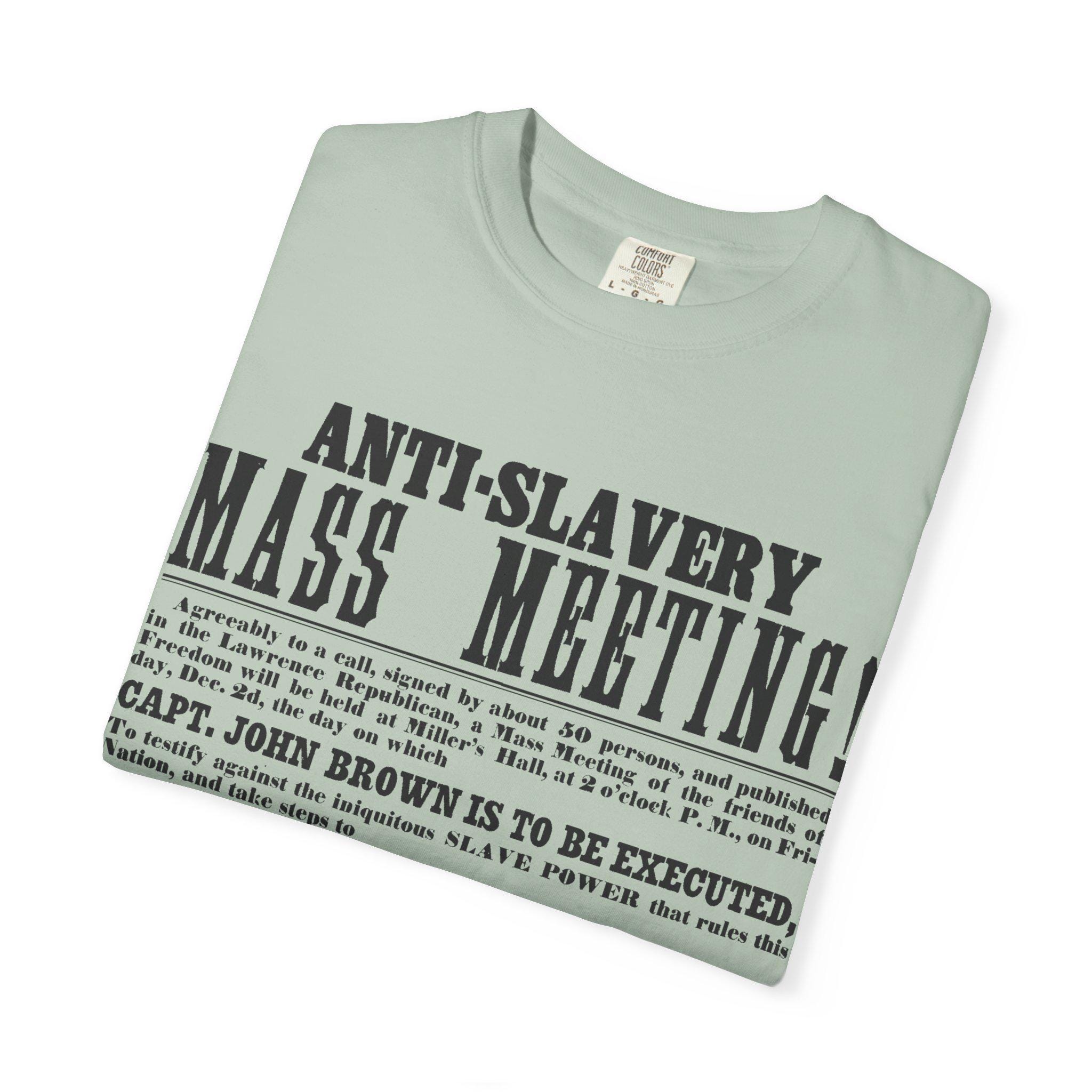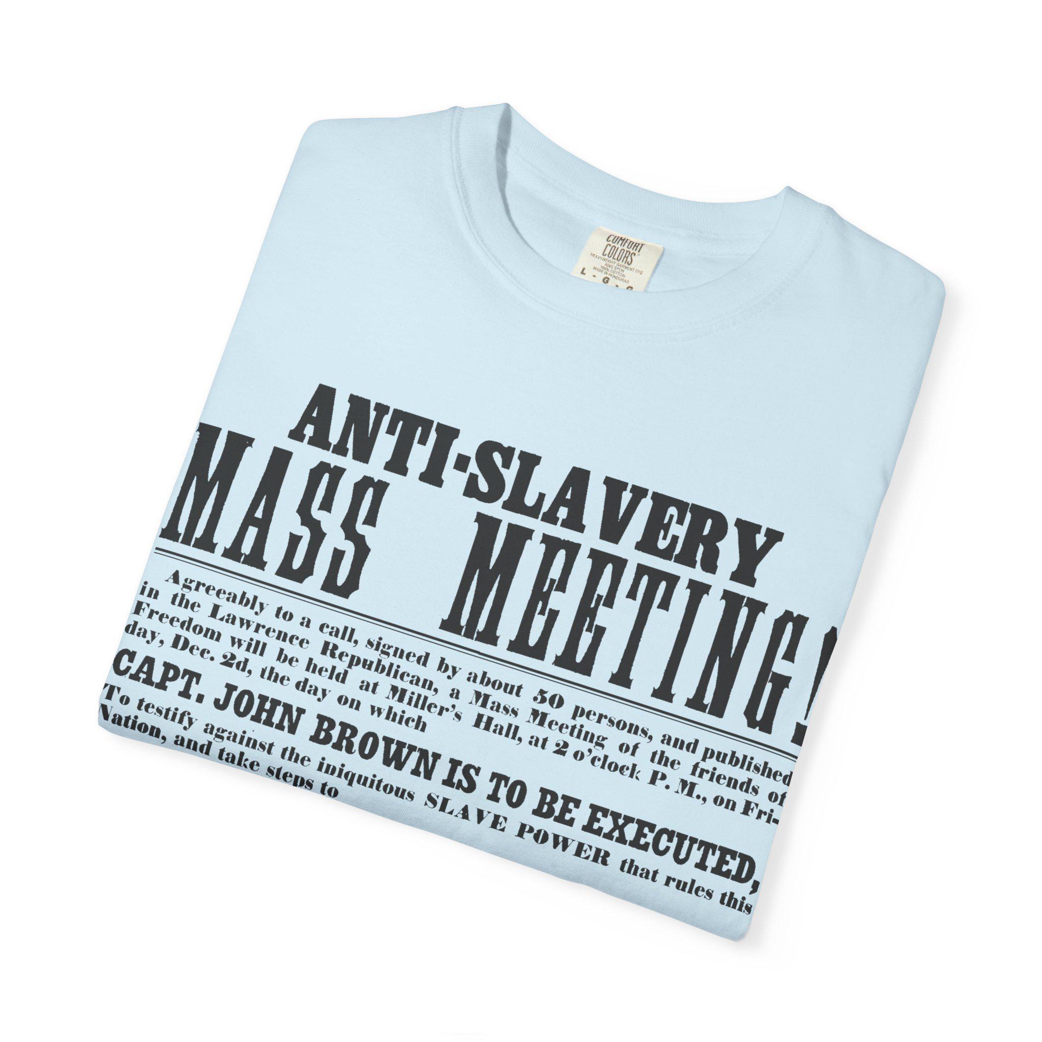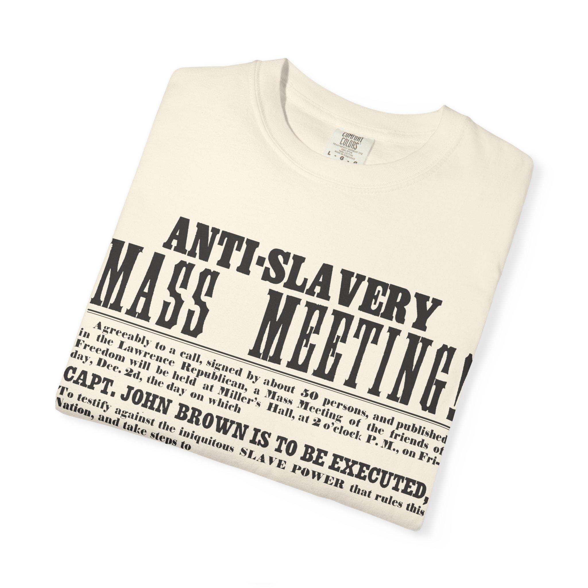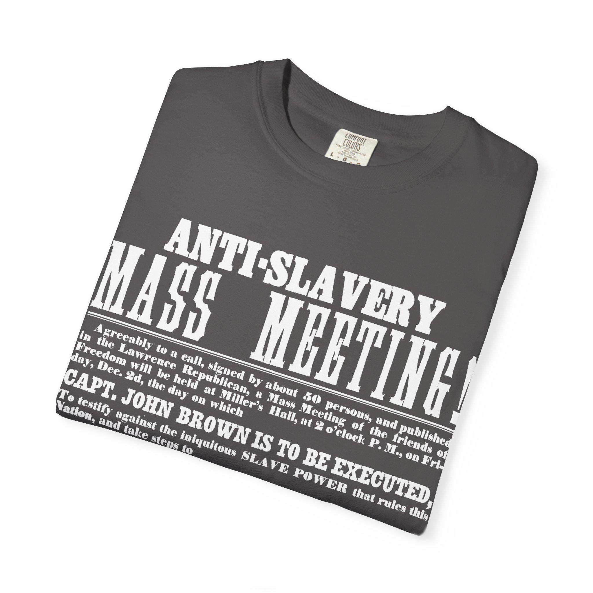 Vintage-inspired t-shirt featuring a design inspired by an old flyer for an 1859 Anti-Slavery Mass Meeting. Perfect for history buffs, activists, and those who appreciate unique, retro designs. Ideal for casual wear or making a statement. Great for Juneteenth, Black History Month, and other social justice observances.