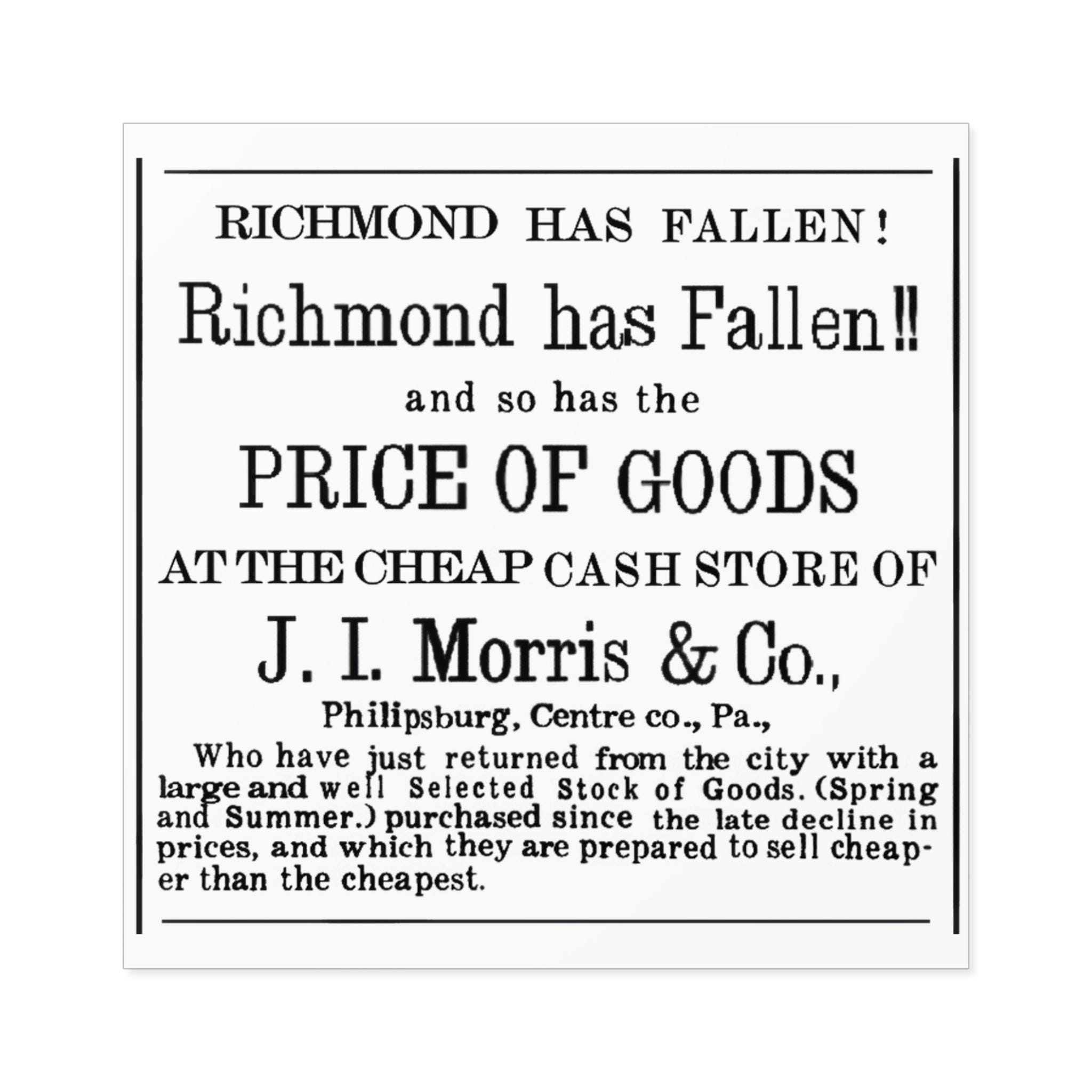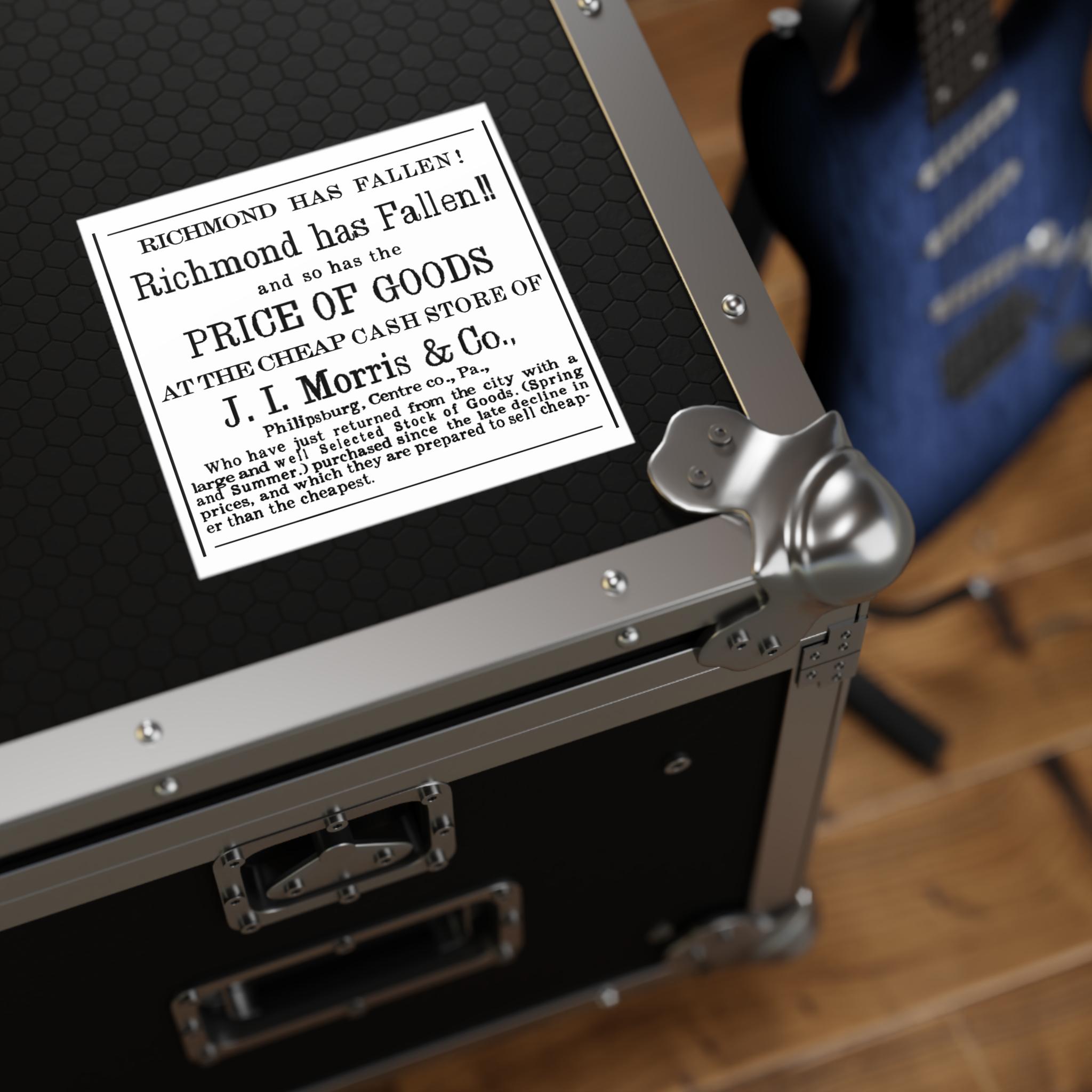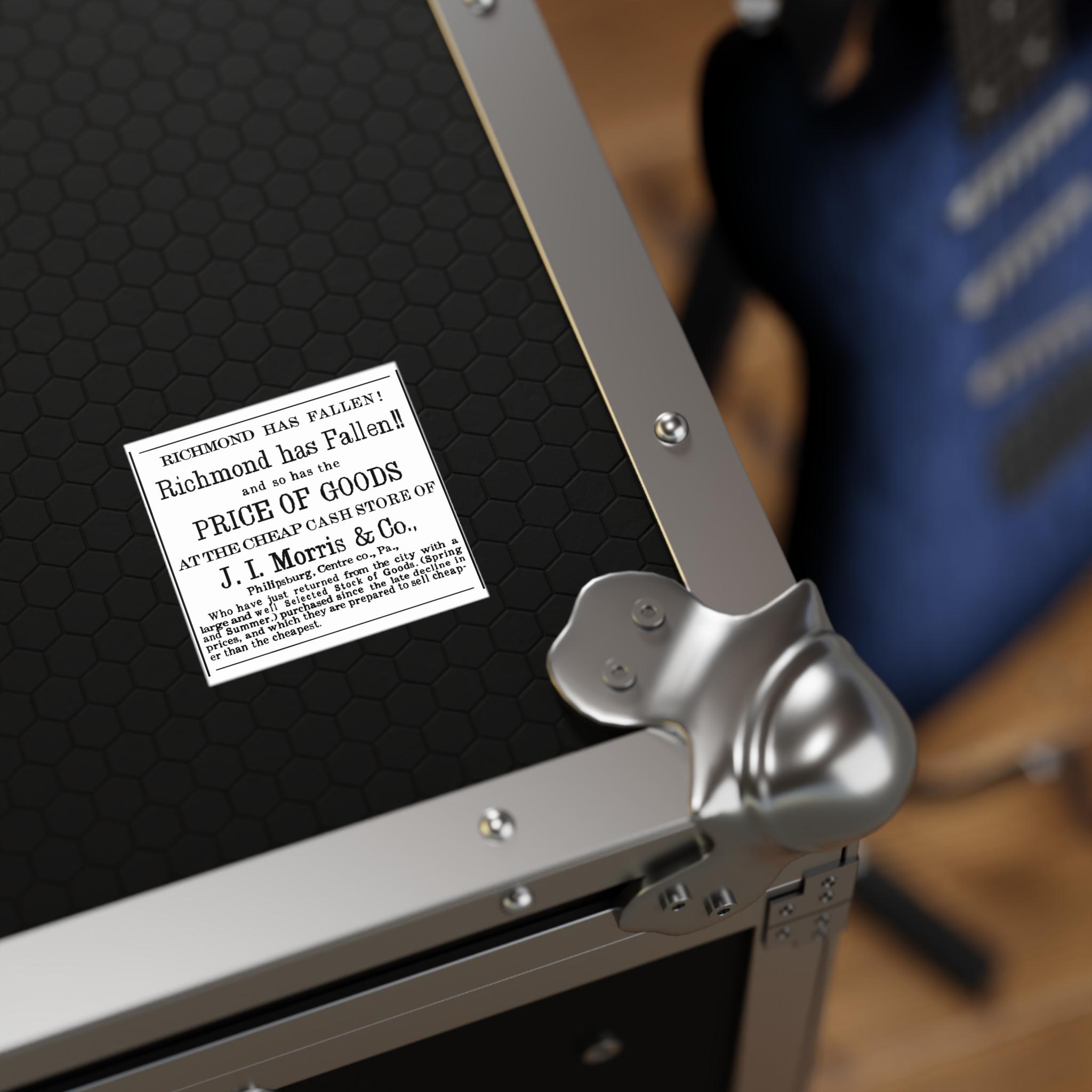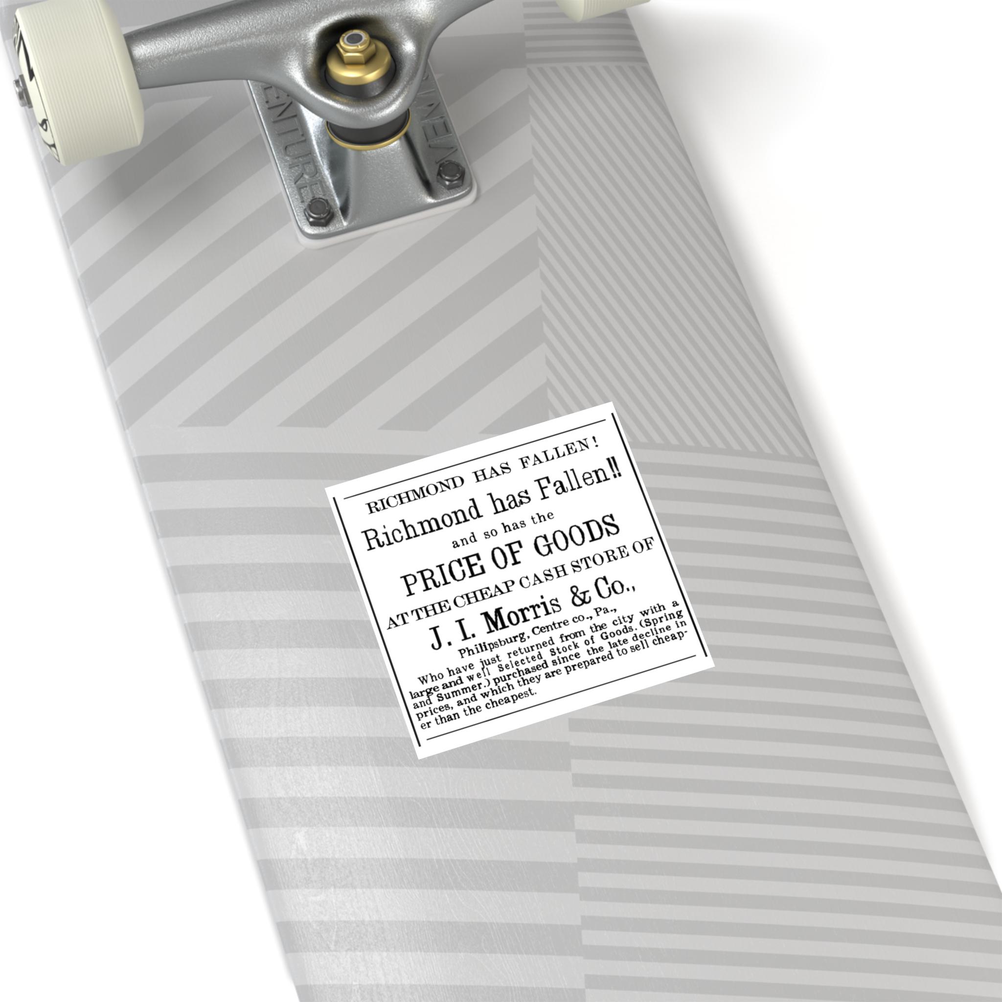 Humorous square stickers featuring a 1865 newspaper ad celebrating the fall of Richmond to Union forces, victory over the Confederacy, with a comparison to falling prices. These vibrant and durable stickers are perfect for indoor or outdoor use, adding a unique touch to your belongings. Ideal for history enthusiasts, American Civil War buffs, and anyone looking to add a touch of wit to their decor. Great for patriotic holidays, Civil War reenactments, and historical events.