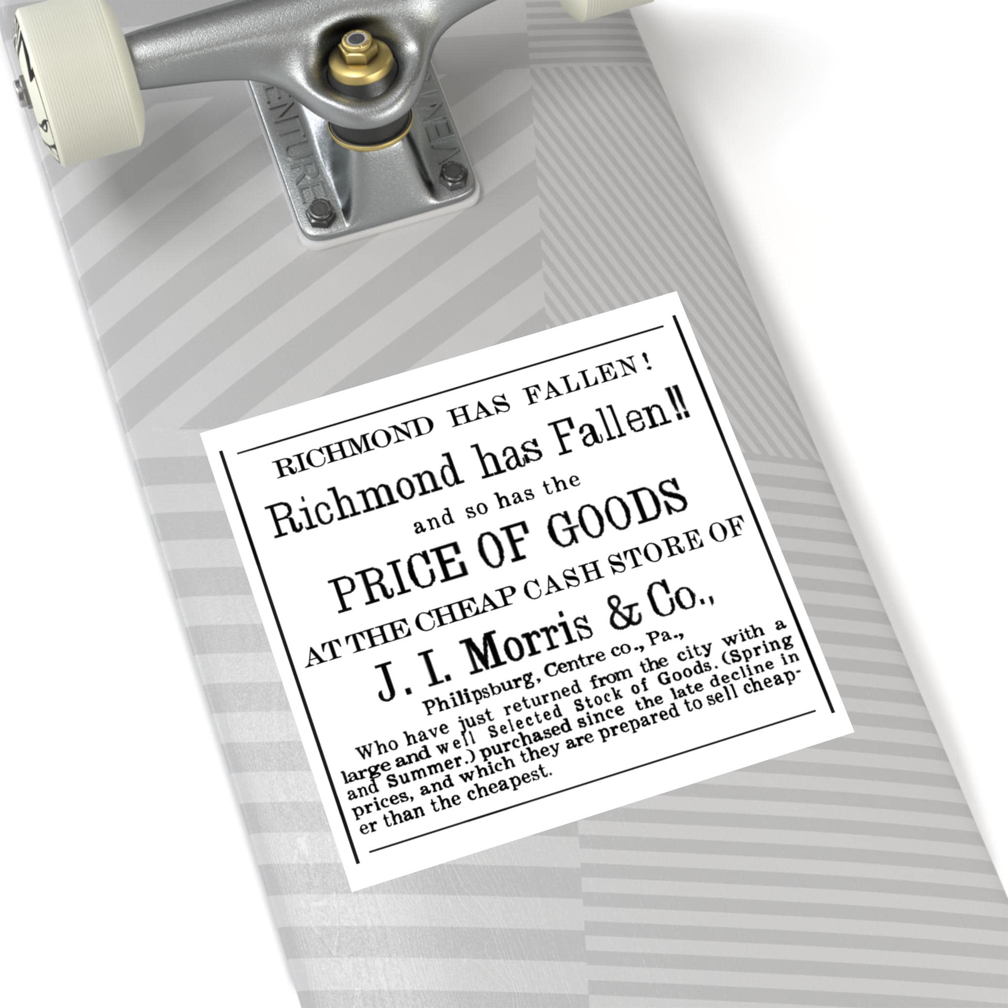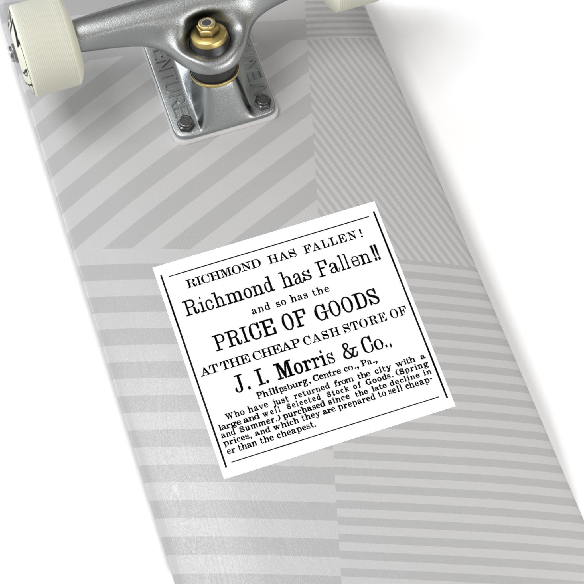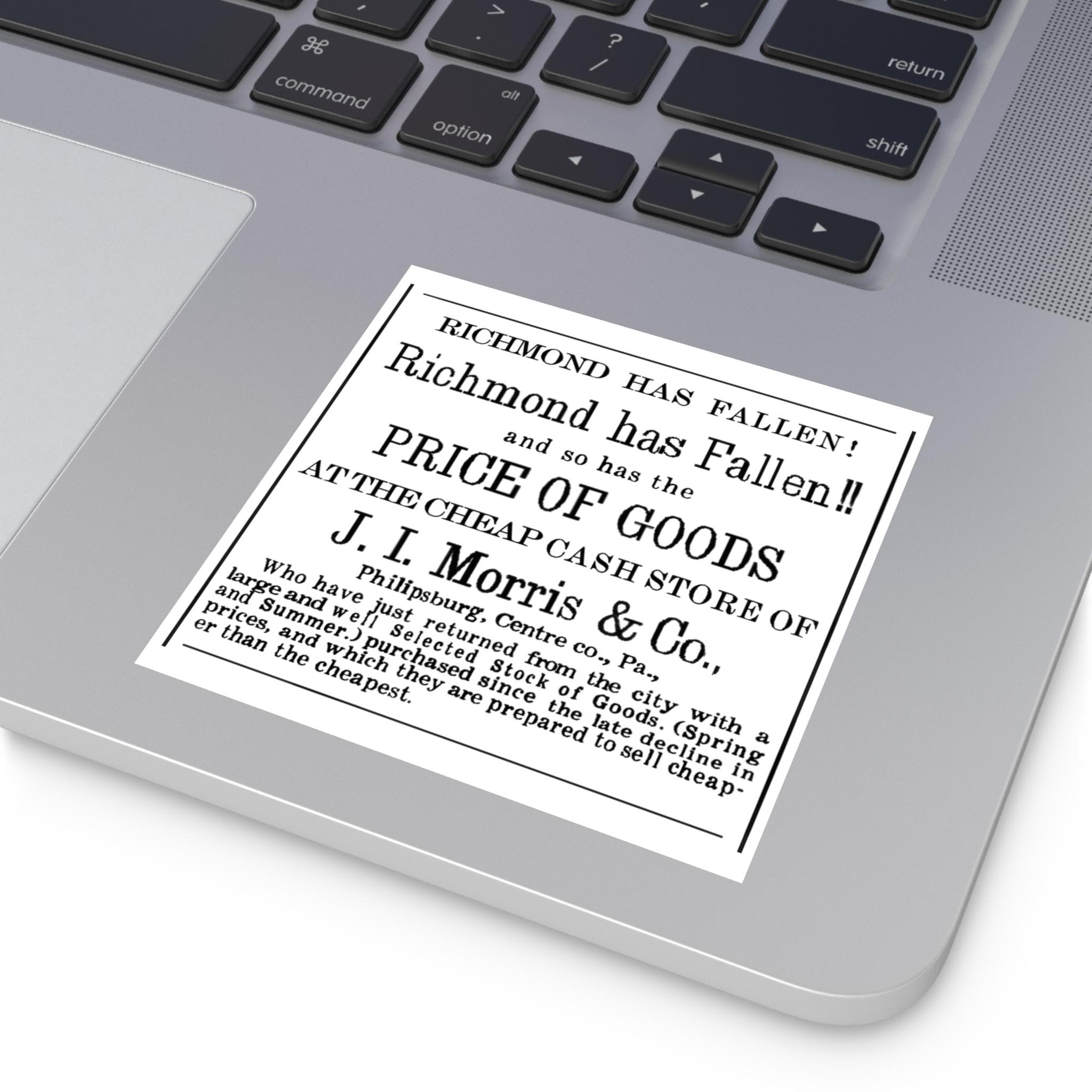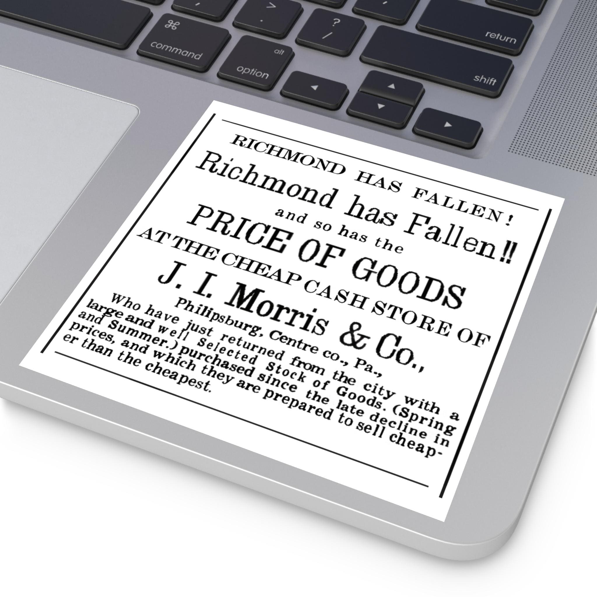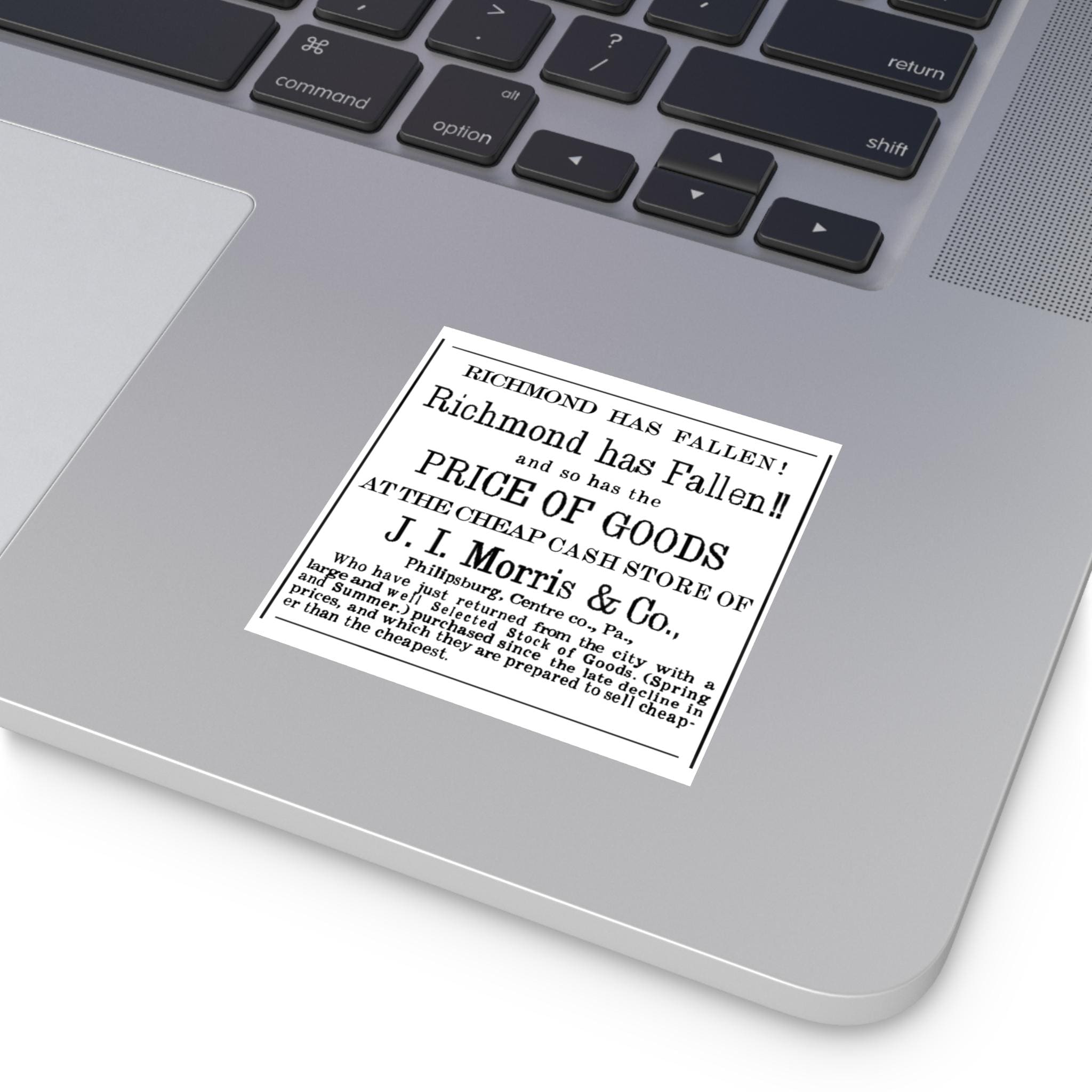 Humorous square stickers featuring a 1865 newspaper ad celebrating the fall of Richmond to Union forces, victory over the Confederacy, with a comparison to falling prices. These vibrant and durable stickers are perfect for indoor or outdoor use, adding a unique touch to your belongings. Ideal for history enthusiasts, American Civil War buffs, and anyone looking to add a touch of wit to their decor. Great for patriotic holidays, Civil War reenactments, and historical events.
