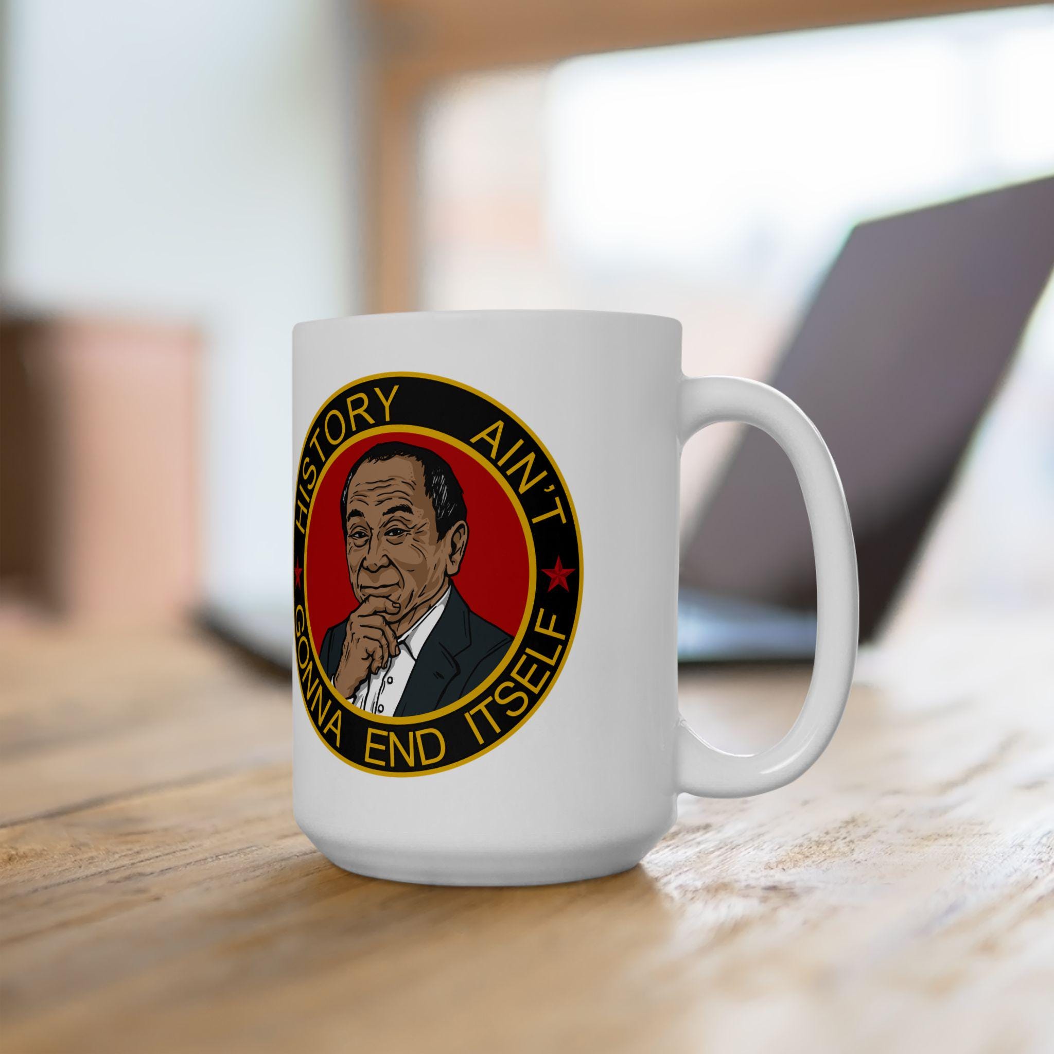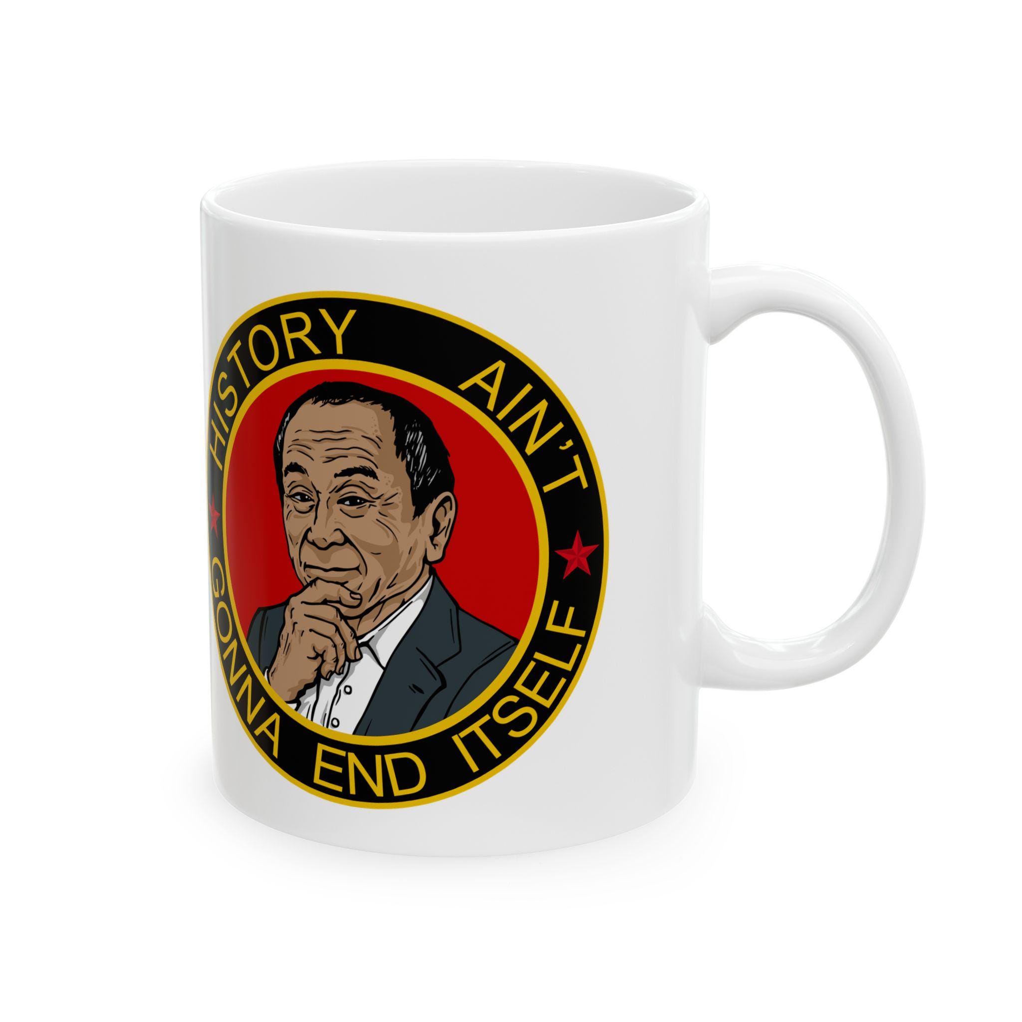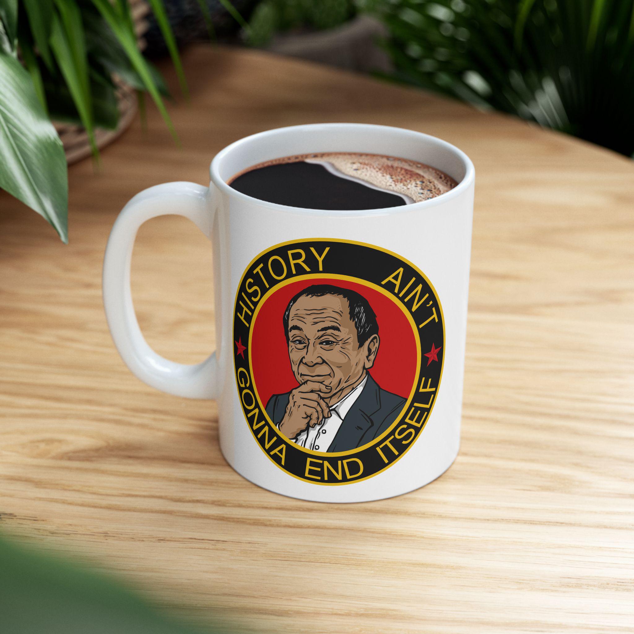 A ceramic mug featuring a morale patch with the motto 'History Ain't Gonna End Itself', giving off a cool and rugged vibe. Perfect for history buffs, military enthusiasts, or anyone looking to add a unique touch to their daily coffee routine. Ideal for holidays, birthdays, or any special occasion.