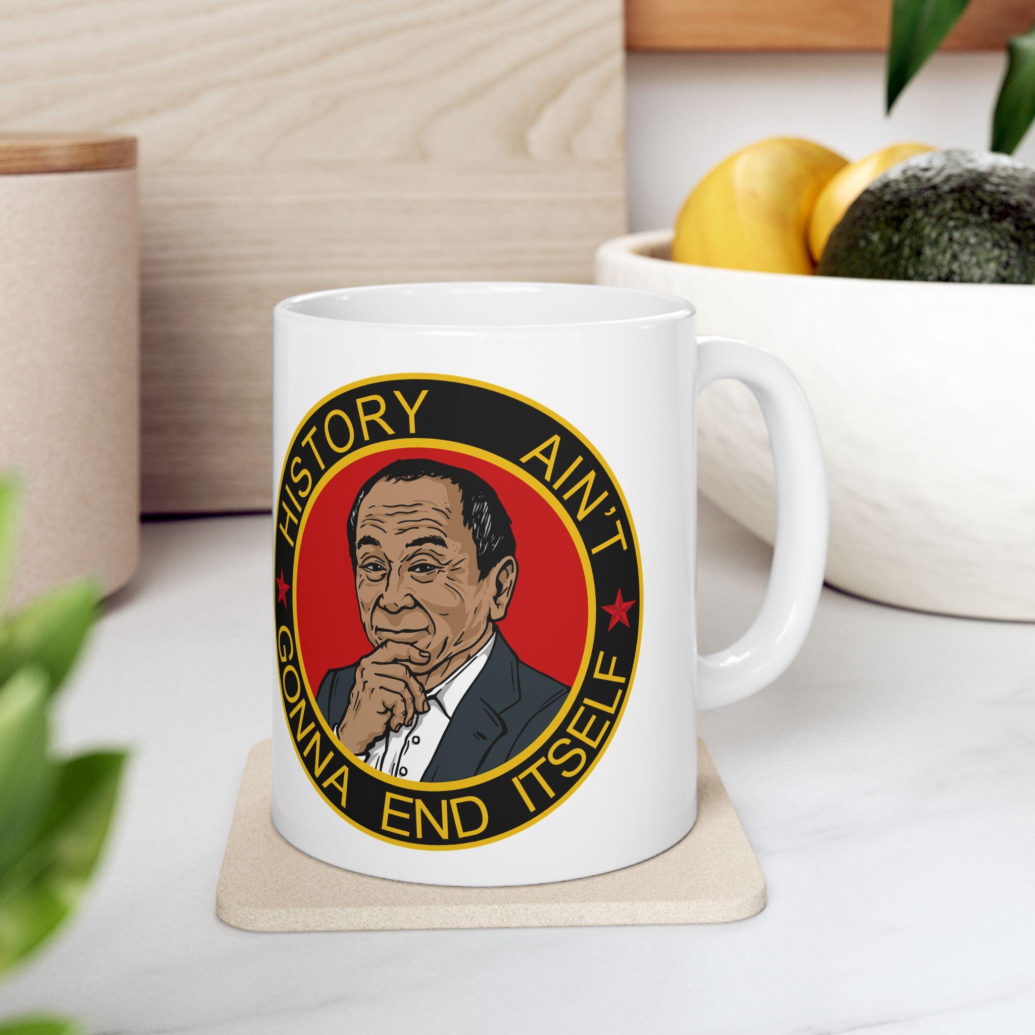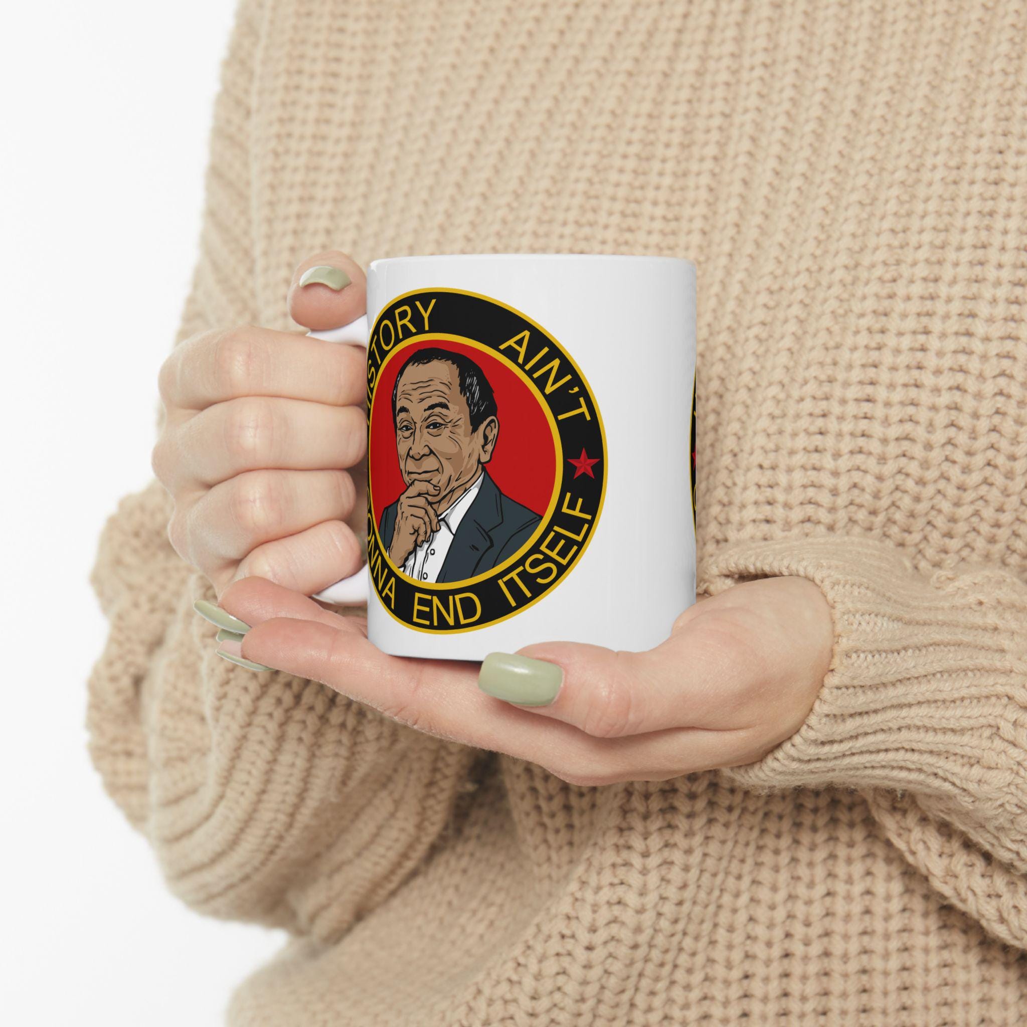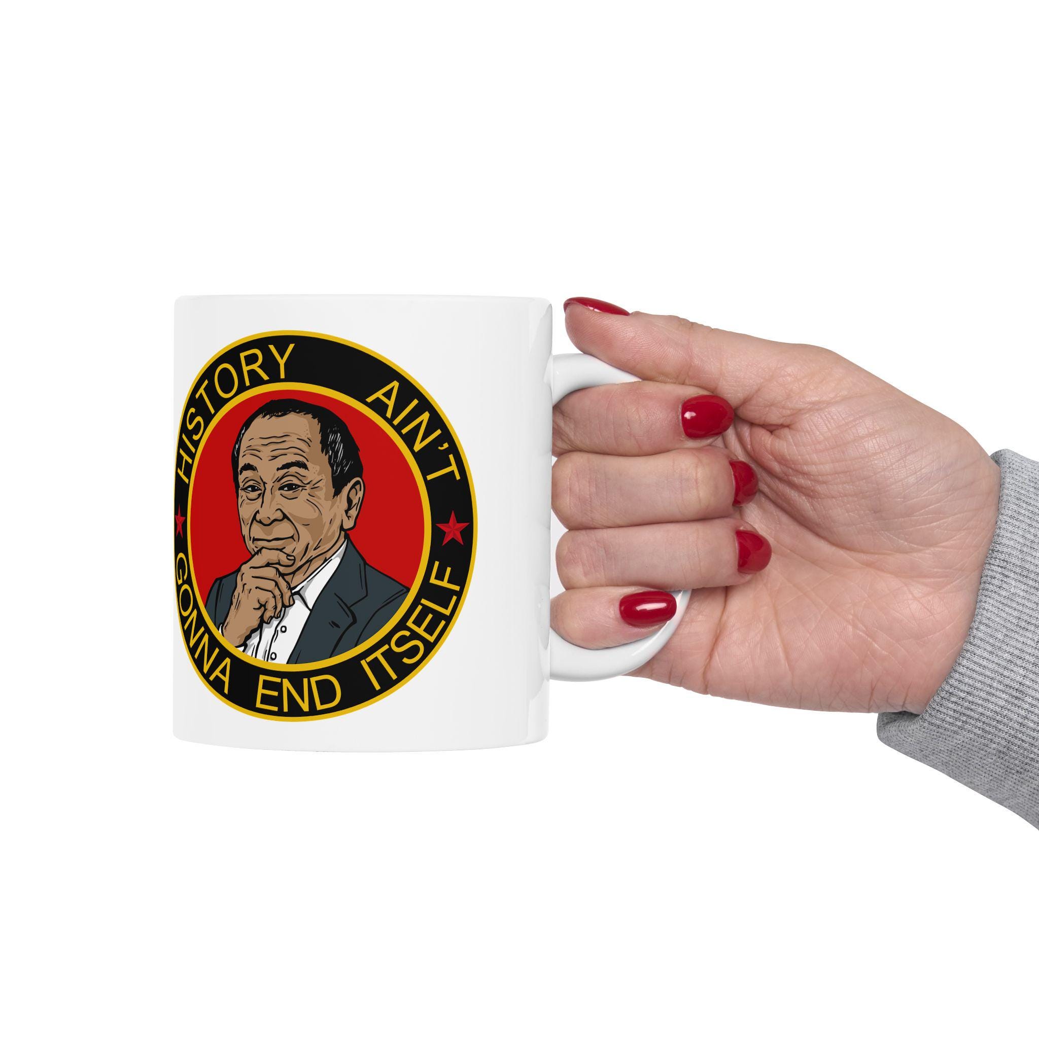 A ceramic mug featuring a morale patch with the motto 'History Ain't Gonna End Itself', giving off a cool and rugged vibe. Perfect for history buffs, military enthusiasts, or anyone looking to add a unique touch to their daily coffee routine. Ideal for holidays, birthdays, or any special occasion.