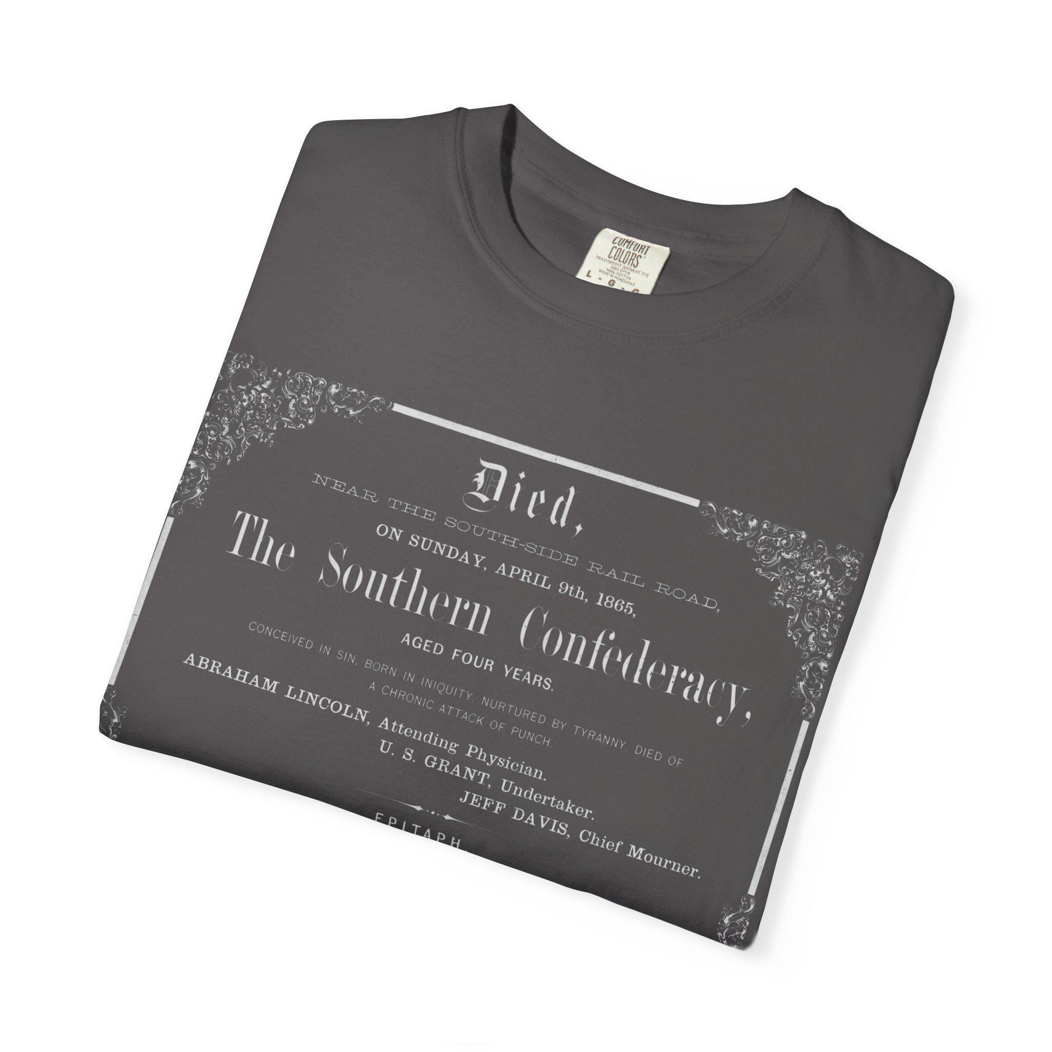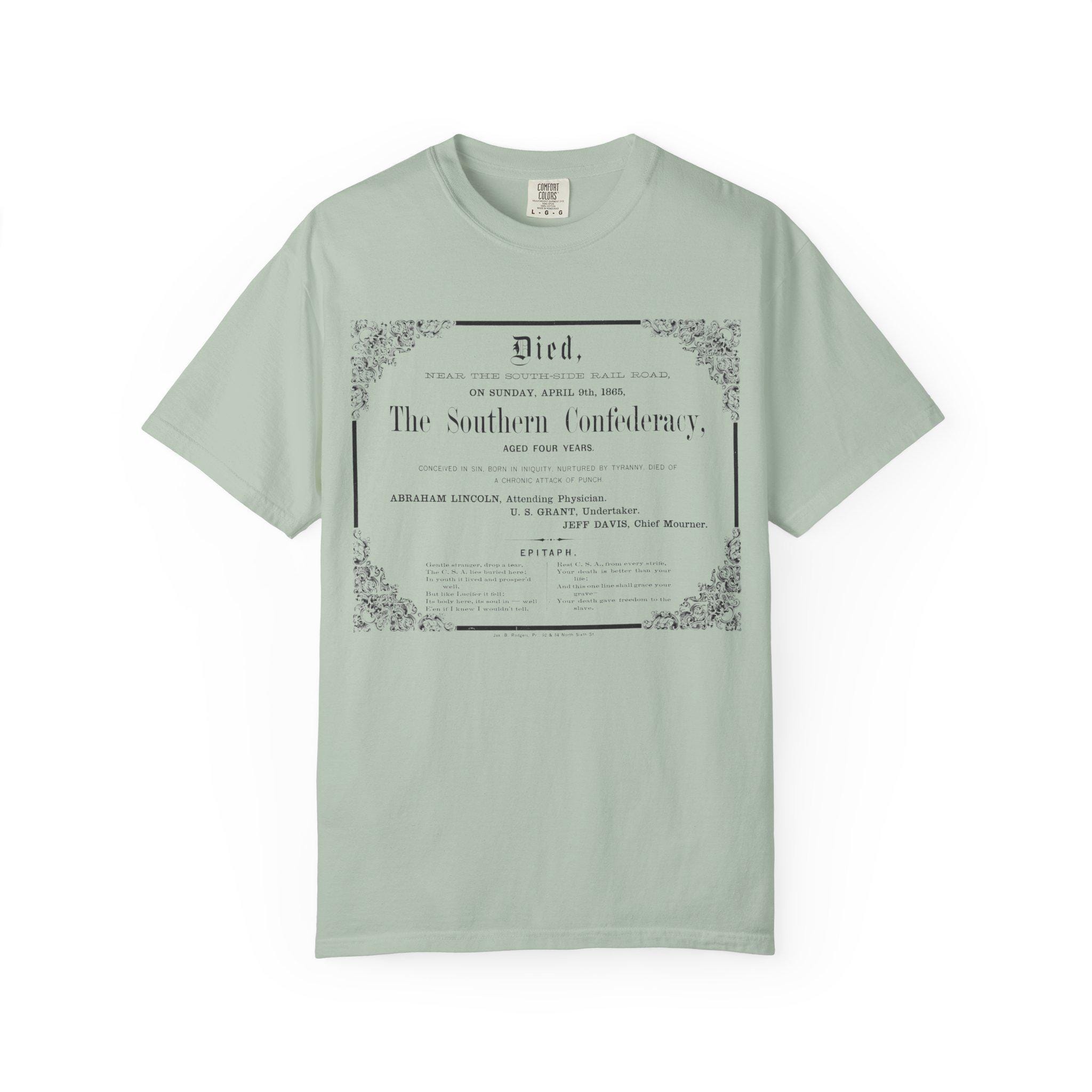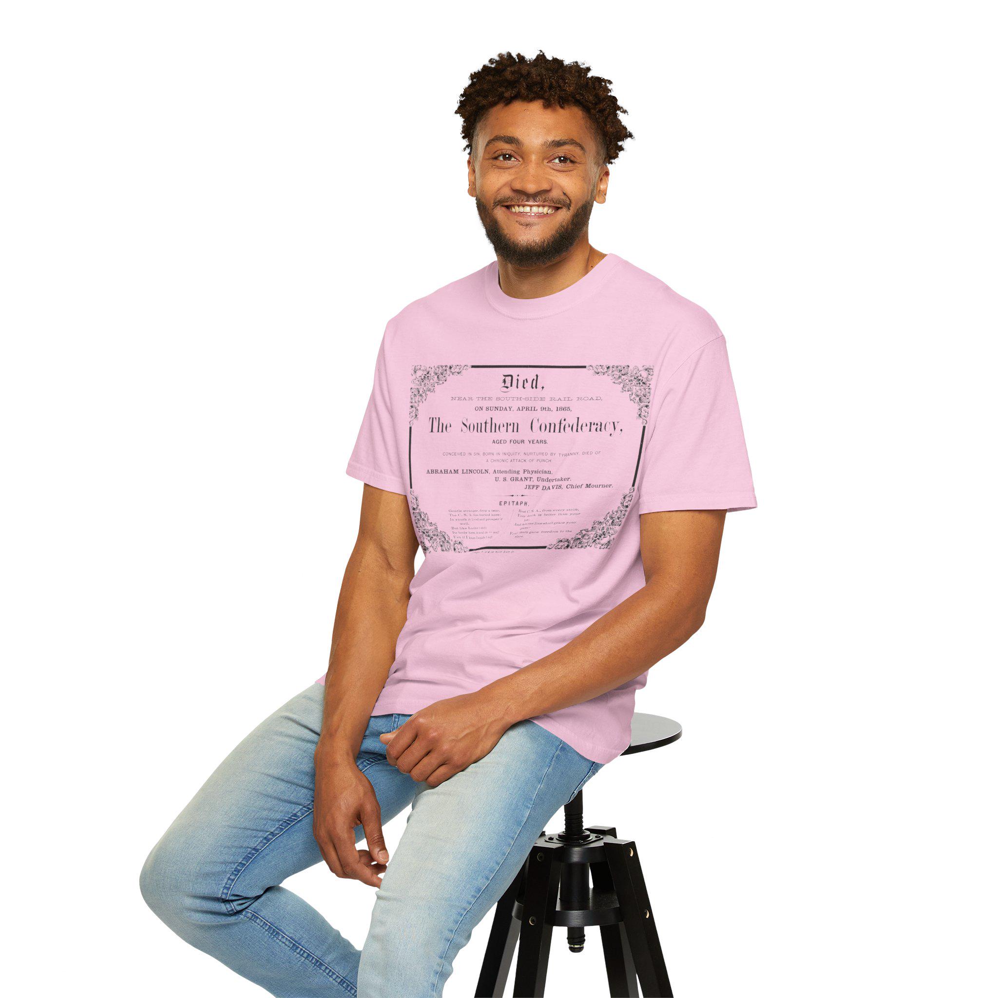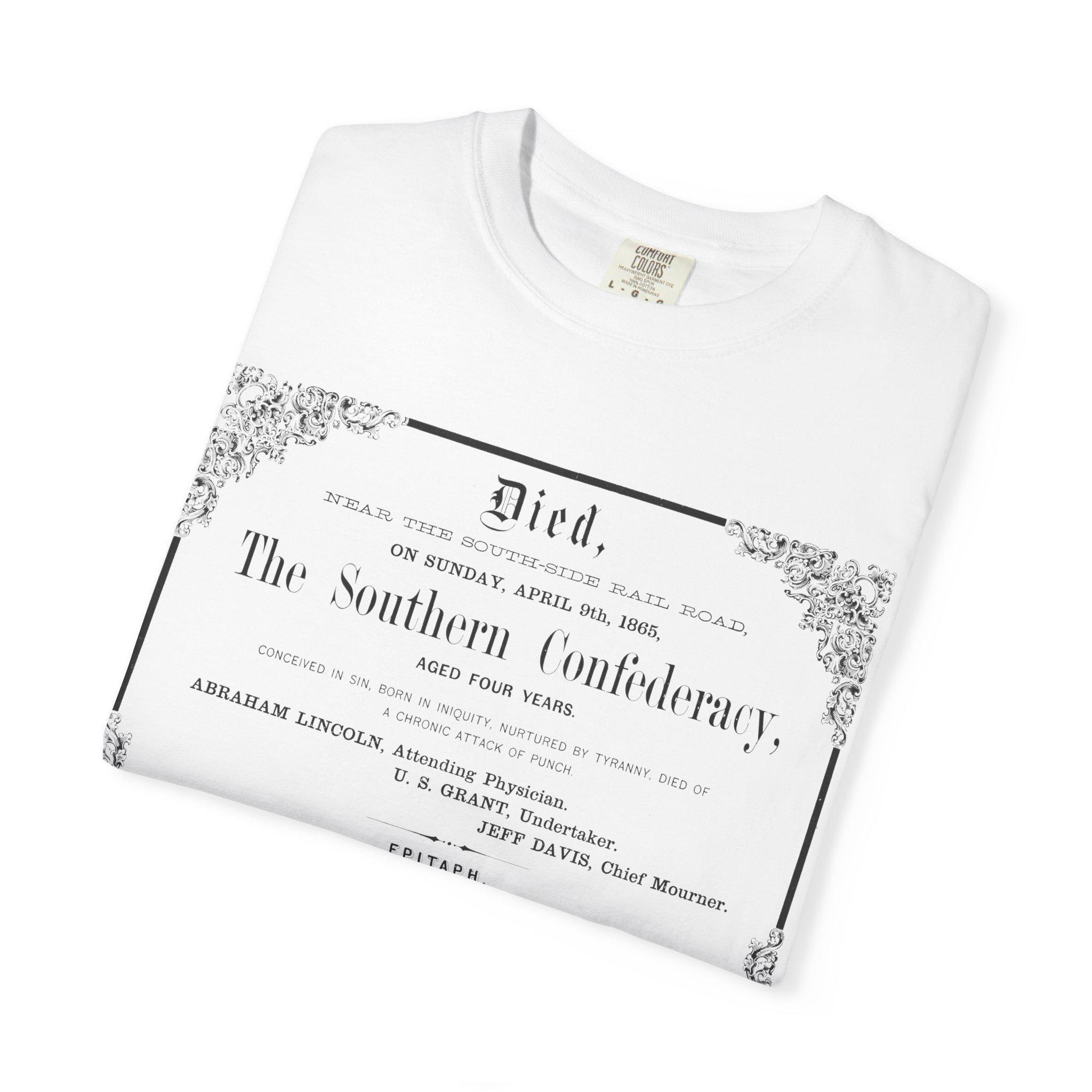 Vintage, satirical death certificate design for the Confederate States of America, perfect for history enthusiasts and those with a sense of humor. This unisex garment-dyed t-shirt adds a touch of historical irony to your wardrobe, suitable for casual wear or as a conversation starter at themed events. Ideal for Memorial Day, Independence Day, and history-related observances.