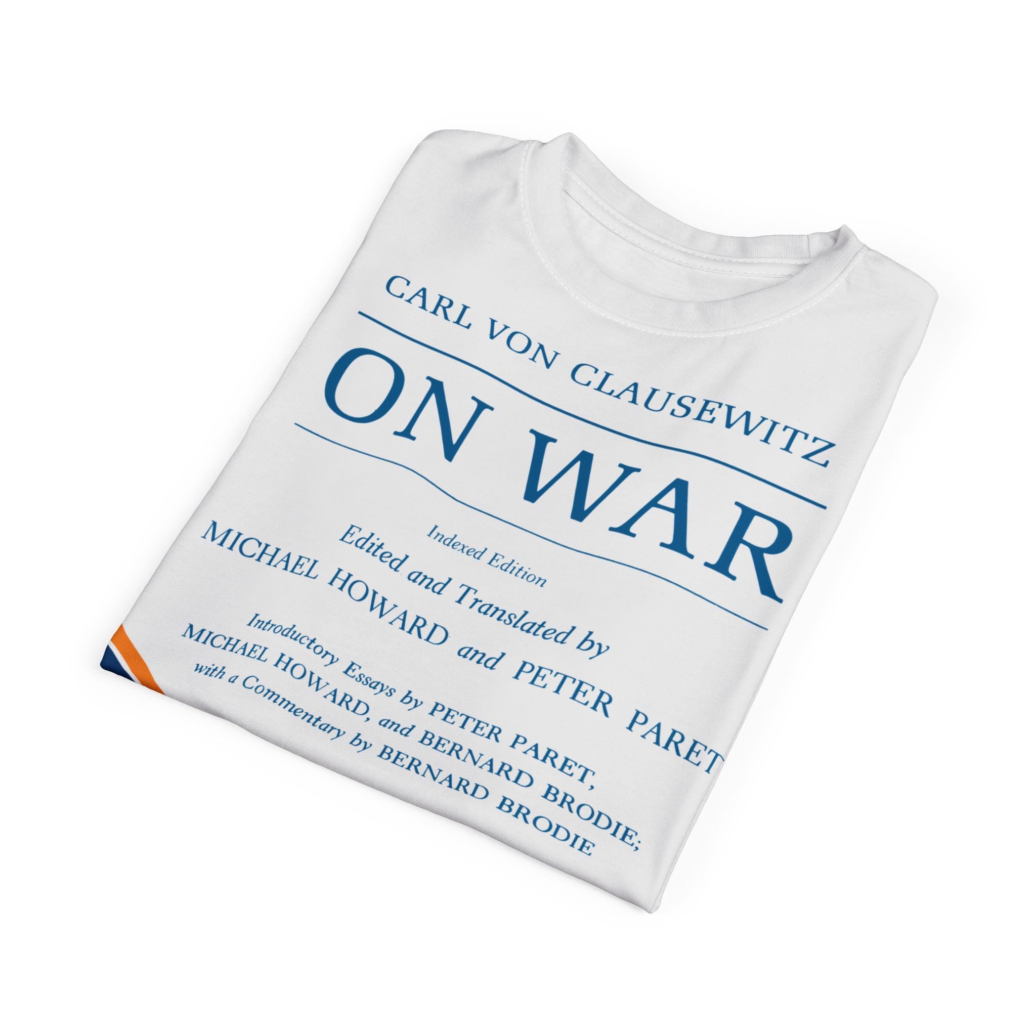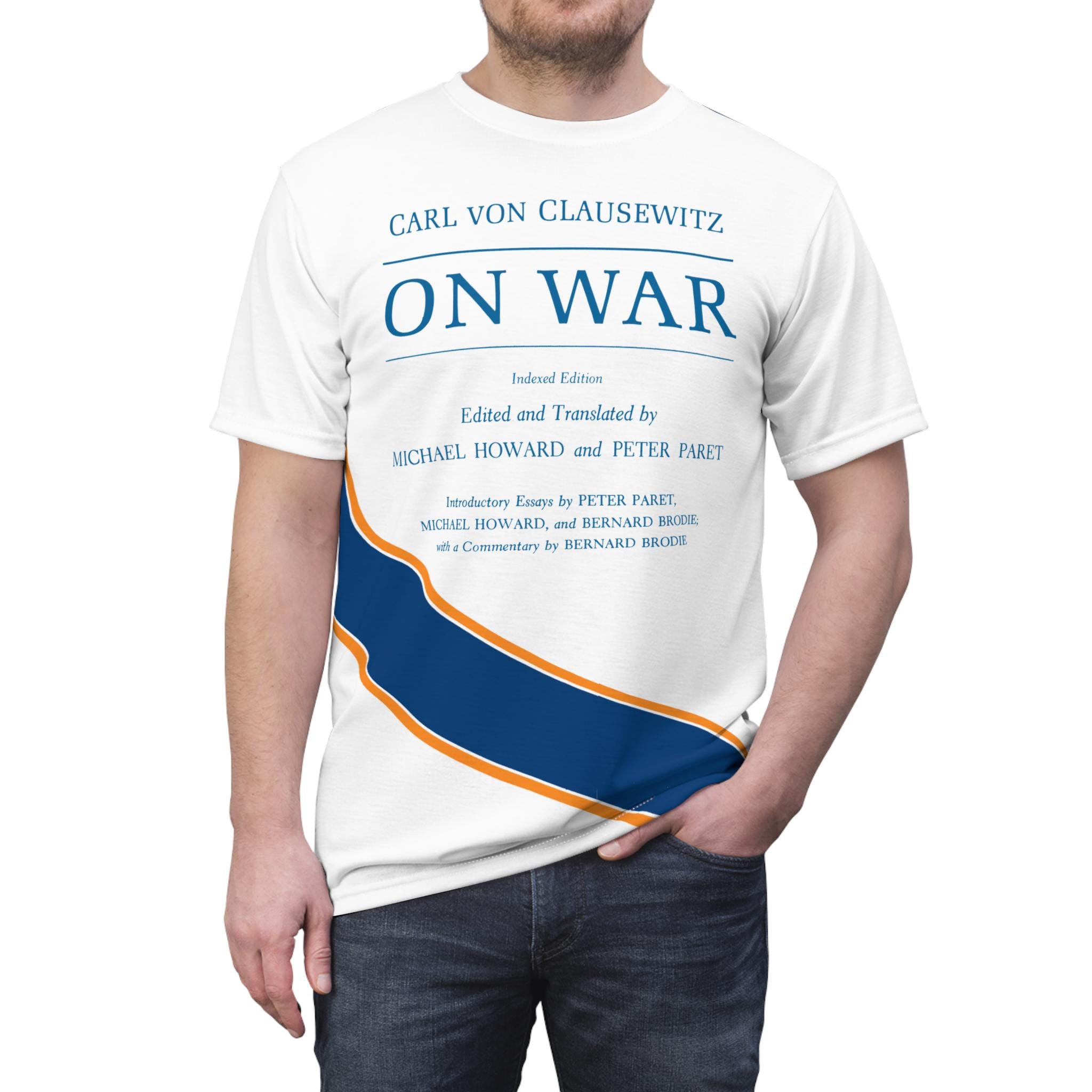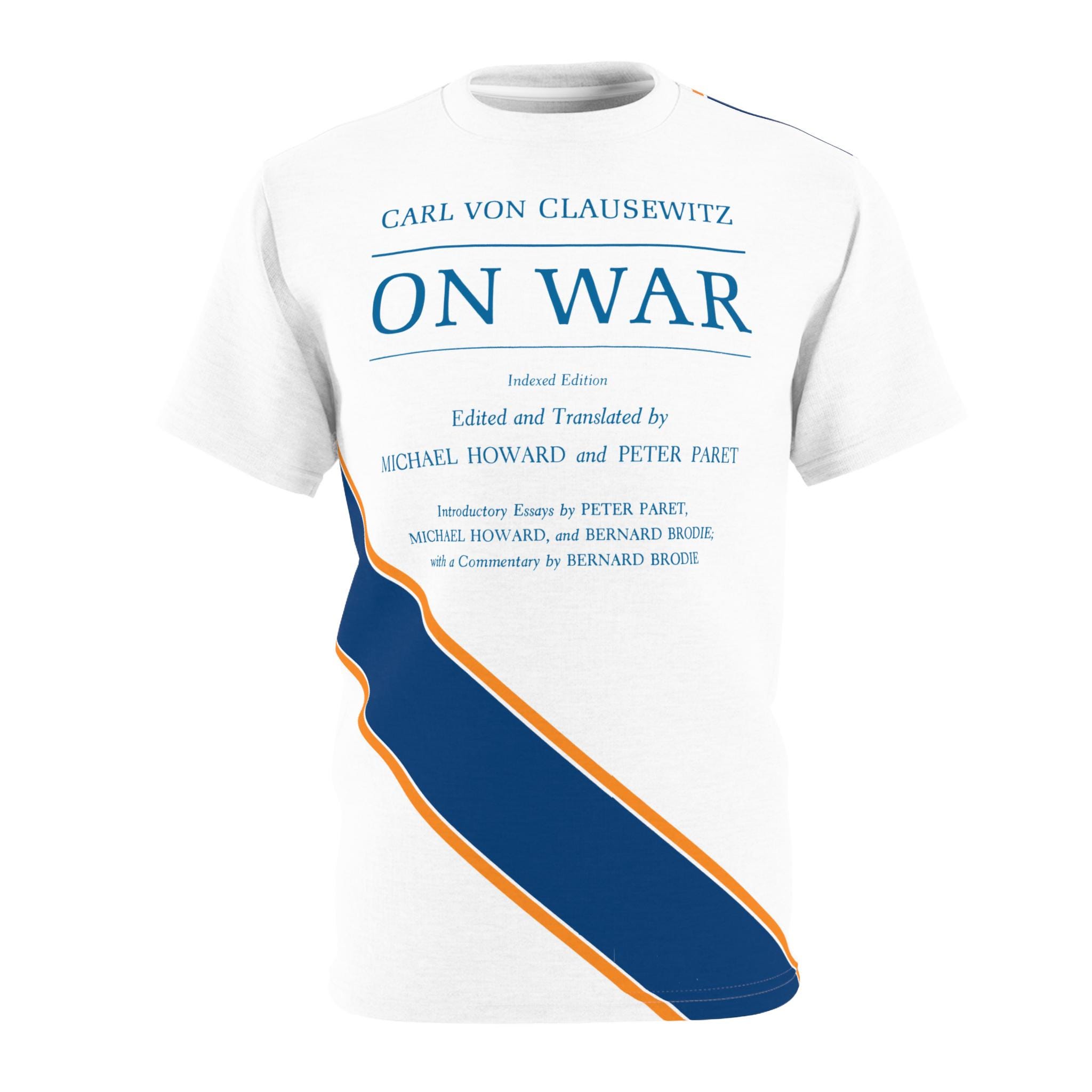 This tee features the cover of the 1989 Princeton translation of 'On War' by Carl von Clausewitz, with tasteful blue and gold stripes. It gives off a scholarly and intellectual vibe, perfect for history buffs and military enthusiasts. Ideal for casual wear or as a conversation starter at academic events and book clubs.
