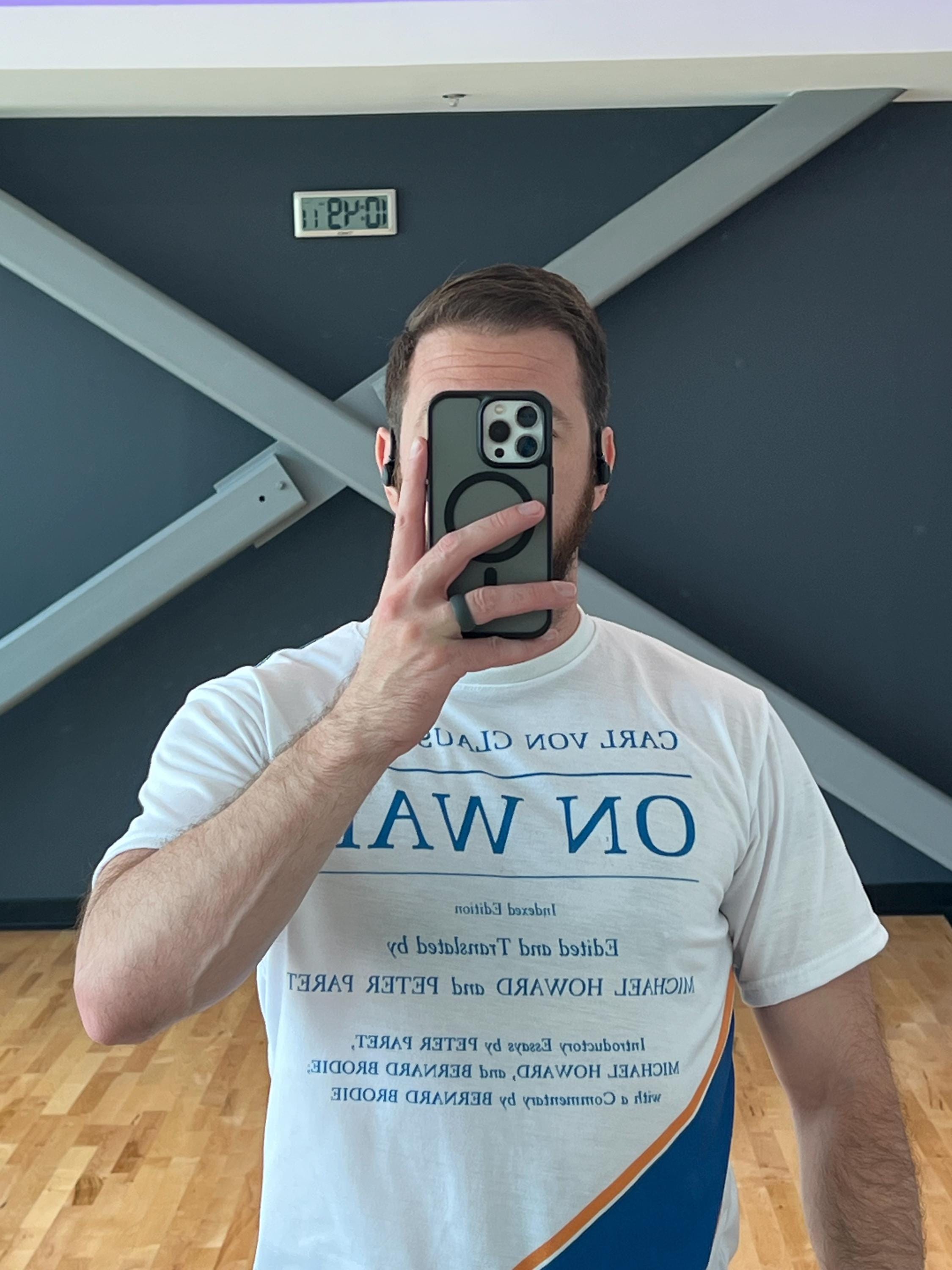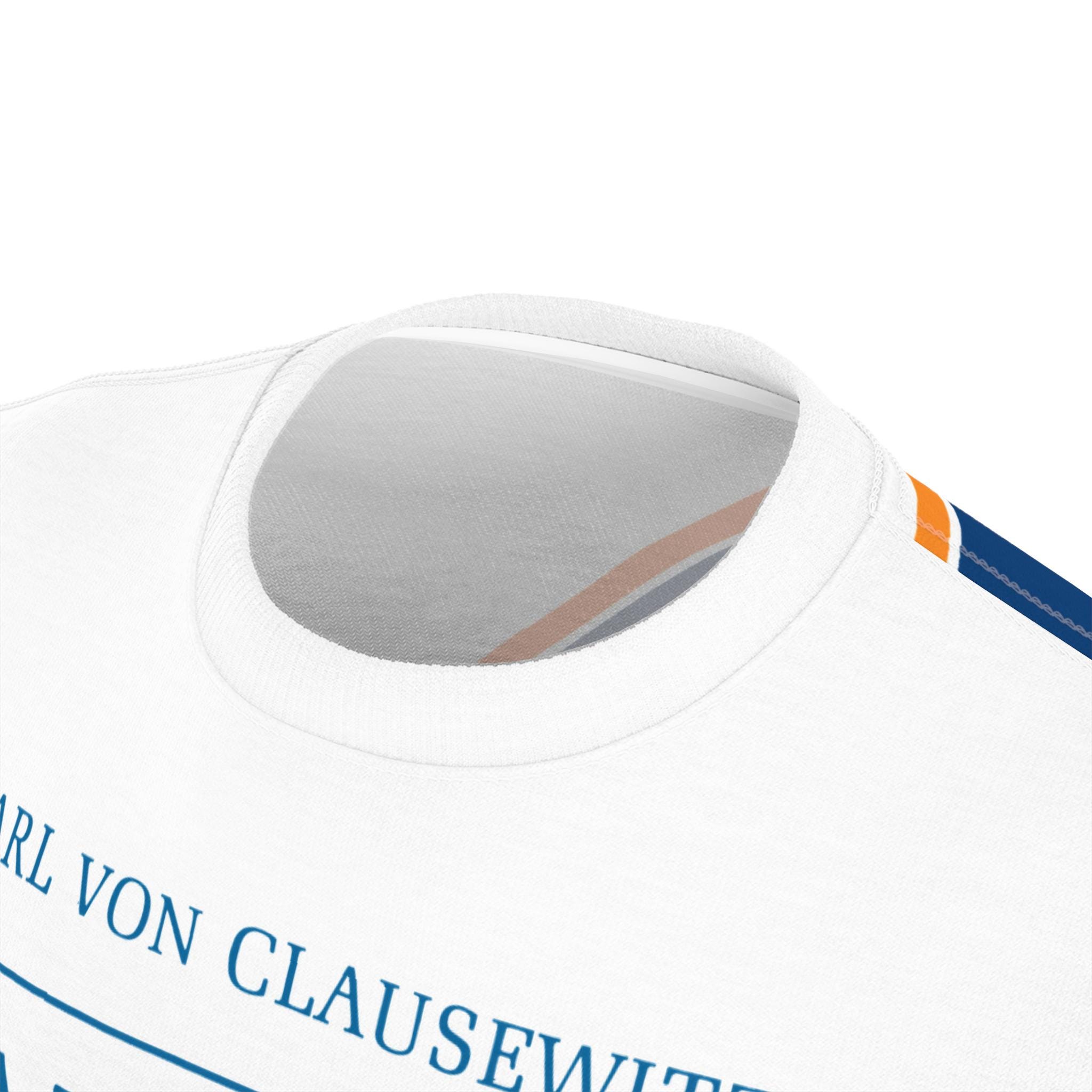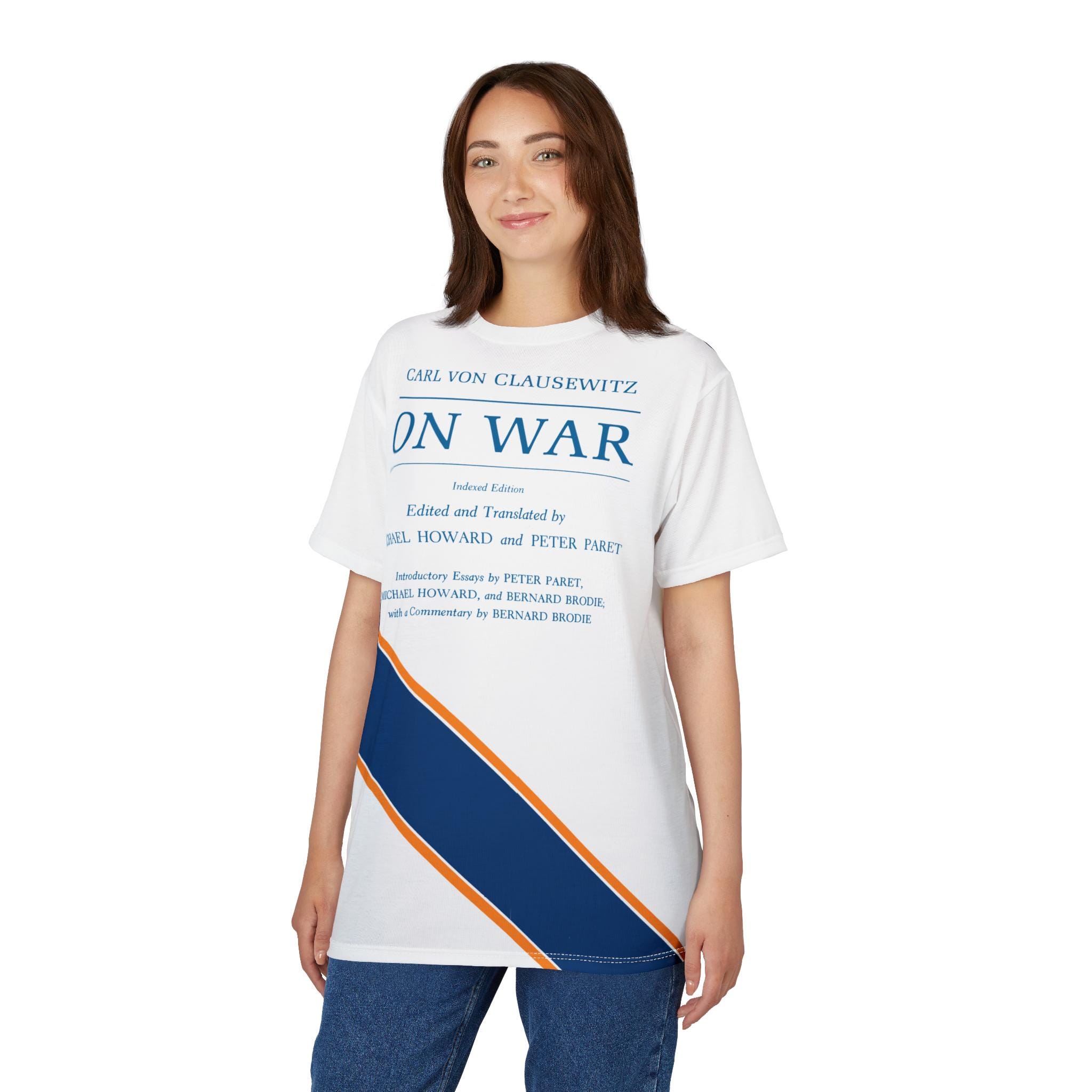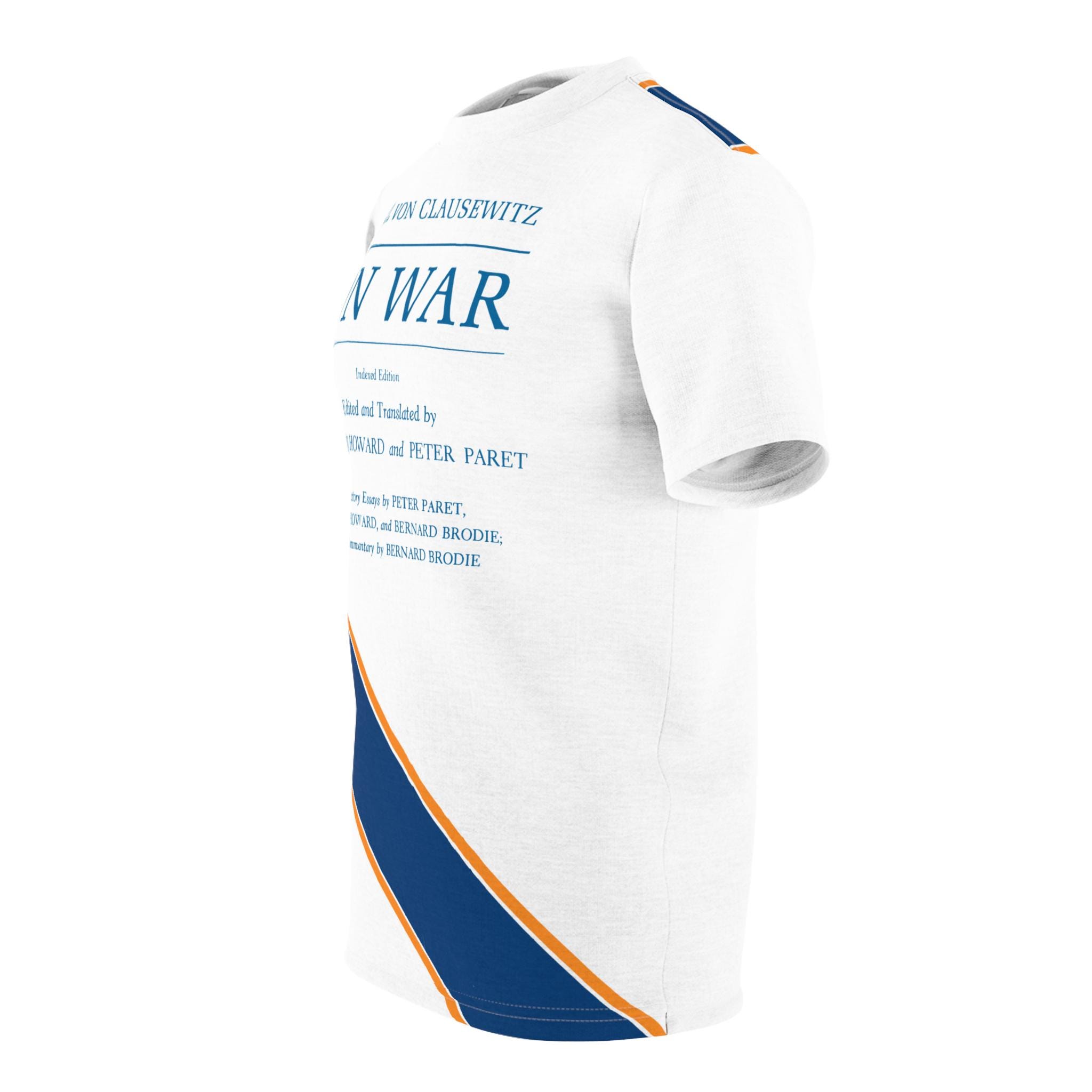 This tee features the cover of the 1989 Princeton translation of 'On War' by Carl von Clausewitz, with tasteful blue and gold stripes. It gives off a scholarly and intellectual vibe, perfect for history buffs and military enthusiasts. Ideal for casual wear or as a conversation starter at academic events and book clubs.