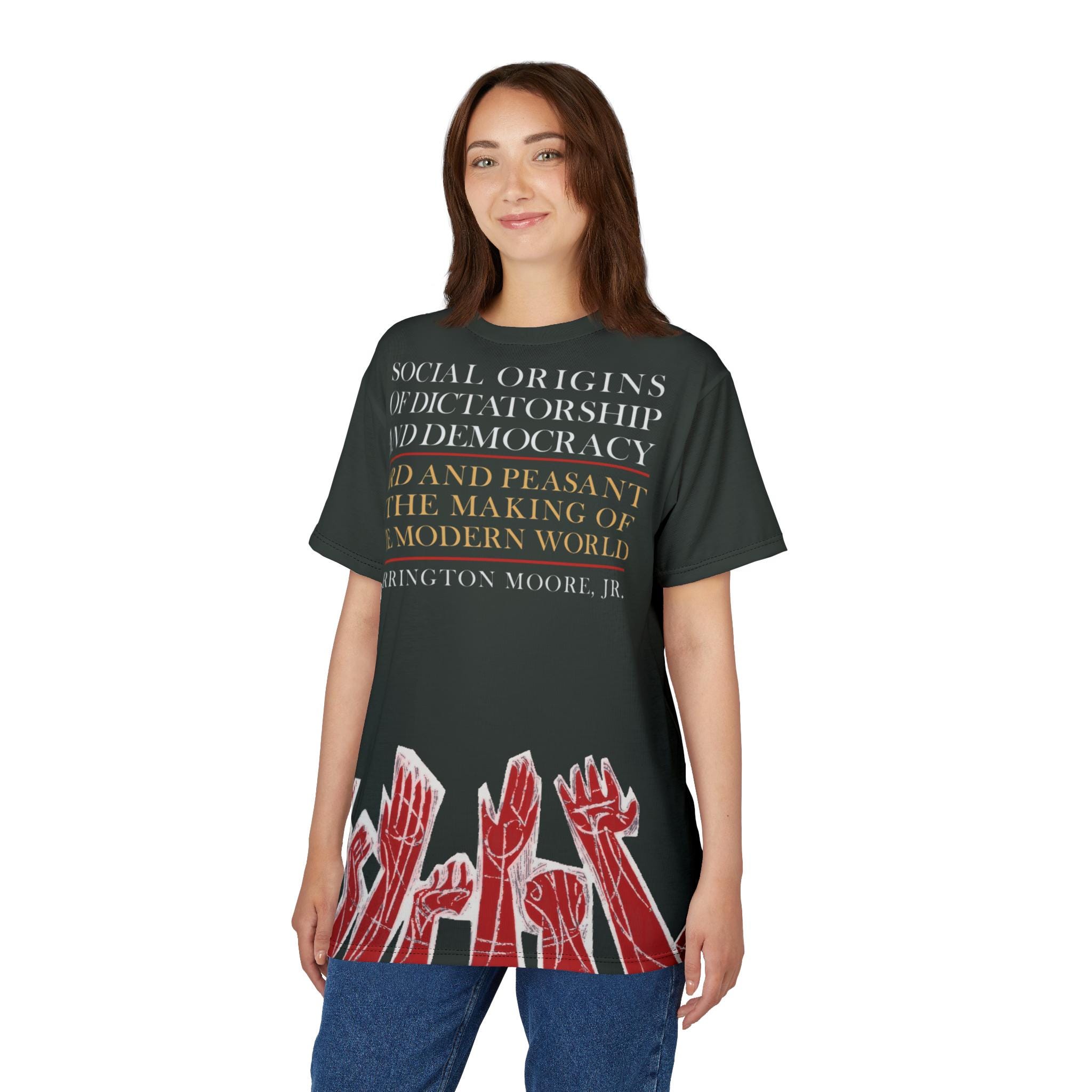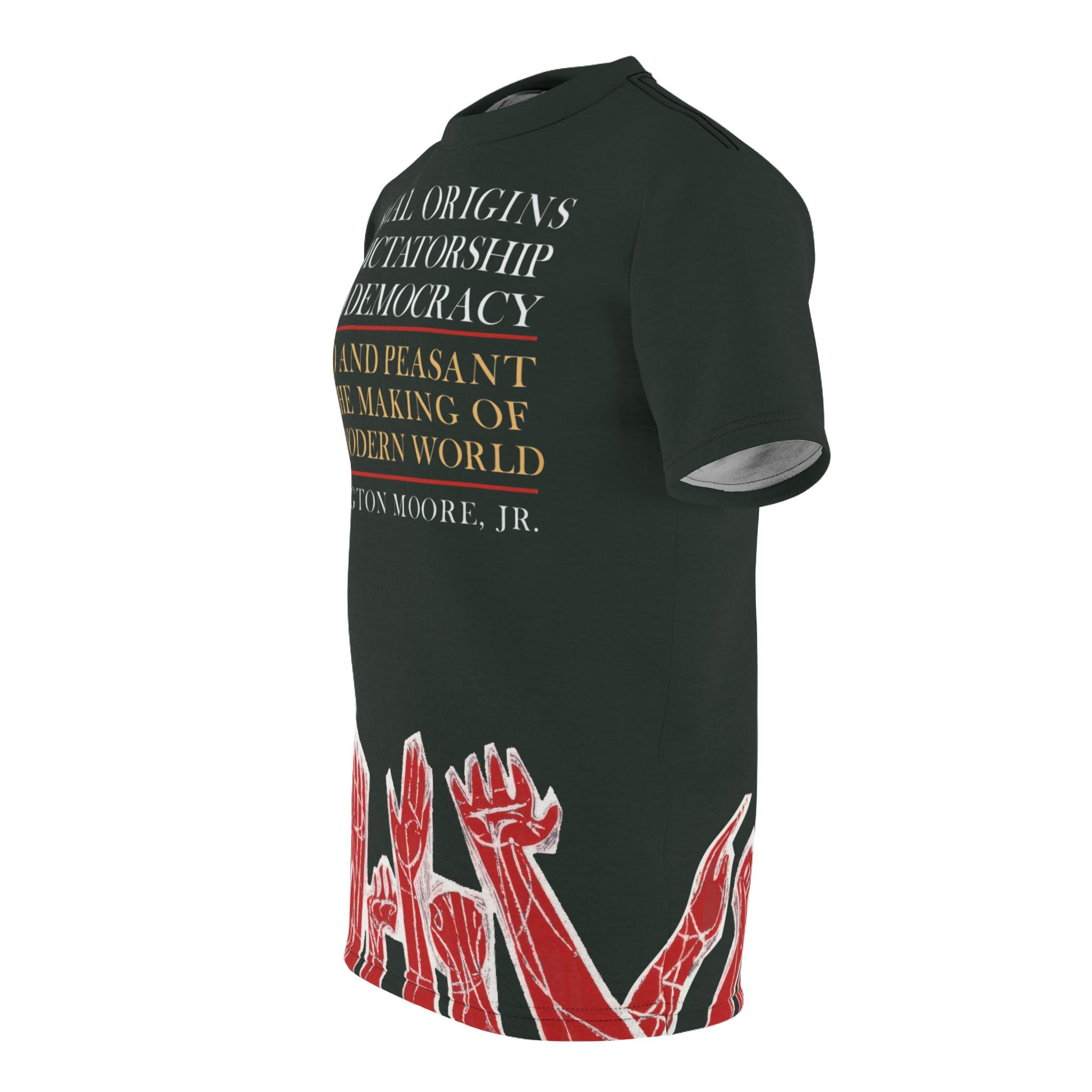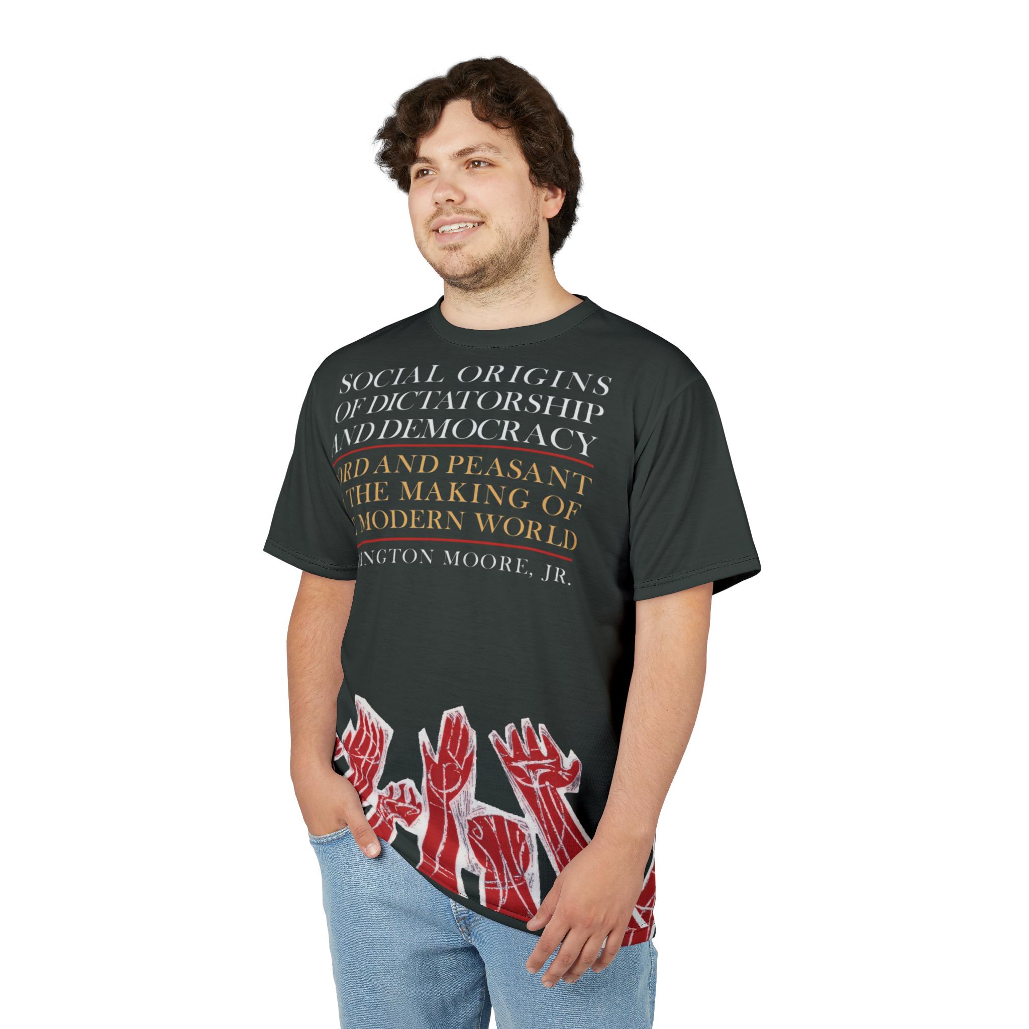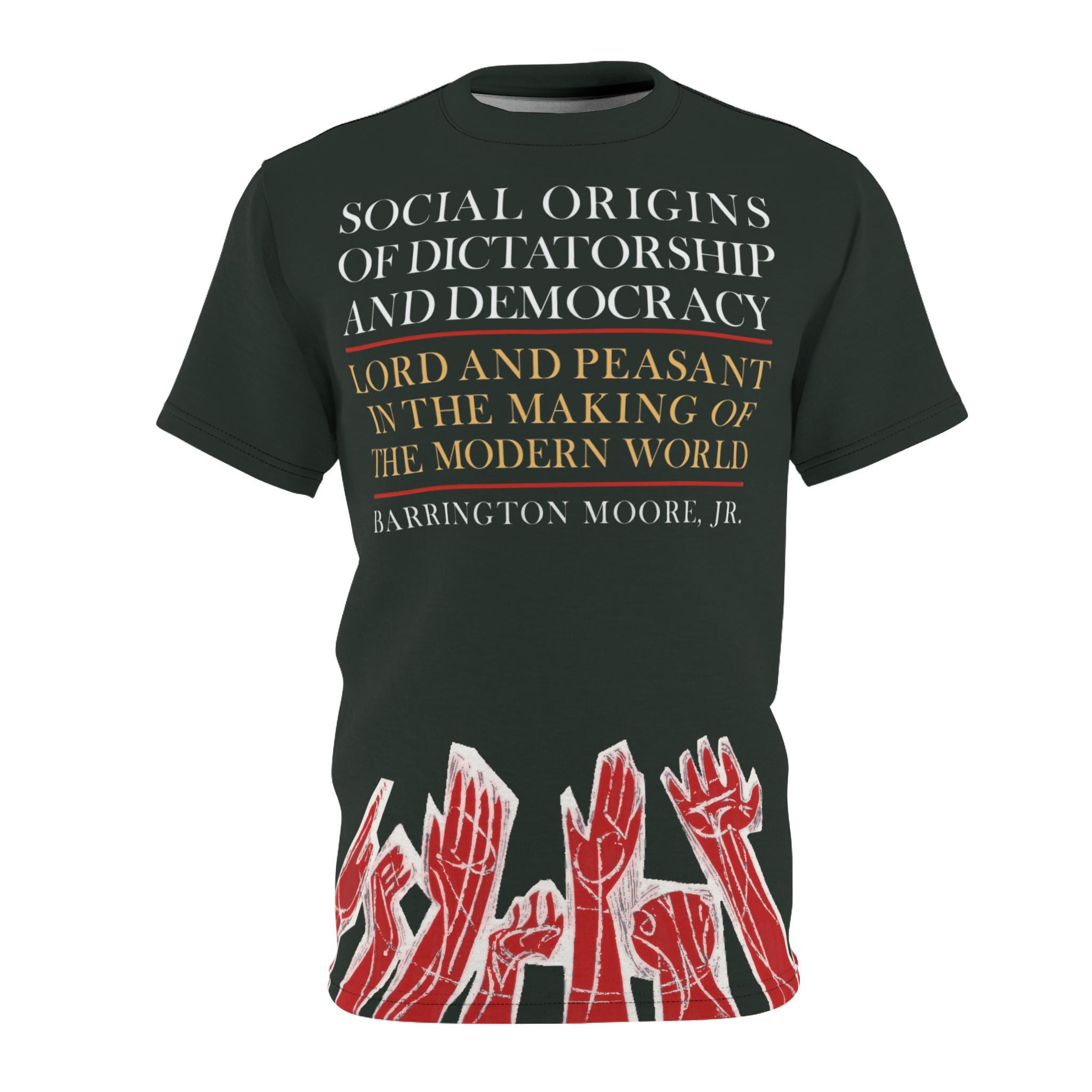 Vintage retro T-shirt featuring a cover of the first printing of "Social Origins of Dictatorship and Democracy" by Barrington Moore. Black shirt with red hands outlined in white reaching upward, with white and yellow text on the front. Perfect for history buffs and book lovers, this T-shirt exudes a sense of nostalgia and intellect. Ideal for casual wear or as a thoughtful gift for literature enthusiasts.
