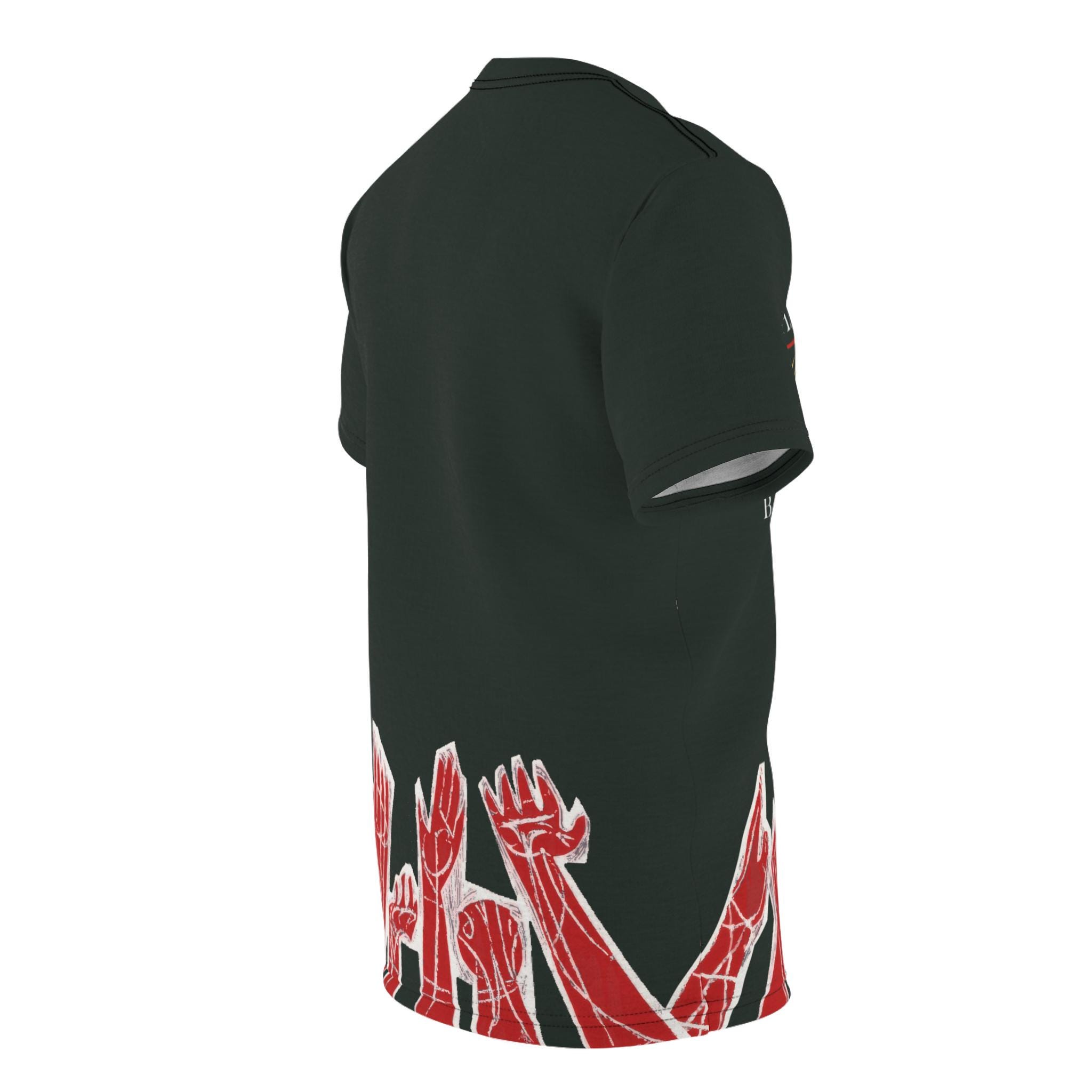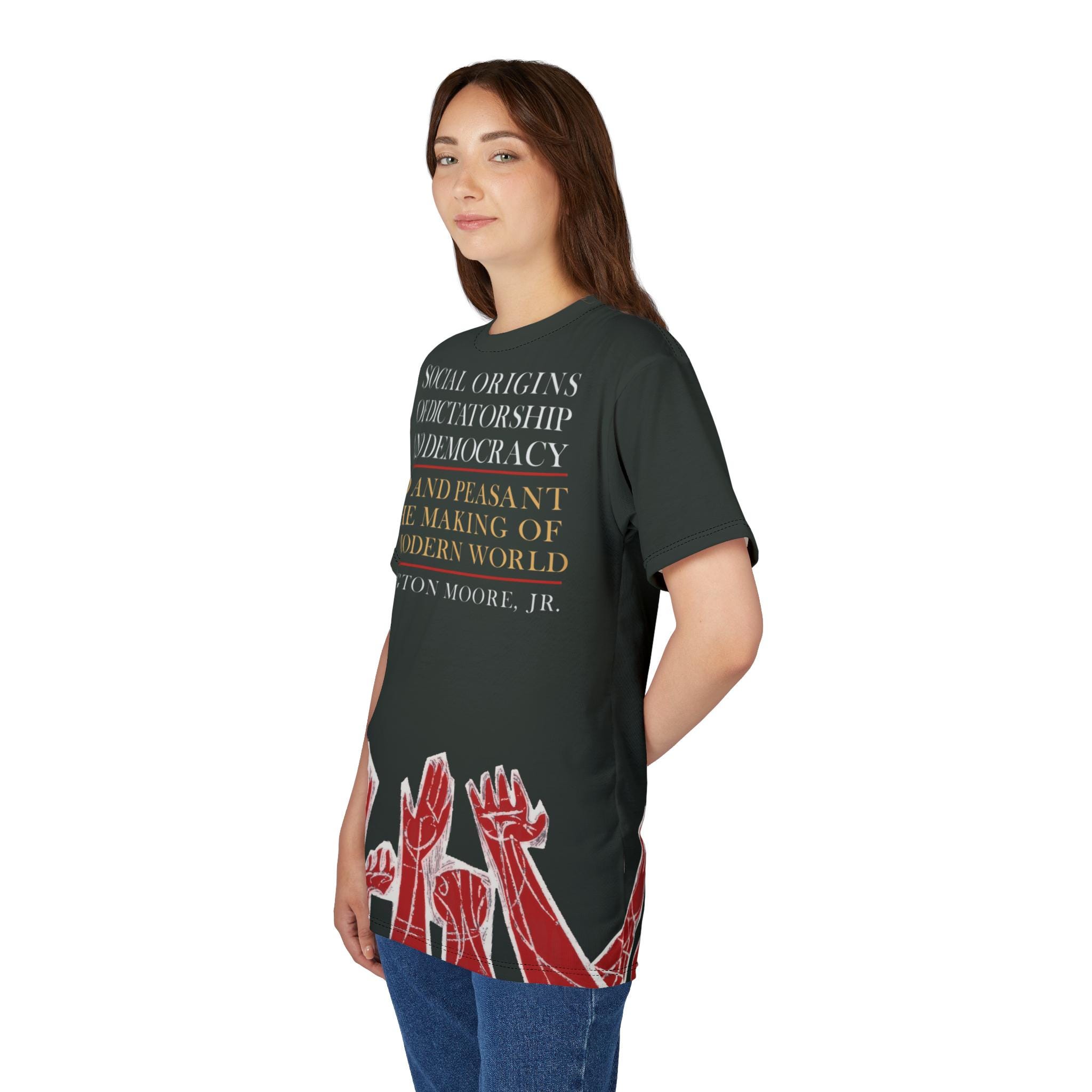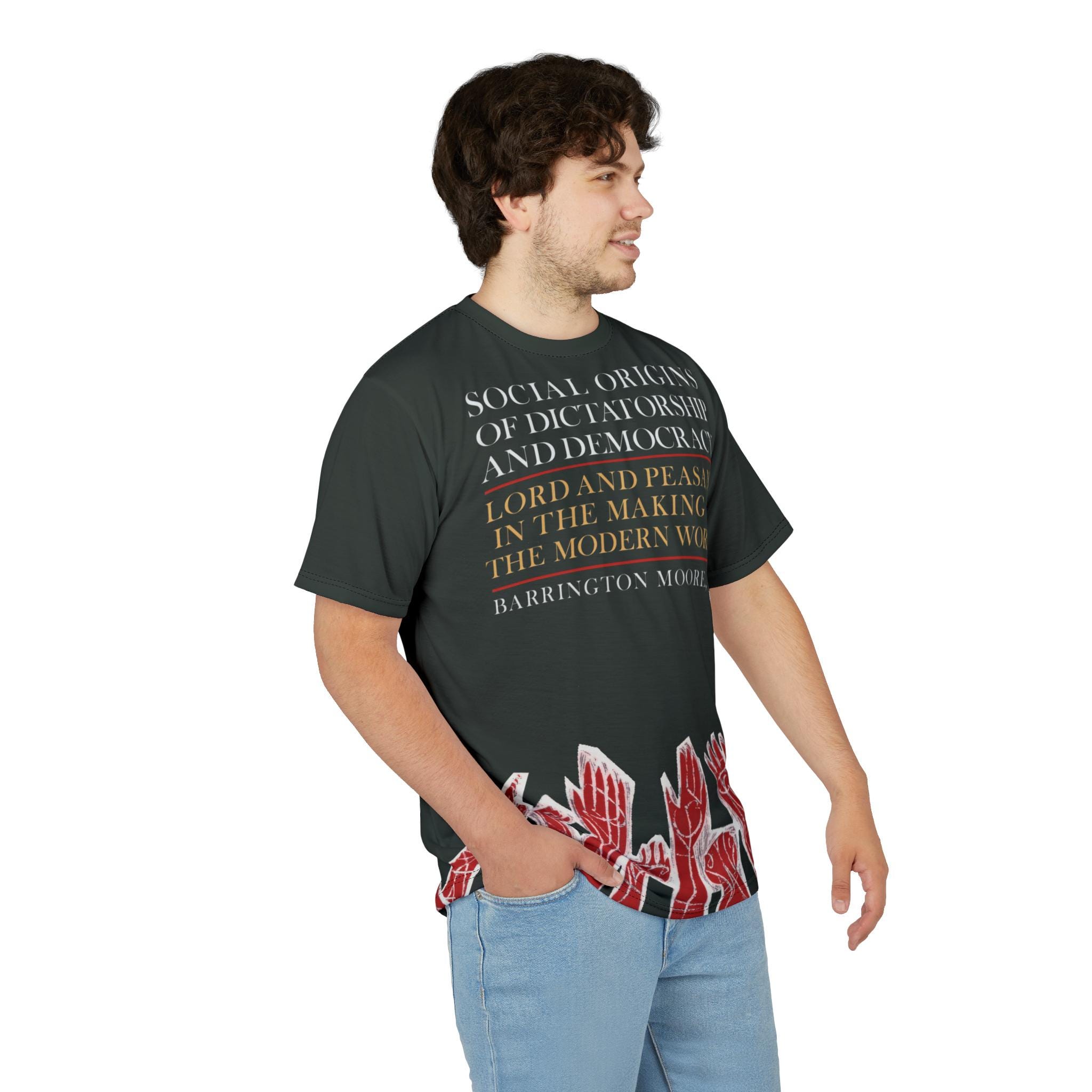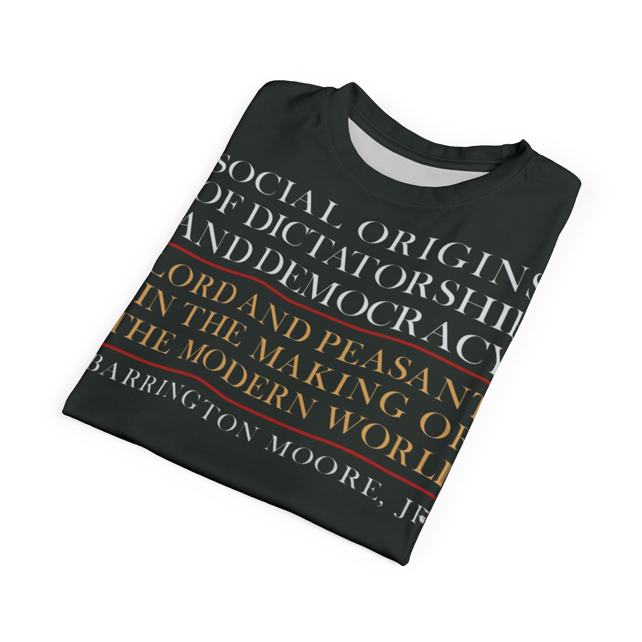 Vintage retro T-shirt featuring a cover of the first printing of "Social Origins of Dictatorship and Democracy" by Barrington Moore. Black shirt with red hands outlined in white reaching upward, with white and yellow text on the front. Perfect for history buffs and book lovers, this T-shirt exudes a sense of nostalgia and intellect. Ideal for casual wear or as a thoughtful gift for literature enthusiasts.