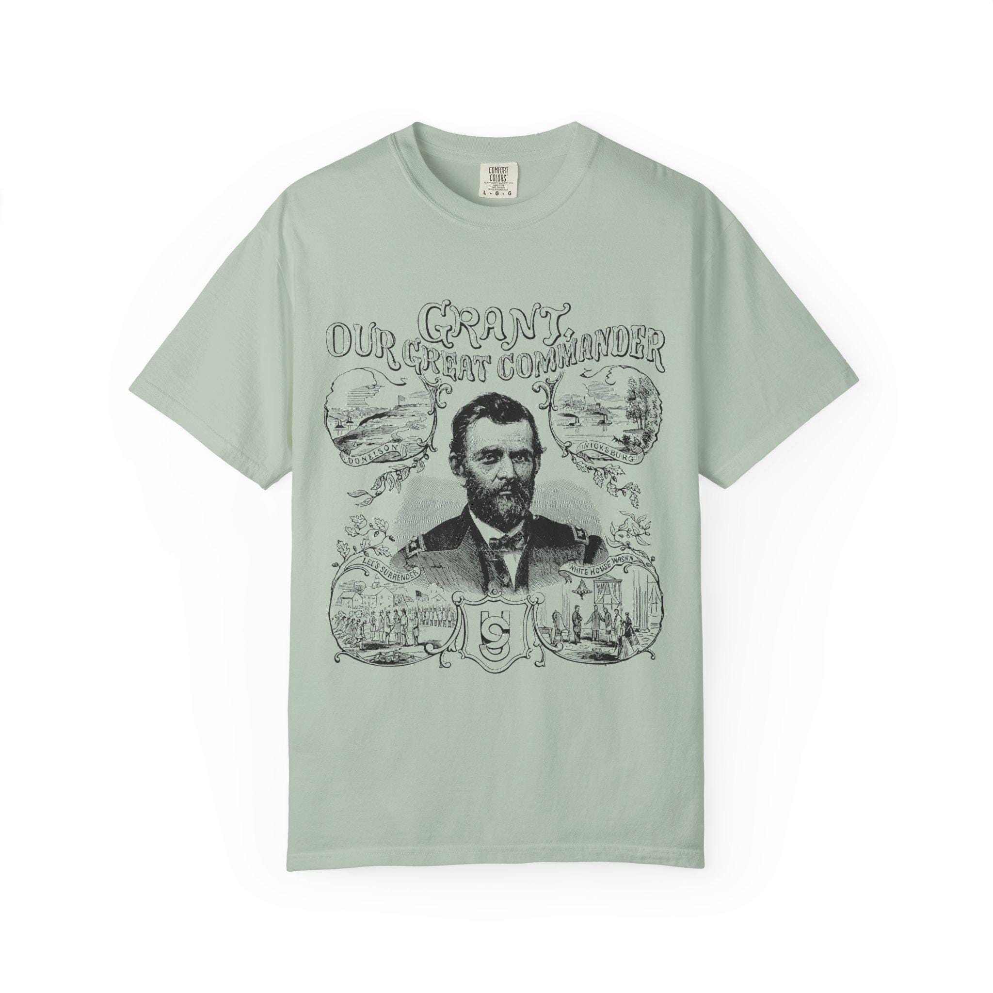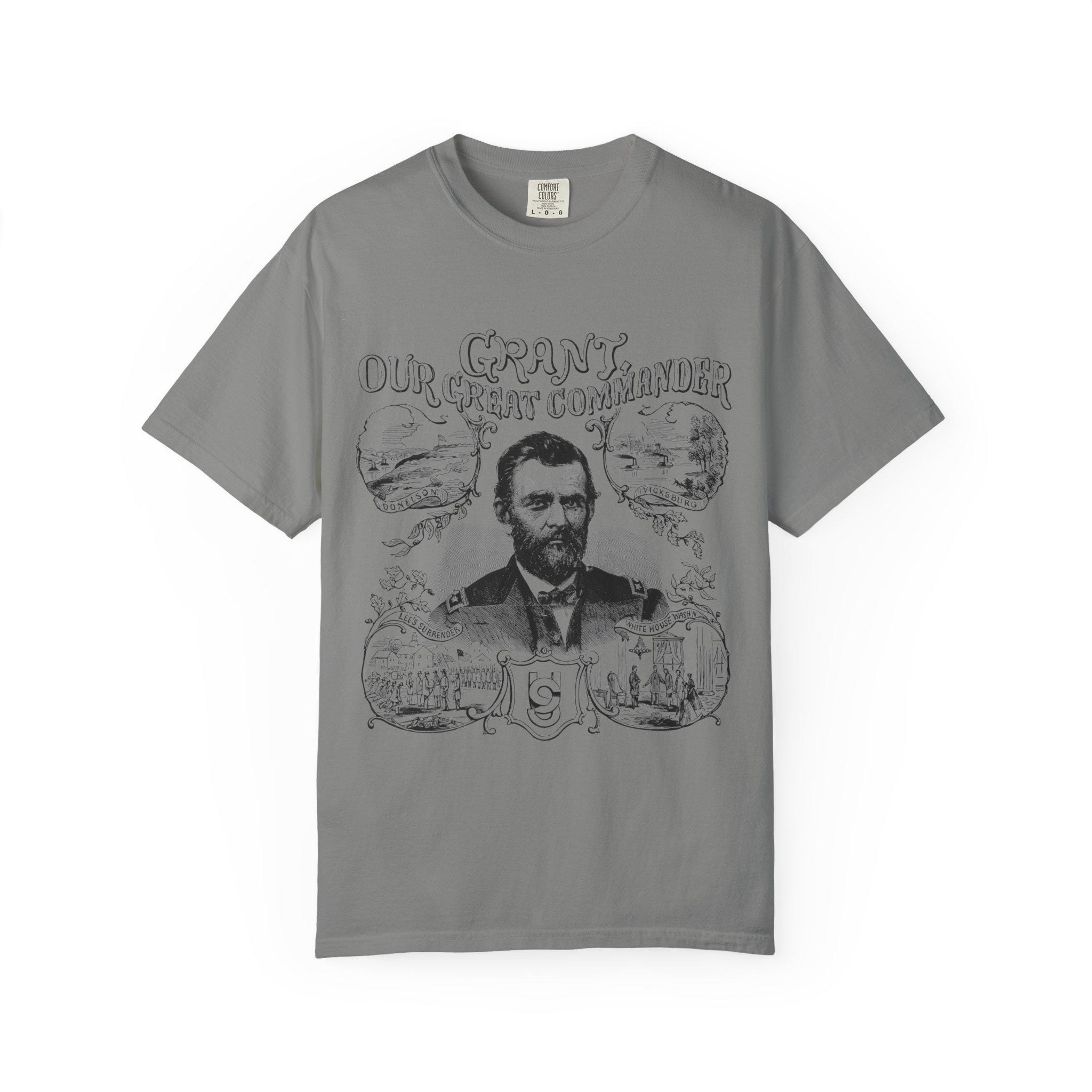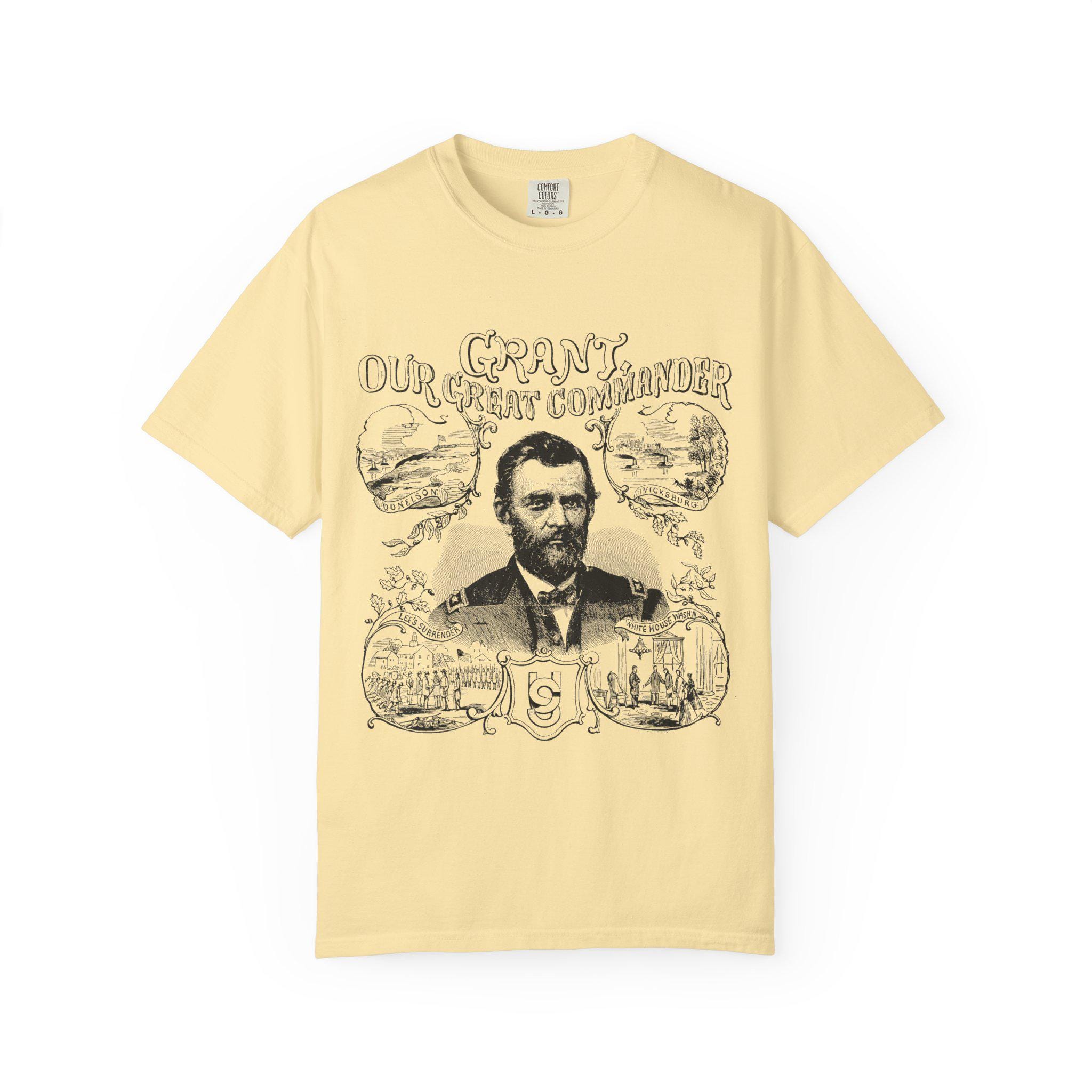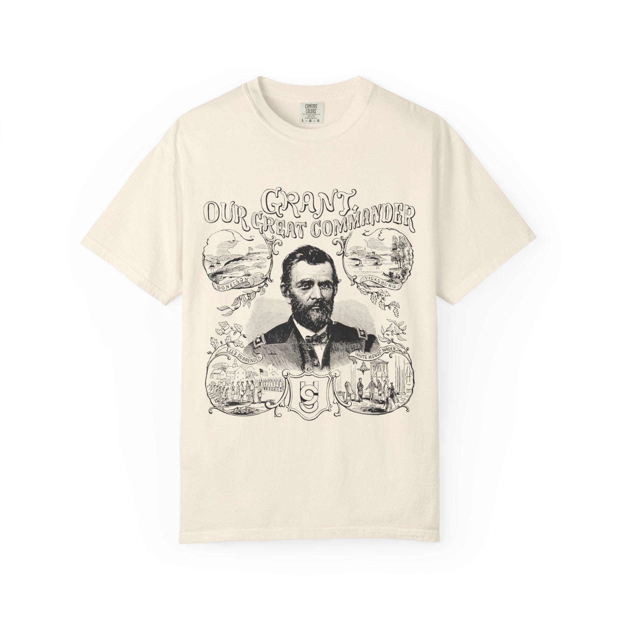 This Union Army General Ulysses S Grant portrait tee features Civil War-related line drawings for history enthusiasts. The comfortable fit and classic crew neckline make it perfect for casual wear or accessorizing in semi-formal settings. Ideal for adults interested in historical events, Civil War reenactors, and history buffs. Perfect for Memorial Day, Fourth of July, and historical reenactment events.