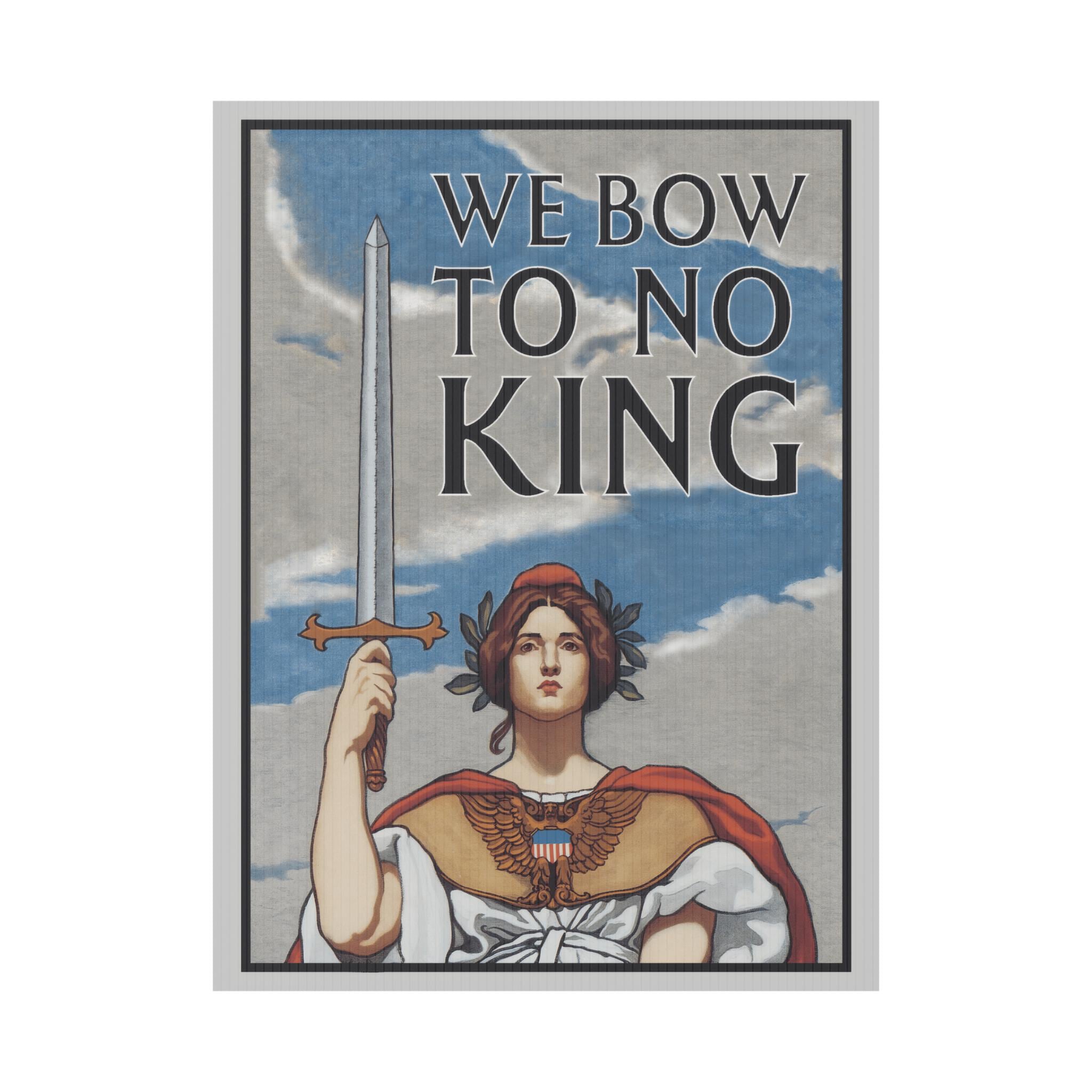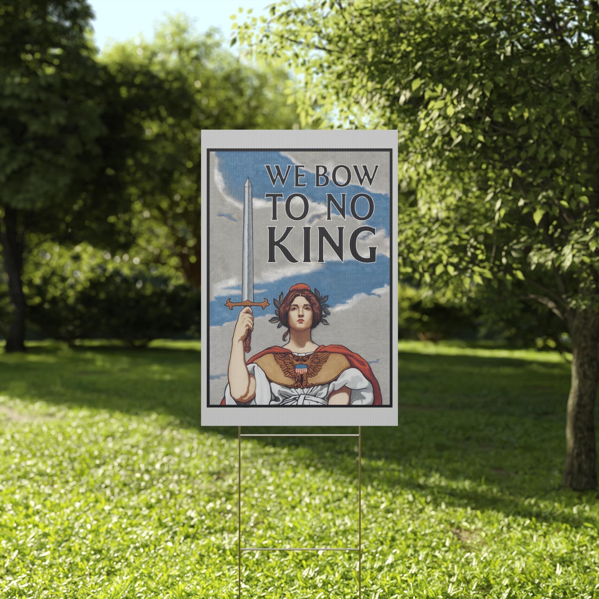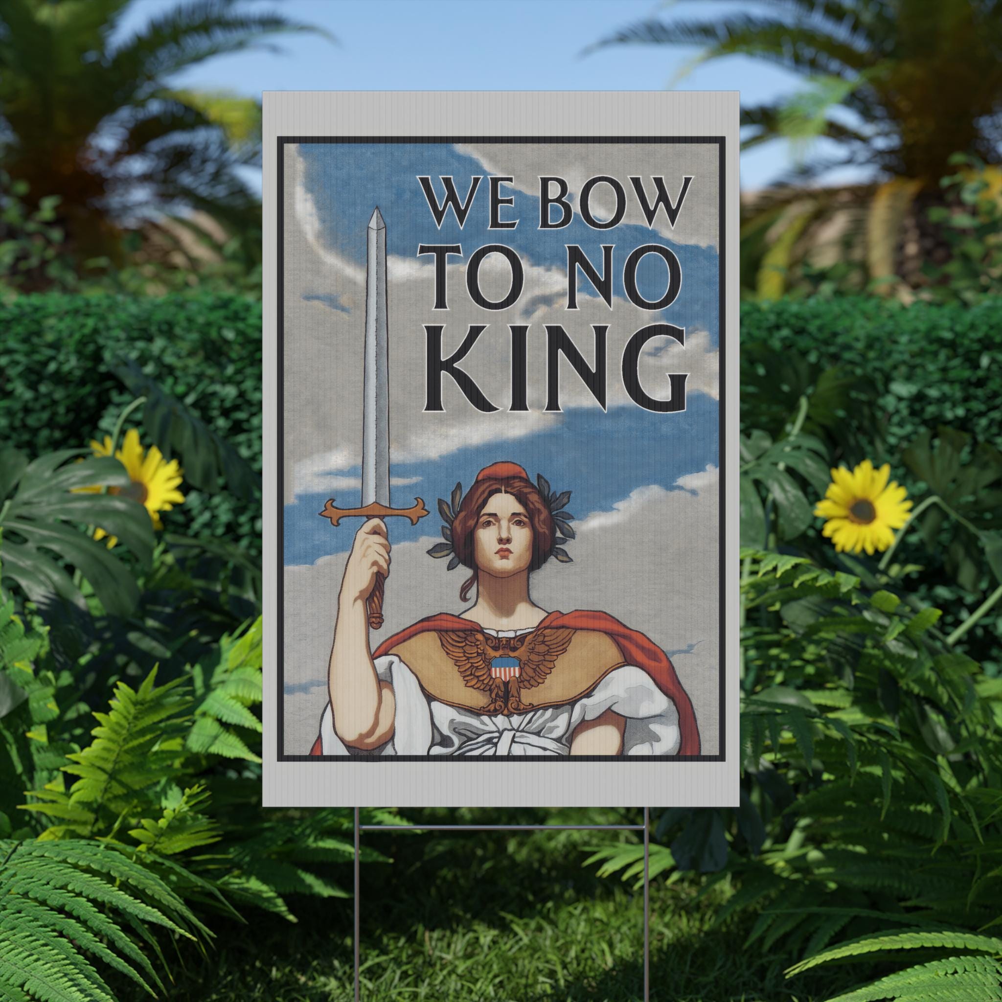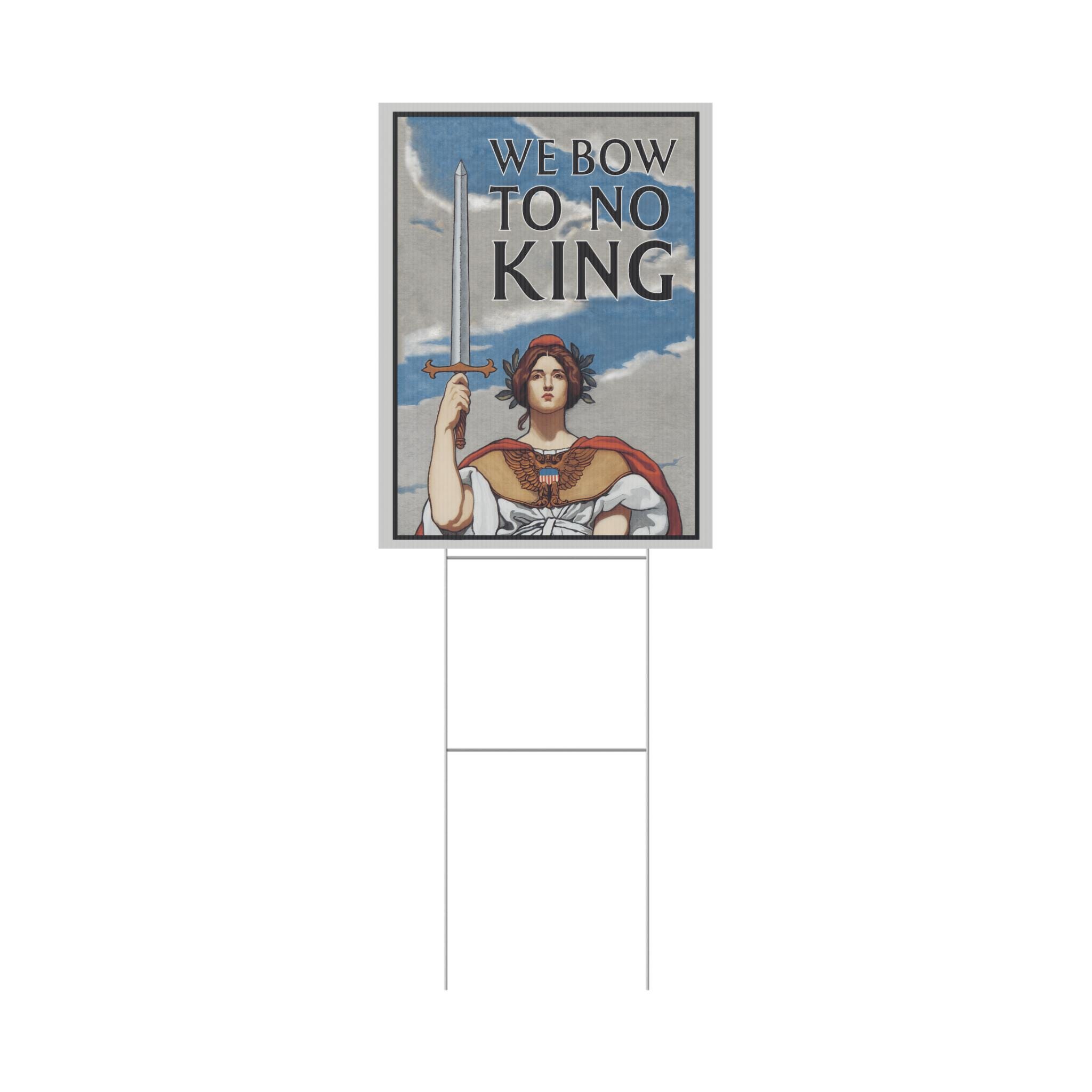 This durable plastic yard sign featuring a modified version of Kenyon Cox's beaux-arts painting of the Goddess Columbia holding a sword aloft, with the text 'WE BOW TO NO KING', is perfect for outdoor display. The patriotic design and sturdy material make it an ideal addition to any garden or lawn, especially for those who appreciate historical references and American patriotism. Perfect for Memorial Day, Independence Day, Veterans Day, or any patriotic celebration.