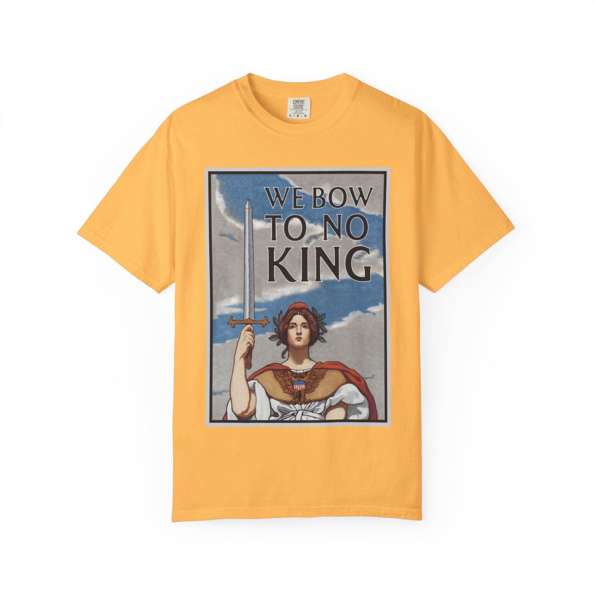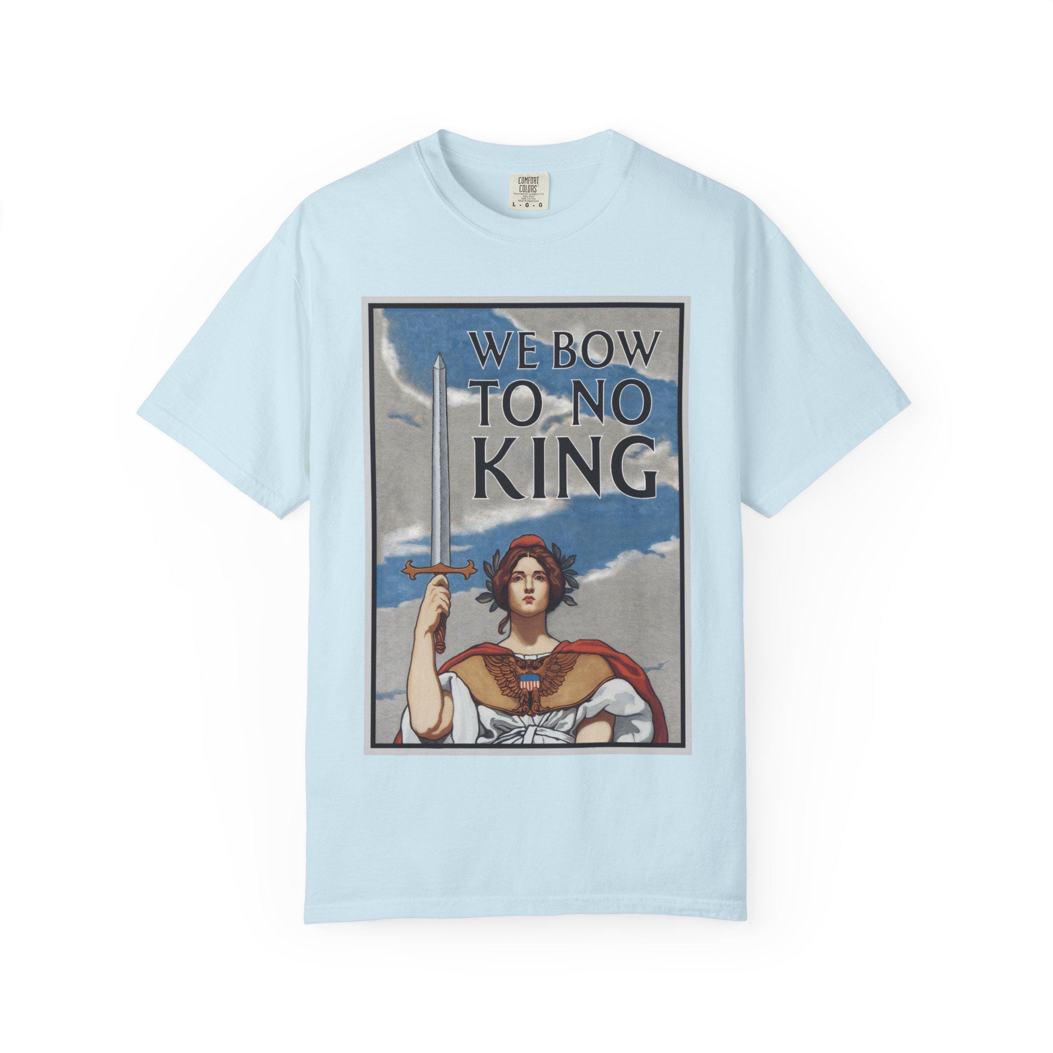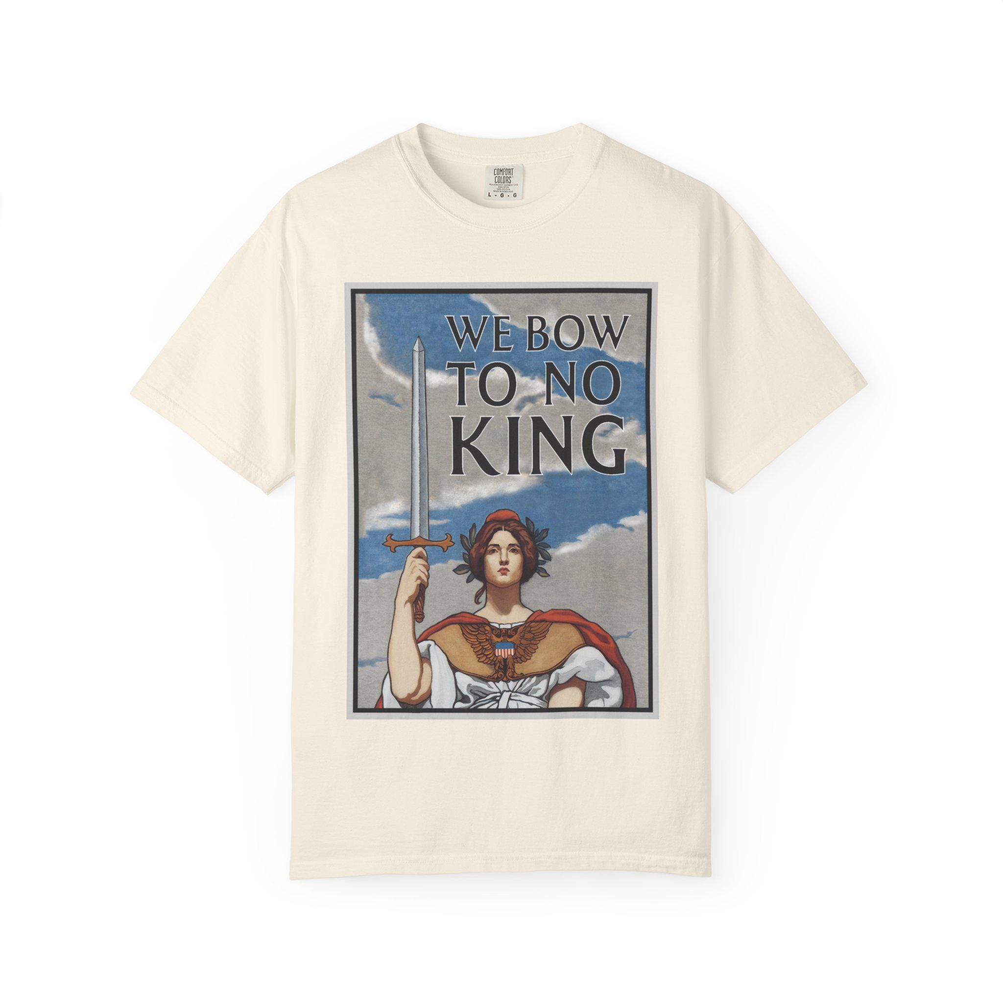 This T-shirt features a modified version of Kenyon Cox's renowned beaux-arts painting of the Goddess Columbia holding a sword, with the text 'WE BOW TO NO KING'. The design exudes a patriotic and defiant vibe, perfect for those who appreciate history and art. Ideal for Independence Day, Memorial Day, Veterans Day, and any patriotic celebration.