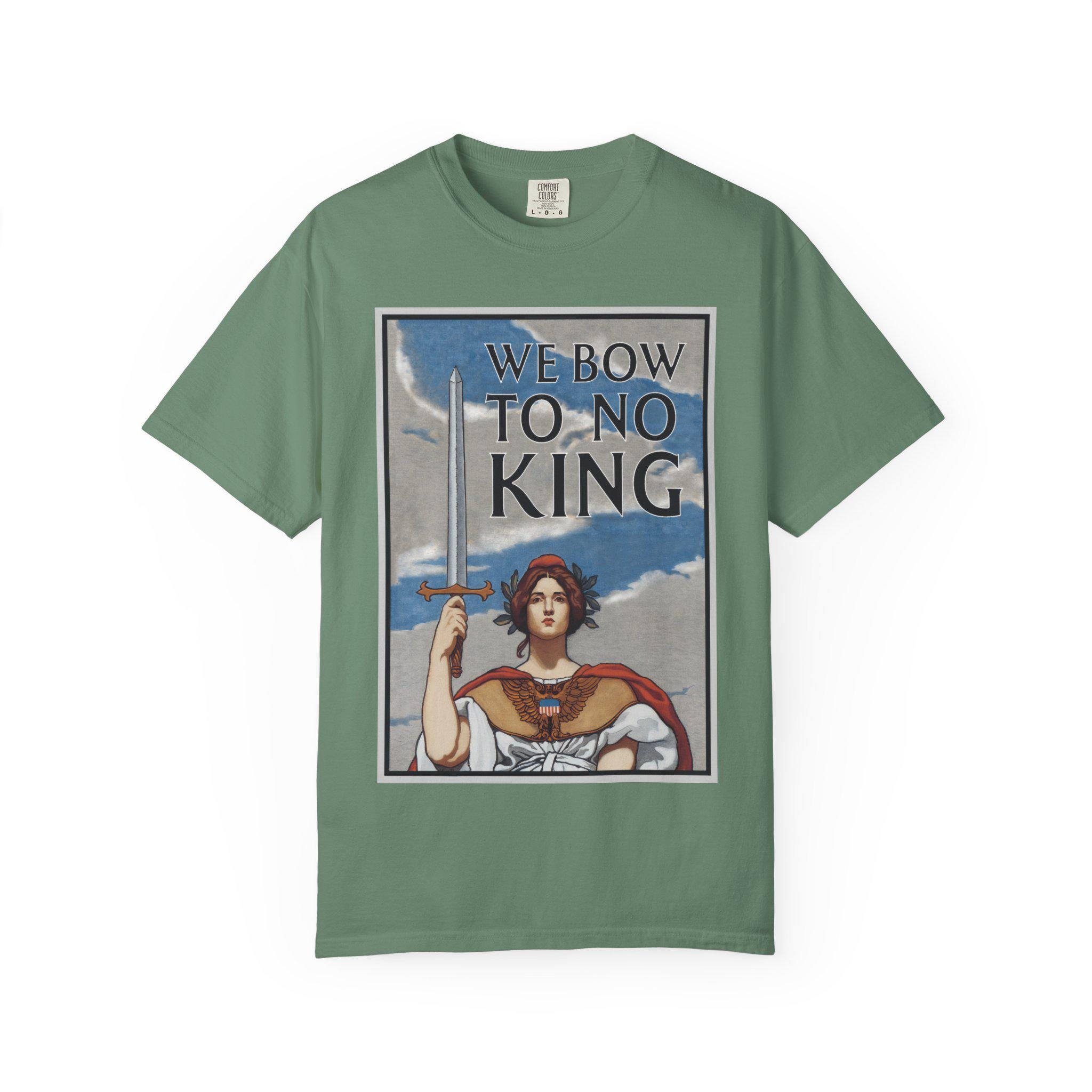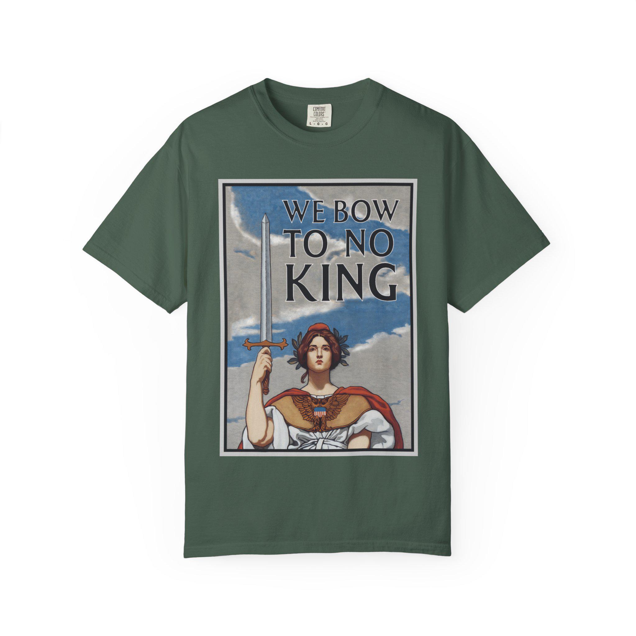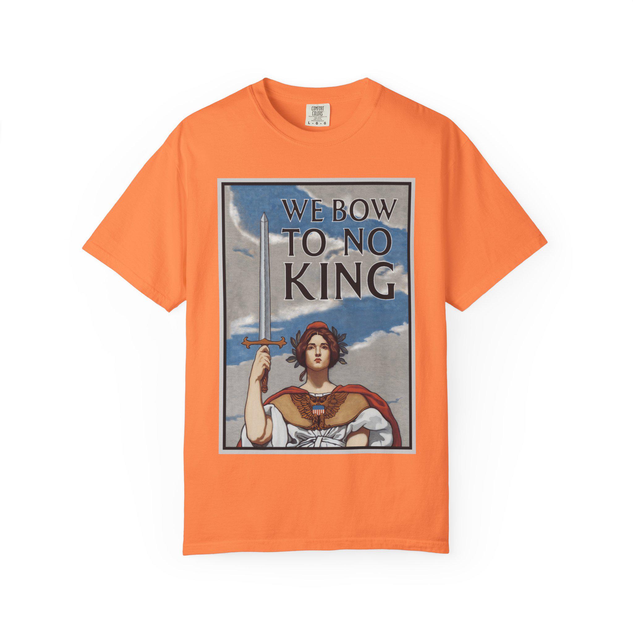 This T-shirt features a modified version of Kenyon Cox's renowned beaux-arts painting of the Goddess Columbia holding a sword, with the text 'WE BOW TO NO KING'. The design exudes a patriotic and defiant vibe, perfect for those who appreciate history and art. Ideal for Independence Day, Memorial Day, Veterans Day, and any patriotic celebration.