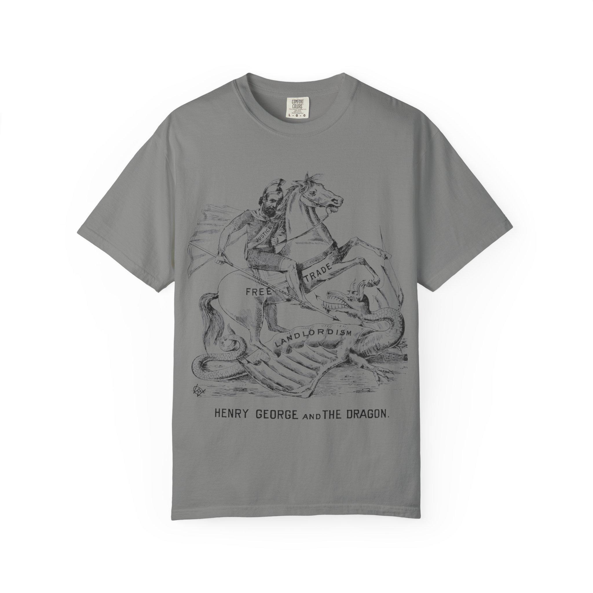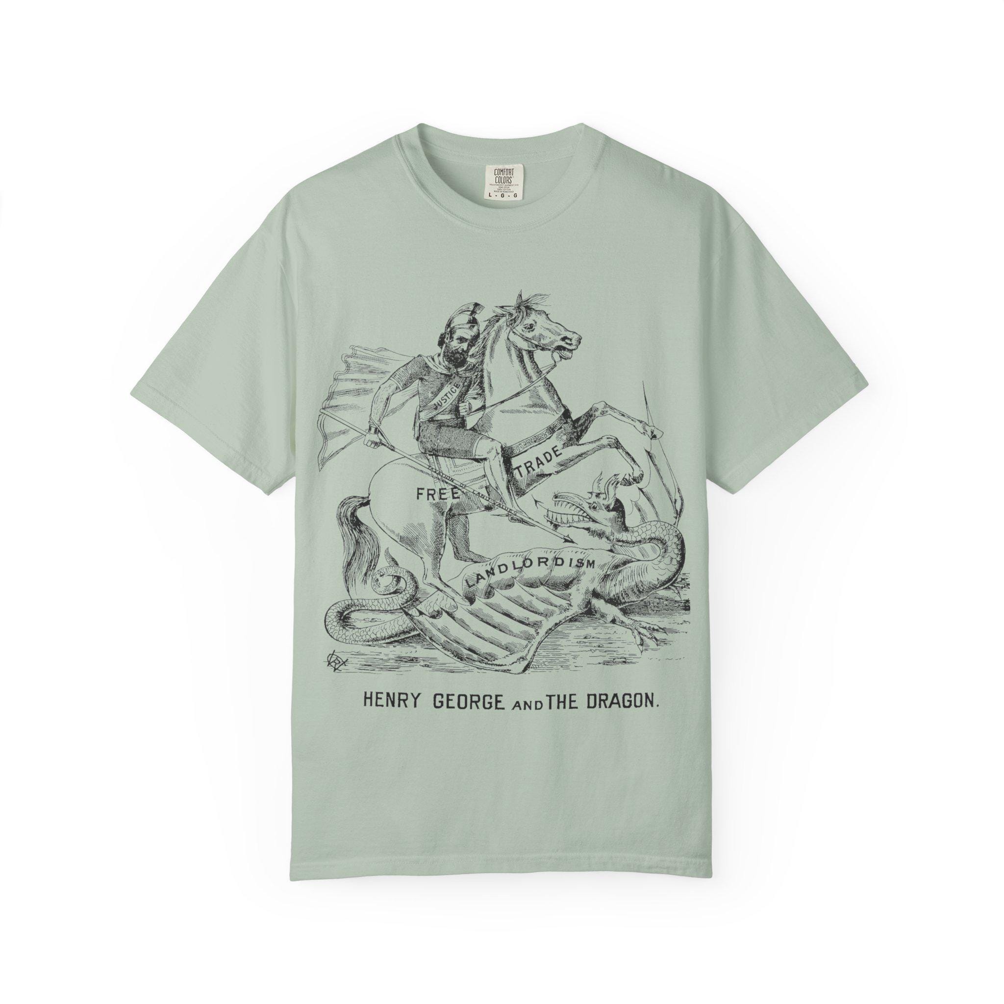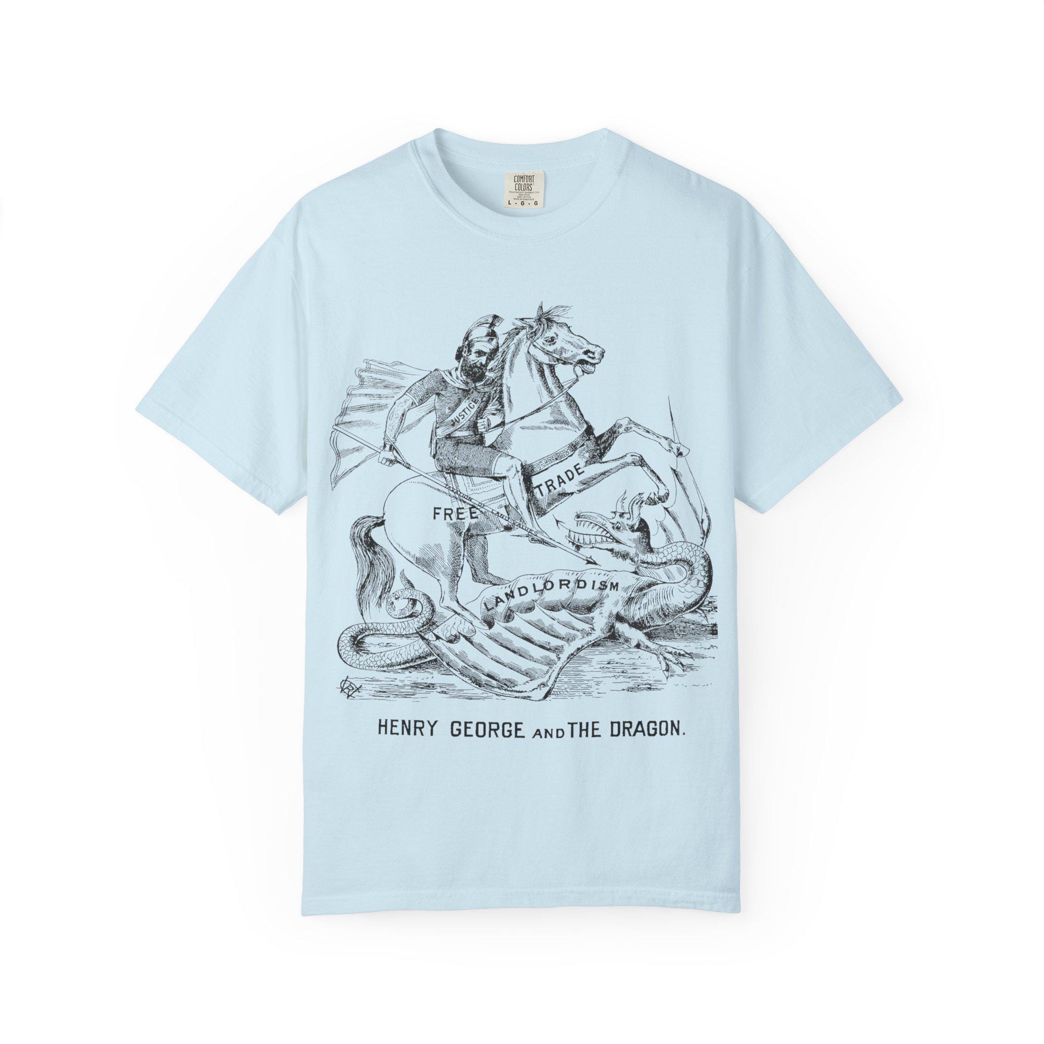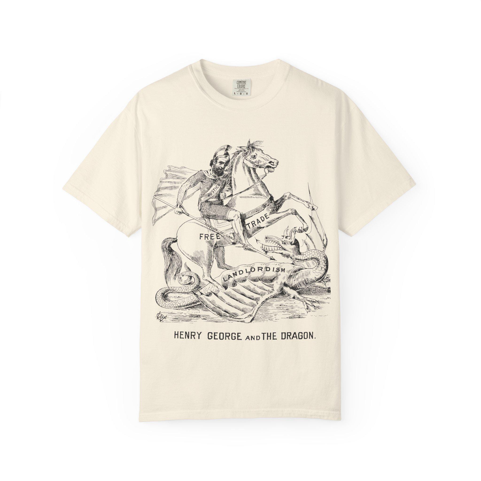 This late 19th-century political cartoon-inspired T-shirt features political economist Henry George slaying the dragon of Landlordism. With a vintage vibe and a powerful message of justice and free trade, this tee is perfect for history buffs, political enthusiasts, and those passionate about social issues. Ideal for gifts on Labor Day, Election Day, or for history-themed parties.