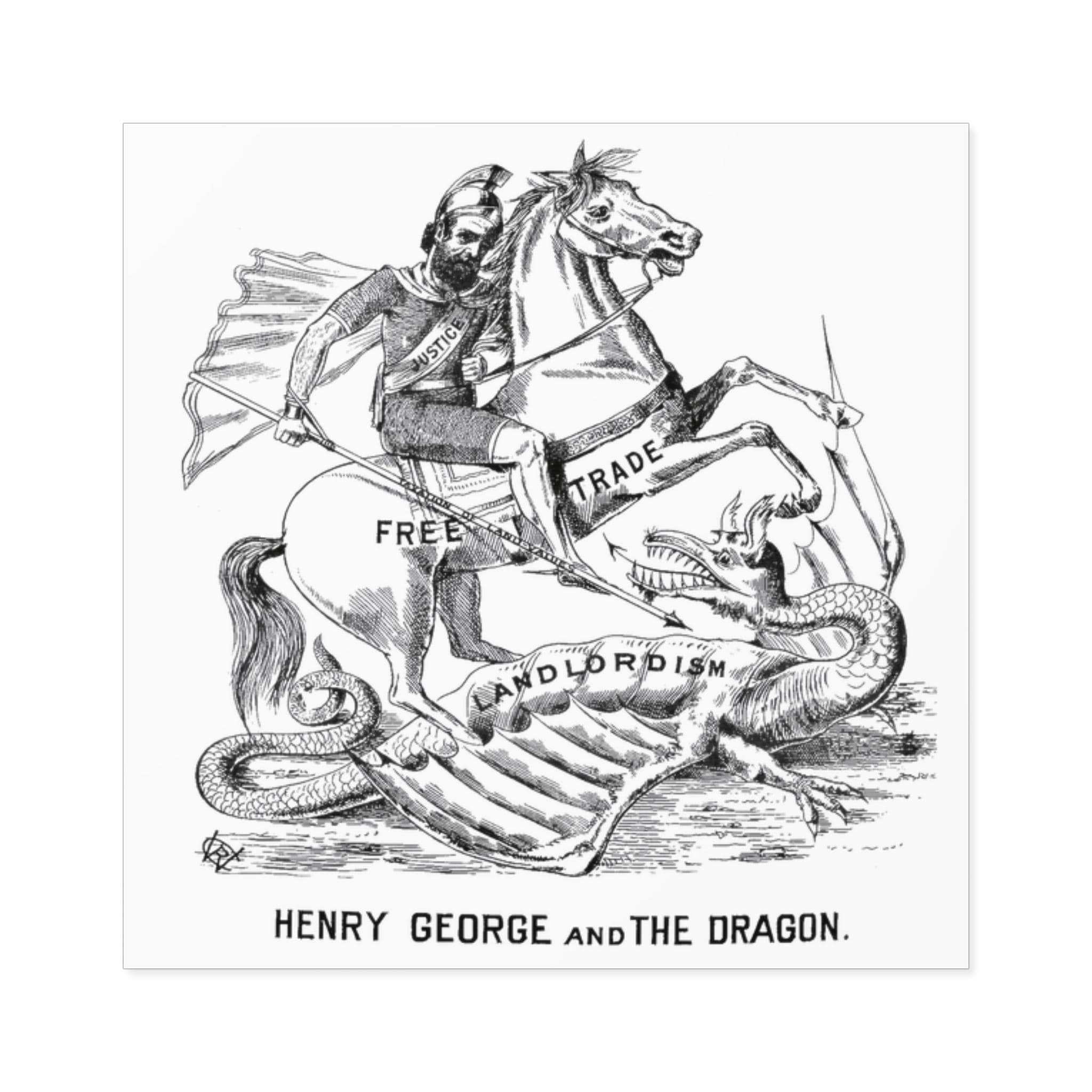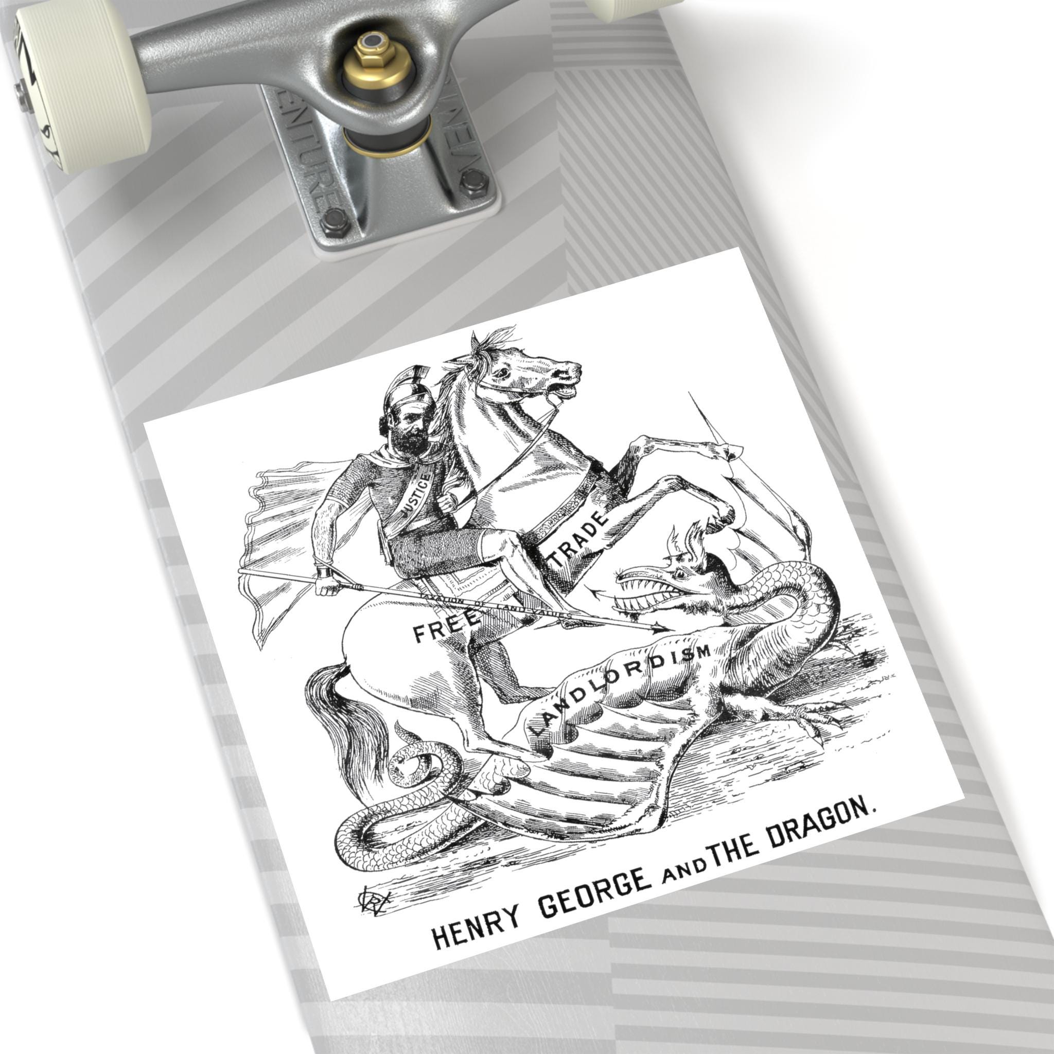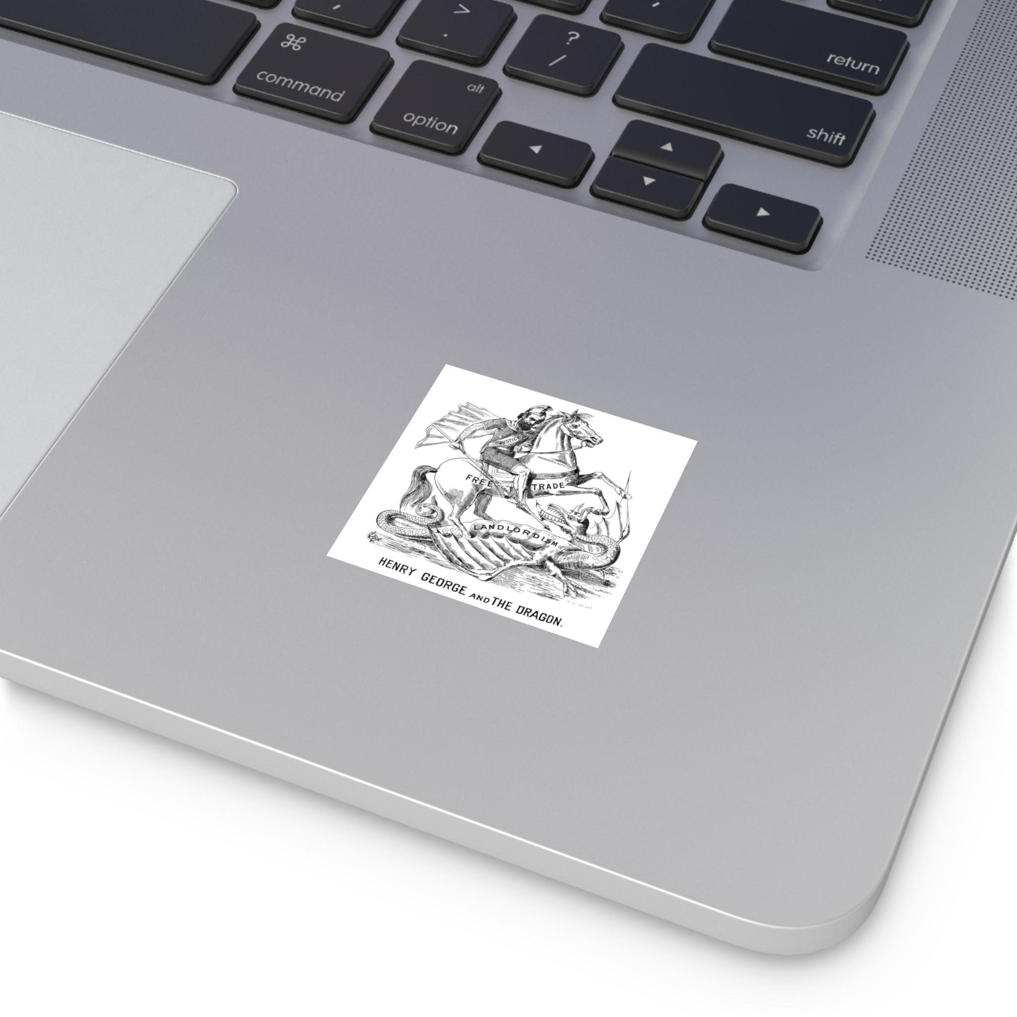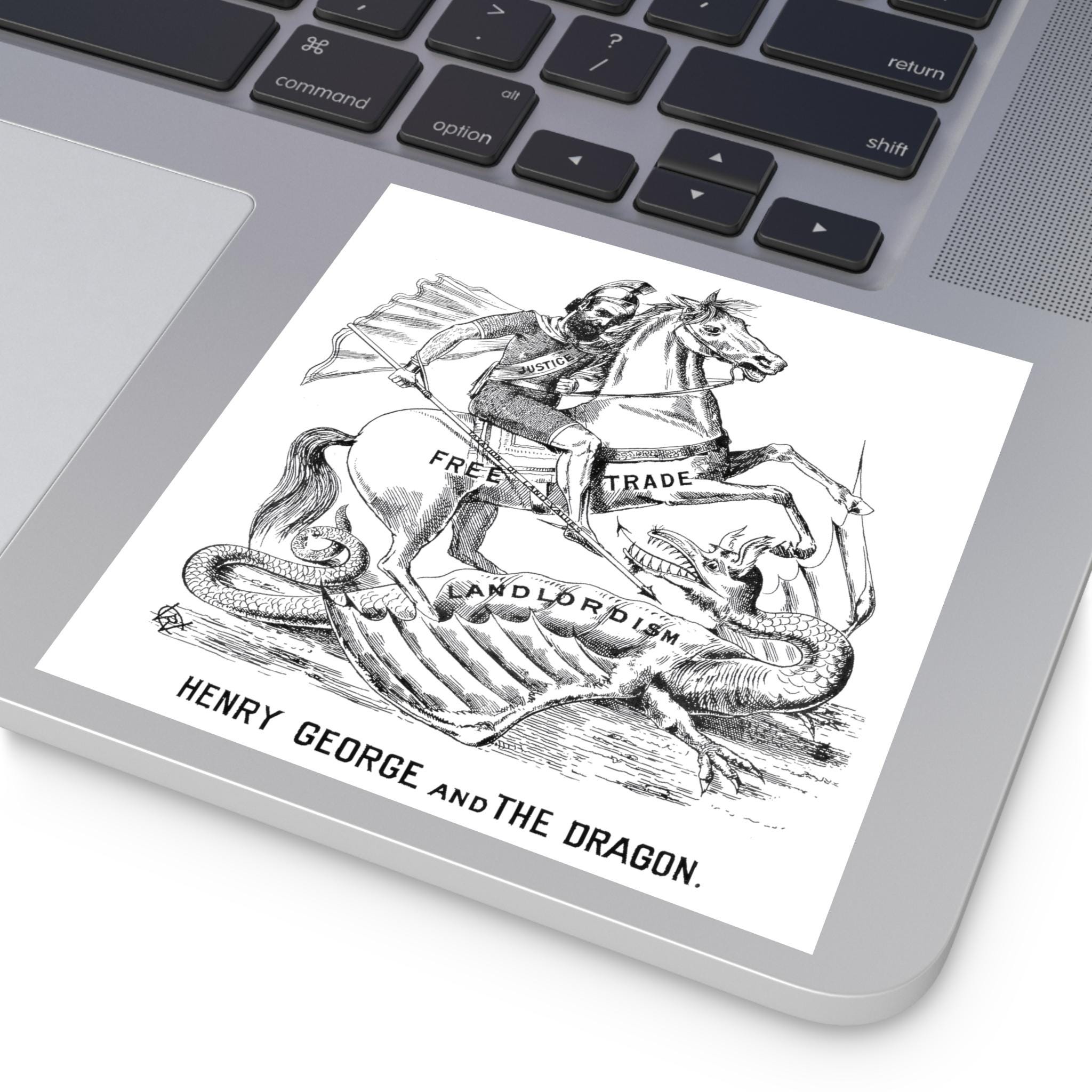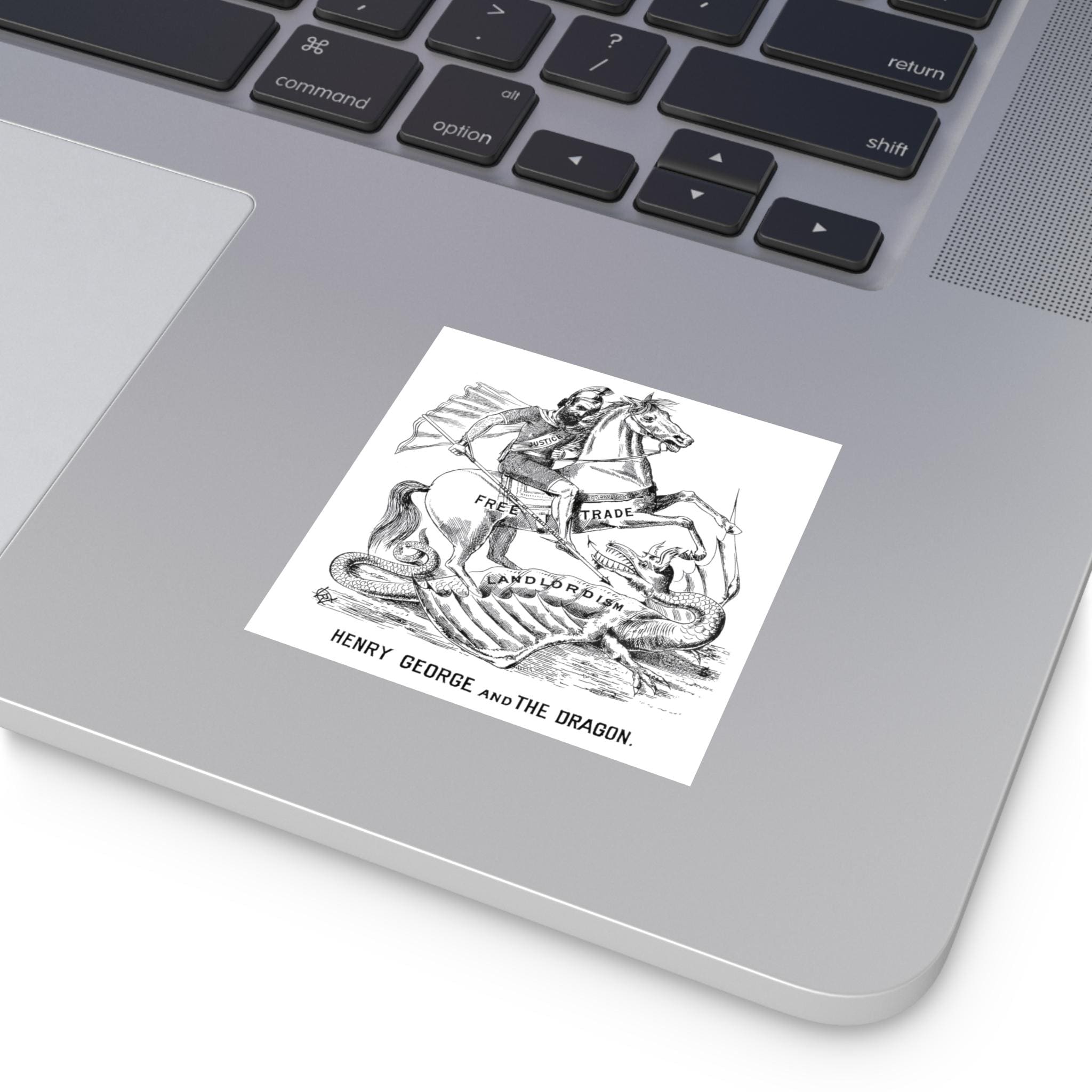 Vintage square stickers featuring a late 19th-century political cartoon of Henry George slaying a dragon labeled 'Landlordism'. Vibrant colors and durable material make them perfect for indoor or outdoor use. Ideal for history buffs, political enthusiasts, and those passionate about economic reform. Relevant for political rallies, economic discussions, or historical themed events.
