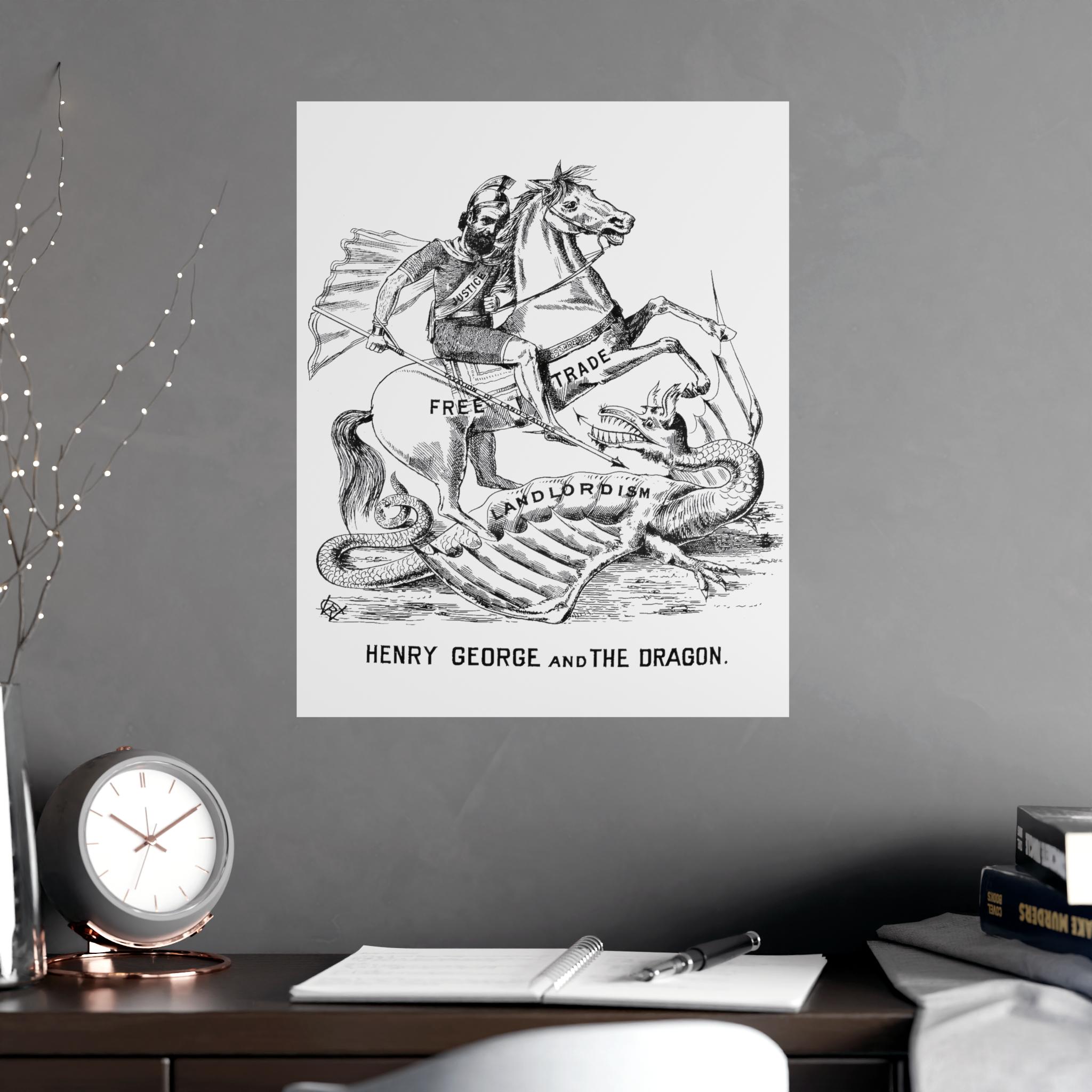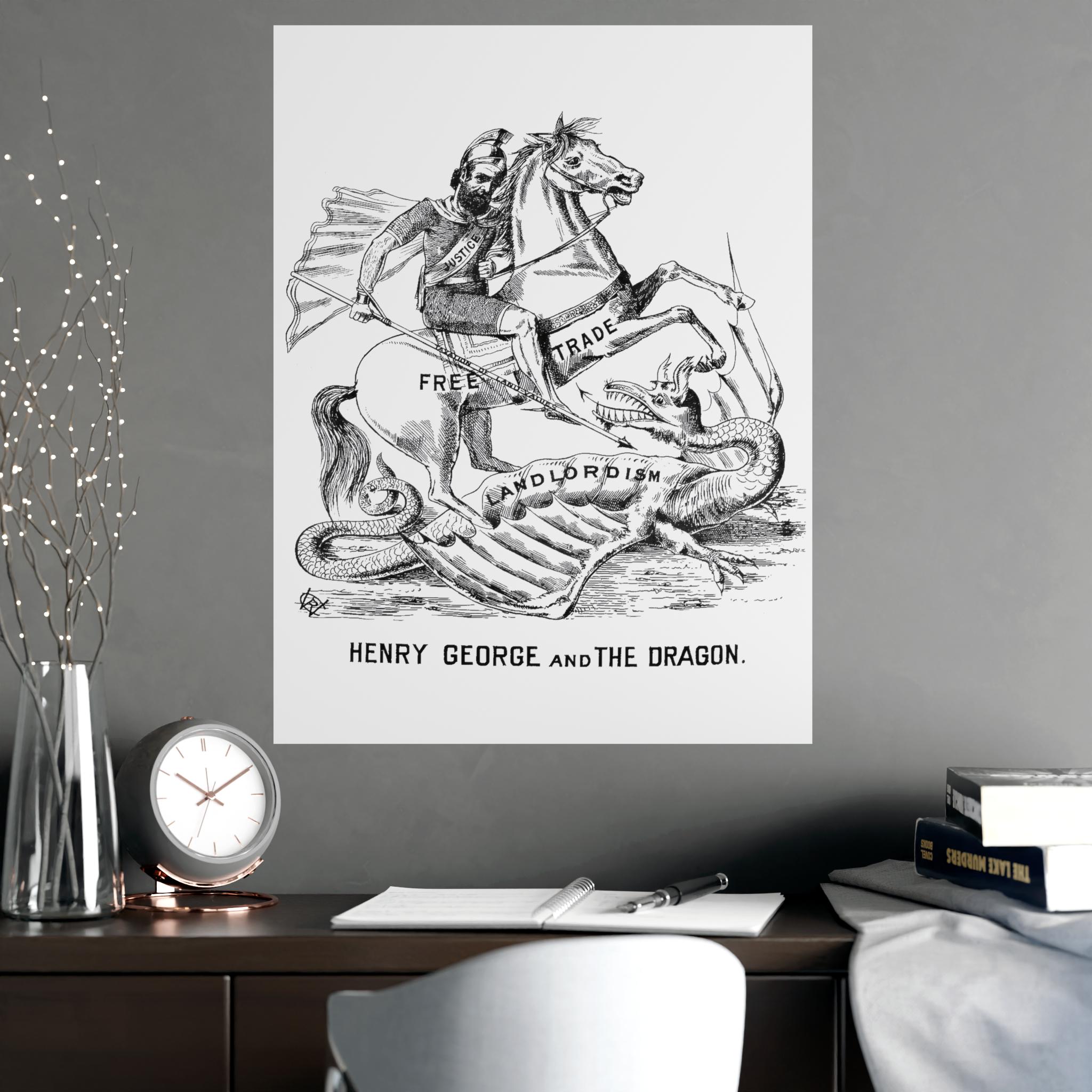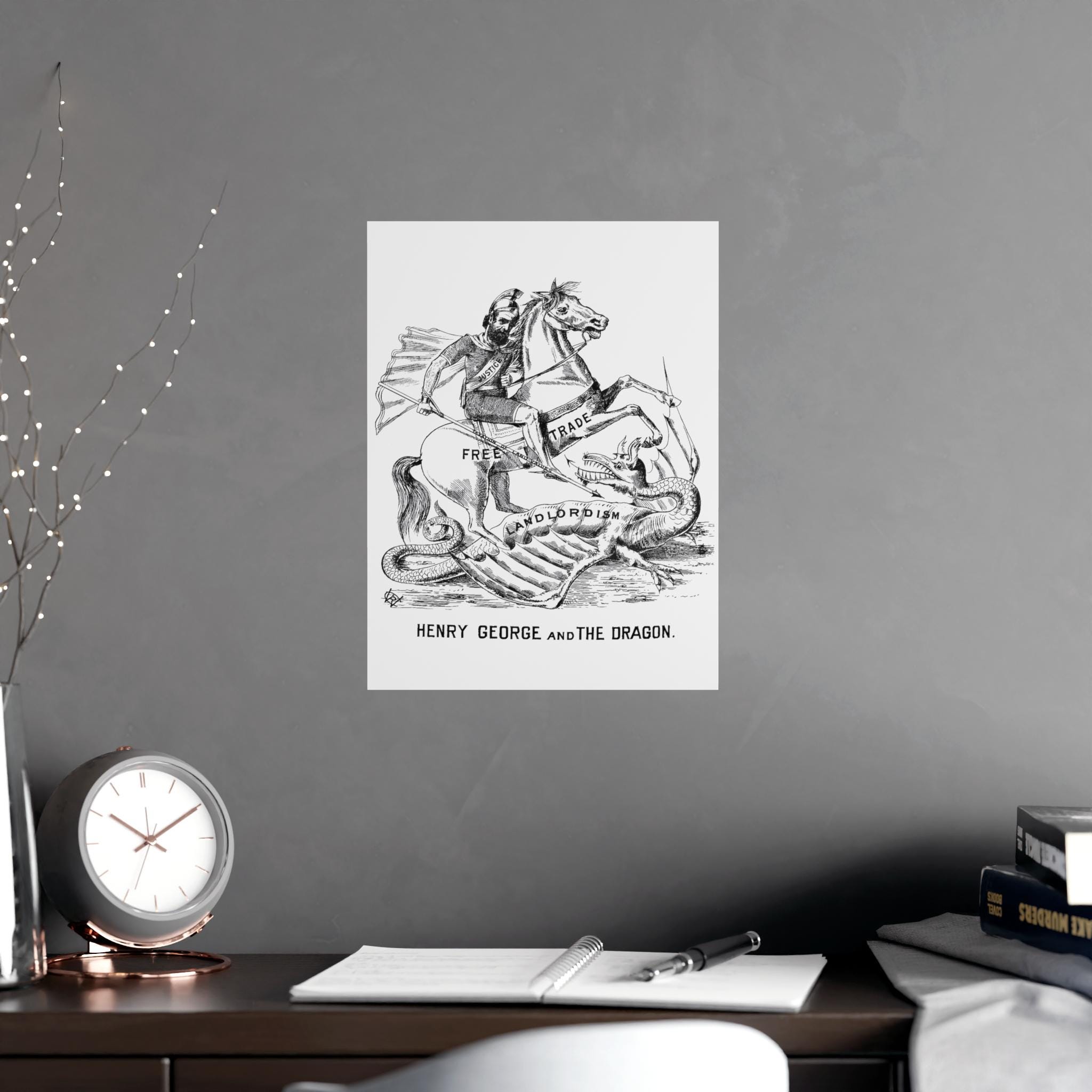 This vintage political cartoon poster featuring Henry George slaying the dragon of 'Landlordism' exudes a historical and intellectual vibe. Perfect for history buffs, economists, and those interested in social justice. Ideal for decorating home offices, study rooms, or classrooms. Relevant for Labor Day, Election Day, and Economic Awareness Month.