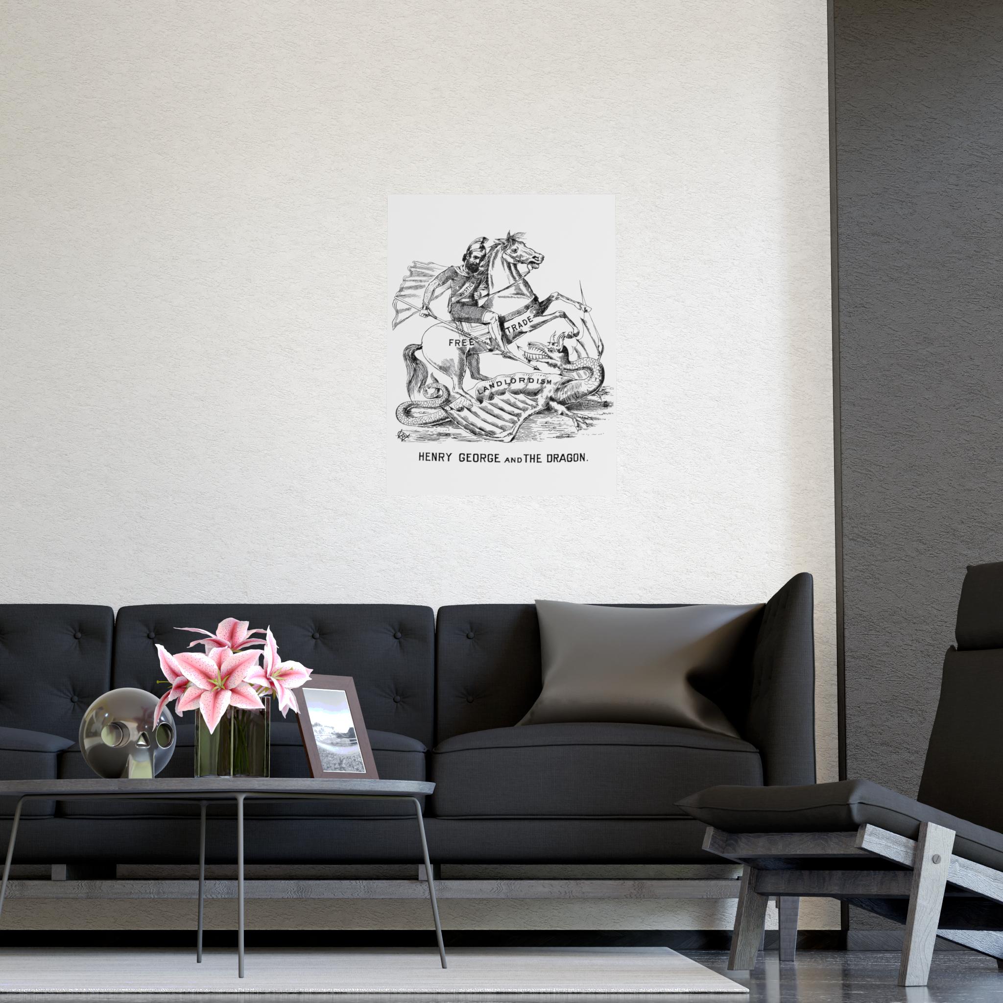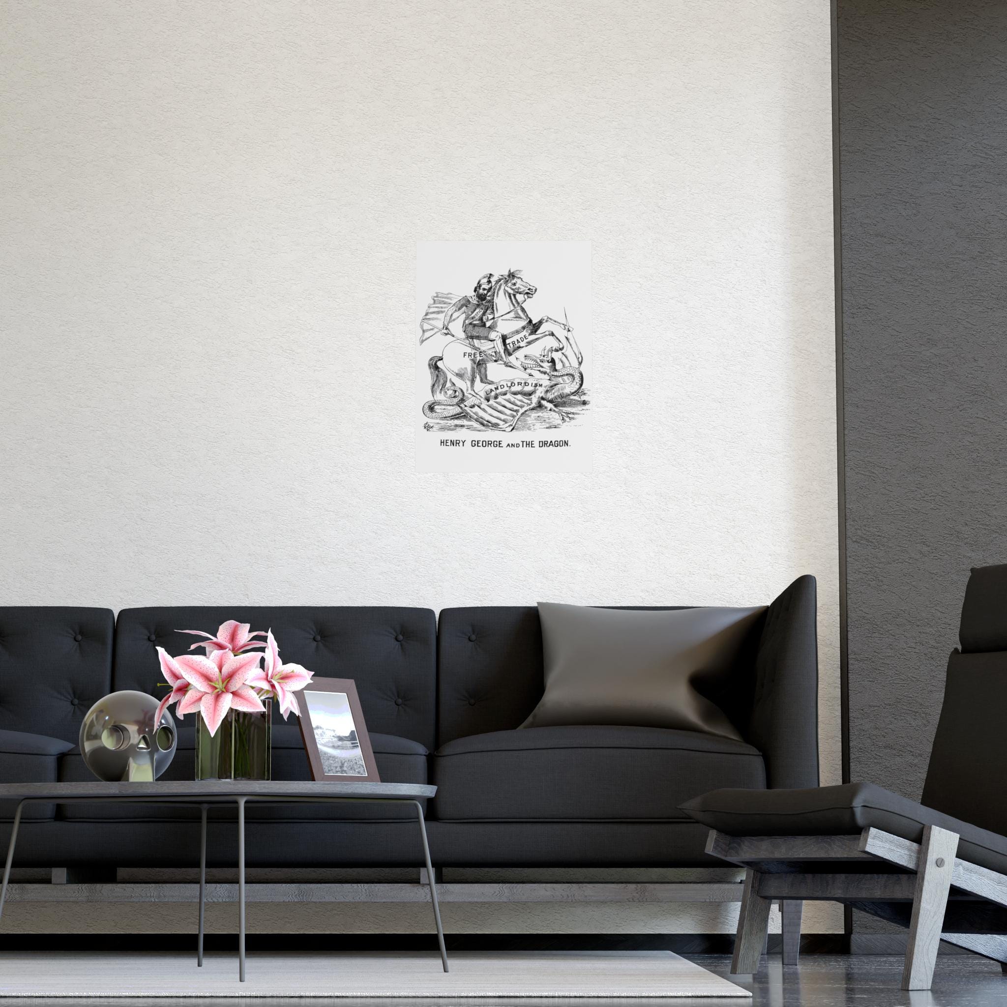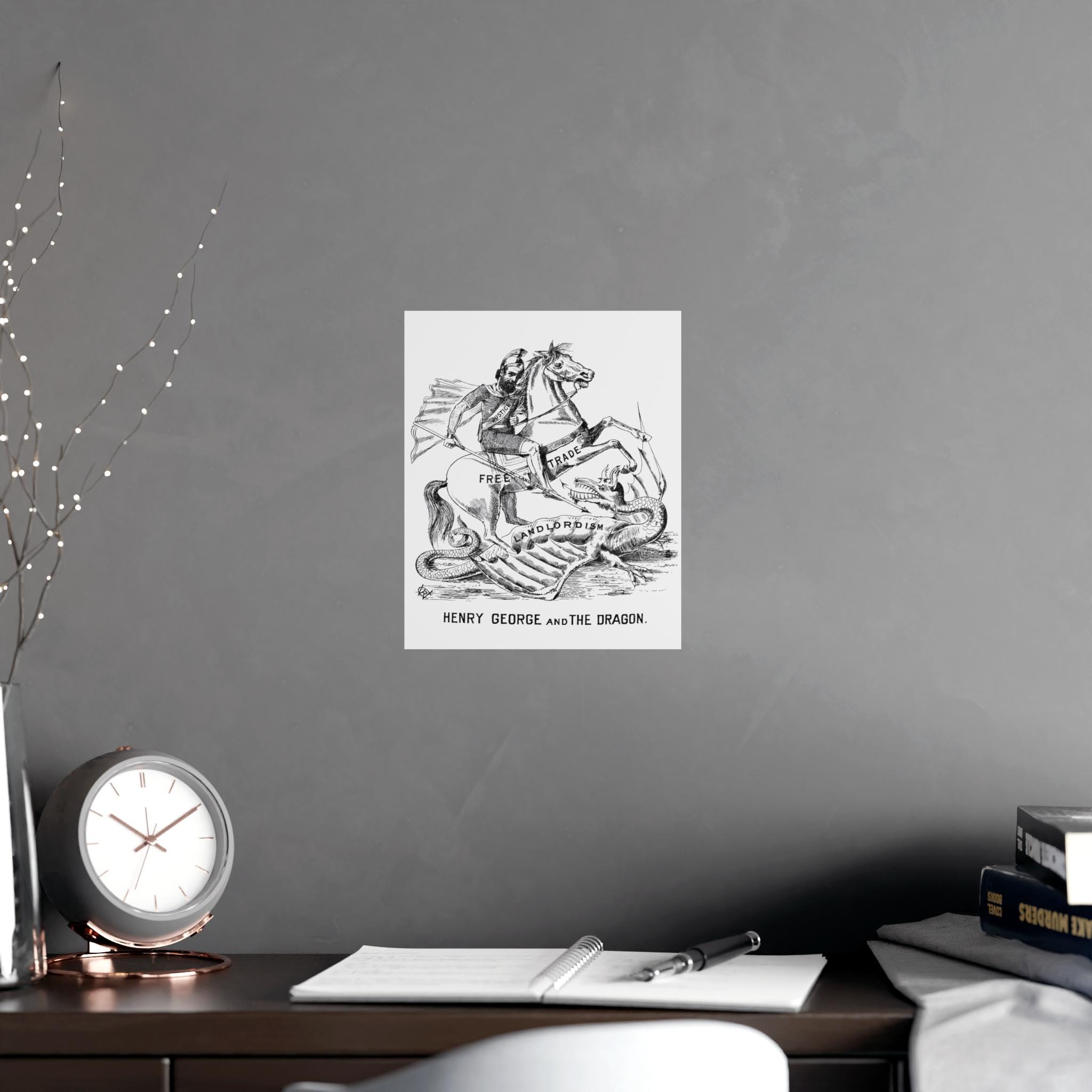 This vintage political cartoon poster featuring Henry George slaying the dragon of 'Landlordism' exudes a historical and intellectual vibe. Perfect for history buffs, economists, and those interested in social justice. Ideal for decorating home offices, study rooms, or classrooms. Relevant for Labor Day, Election Day, and Economic Awareness Month.