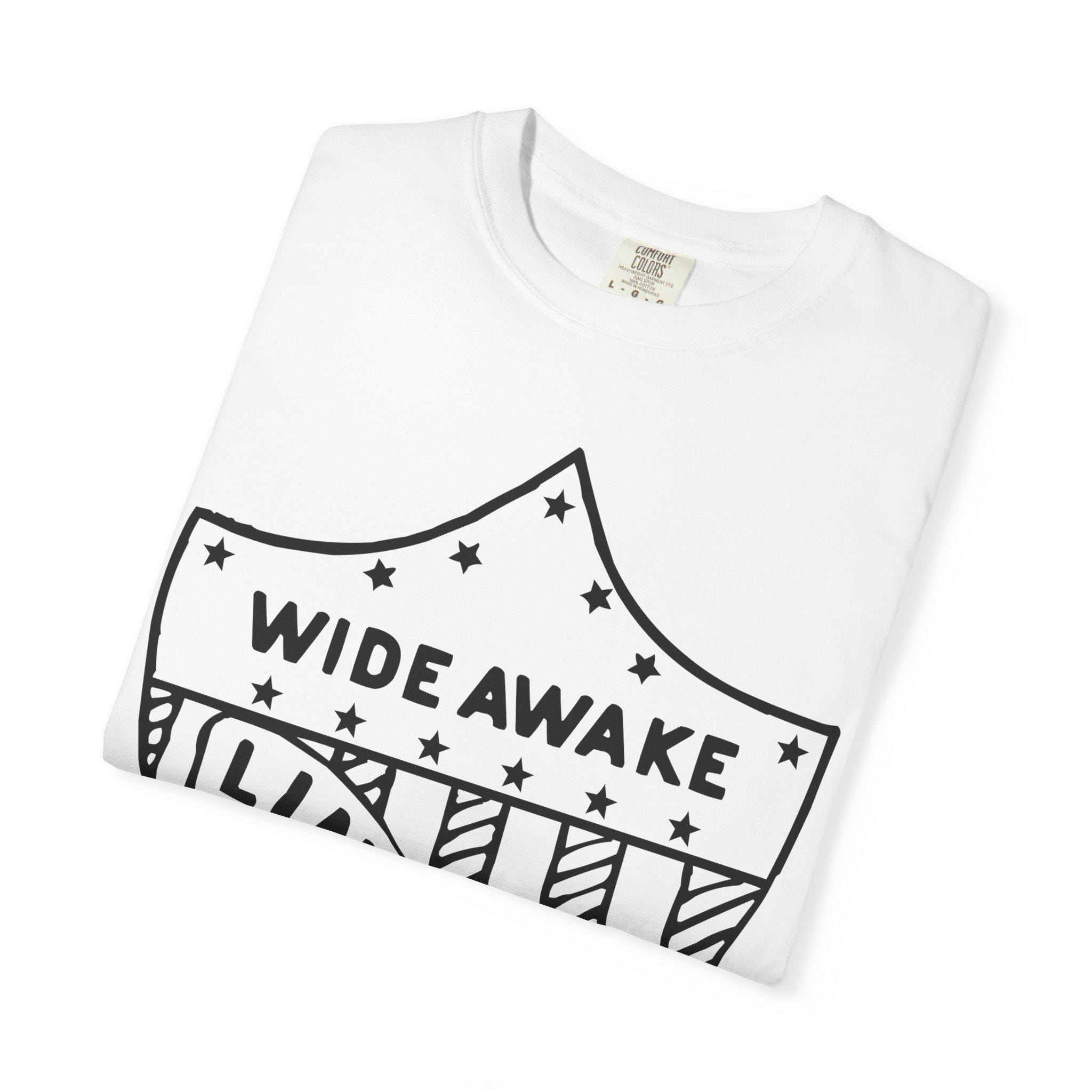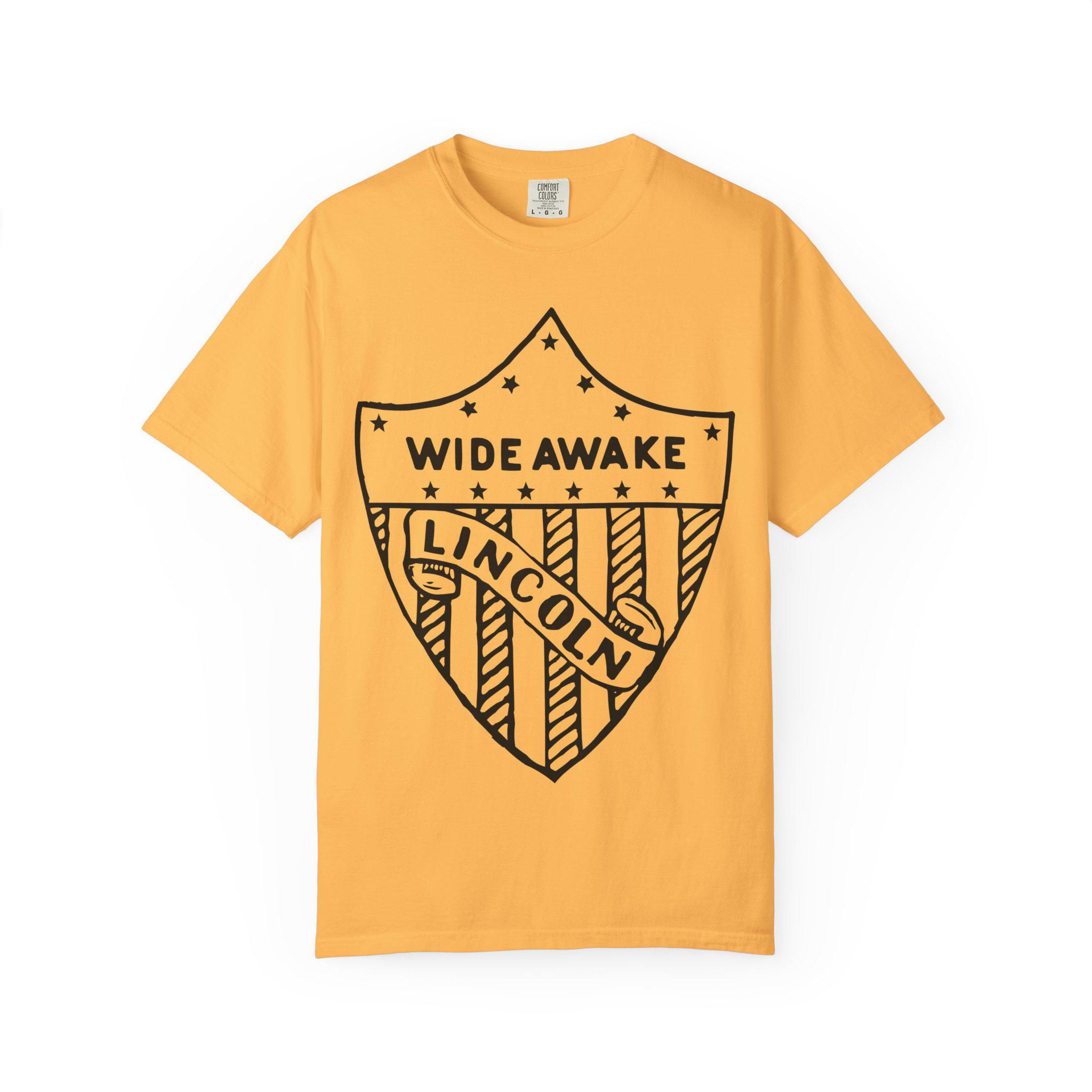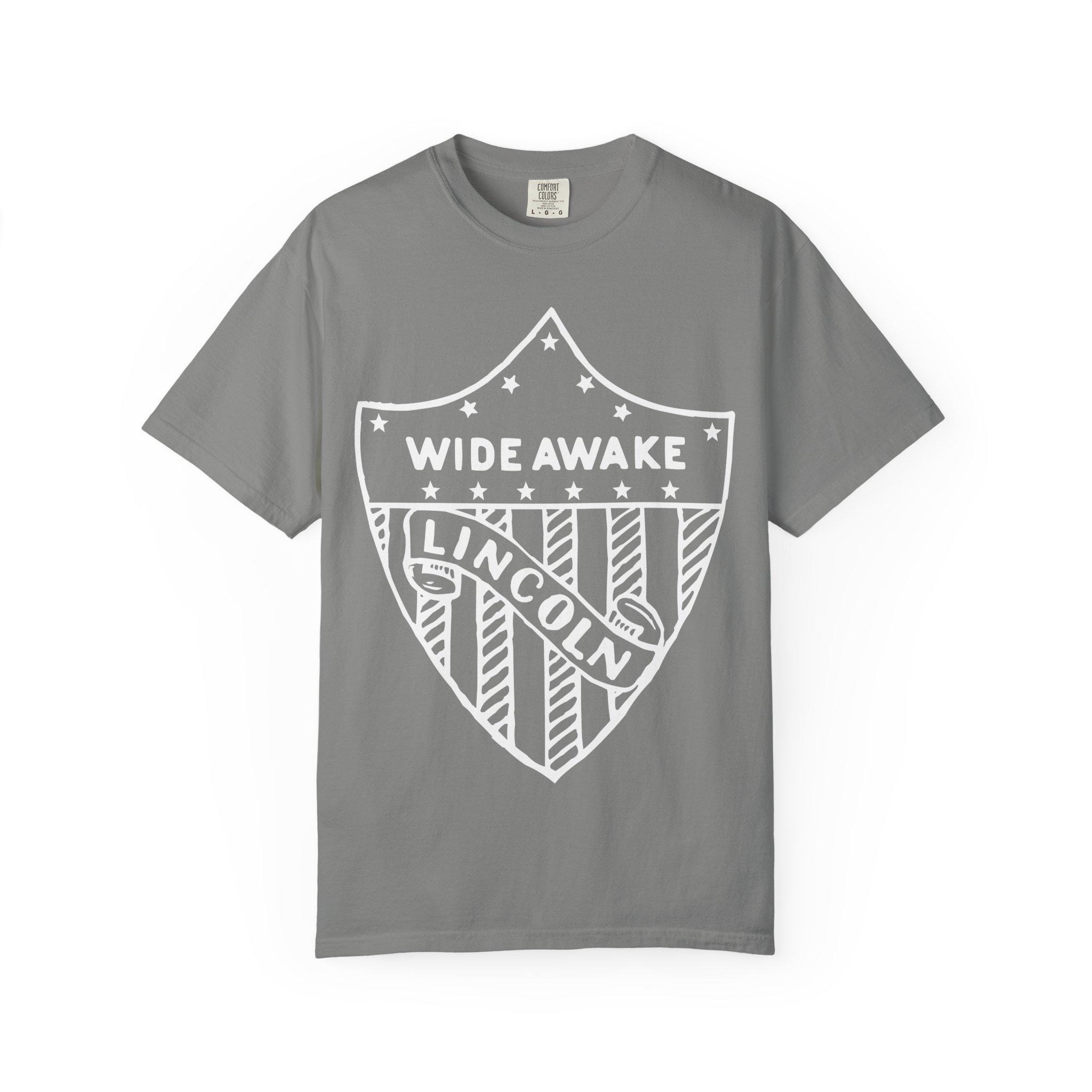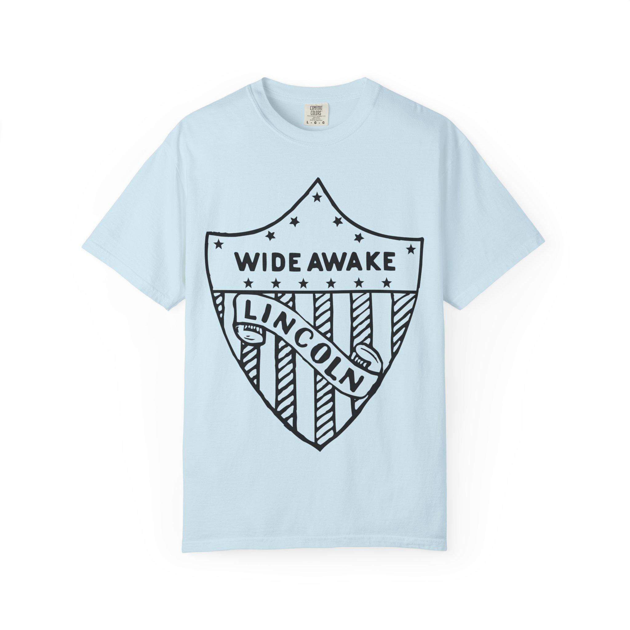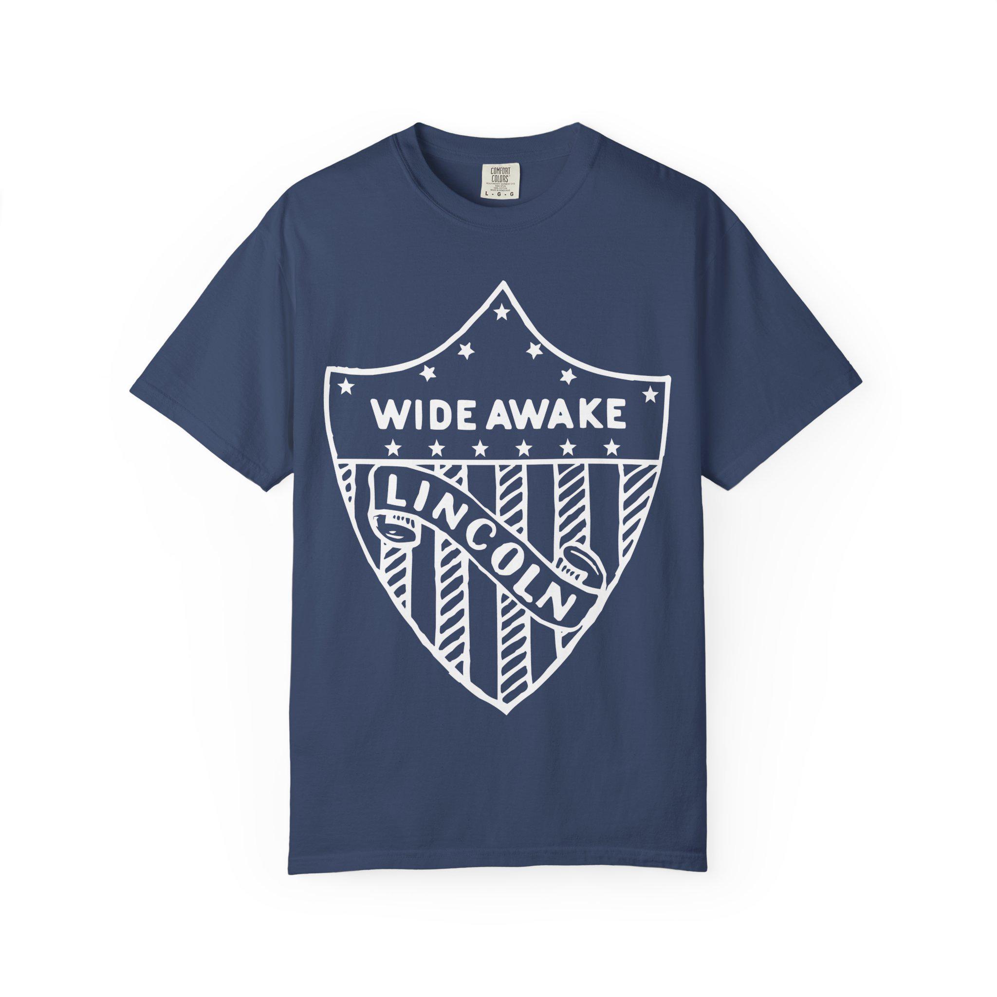 This authentic election merchandise T-shirt features an etched pin design from the 1860 Abraham Lincoln campaign, showcasing an American flag shield with the text "WIDE AWAKE" and "LINCOLN". The garment-dyed fabric gives it a soft color and texture, and the double-needle stitching ensures durability. Perfect for history enthusiasts and patriotic individuals, this T-shirt is ideal for wearing during election season, Independence Day, and other patriotic celebrations.