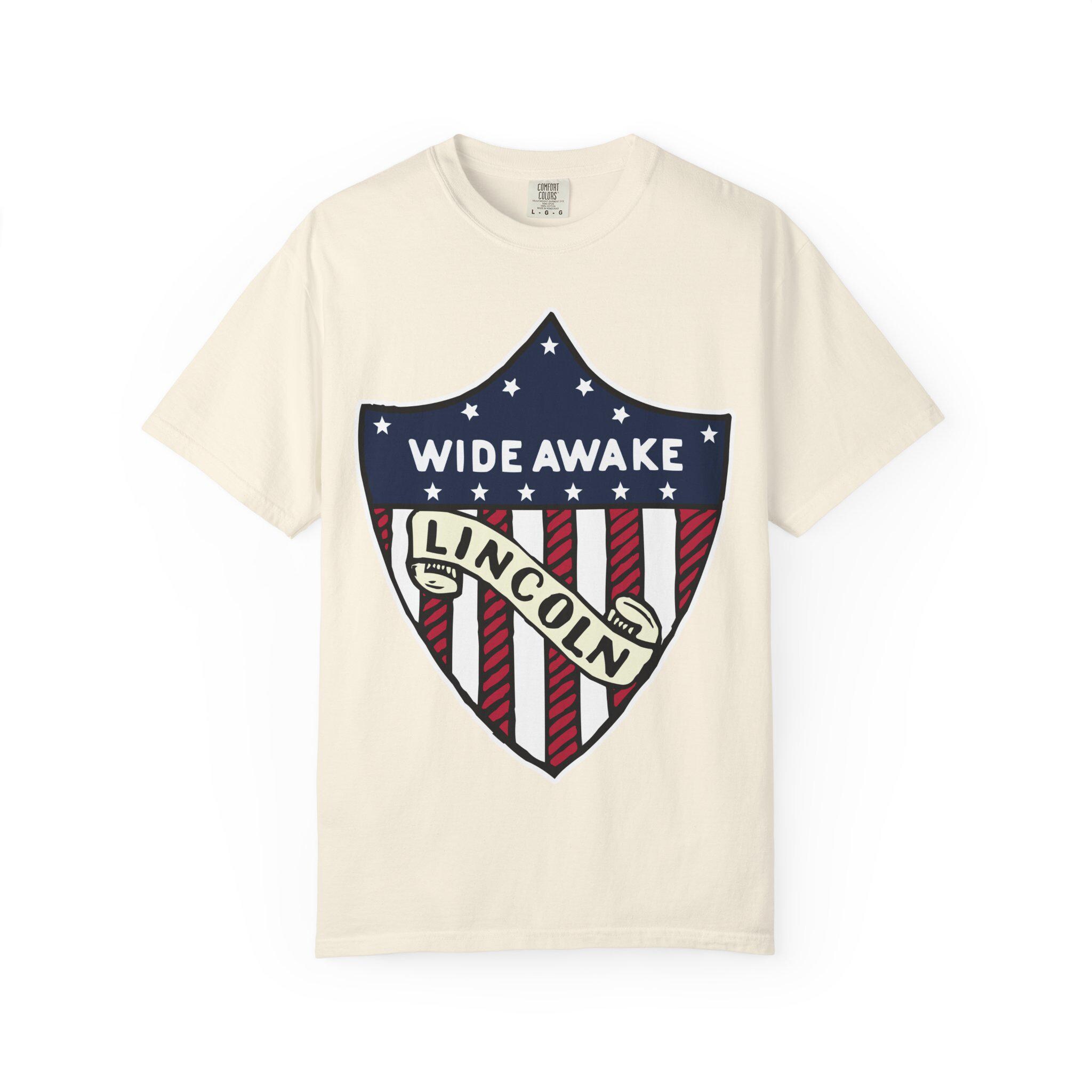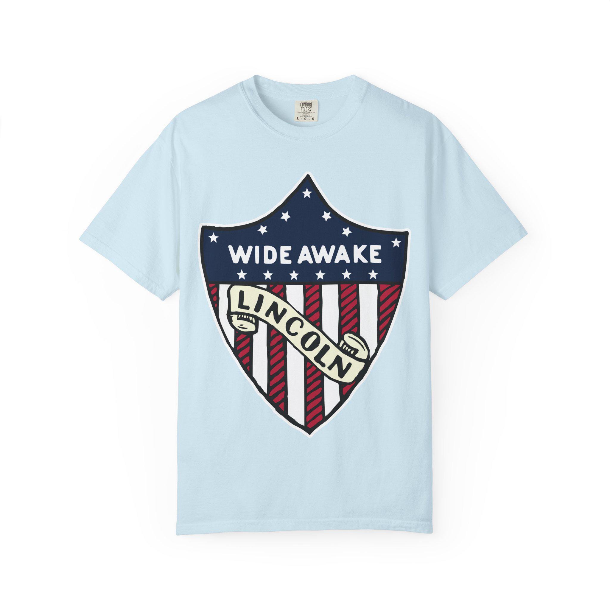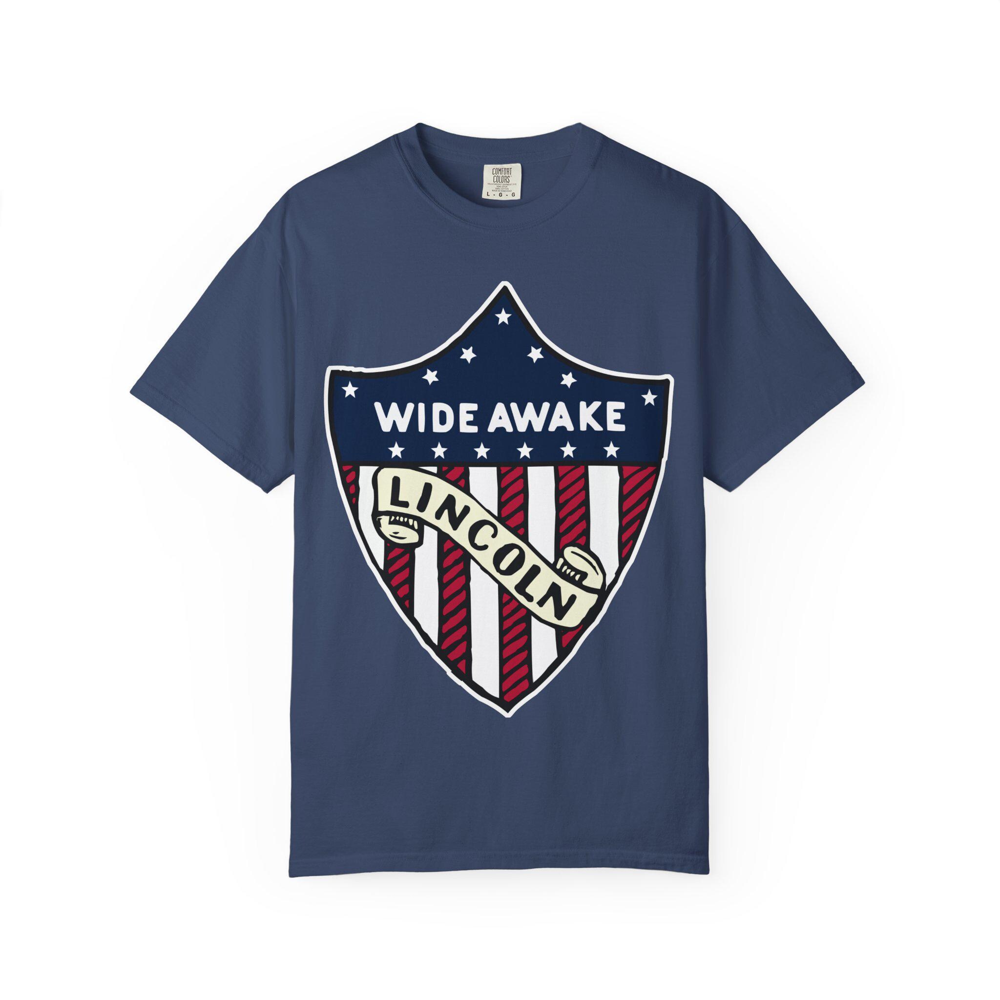 This T-Shirt features a design from genuine 1860 Abraham Lincoln election merchandise American flag shield, with the text 'WIDE AWAKE' and 'LINCOLN'. It gives off a patriotic and historical vibe, perfect for history buffs and political enthusiasts. Relevant for 4th of July, Presidents' Day, and historical event celebrations.