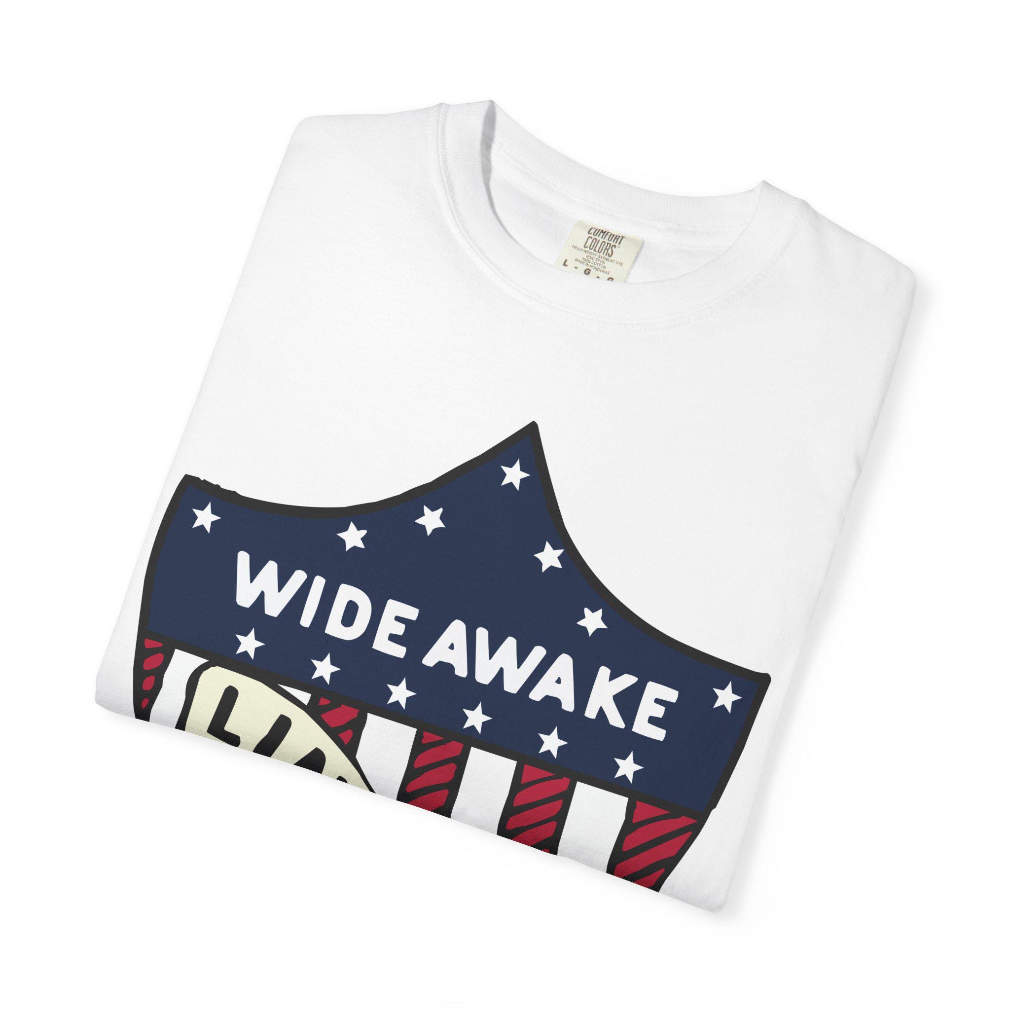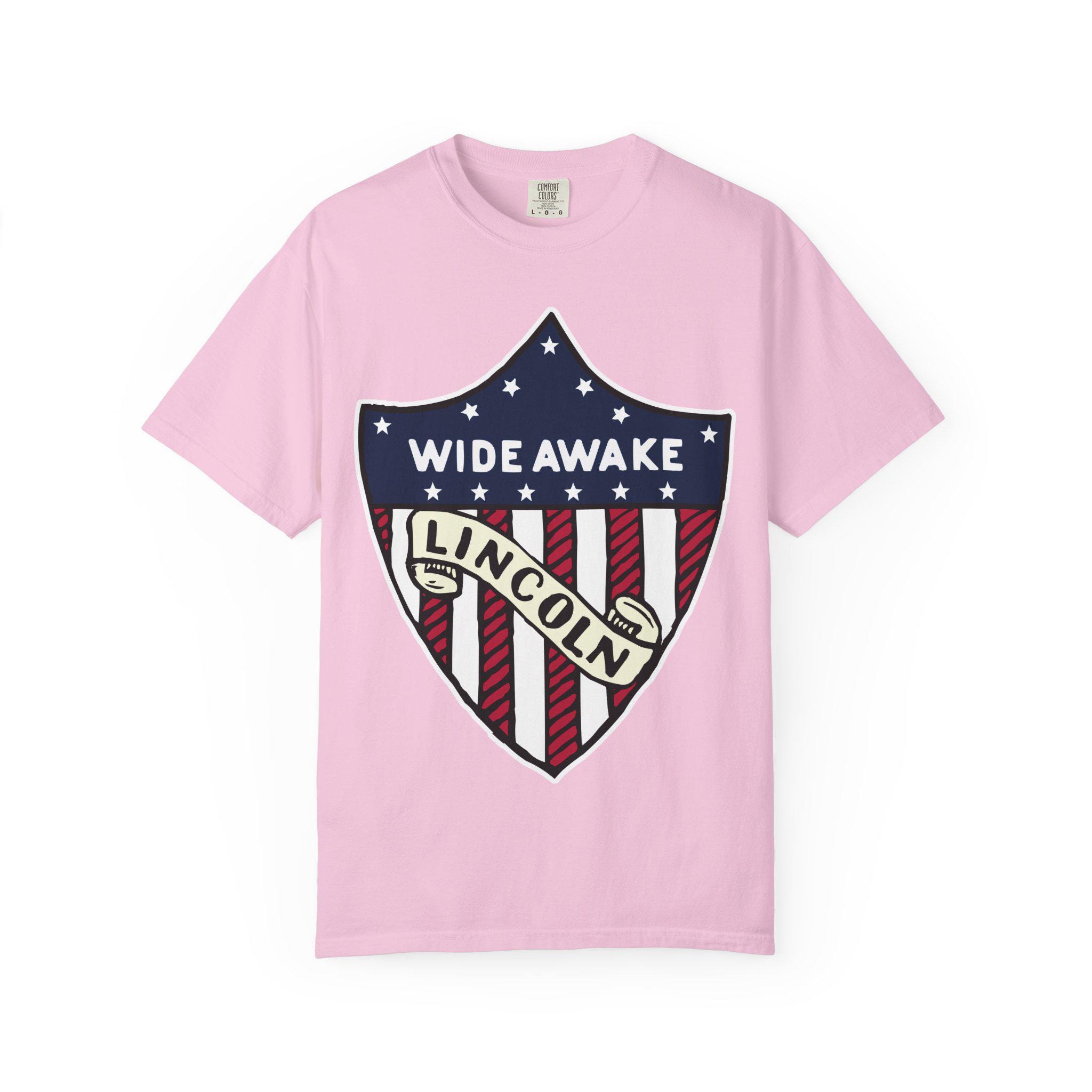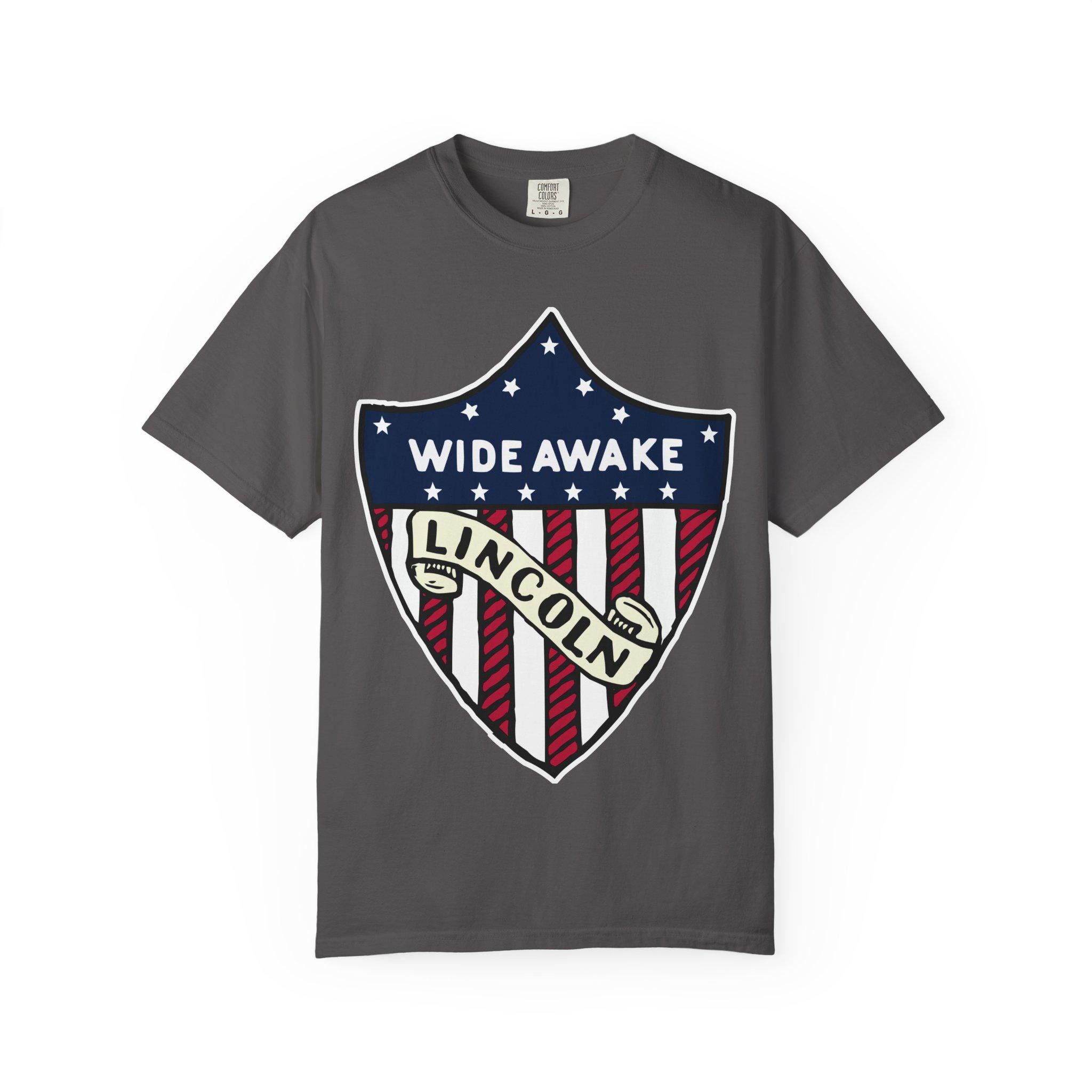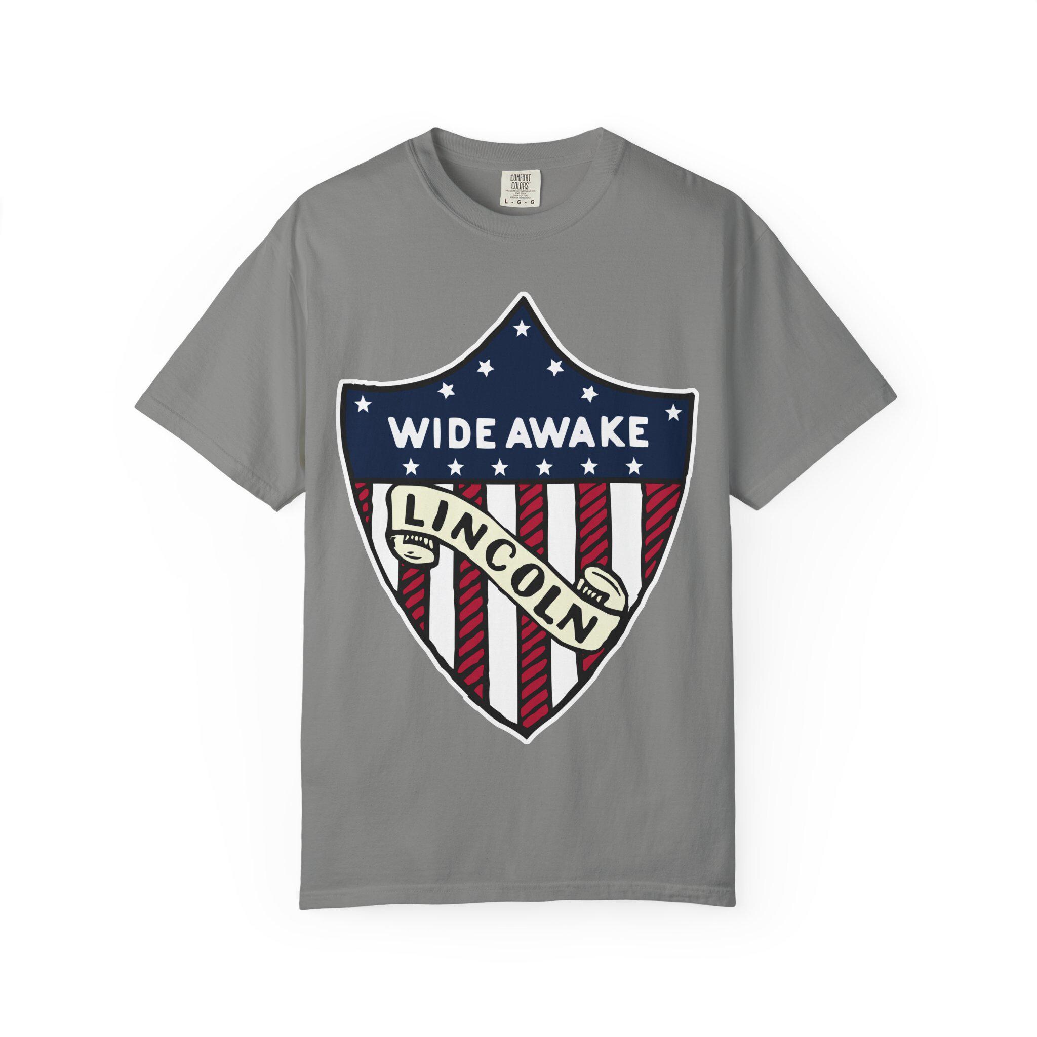 This T-Shirt features a design from genuine 1860 Abraham Lincoln election merchandise American flag shield, with the text 'WIDE AWAKE' and 'LINCOLN'. It gives off a patriotic and historical vibe, perfect for history buffs and political enthusiasts. Relevant for 4th of July, Presidents' Day, and historical event celebrations.