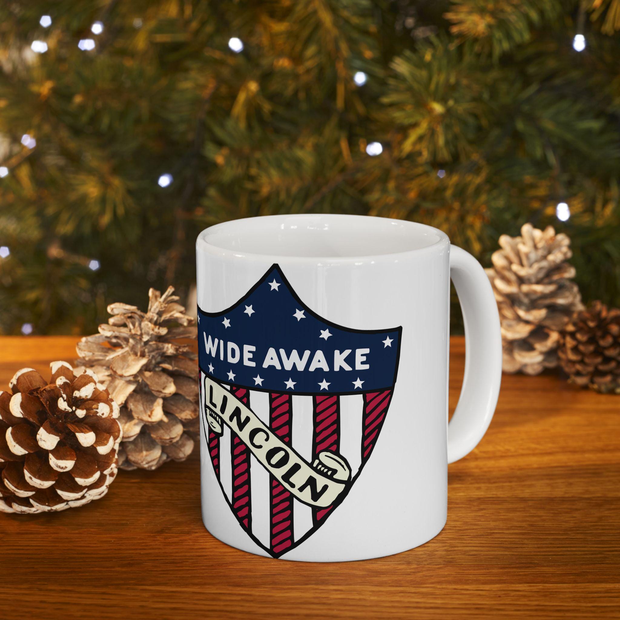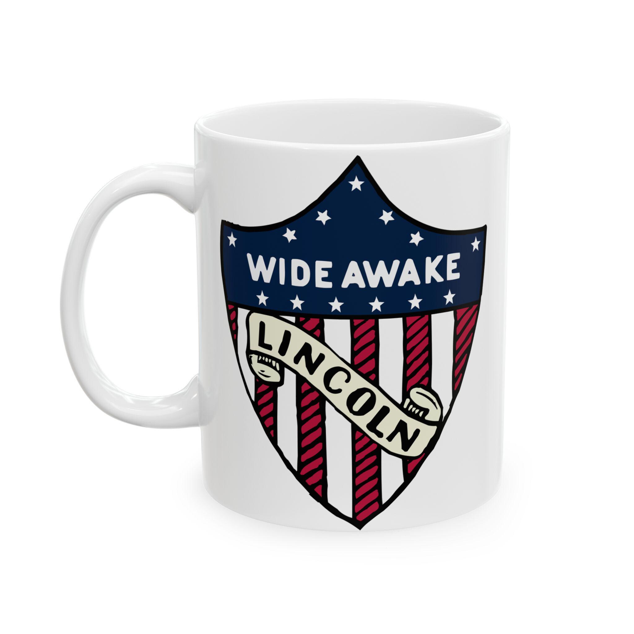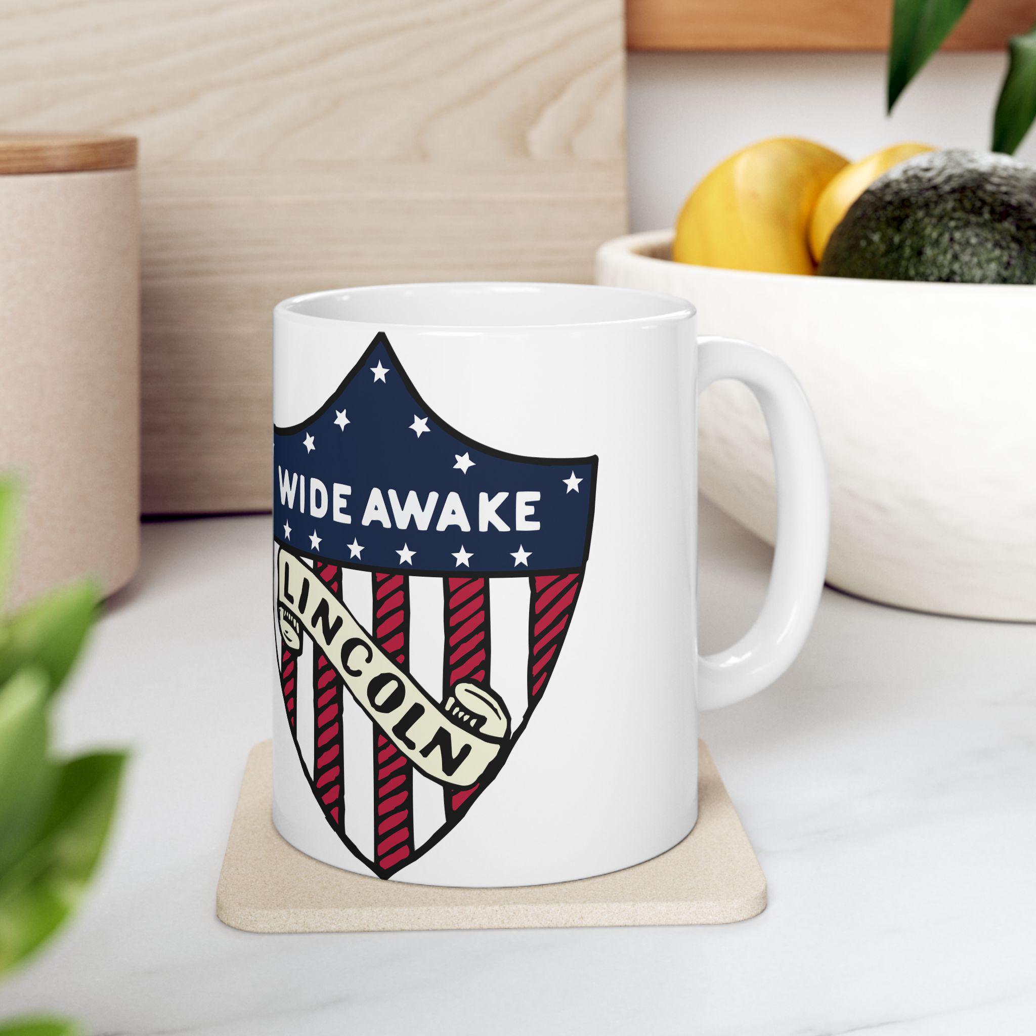 This ceramic mug features a design inspired by genuine 1860 Abraham Lincoln election merchandise with American flag shield, showcasing the text 'WIDE AWAKE' and 'LINCOLN'. Perfect for history buffs, political enthusiasts, and patriotic individuals. Ideal for celebrating Presidents Day, Independence Day, and political events.