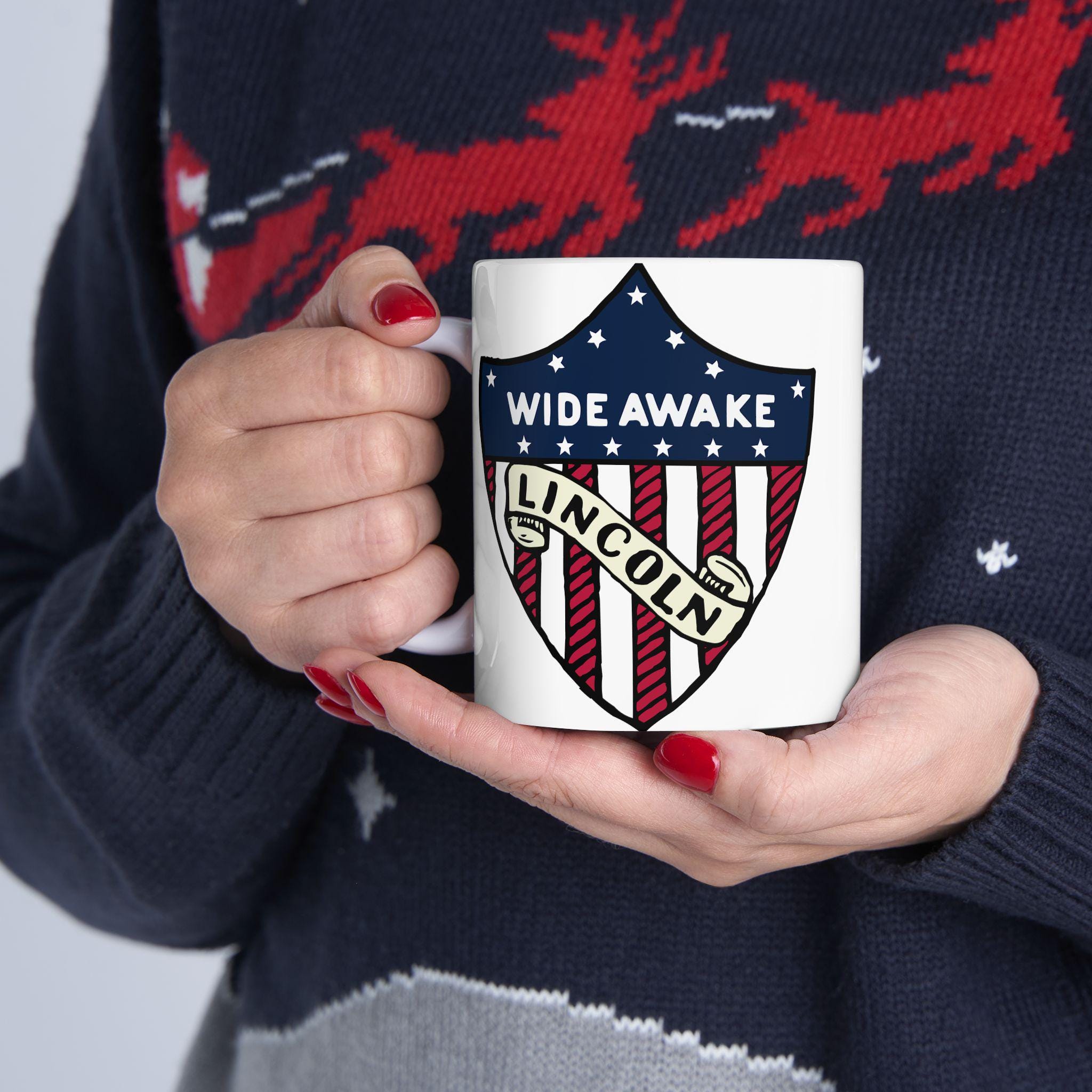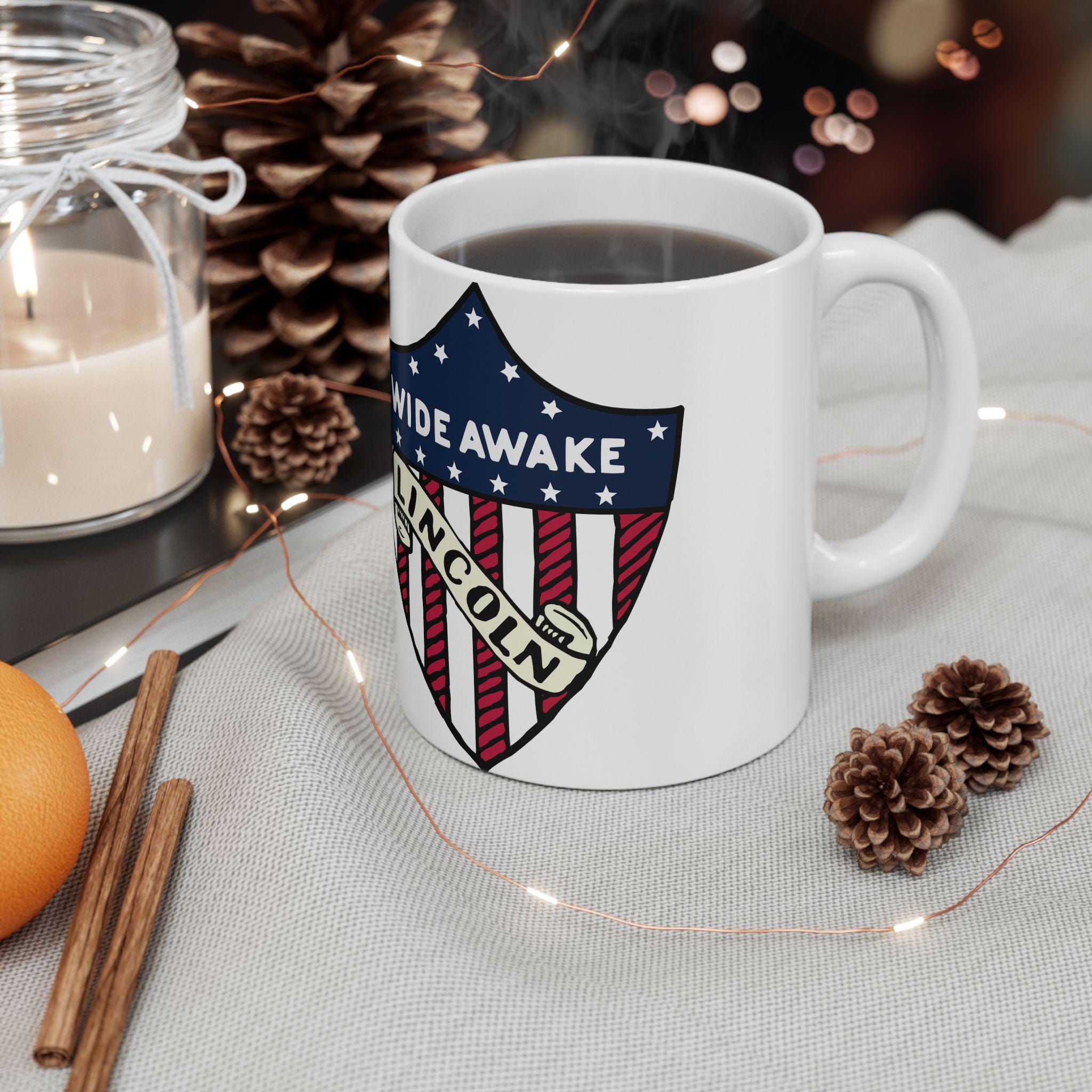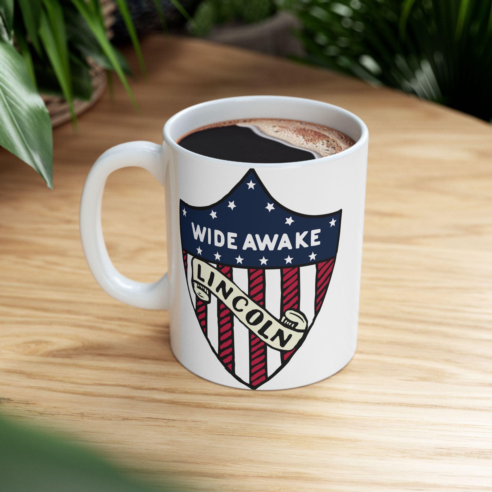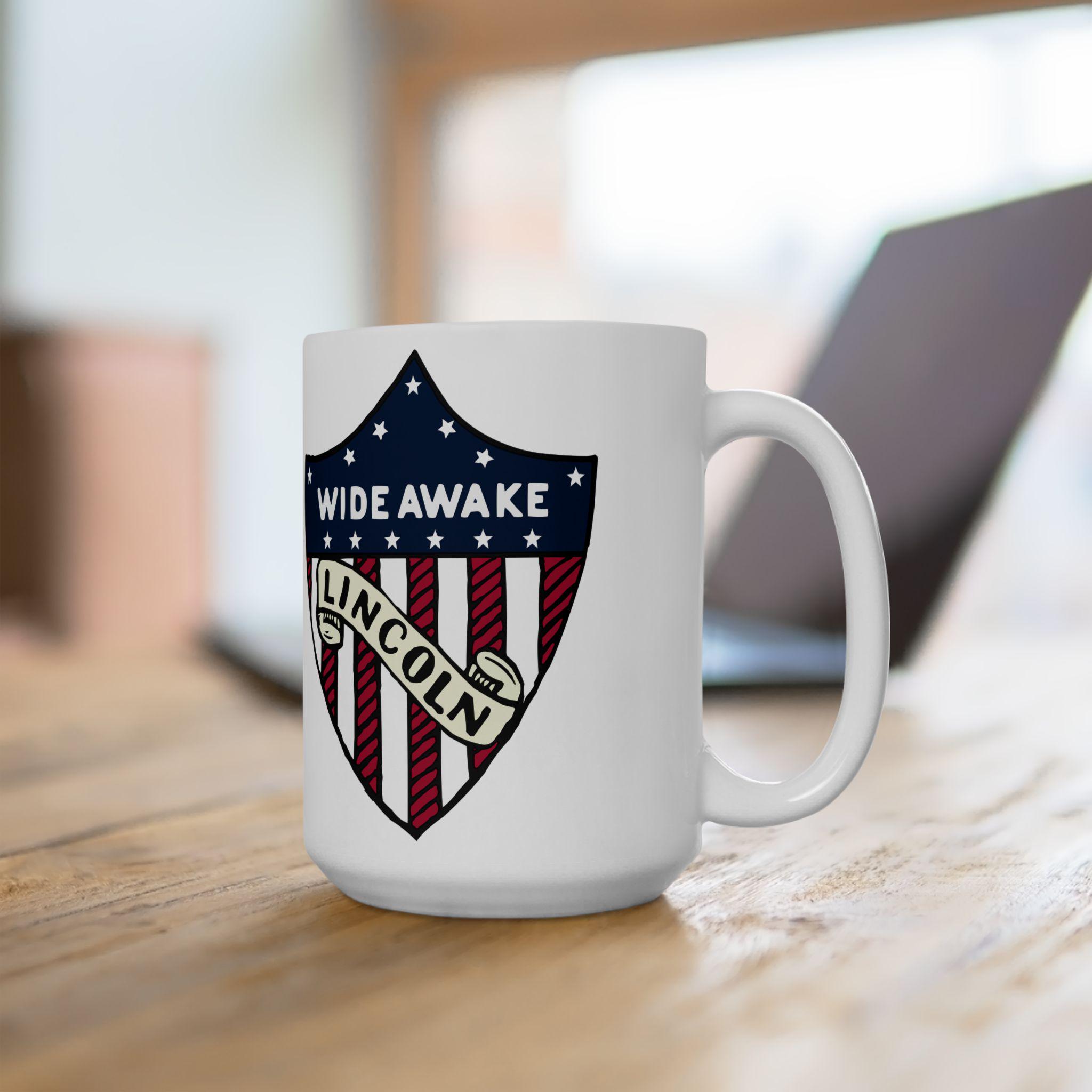 This ceramic mug features a design inspired by genuine 1860 Abraham Lincoln election merchandise with American flag shield, showcasing the text 'WIDE AWAKE' and 'LINCOLN'. Perfect for history buffs, political enthusiasts, and patriotic individuals. Ideal for celebrating Presidents Day, Independence Day, and political events.