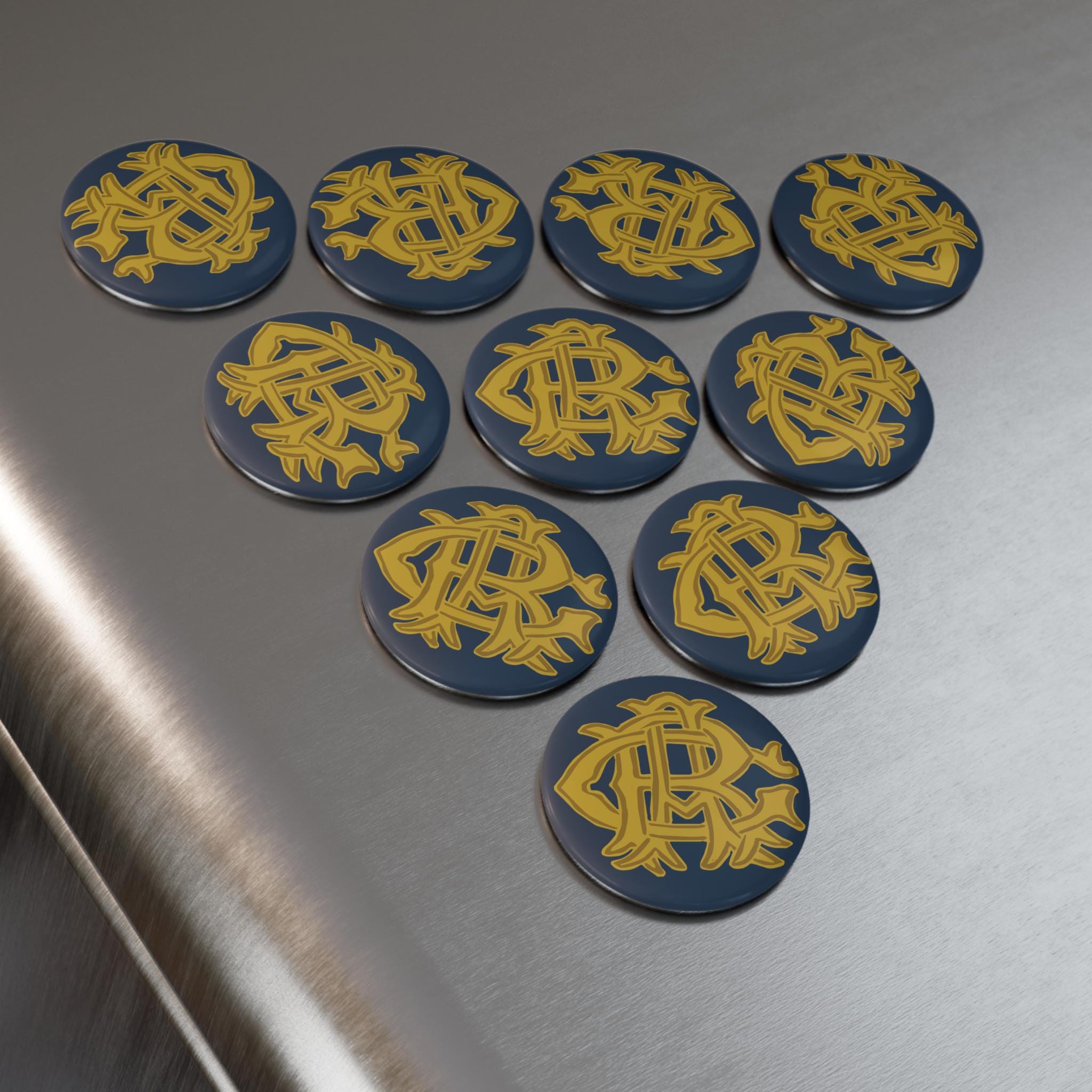 Vintage-inspired round button magnets featuring a large gold "GAR" monogram from the Grand Army of the Republic, with a shade of blue taken from a Union army reenactment uniform. Perfect for history buffs, collectors, and Civil War enthusiasts. Ideal for decorating fridges or magnetic surfaces, and relevant for Memorial Day, Veterans Day, or historical commemorations.