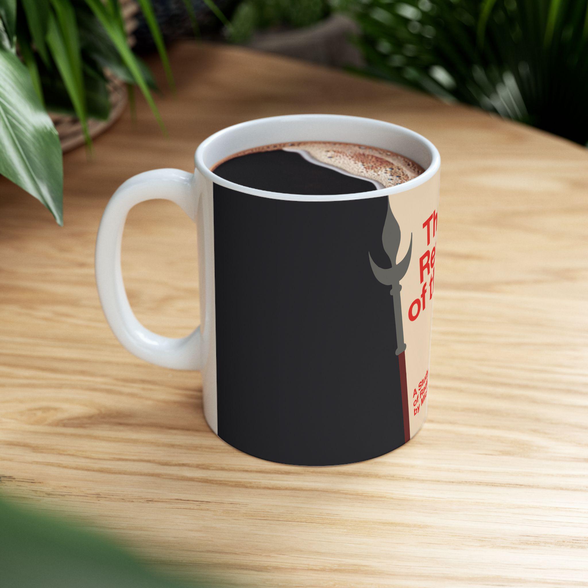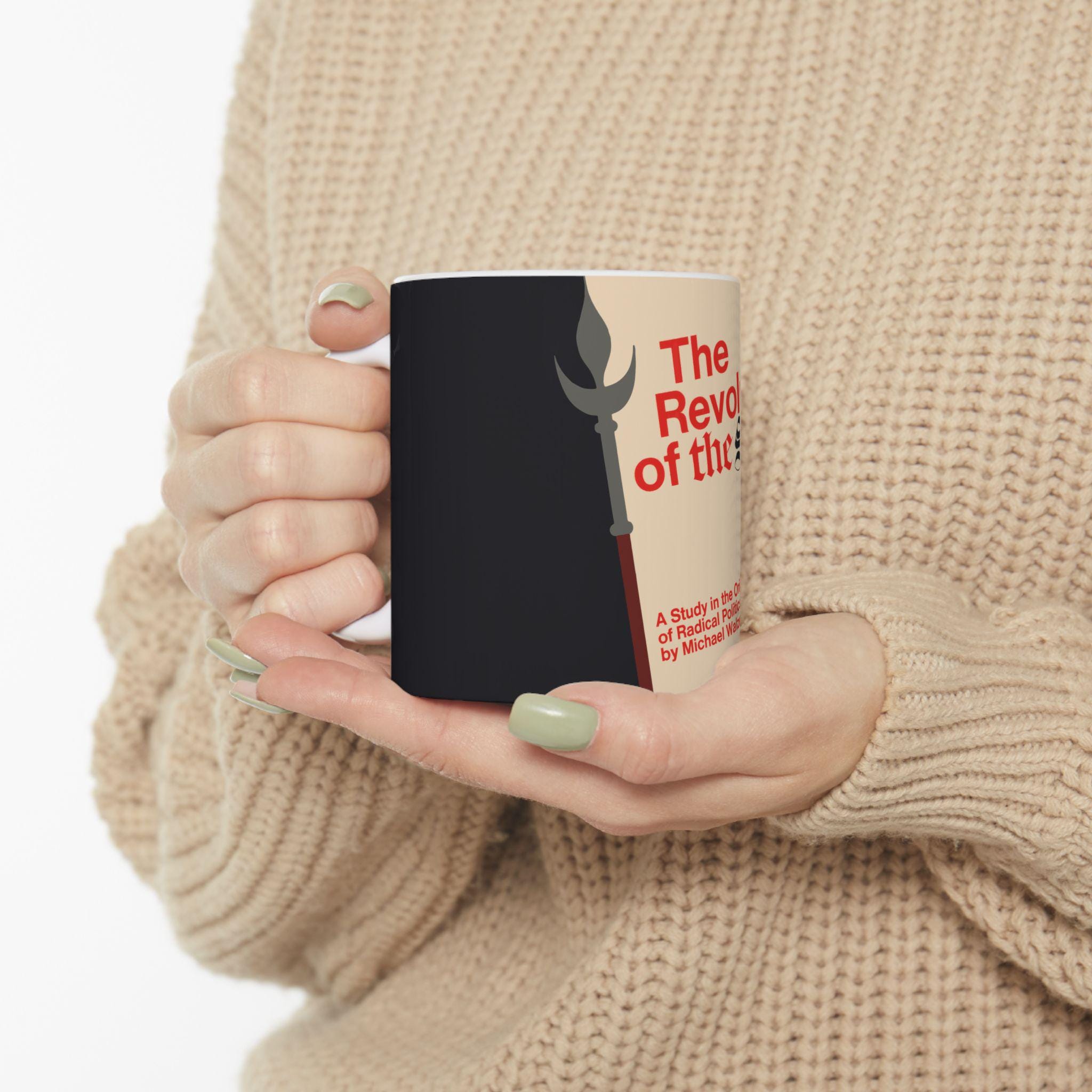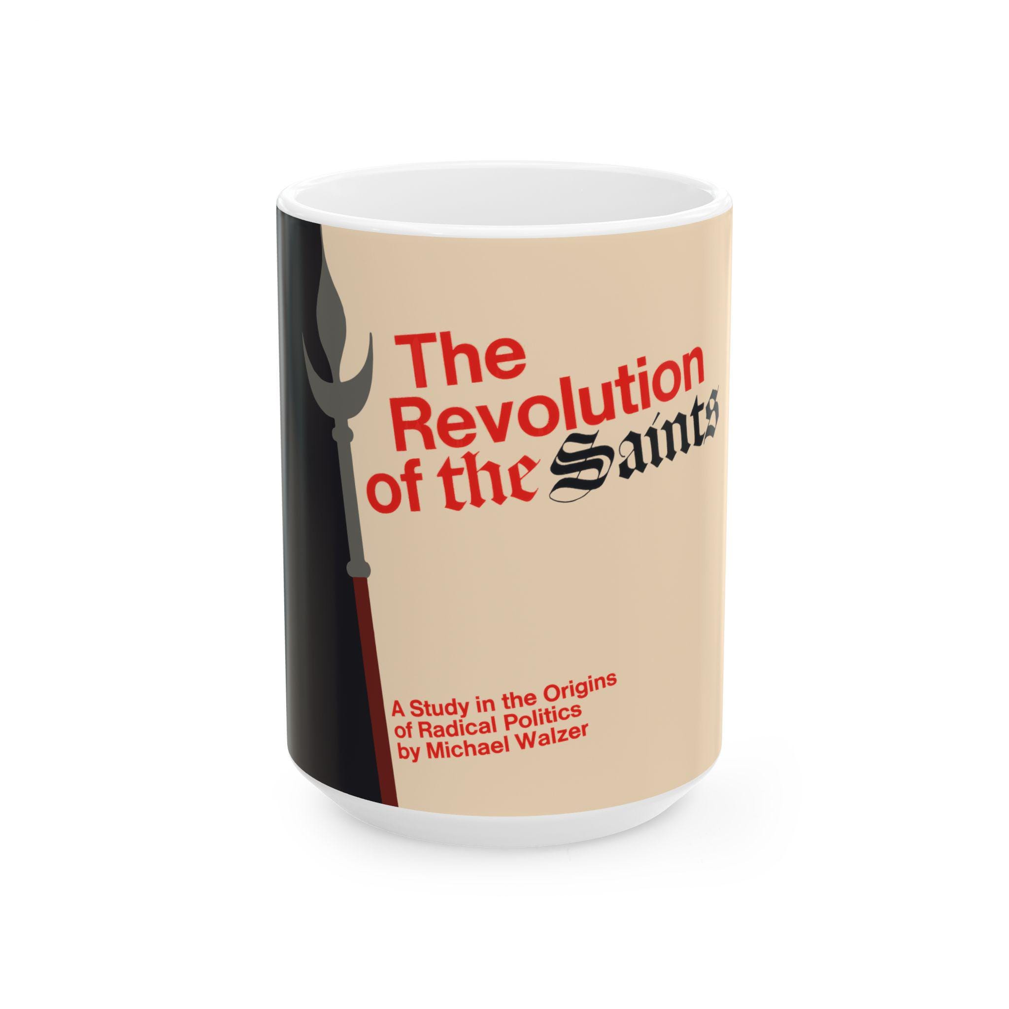 Vintage 1973 Book Cover ceramic mug featuring 'The Revolution of the Saints' by Michael Walzer. Charcoal gray and cream background with a brown and gray halberd design. Red and black lettering in Helvetica and Blackletter font. Perfect for book lovers and history buffs, great for enjoying a cozy reading session with a hot beverage. Ideal gift for literary enthusiasts, historians, and those who appreciate vintage designs. Suitable for birthdays, book club meetings, and academic achievements.
