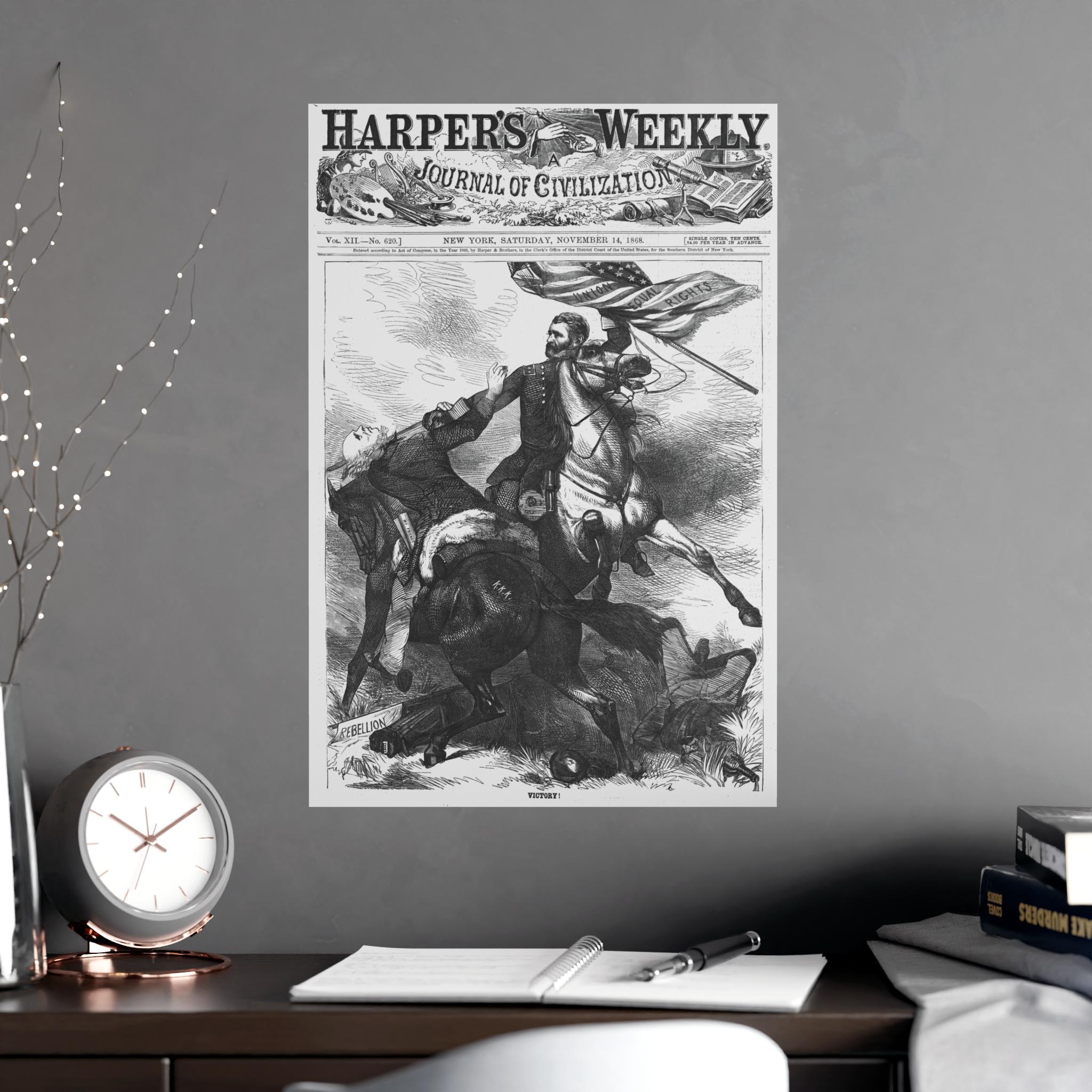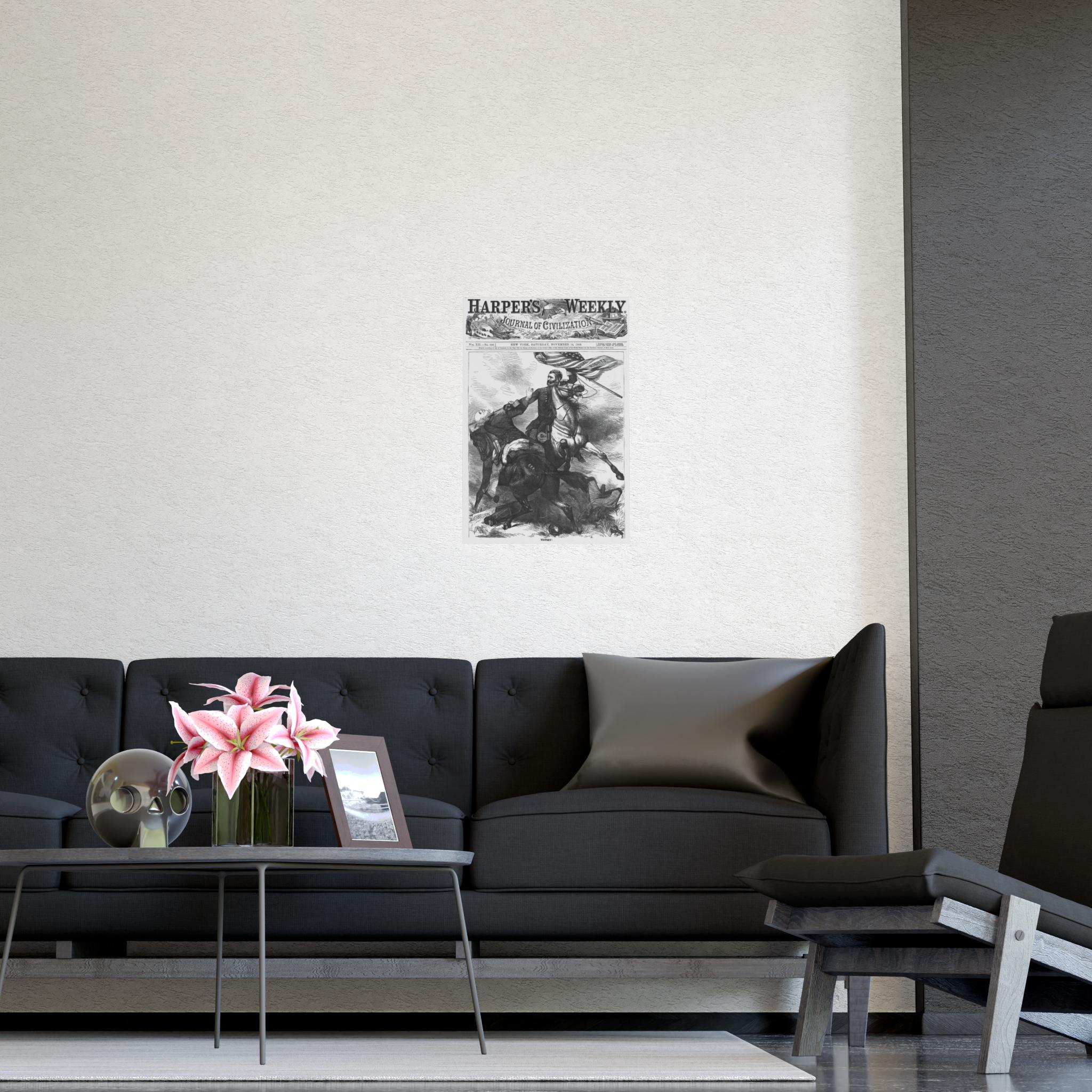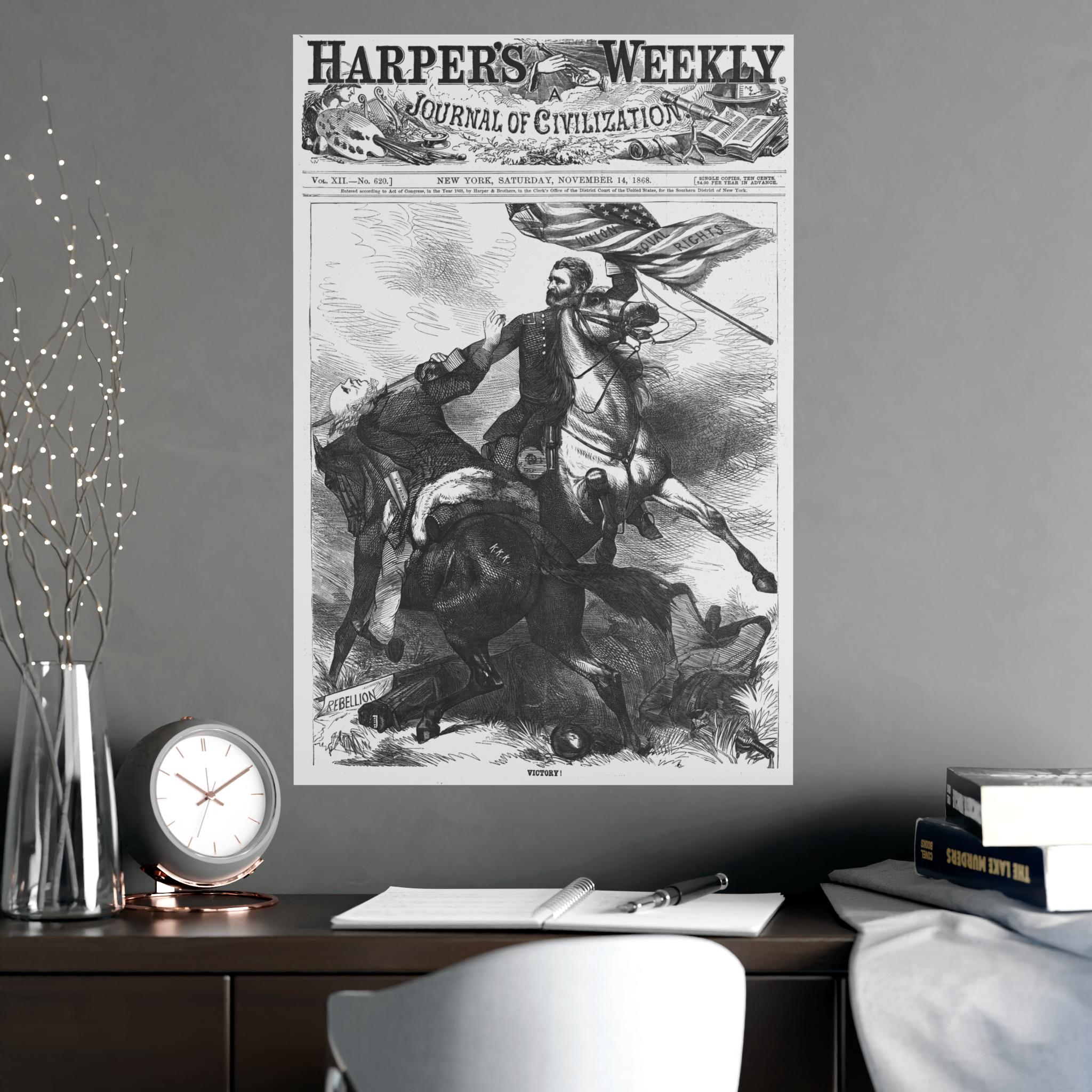 This Poster features a historical caricature from the November 14, 1868 edition of Harper's Weekly, showing Ulysses S Grant on horseback carrying a U S flag and beheading Horatio Seymour. It gives a vintage and political vibe, perfect for history enthusiasts, Americana collectors, or anyone interested in unique home decor. Ideal for patriotic holidays, historical events, or academic spaces.