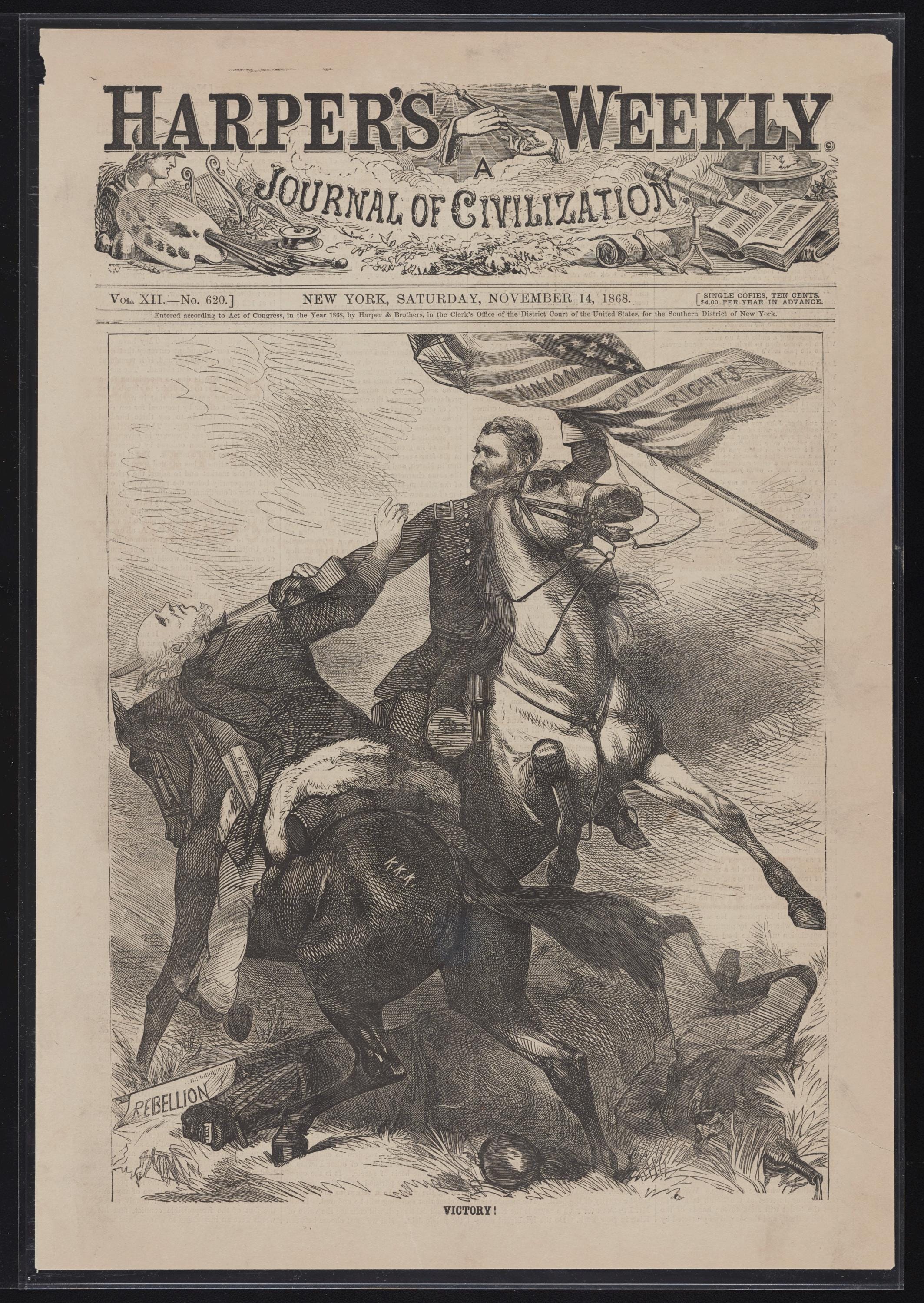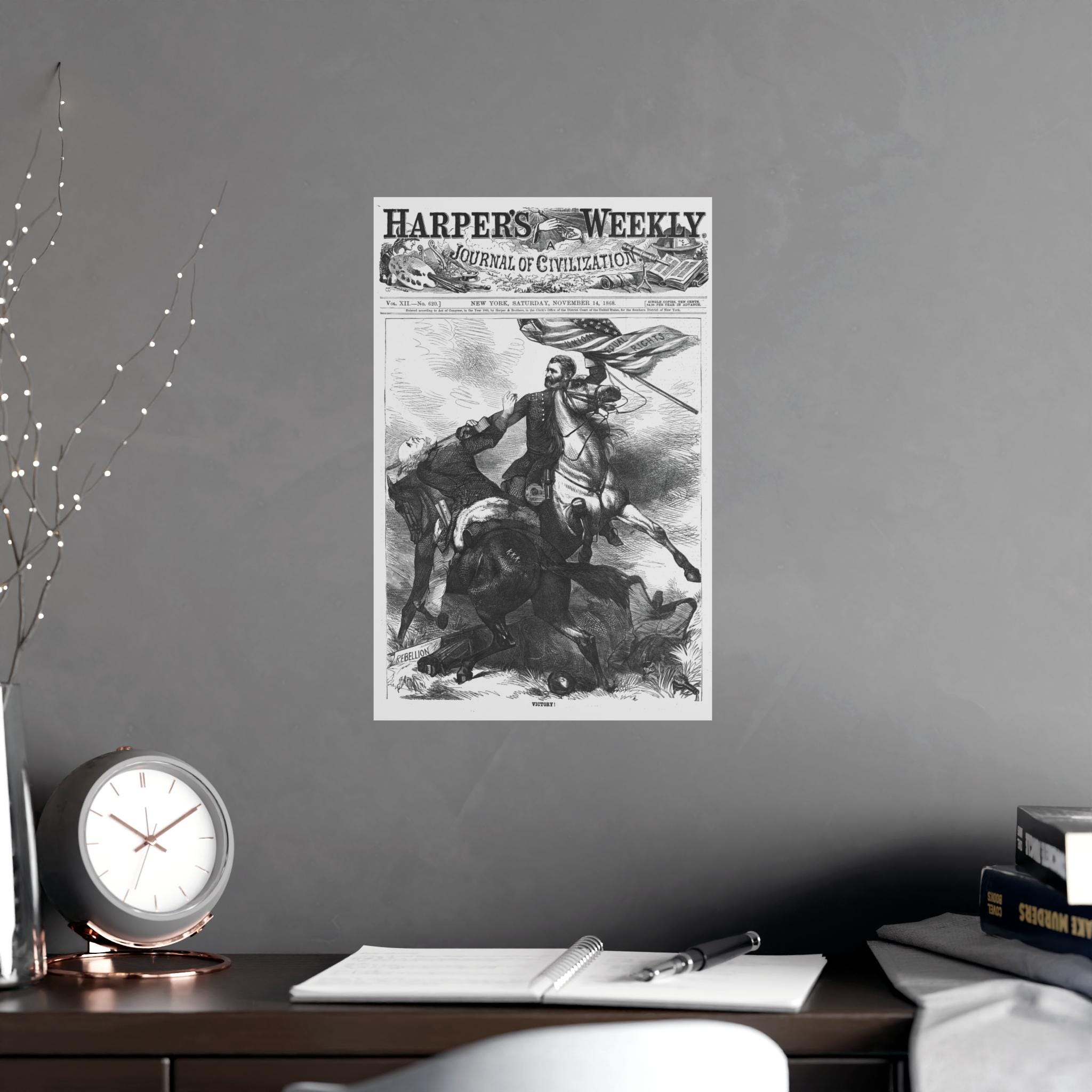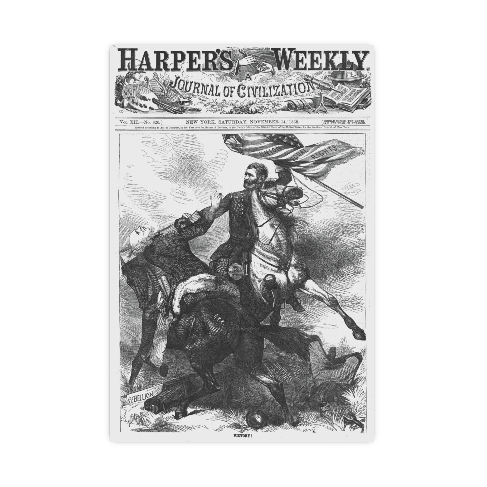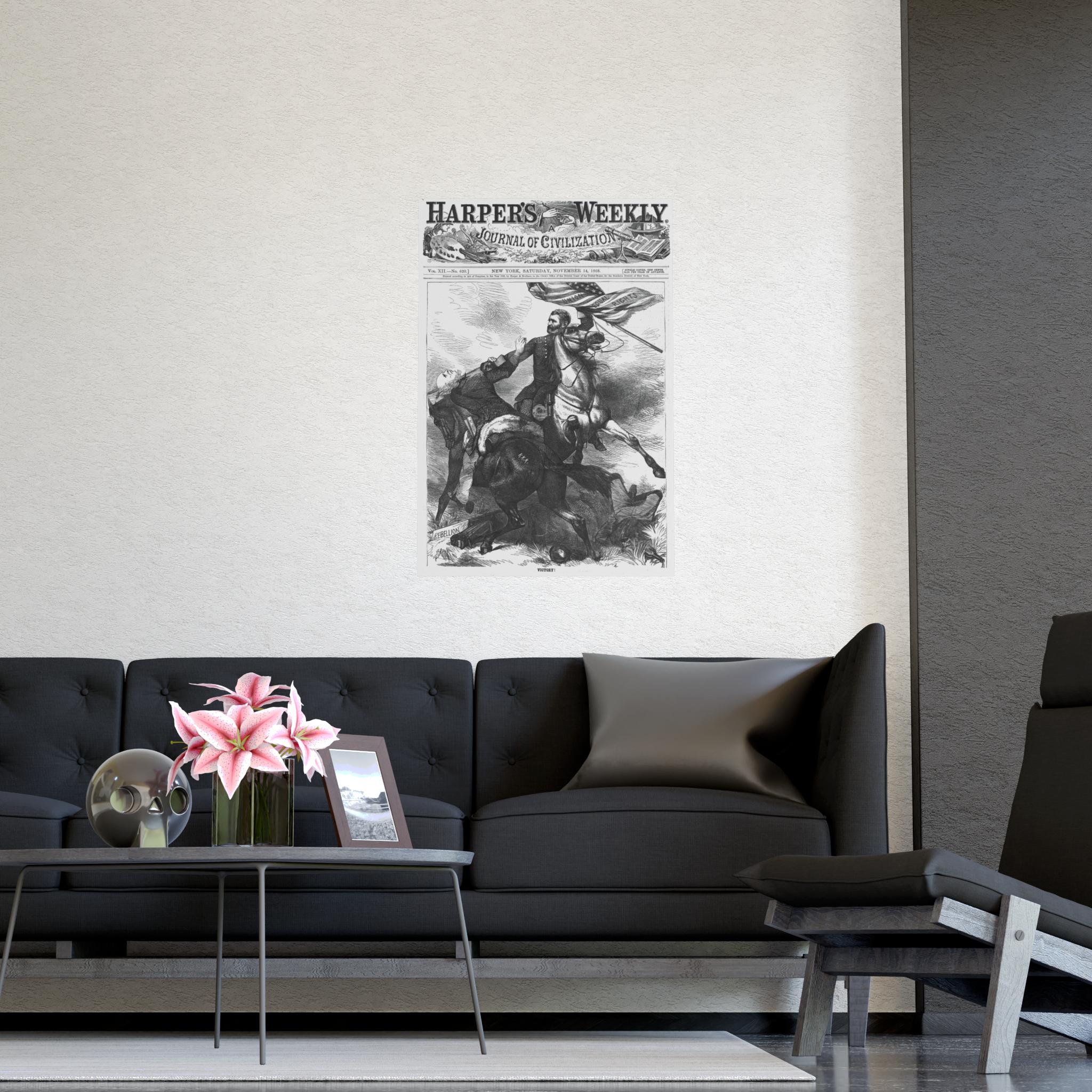 This Poster features a historical caricature from the November 14, 1868 edition of Harper's Weekly, showing Ulysses S Grant on horseback carrying a U S flag and beheading Horatio Seymour. It gives a vintage and political vibe, perfect for history enthusiasts, Americana collectors, or anyone interested in unique home decor. Ideal for patriotic holidays, historical events, or academic spaces.