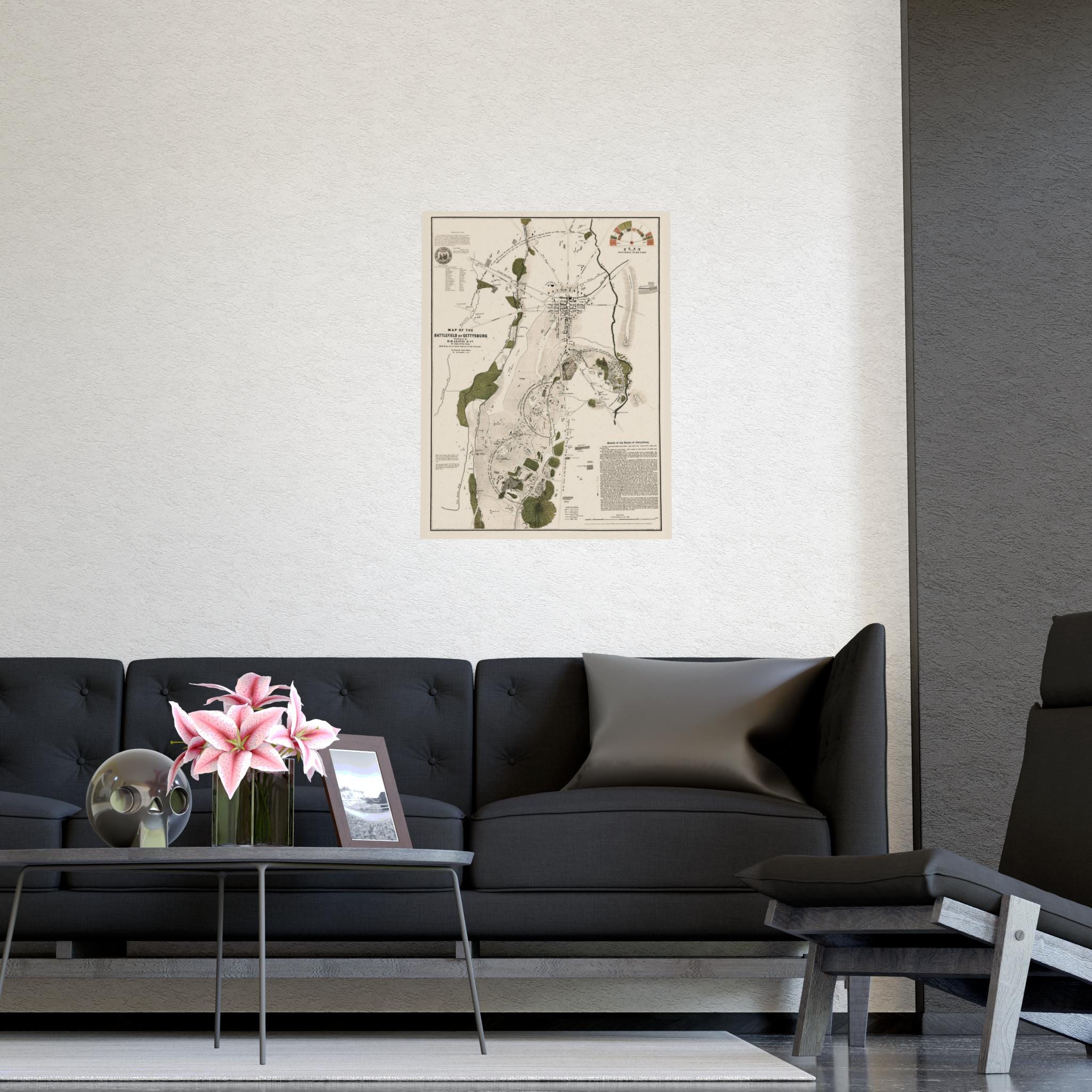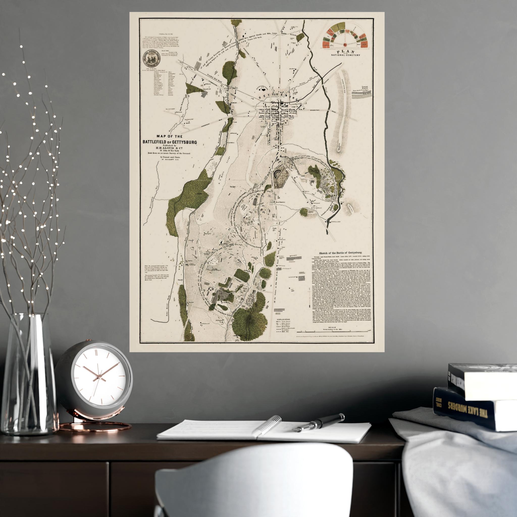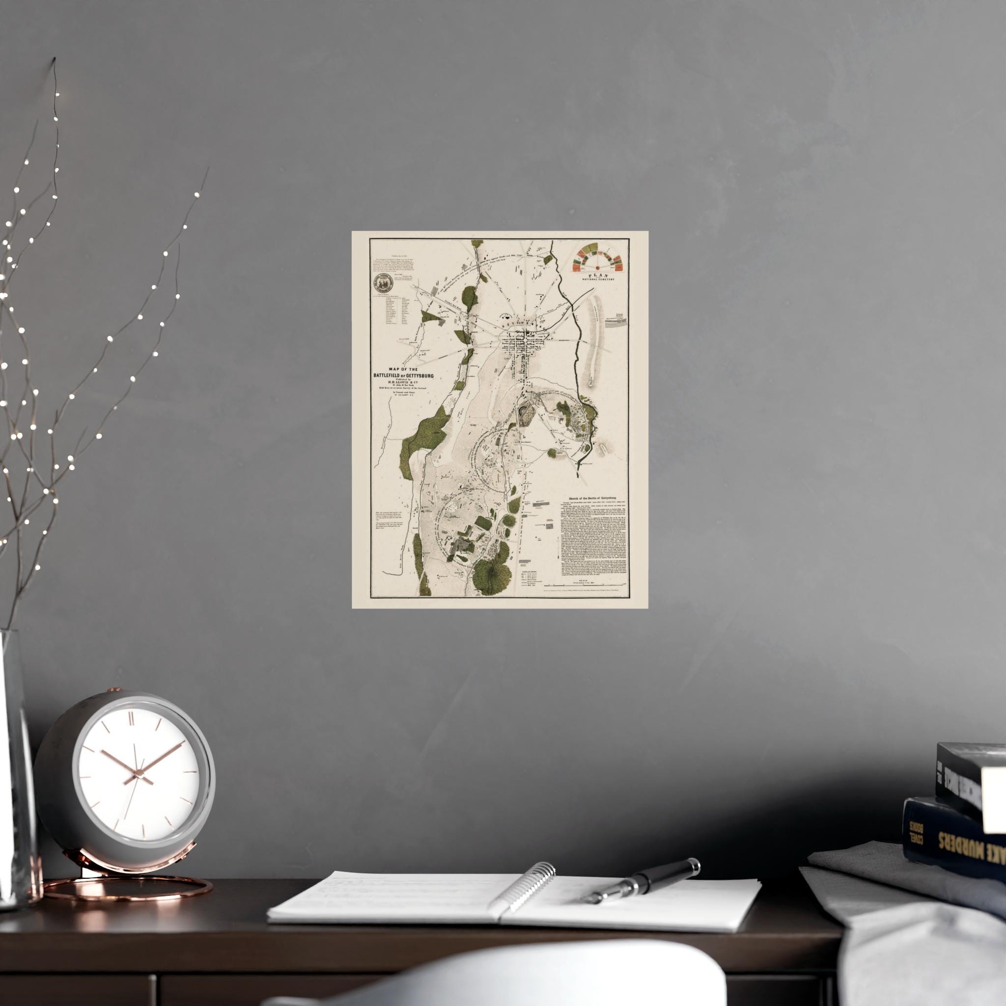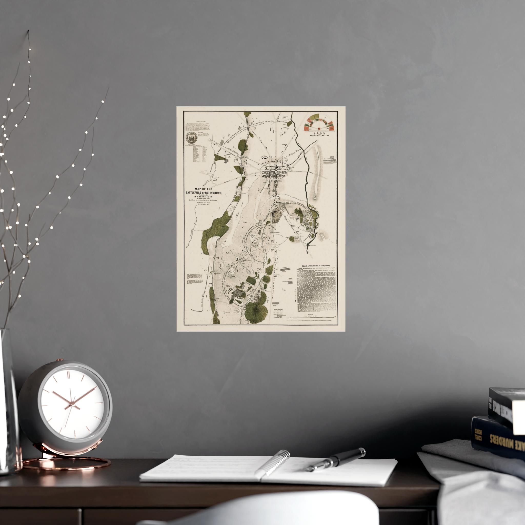 Vintage, annotated map of the Gettysburg battlefield from 1864 on matte paper finish. Perfect for history buffs and Civil War enthusiasts. Ideal for decorating home offices, living rooms, or history classrooms. Relevant for Memorial Day, Veterans Day, and historical reenactments.