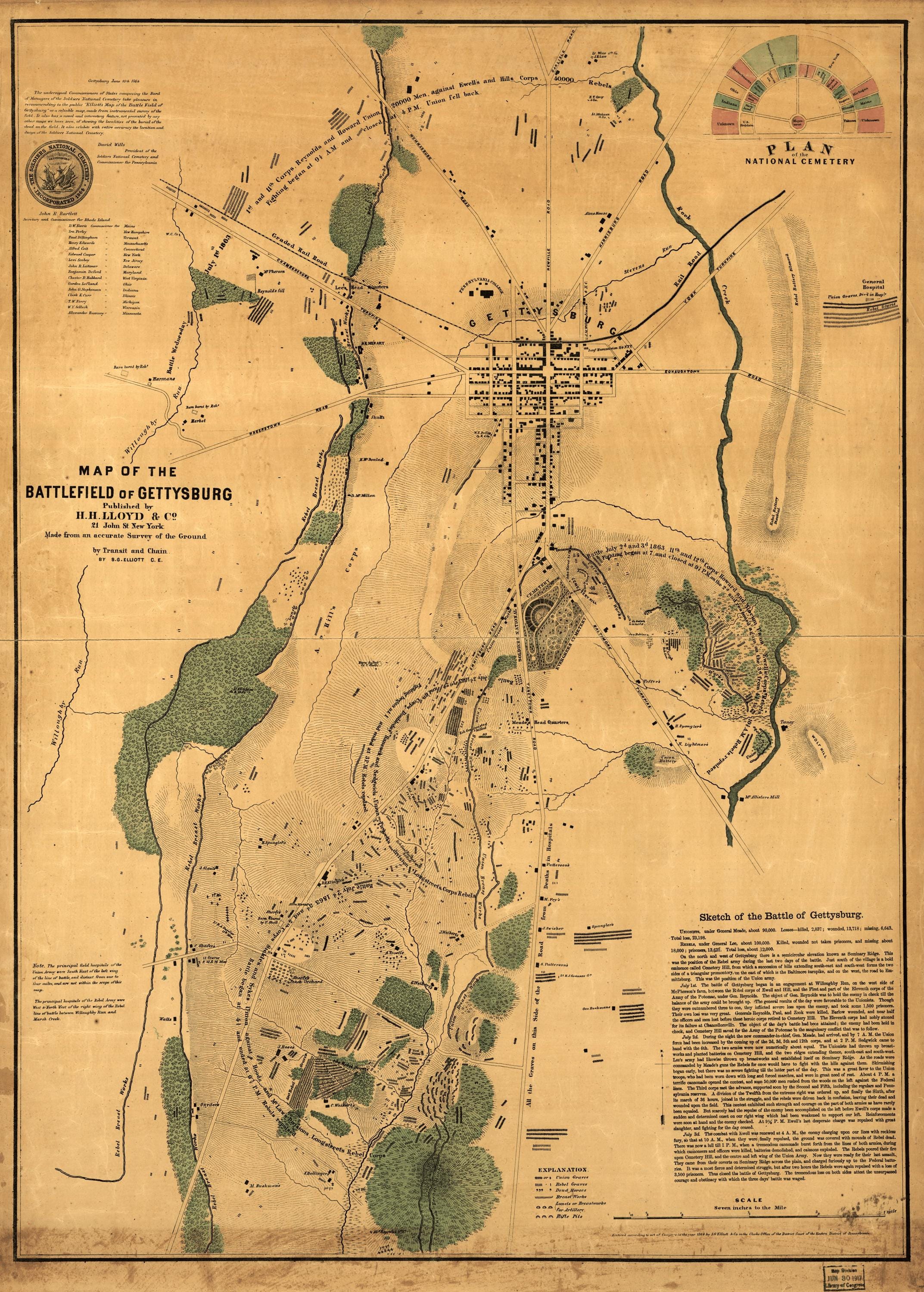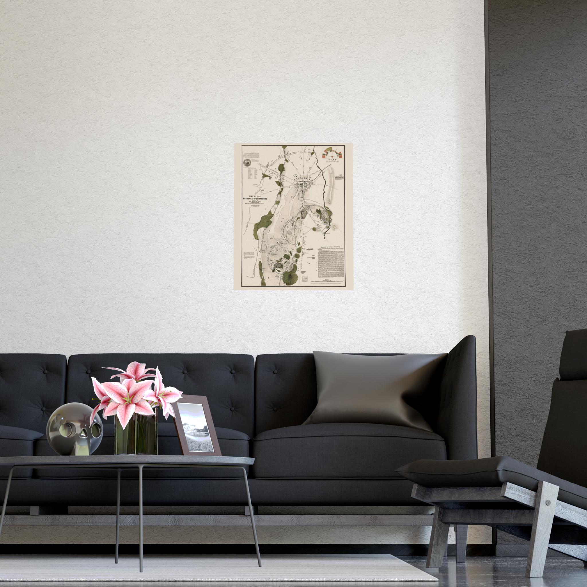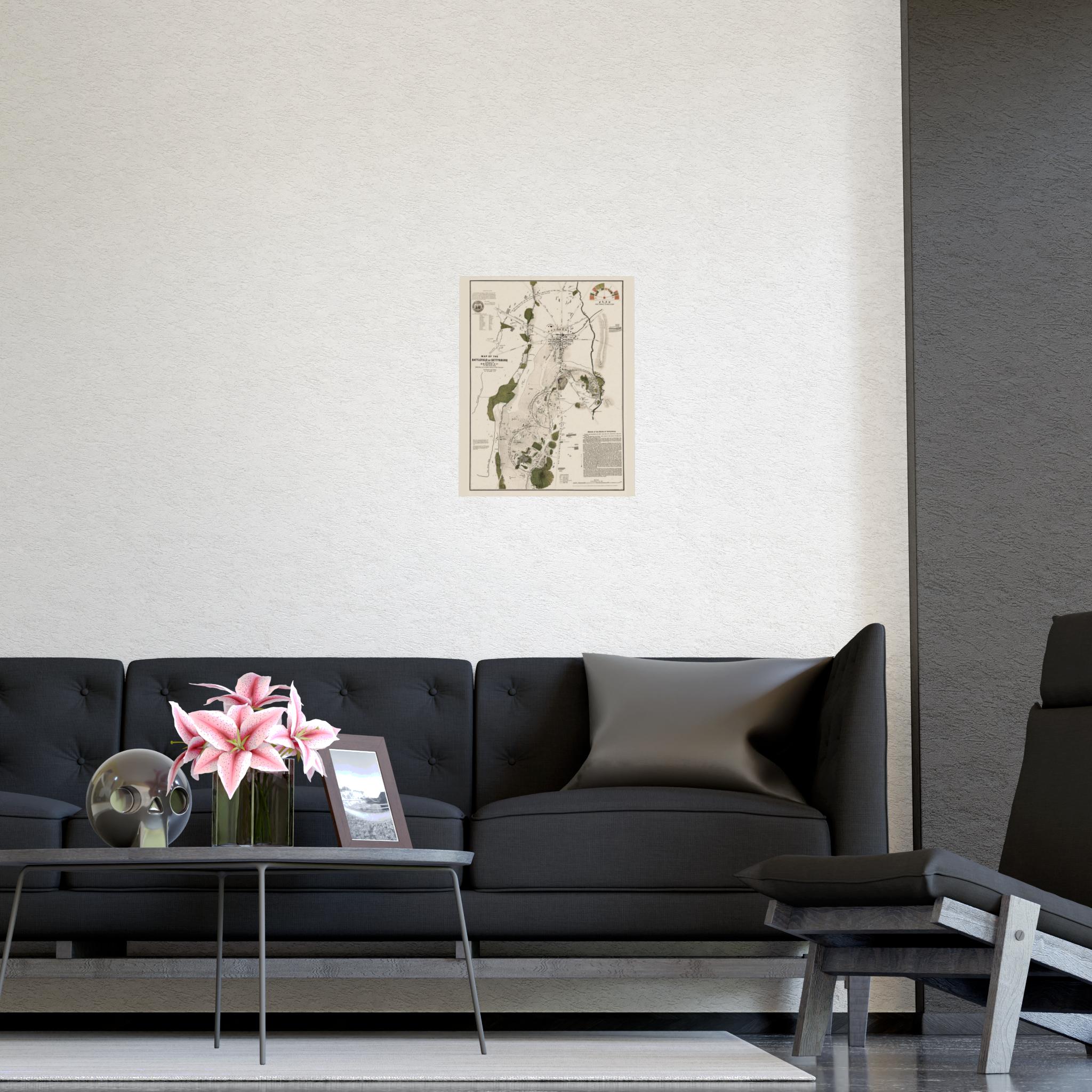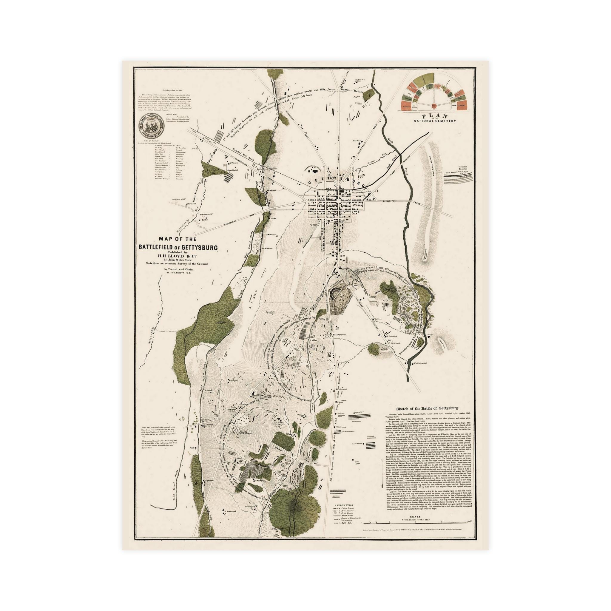 Vintage, annotated map of the Gettysburg battlefield from 1864 on matte paper finish. Perfect for history buffs and Civil War enthusiasts. Ideal for decorating home offices, living rooms, or history classrooms. Relevant for Memorial Day, Veterans Day, and historical reenactments.
