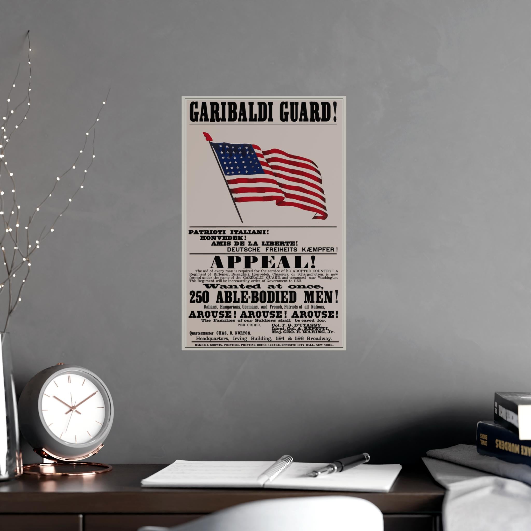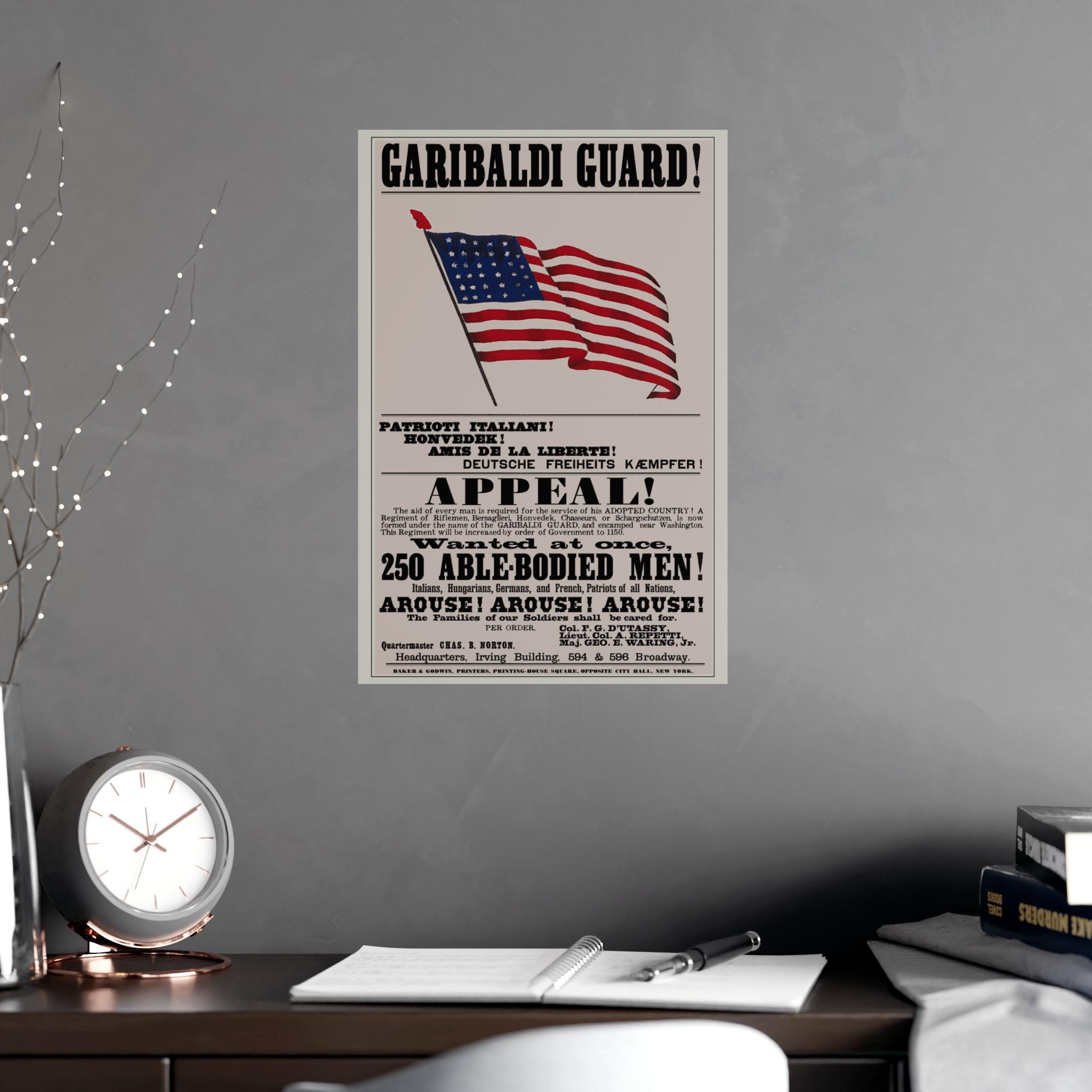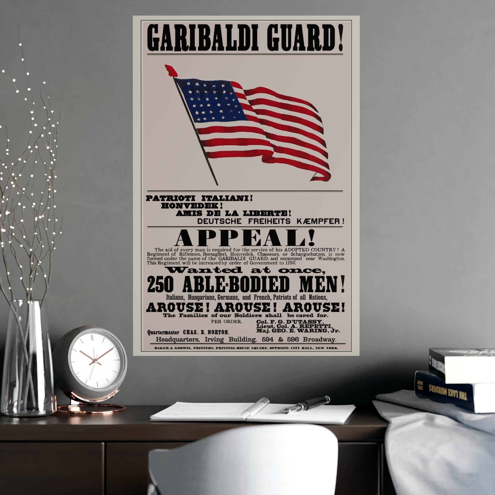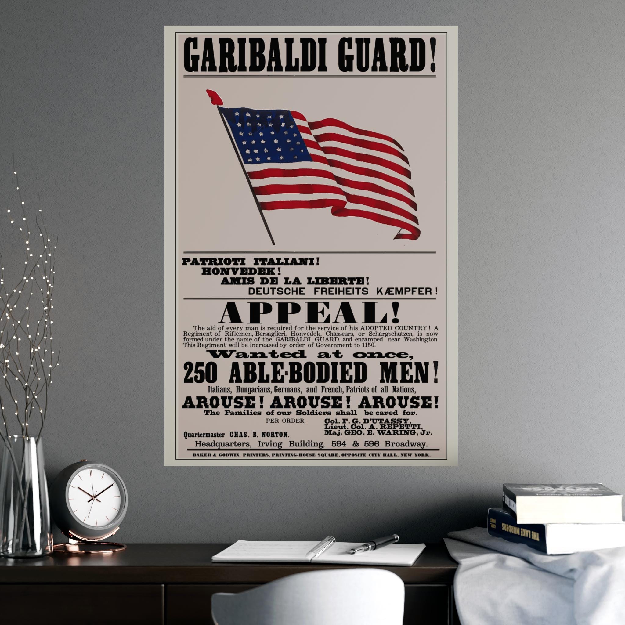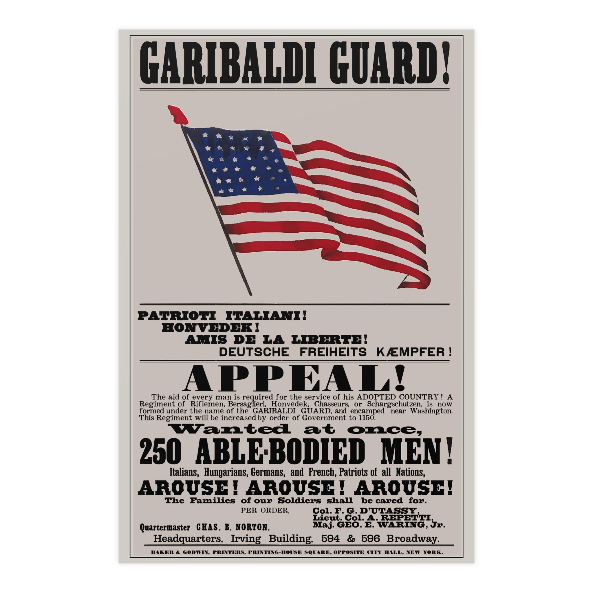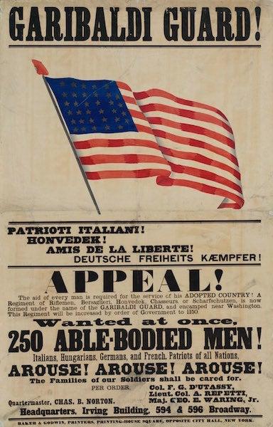 Historical Civil War recruitment poster for the 39th New York Infantry Regiment, appealing to recent immigrants with messages in multiple languages. Features patriotic elements and celebrates a nation of immigrants. Perfect for history buffs, Civil War enthusiasts, and those interested in immigrant culture. Ideal for Independence Day, Veterans Day, Fourth of July, and historical reenactments.