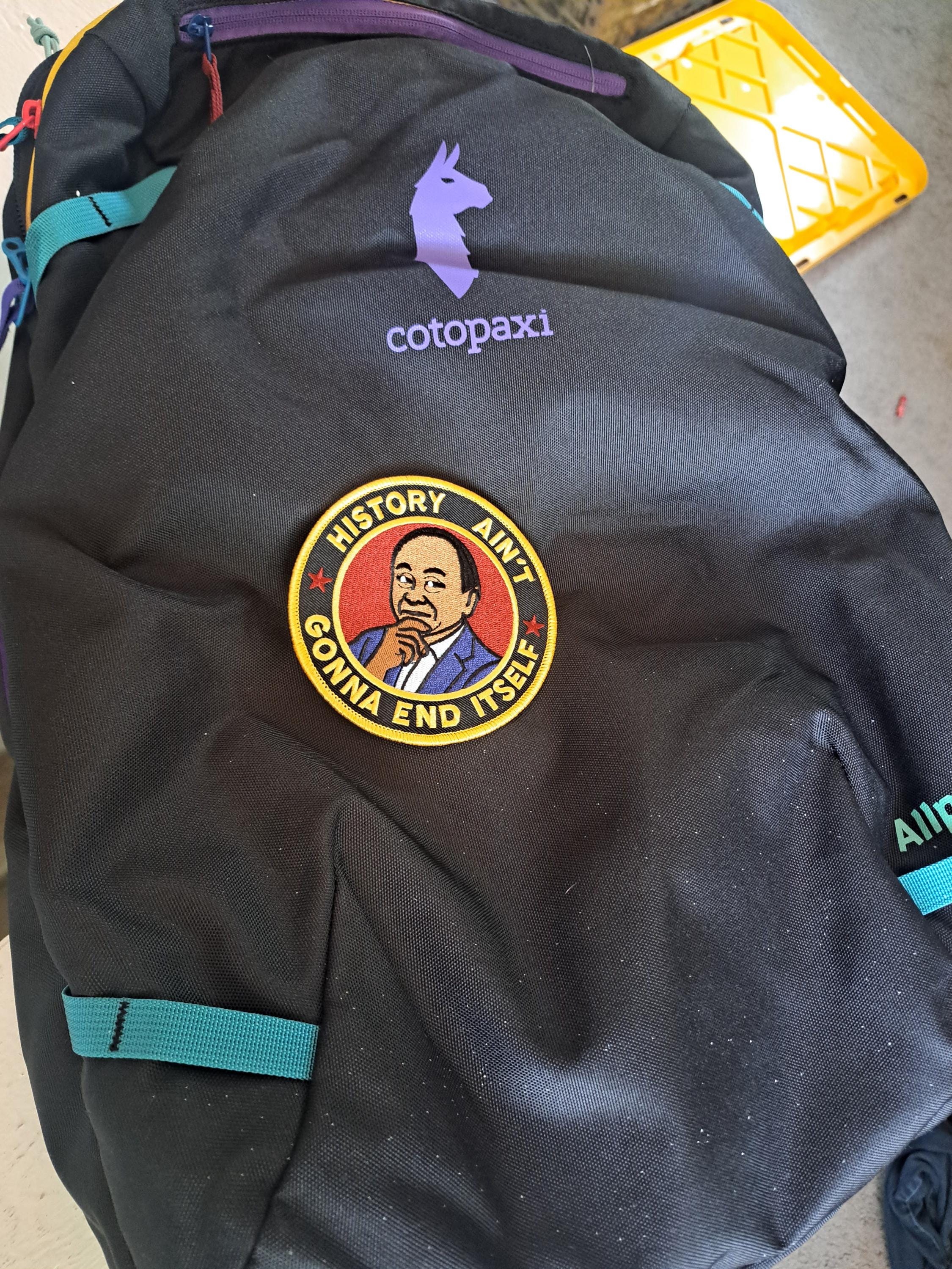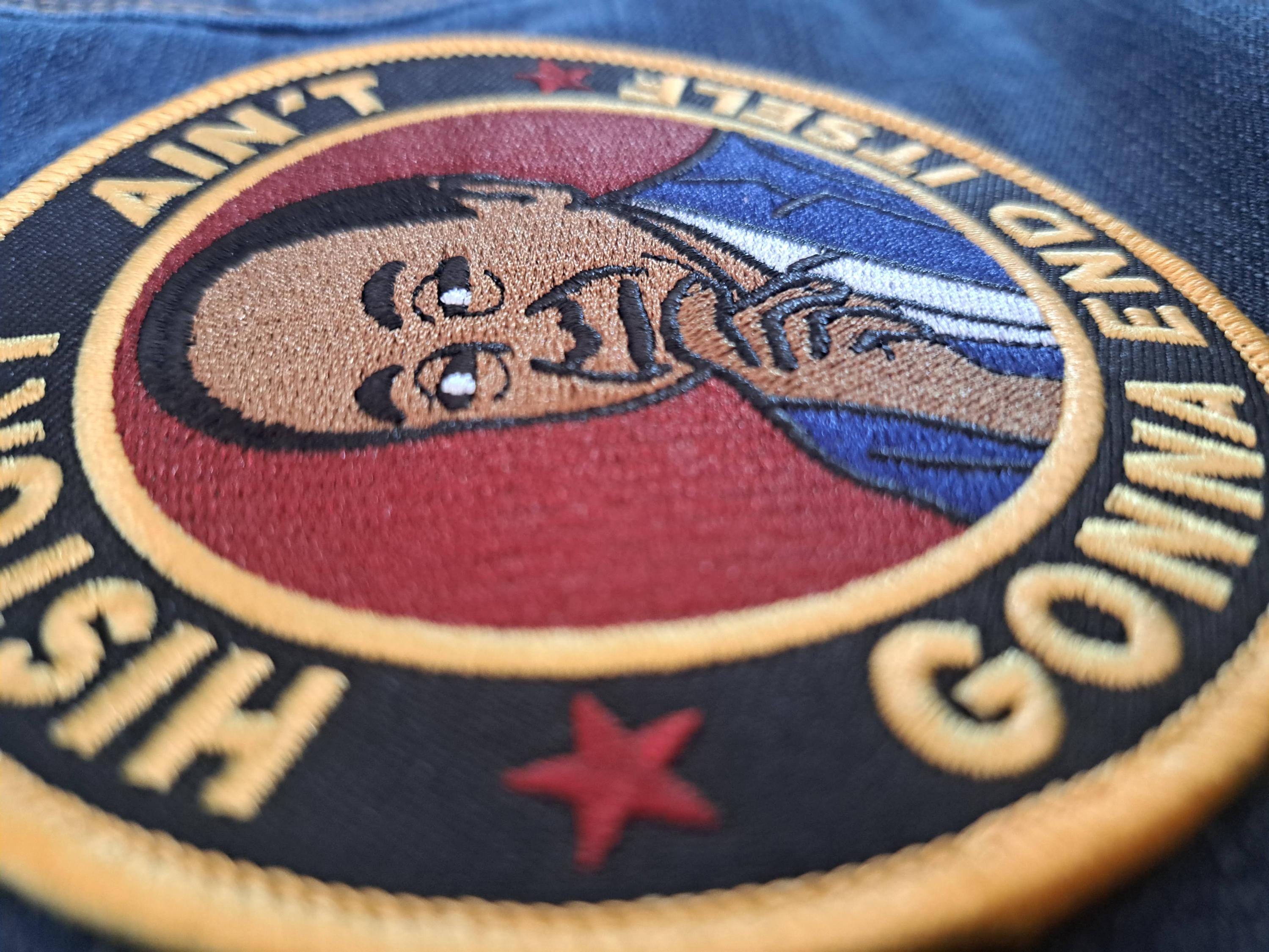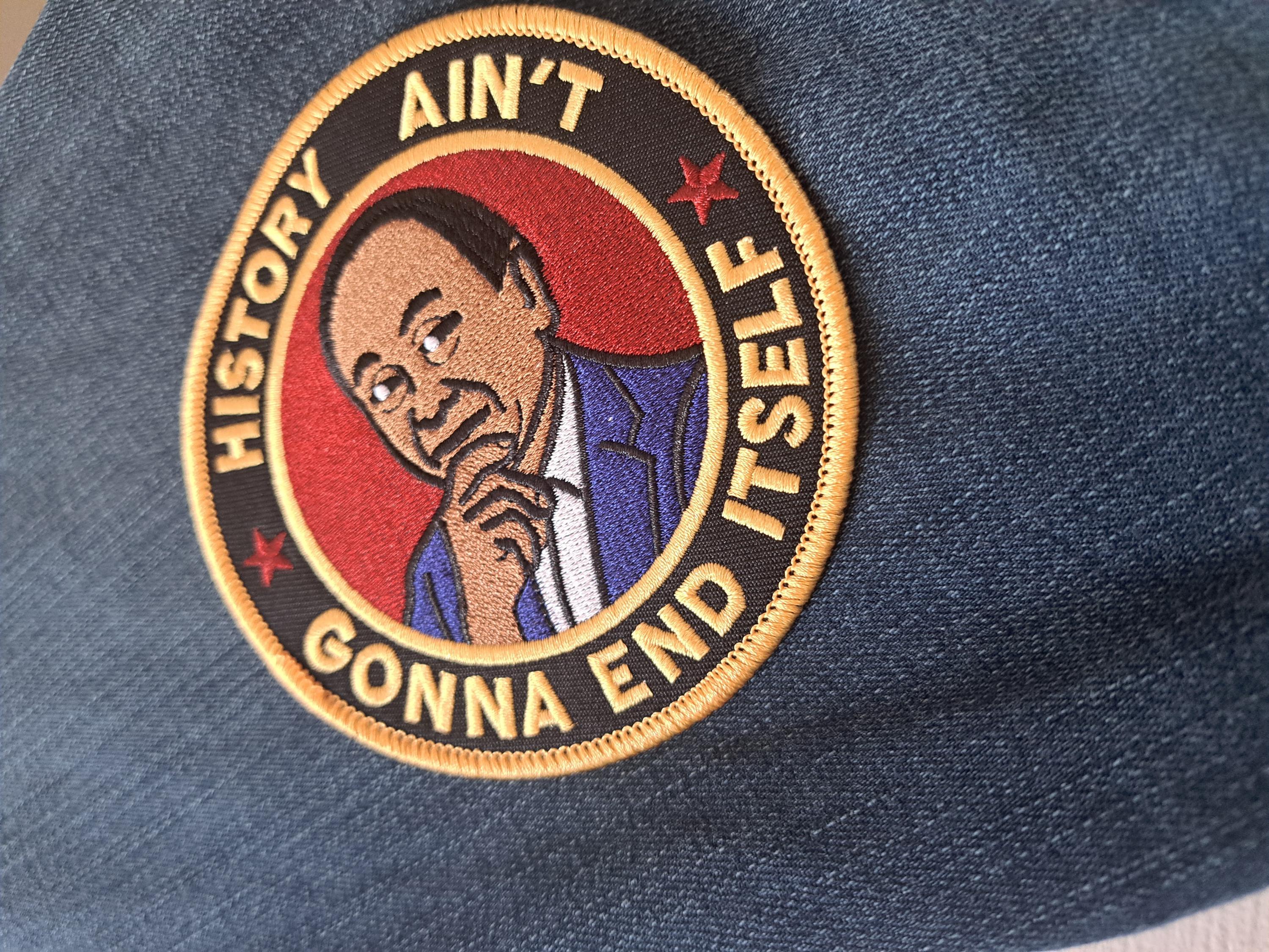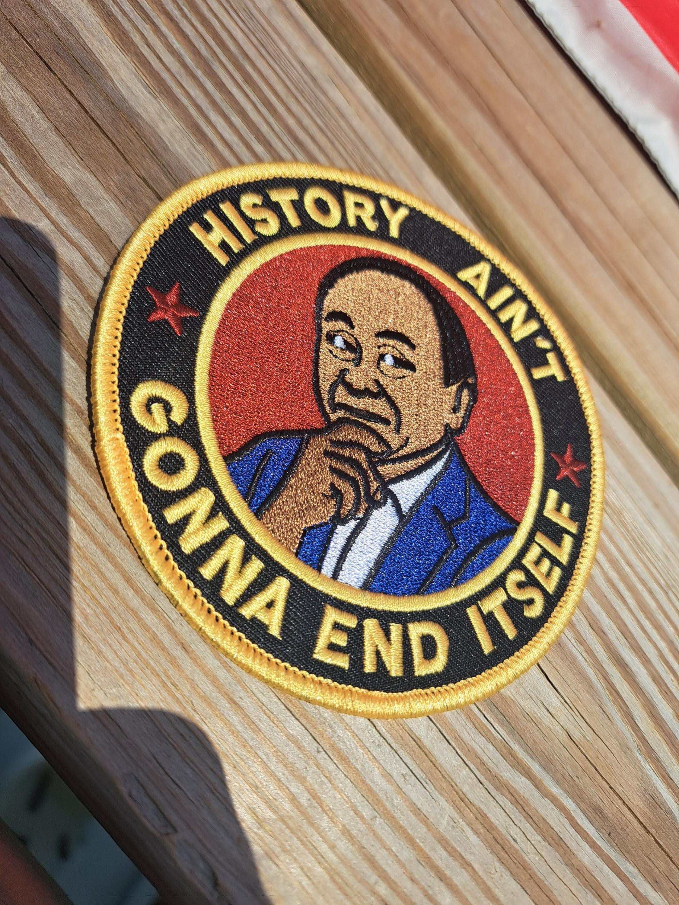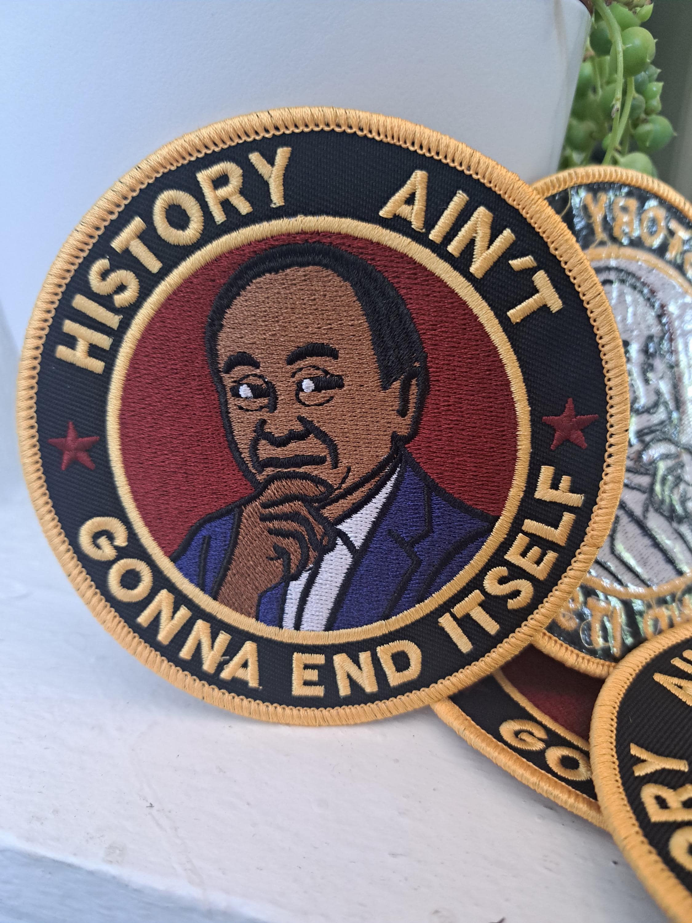 This 4-inch circular embroidered morale patch features a familiar, contemplative figure at its center, set against a bold red. The surrounding black ring carries the rallying cry in yellow: "HISTORY AIN'T GONNA END ITSELF," flanked by classic red stars.