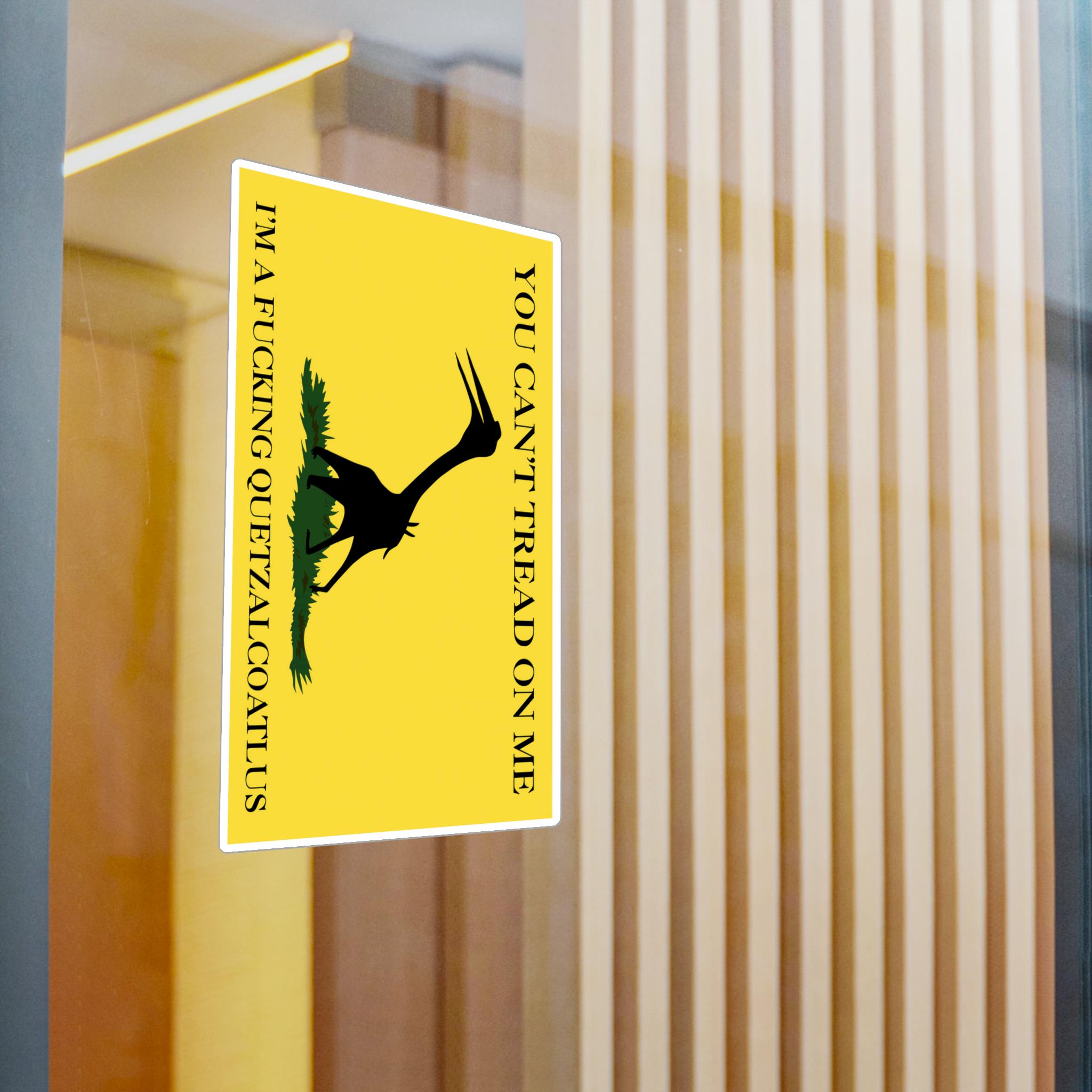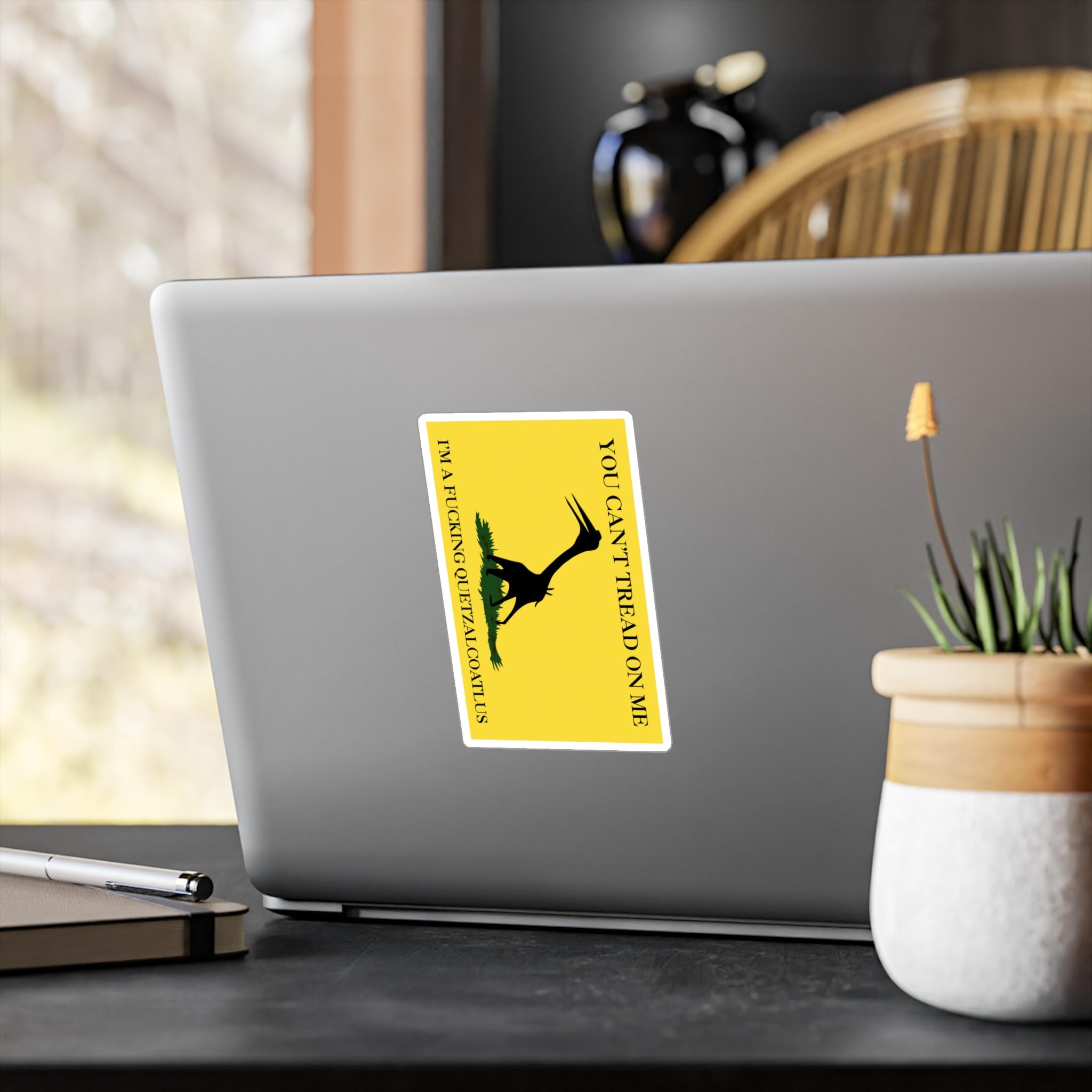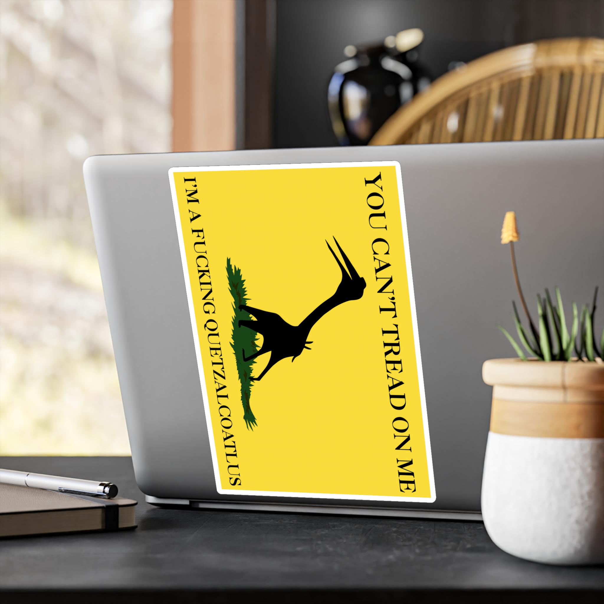 A prehistoric twist on the Gadsden flag with a silhouette of a Quetzalcoatlus northropi specimen instead of a snake. The text reads, 'You can't tread on me, I'm a fucking Quetzalcoatlus'. These kiss-cut vinyl decals are perfect for those who love unique and bold designs. Ideal for dinosaur enthusiasts, history buffs, and those who enjoy standing out. Great for decorating laptops, water bottles, and car windows. Perfect for gifting during birthdays, holidays, and special occasions.