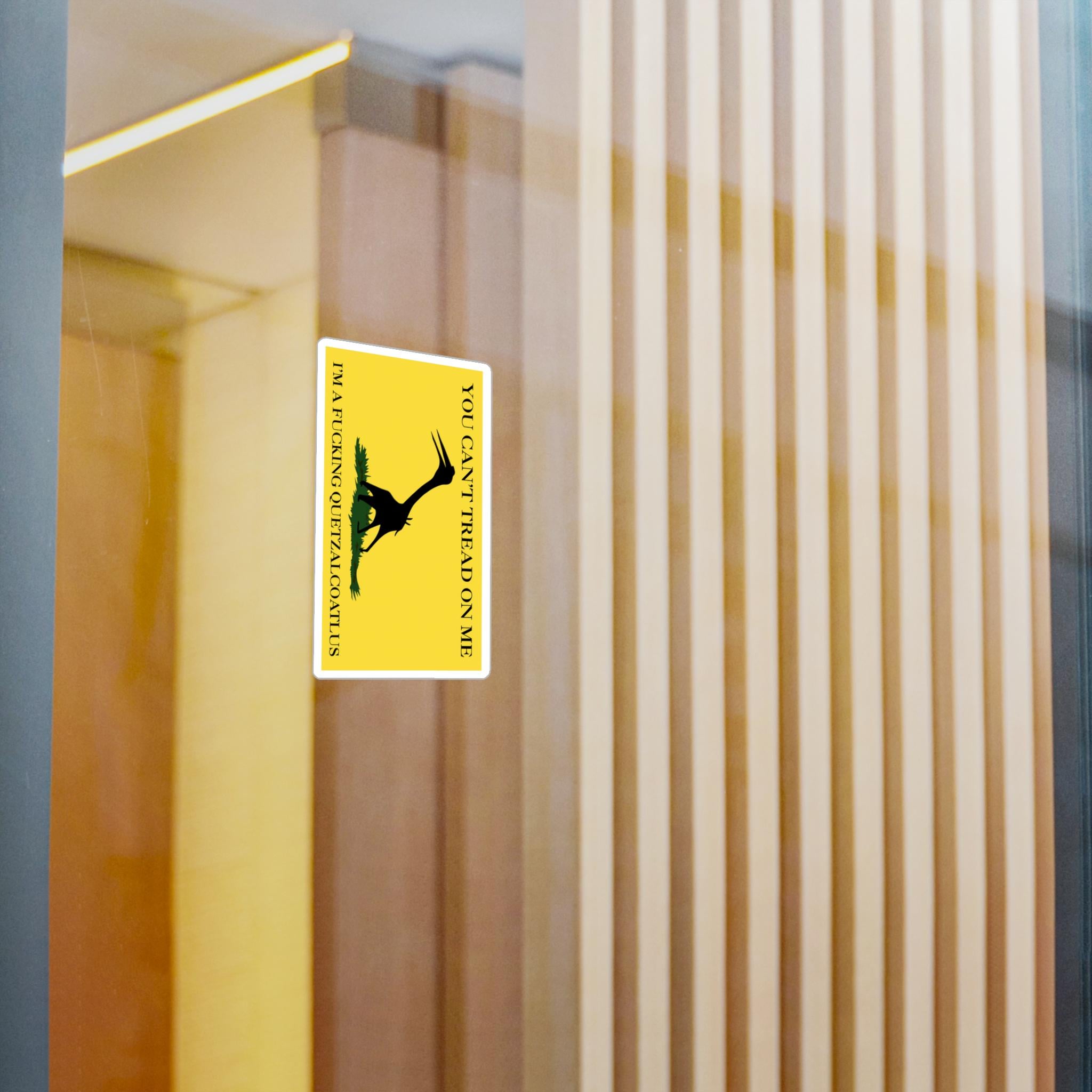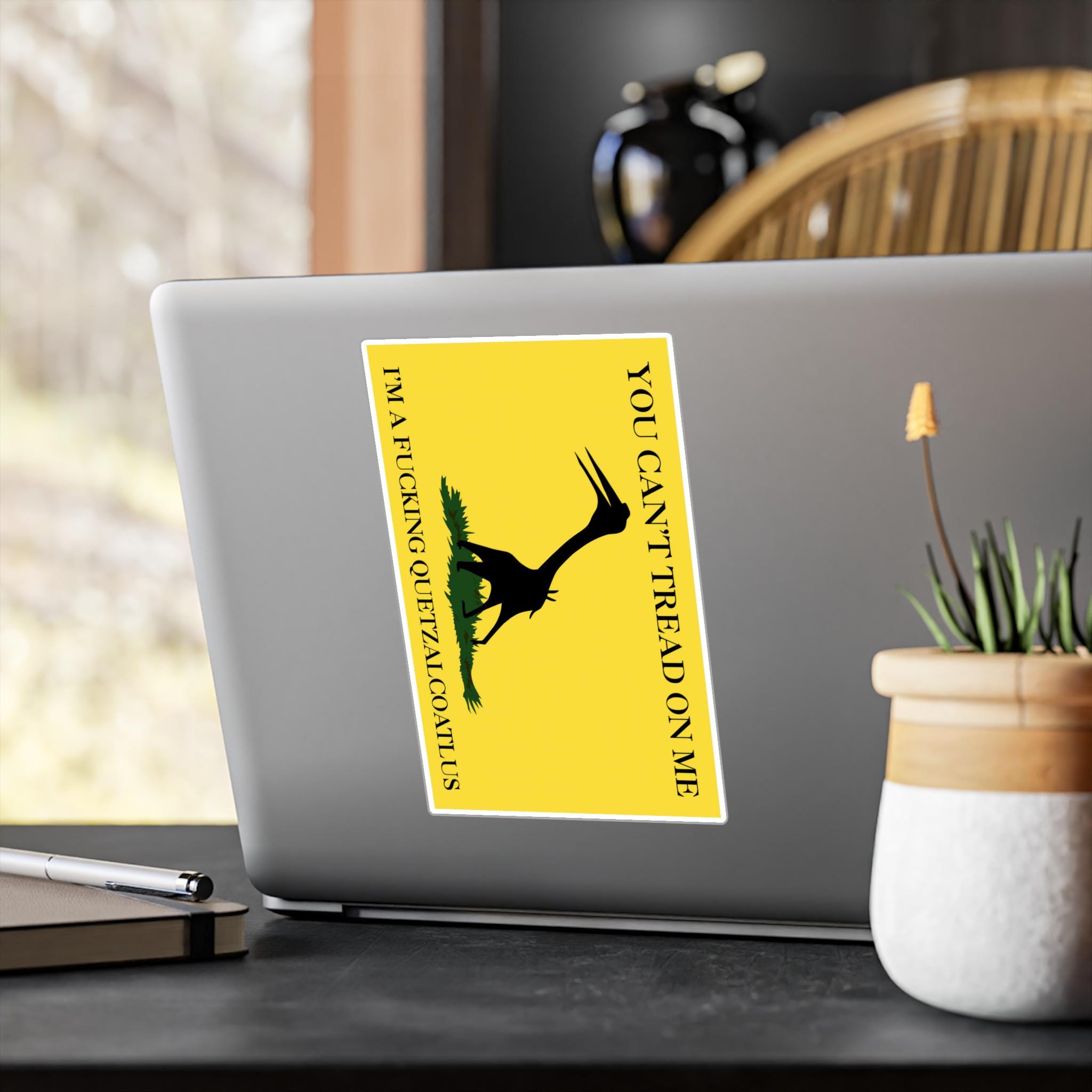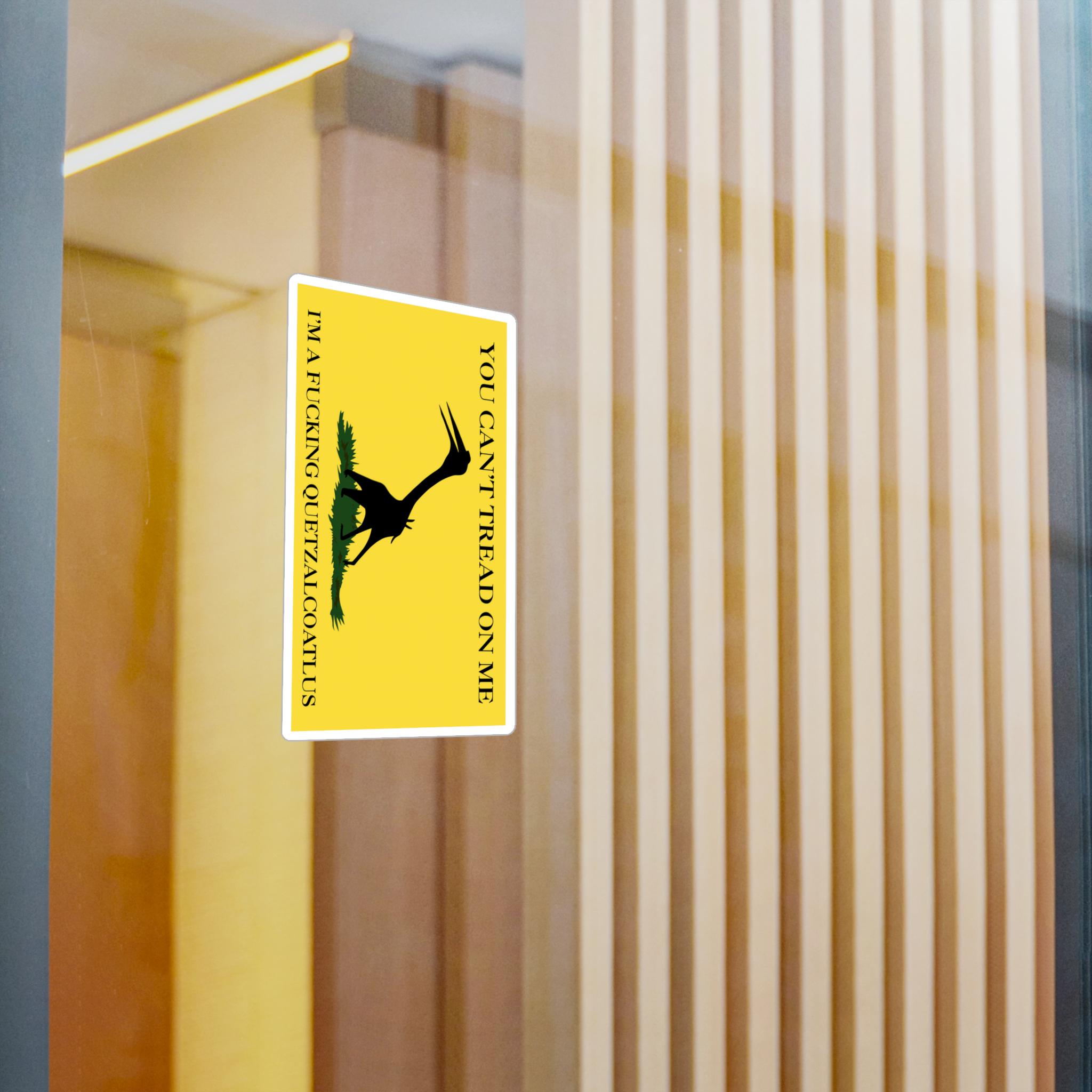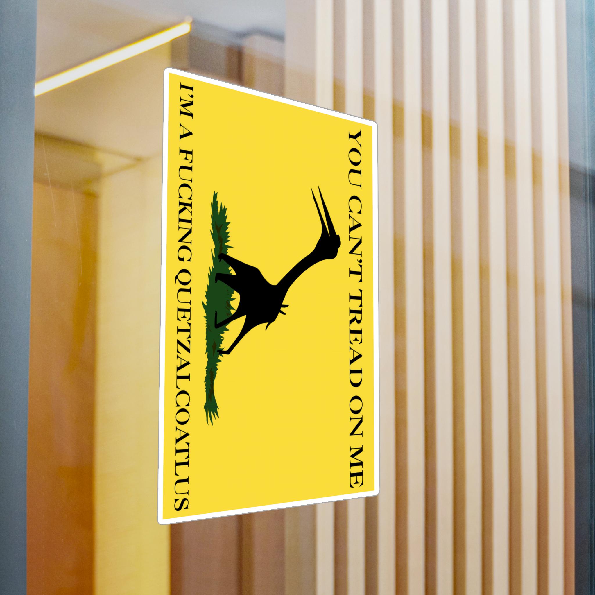 A prehistoric twist on the Gadsden flag with a silhouette of a Quetzalcoatlus northropi specimen instead of a snake. The text reads, 'You can't tread on me, I'm a fucking Quetzalcoatlus'. These kiss-cut vinyl decals are perfect for those who love unique and bold designs. Ideal for dinosaur enthusiasts, history buffs, and those who enjoy standing out. Great for decorating laptops, water bottles, and car windows. Perfect for gifting during birthdays, holidays, and special occasions.
