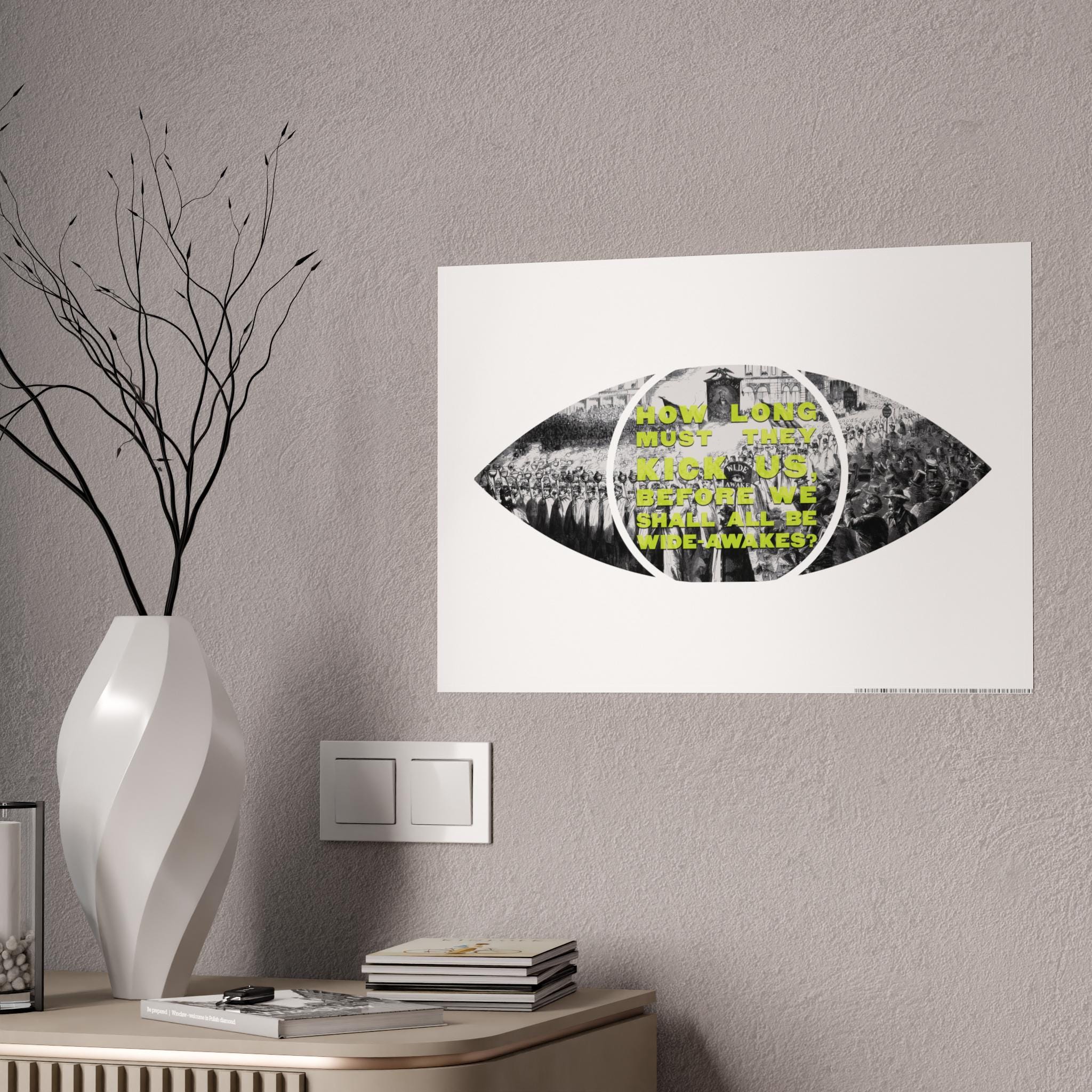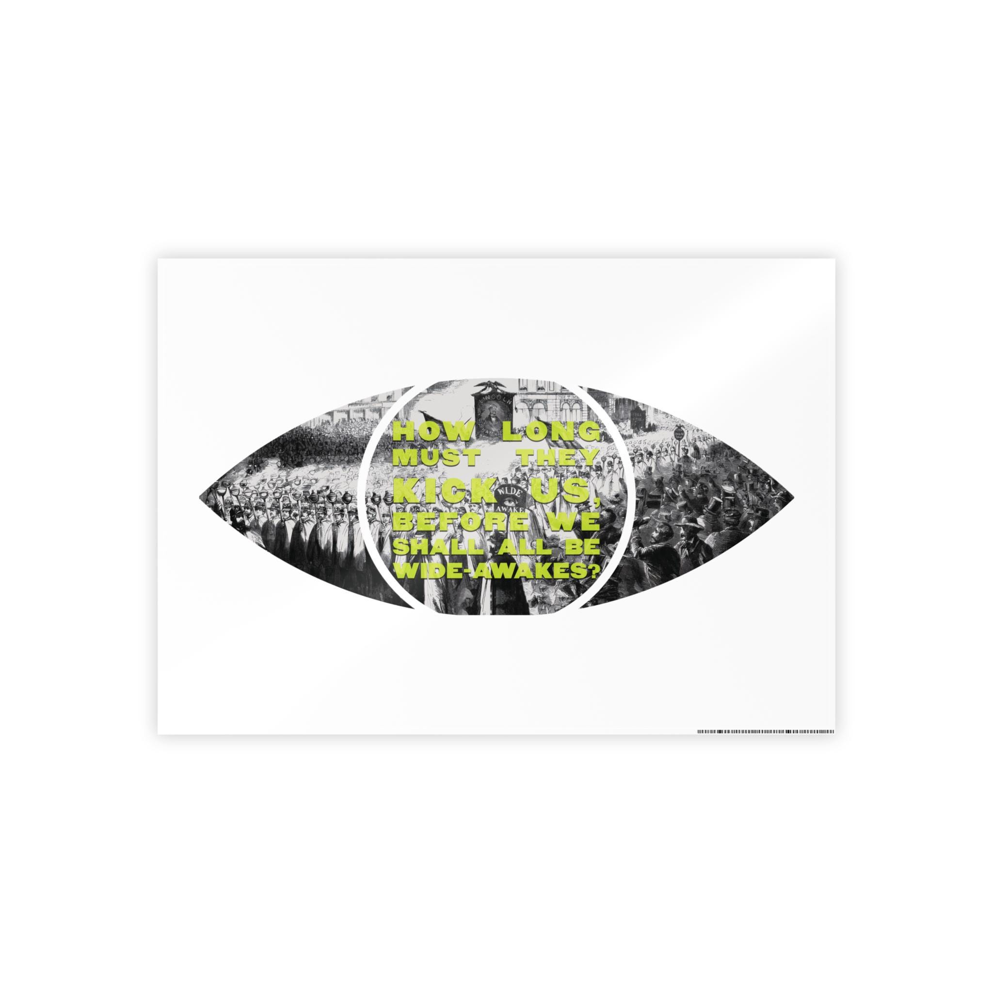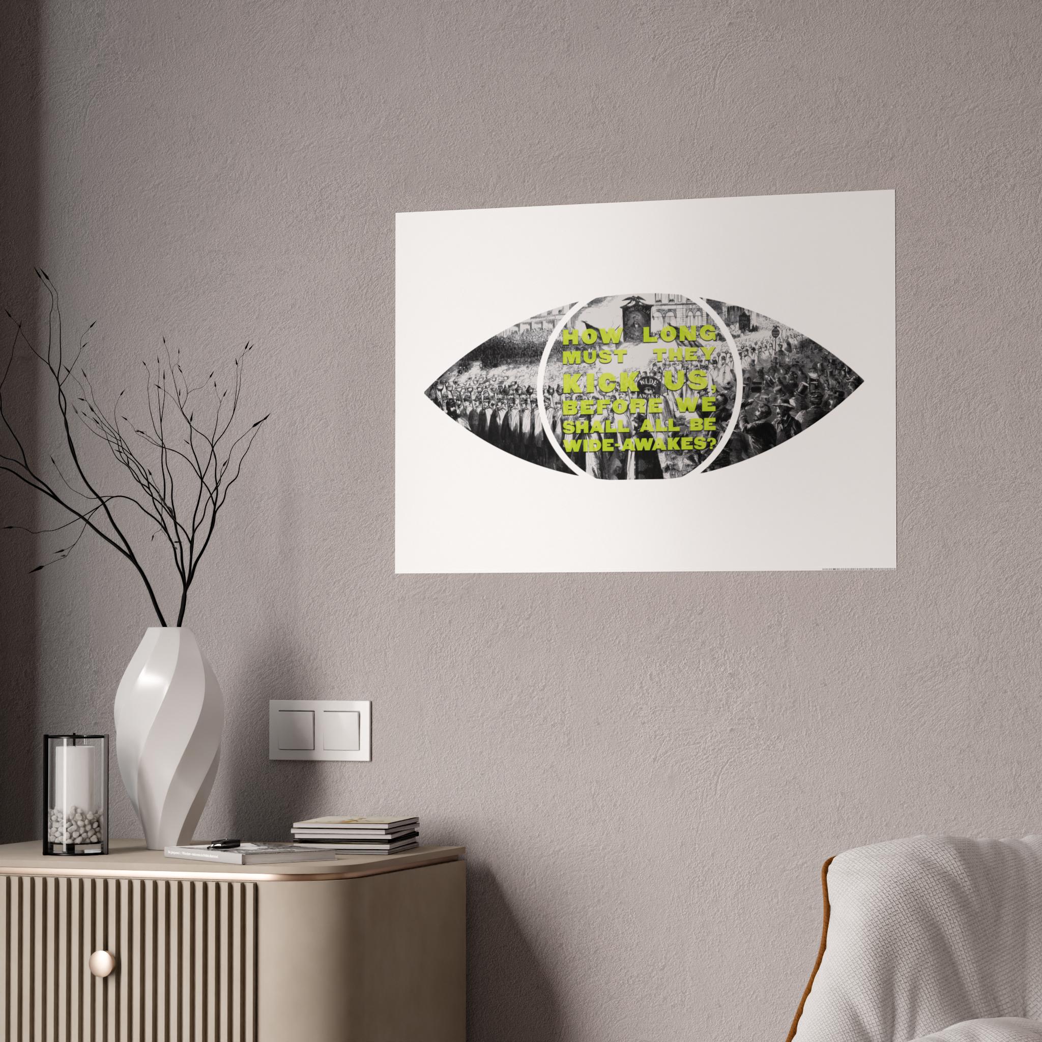 This pop art-inspired poster captures the essence of a large demonstration of the New York Wide-Awakes in the streets of Manhattan. The vibrant colors and unique shape make it a perfect statement piece for art enthusiasts and history buffs. Ideal for decorating a home office, dorm room, or living space. Relevant for historical events, protest movements, and patriotic celebrations.