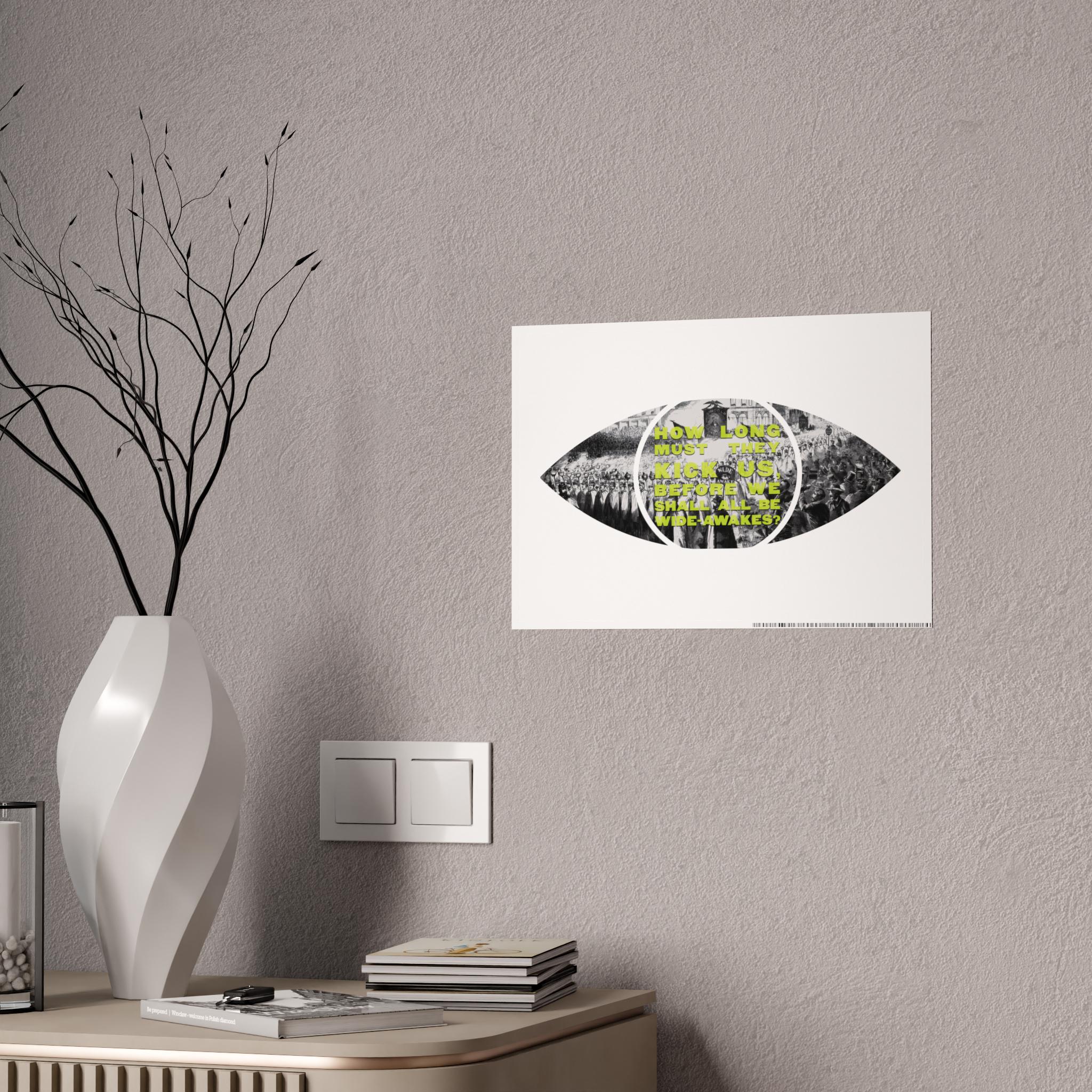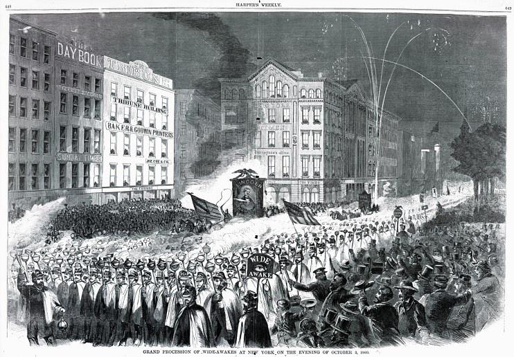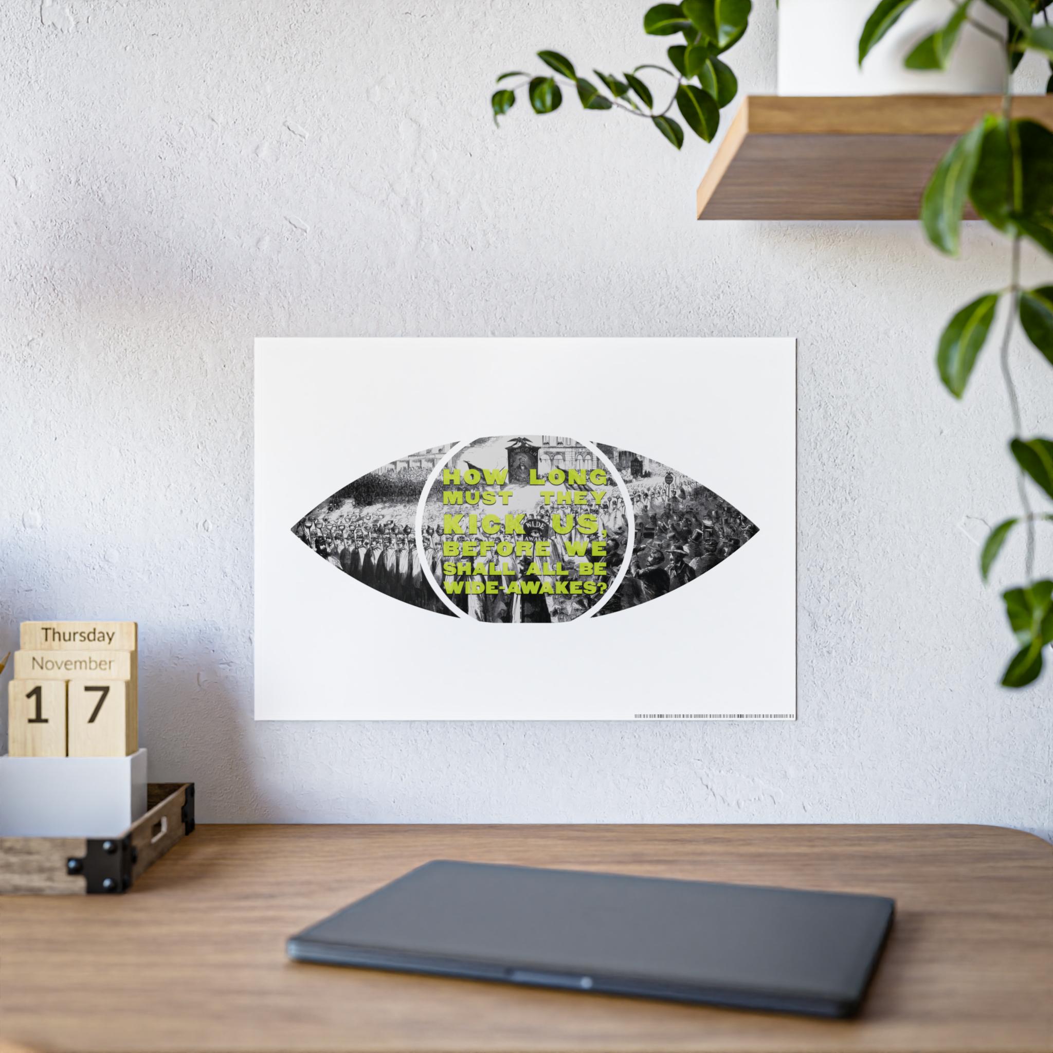 This pop art-inspired poster captures the essence of a large demonstration of the New York Wide-Awakes in the streets of Manhattan. The vibrant colors and unique shape make it a perfect statement piece for art enthusiasts and history buffs. Ideal for decorating a home office, dorm room, or living space. Relevant for historical events, protest movements, and patriotic celebrations.