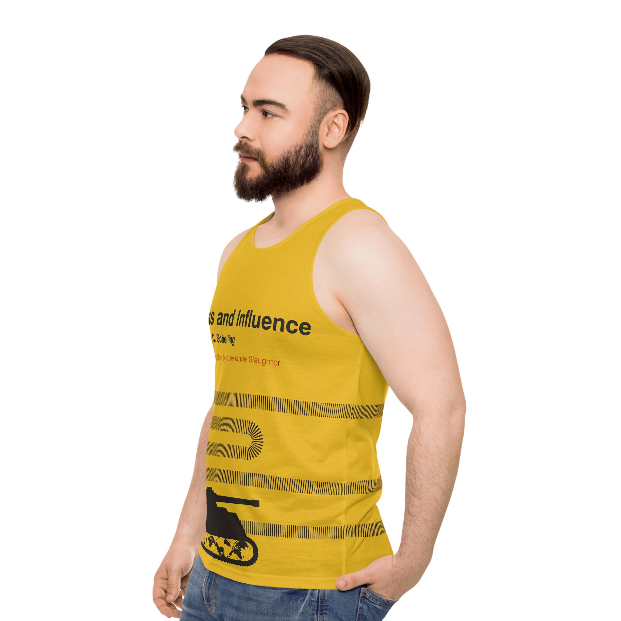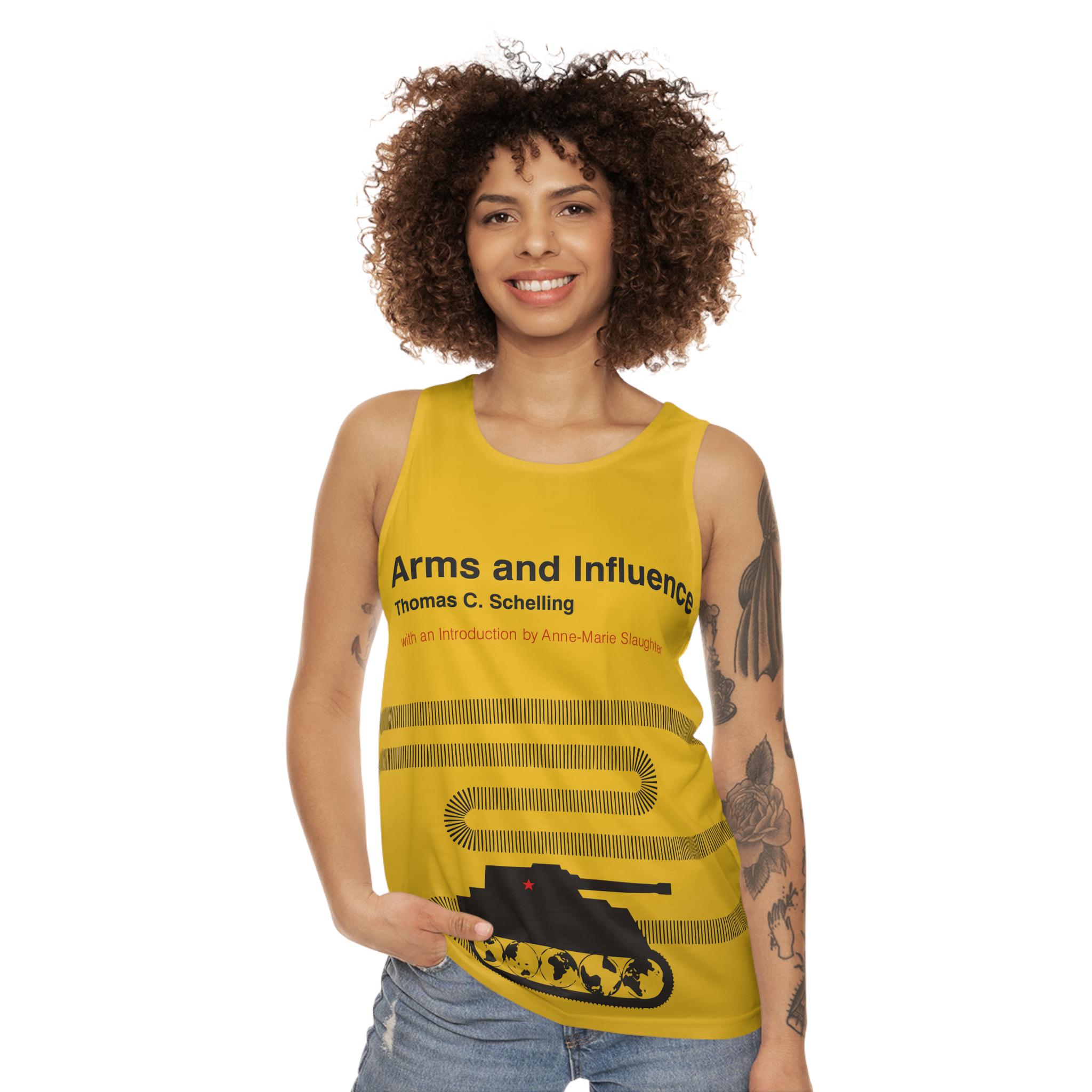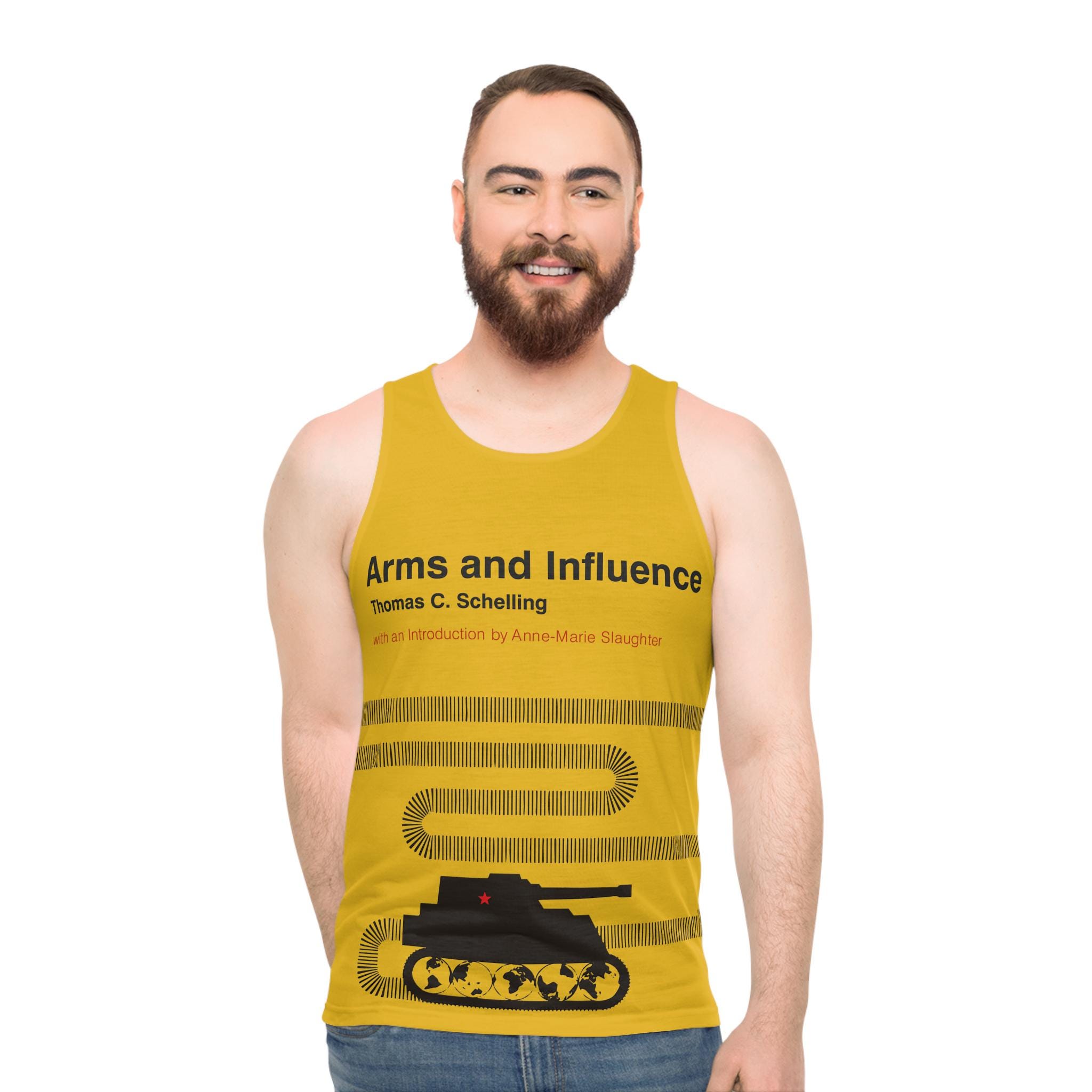A unique and playful tank top featuring a bold yellow design of a tank and tank treads, inspired by the cover of the 2020 edition of Arms and Influence. This tank top is a visual pun that shows off your arms, fitting for those looking for a fun and quirky addition to their wardrobe. Perfect for military enthusiasts, book lovers, and those looking to add a touch of humor to their outfit. Ideal for casual wear, summer outings, book club meetings, and military-themed events.