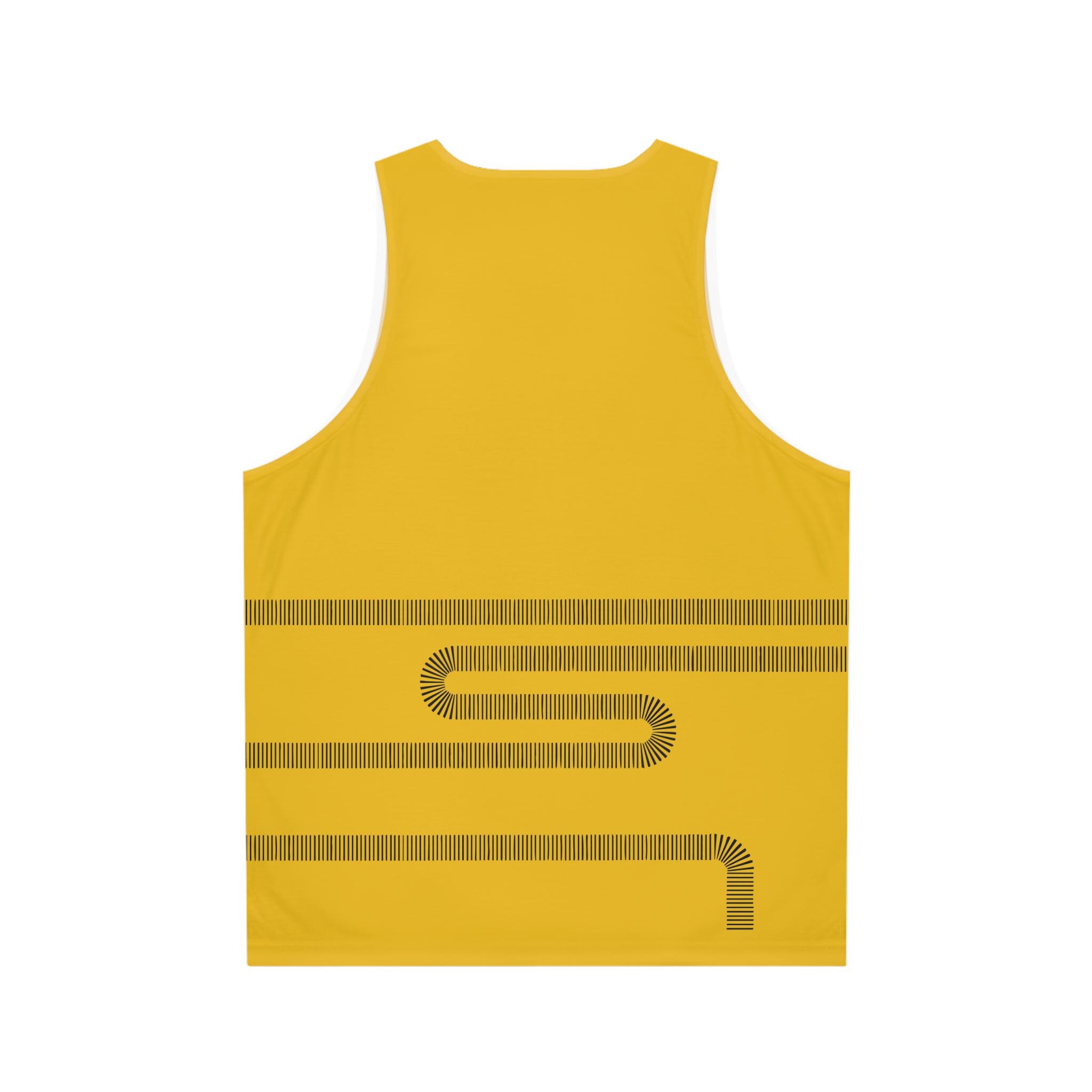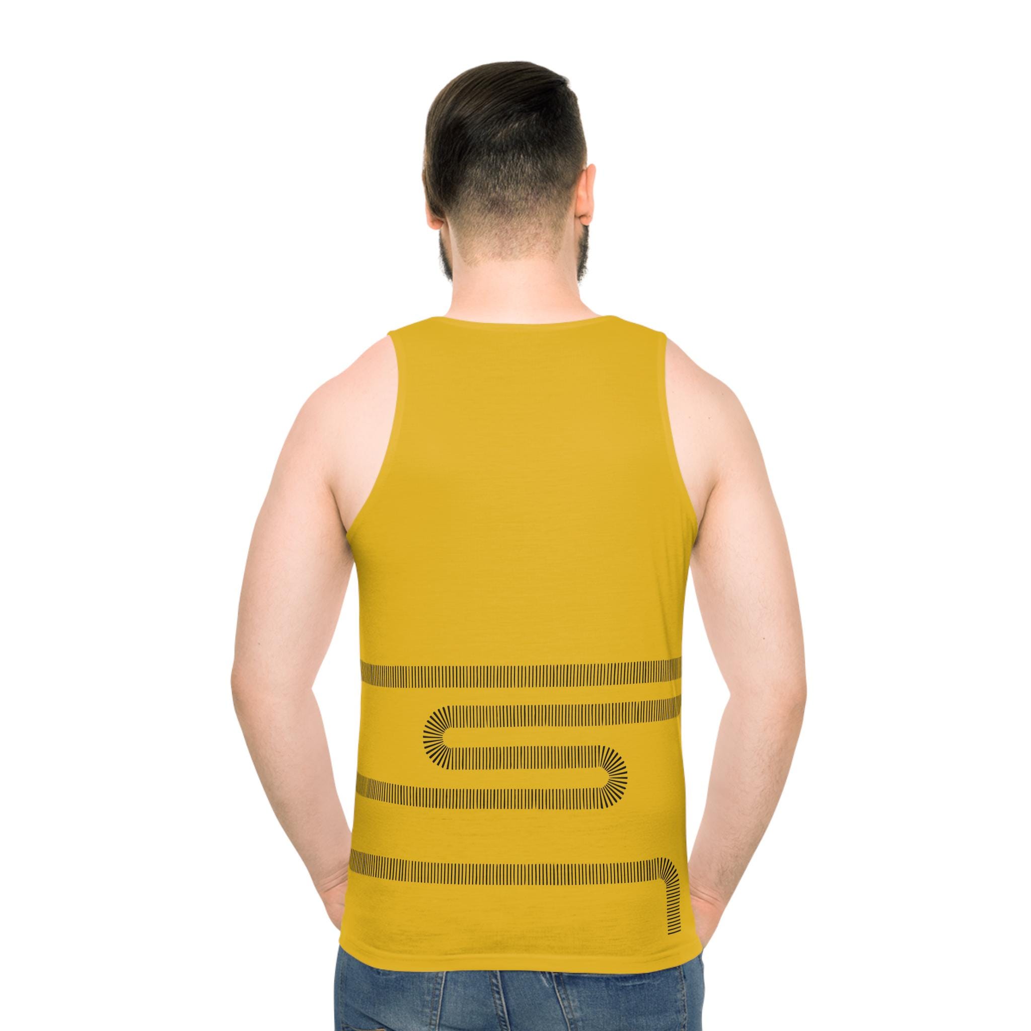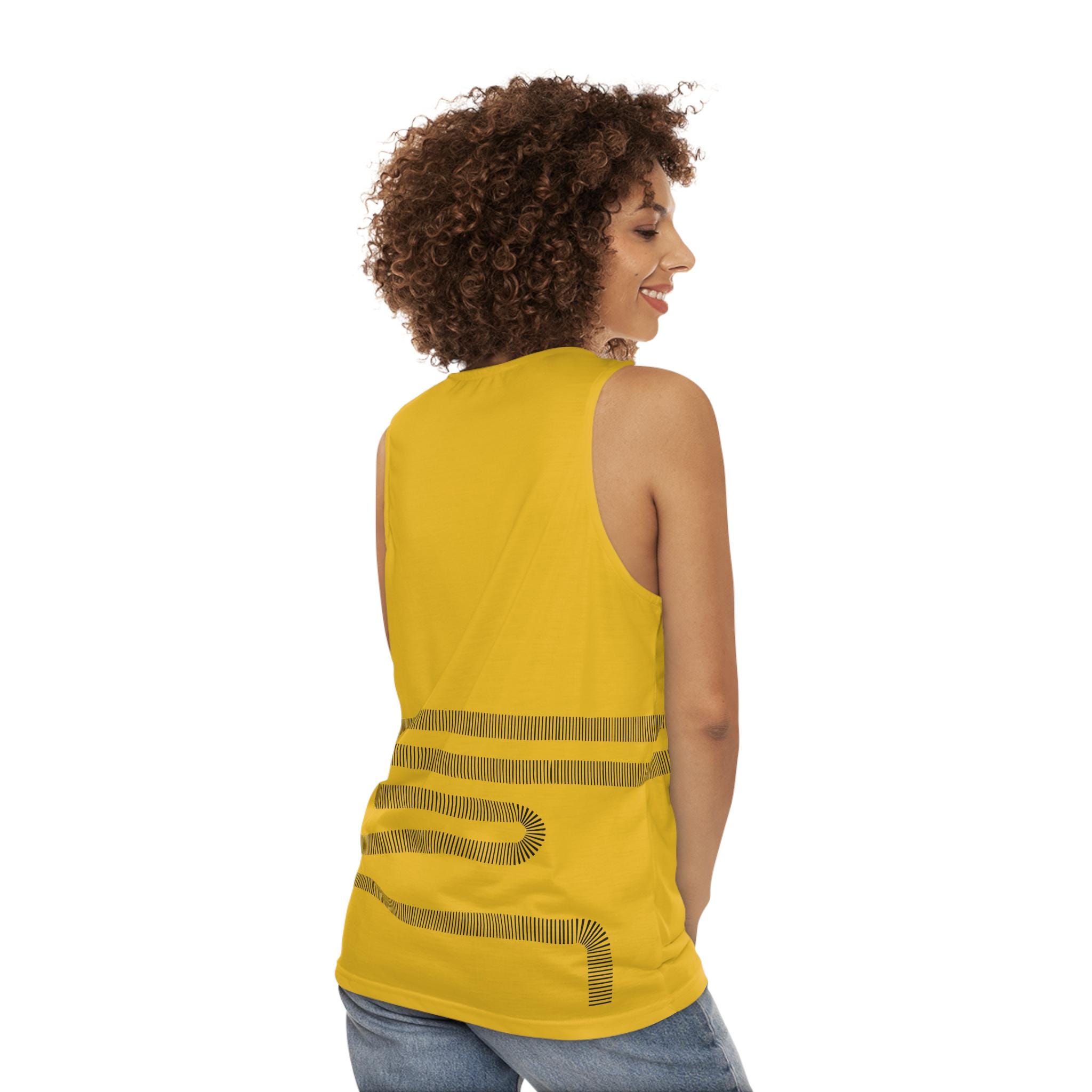 A unique and playful tank top featuring a bold yellow design of a tank and tank treads, inspired by the cover of the 2020 edition of Arms and Influence. This tank top is a visual pun that shows off your arms, fitting for those looking for a fun and quirky addition to their wardrobe. Perfect for military enthusiasts, book lovers, and those looking to add a touch of humor to their outfit. Ideal for casual wear, summer outings, book club meetings, and military-themed events.