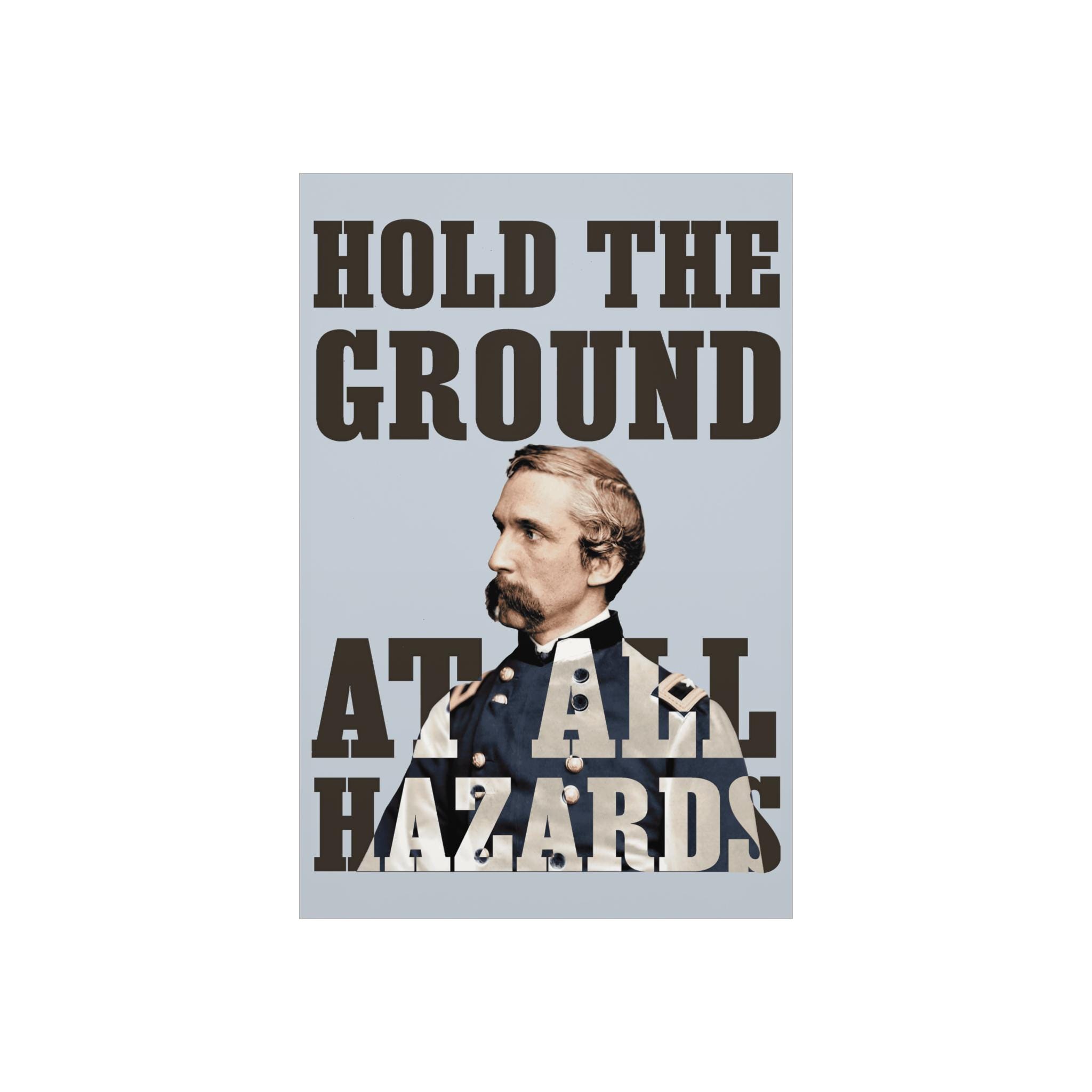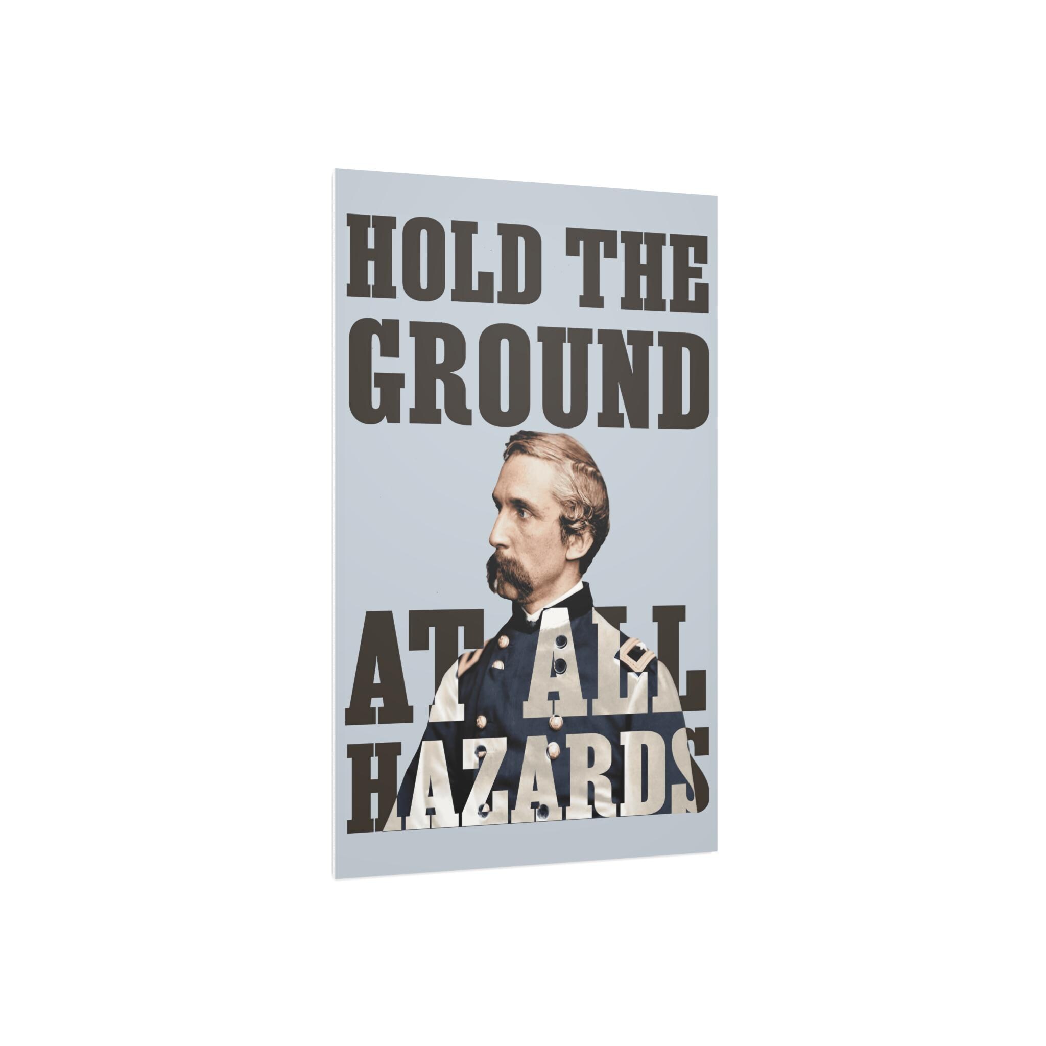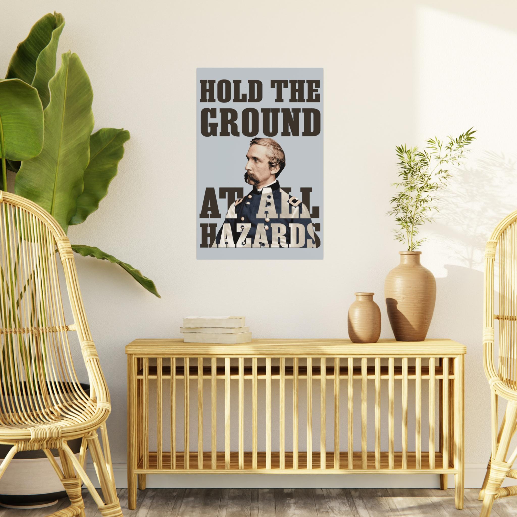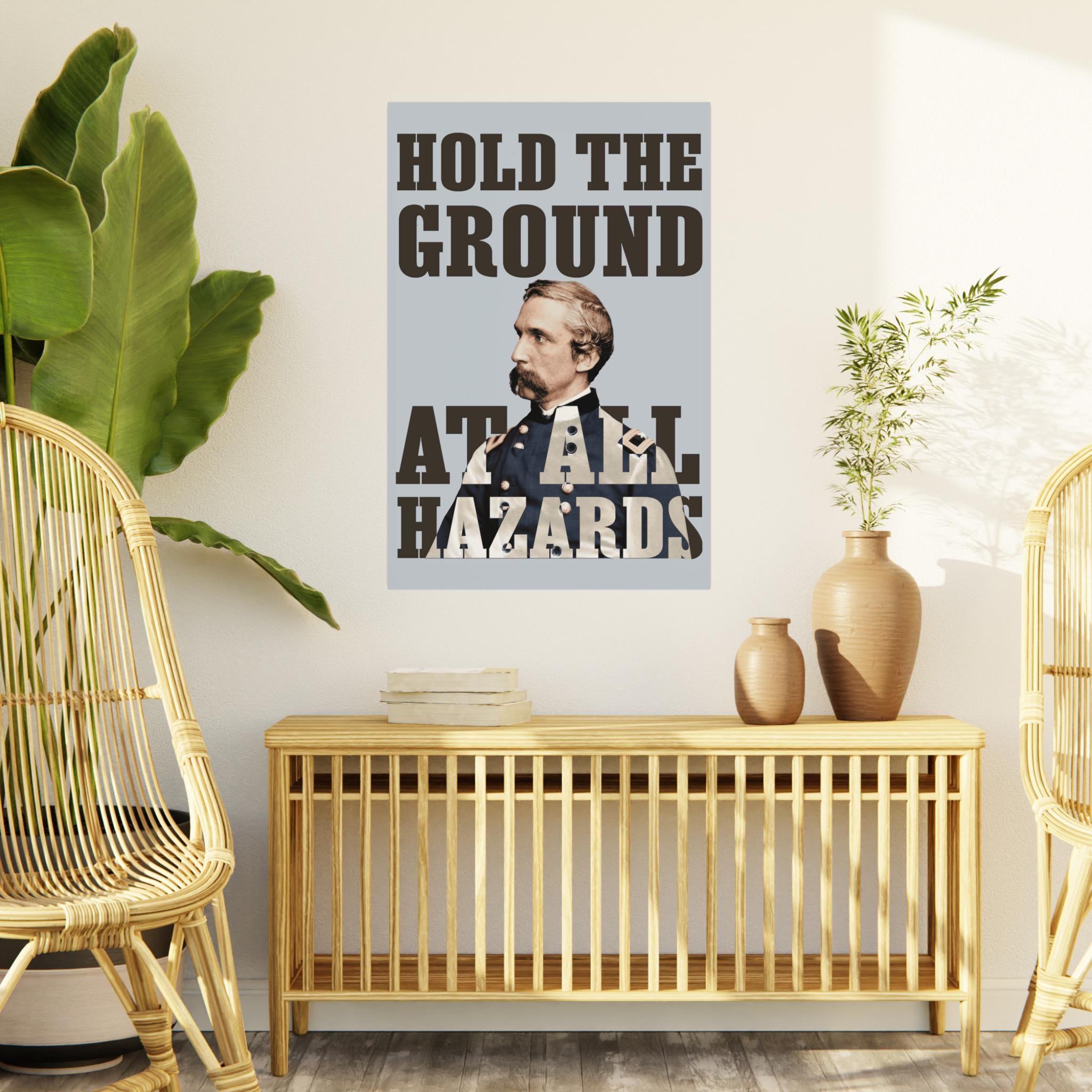 This foam board poster features a pop art protest sign with a colorized portrait of Joshua Chamberlain and the text 'Hold The Ground At All Hazards.' Perfect for history enthusiasts, Civil War buffs, and those who appreciate unique art pieces. Ideal for decorating a home office, classroom, or history lover's space. Great for Memorial Day, Independence Day, and historical commemoration events.