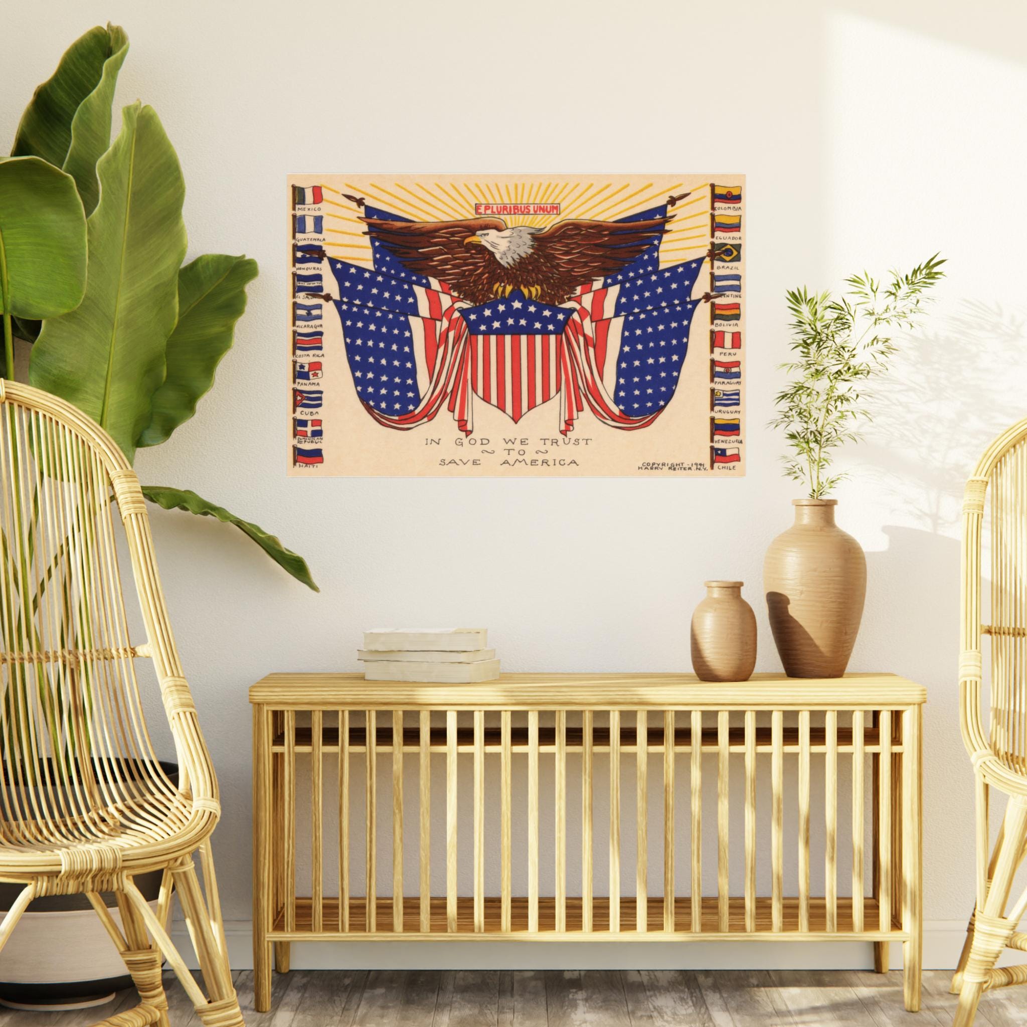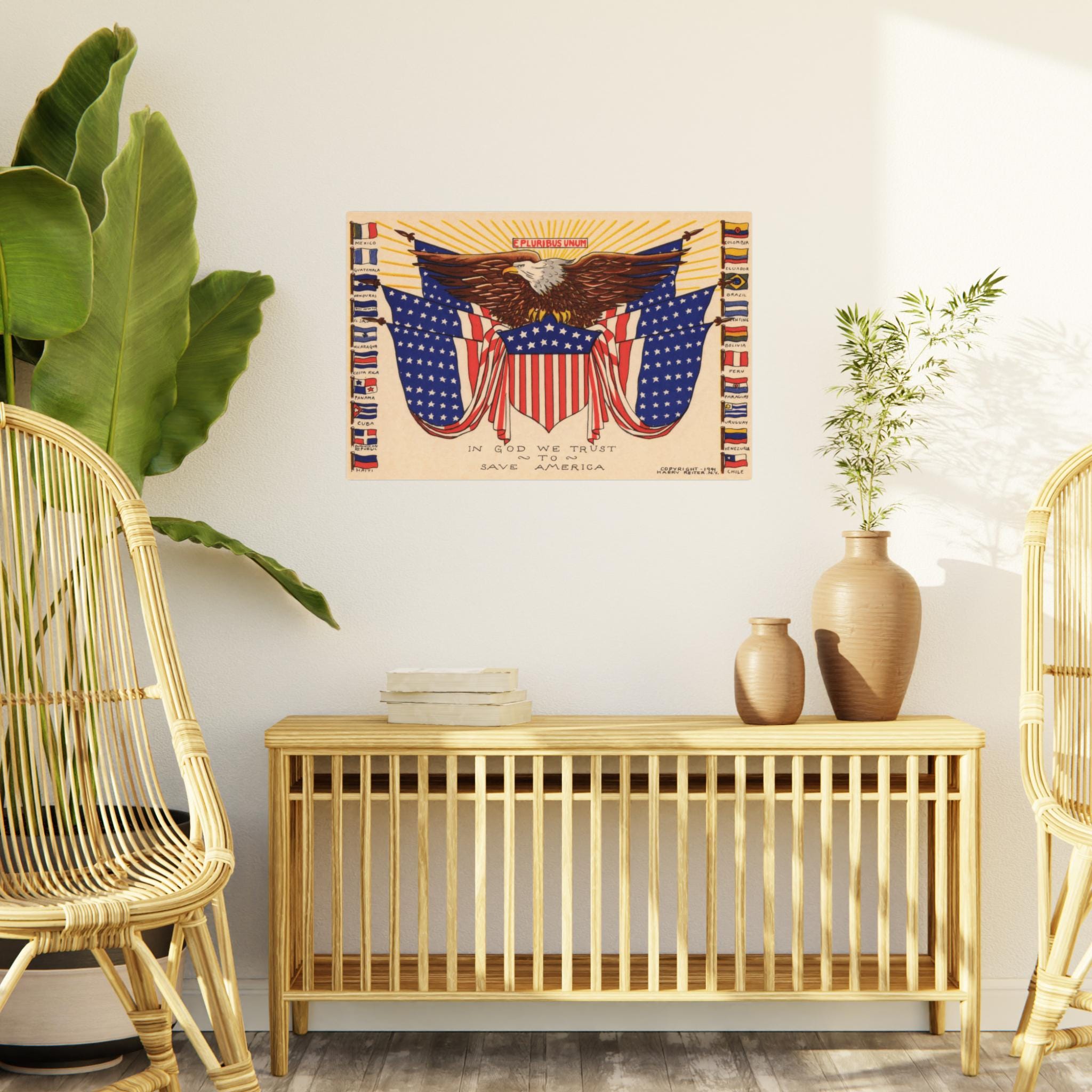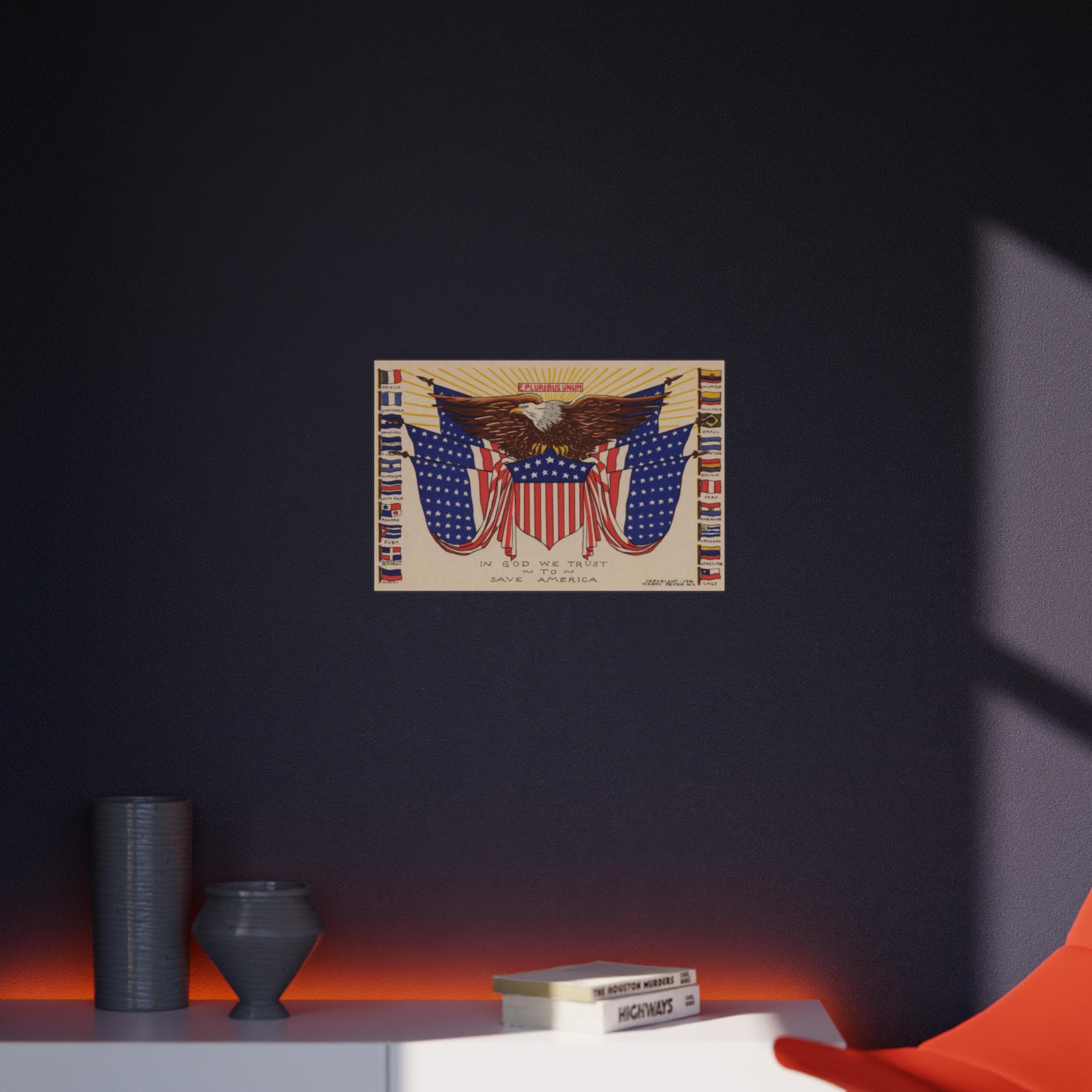 This patriotic foam board wall art features a 1941 illustration celebrating immigration, particularly from Latin American countries. The design includes an eagle in the center with an American flag shield, surrounded by six more American flags and the flags of all the independent Latin American countries that existed in 1941. Above the eagle, the phrase "E Pluribus Unum" emphasizes the unity and diversity of the American people. Perfect for those who appreciate history, patriotism, and cultural diversity. Ideal for decorating homes, offices, or classrooms. Relevant for Independence Day, Hispanic Heritage Month, and patriotic celebrations.