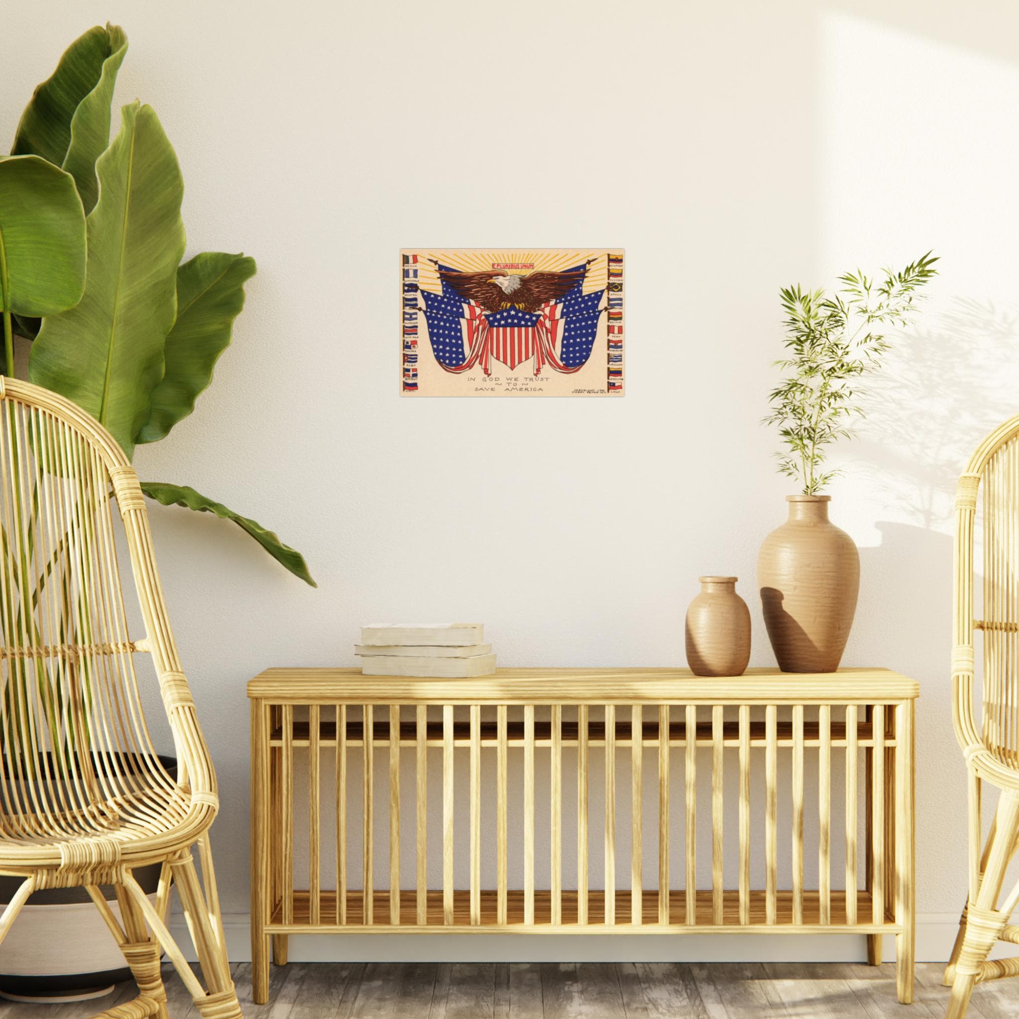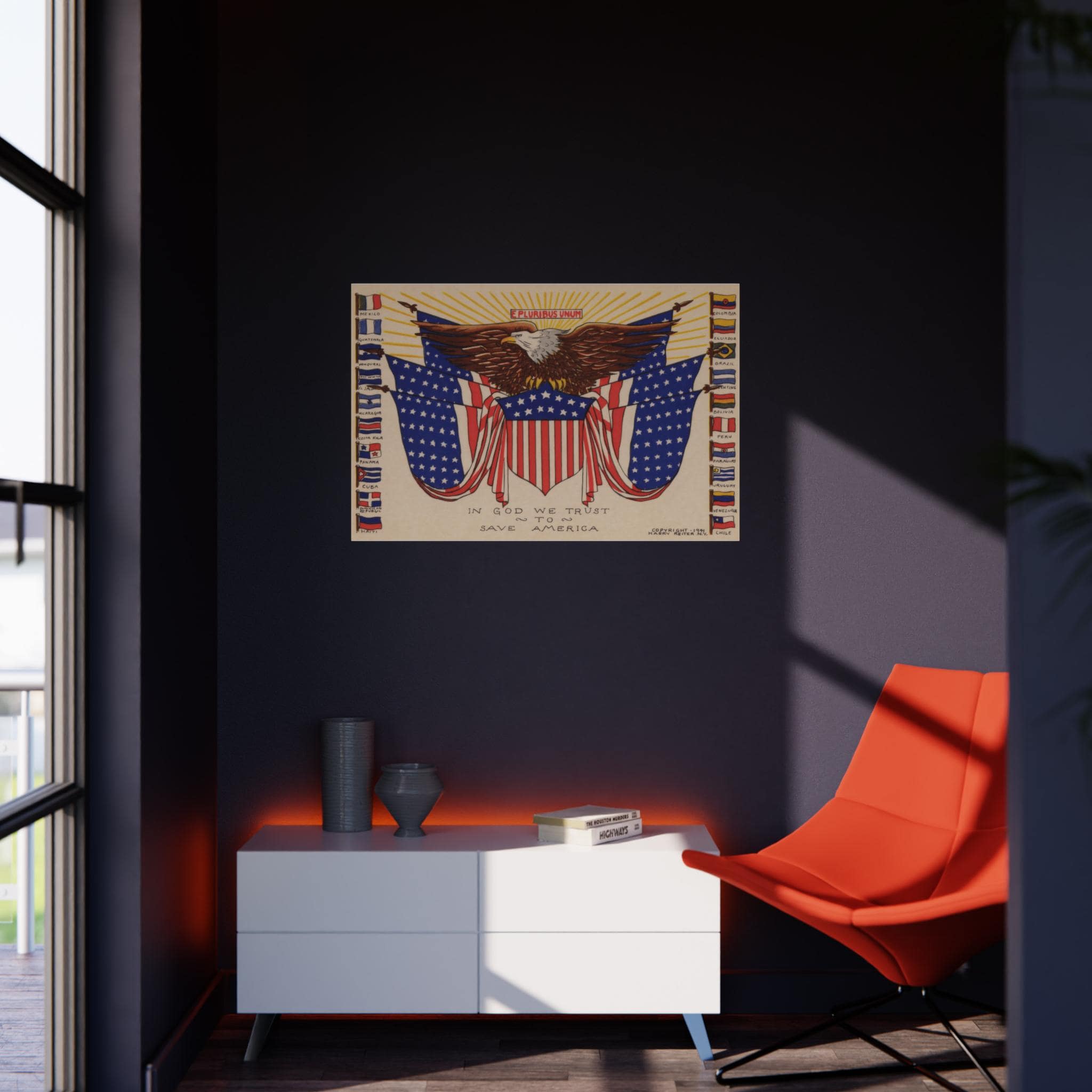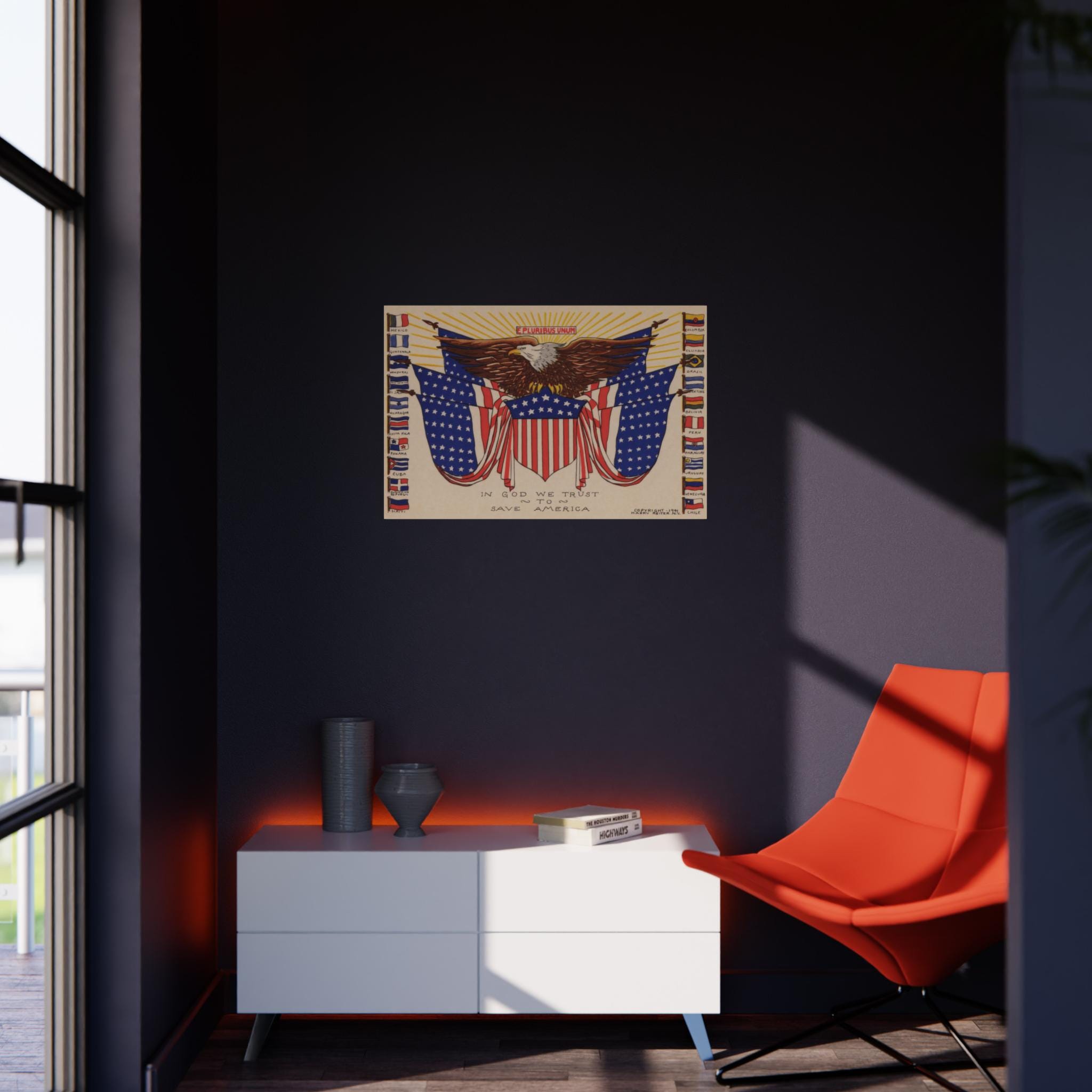 This patriotic foam board wall art features a 1941 illustration celebrating immigration, particularly from Latin American countries. The design includes an eagle in the center with an American flag shield, surrounded by six more American flags and the flags of all the independent Latin American countries that existed in 1941. Above the eagle, the phrase "E Pluribus Unum" emphasizes the unity and diversity of the American people. Perfect for those who appreciate history, patriotism, and cultural diversity. Ideal for decorating homes, offices, or classrooms. Relevant for Independence Day, Hispanic Heritage Month, and patriotic celebrations.