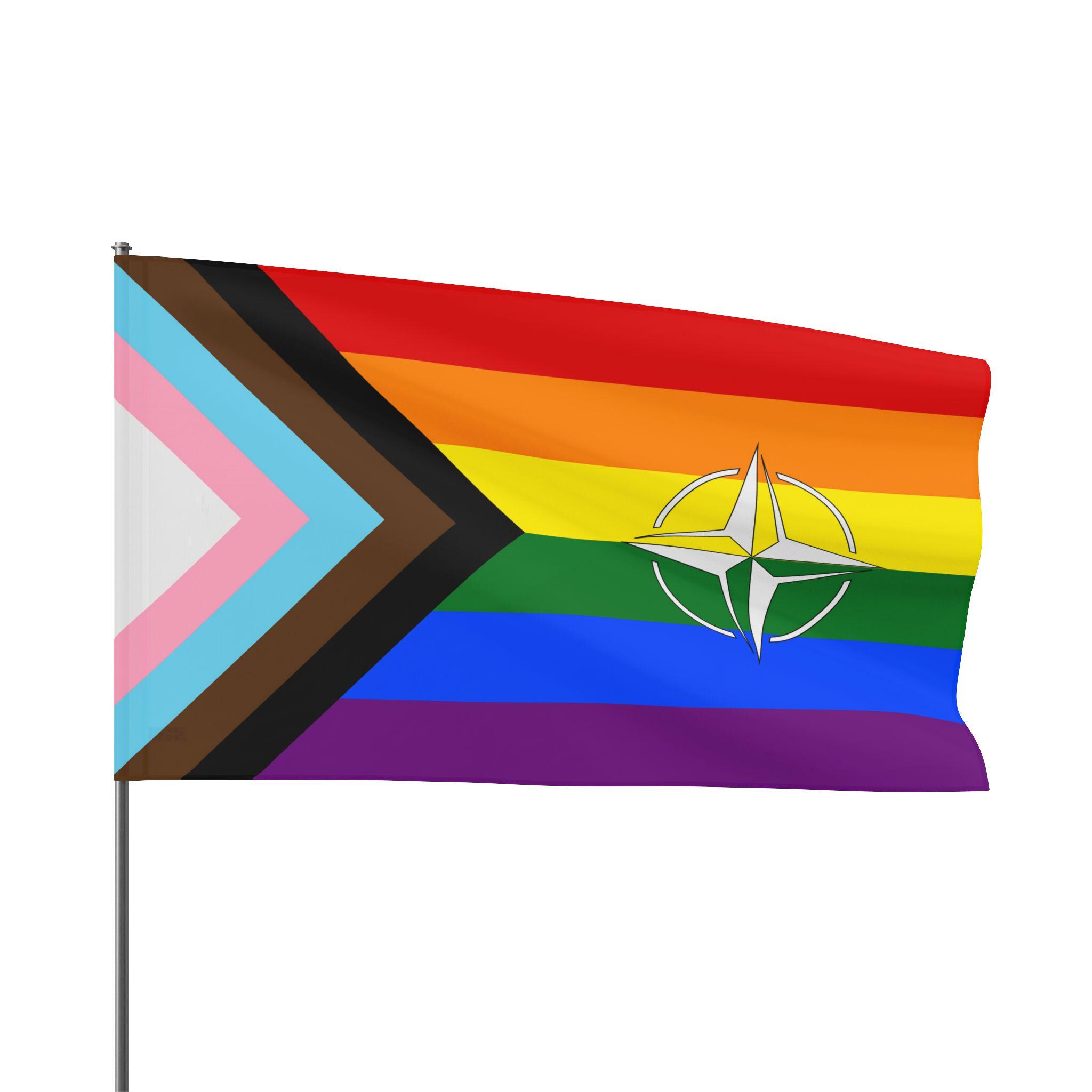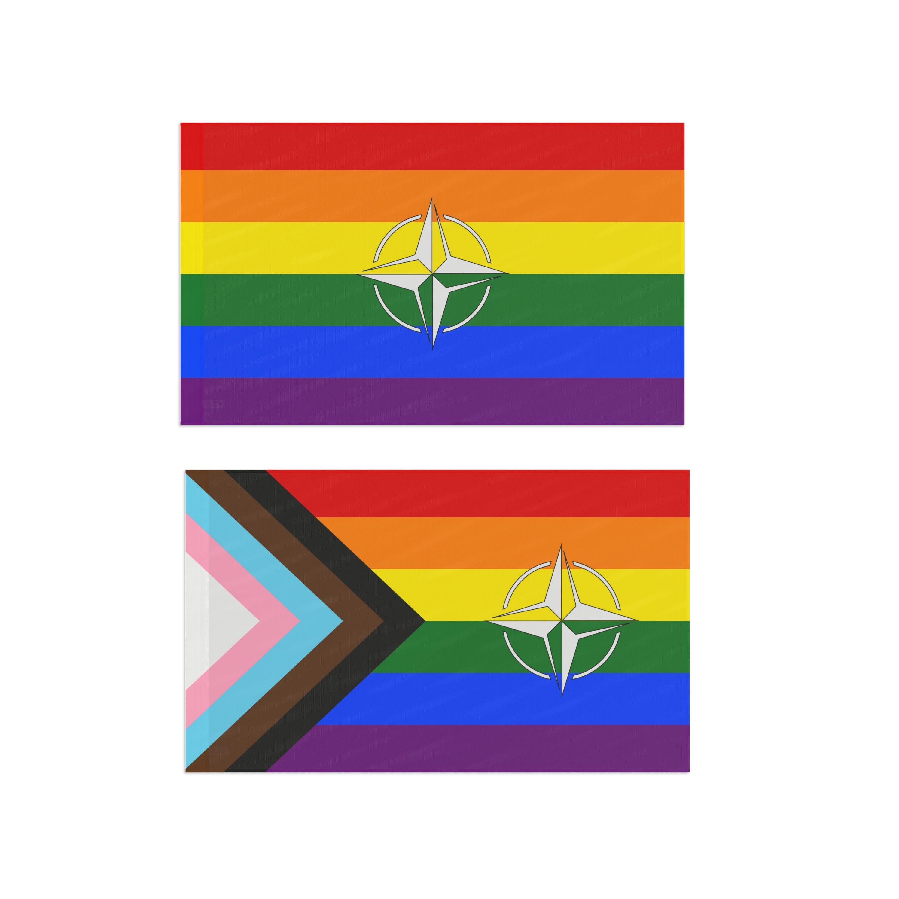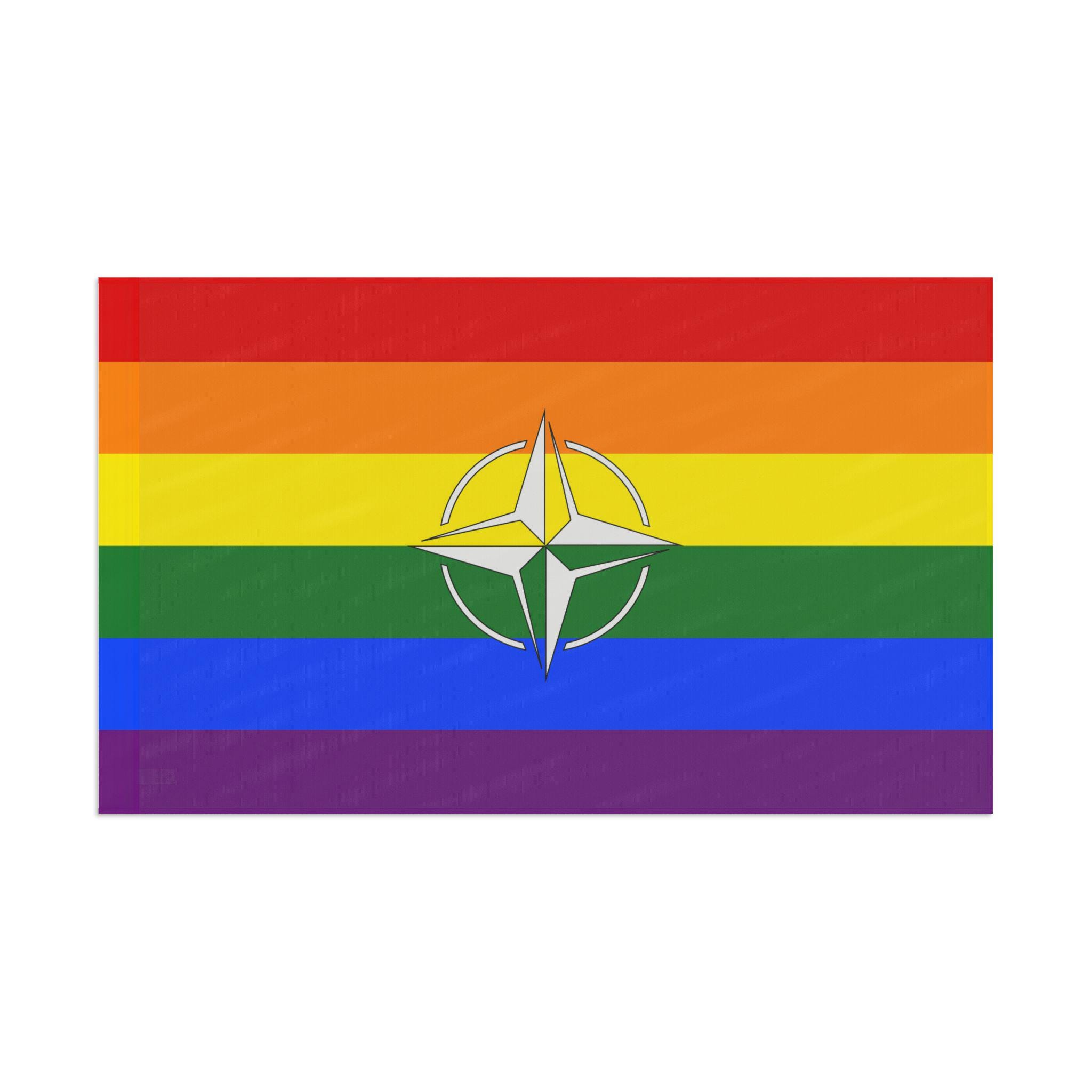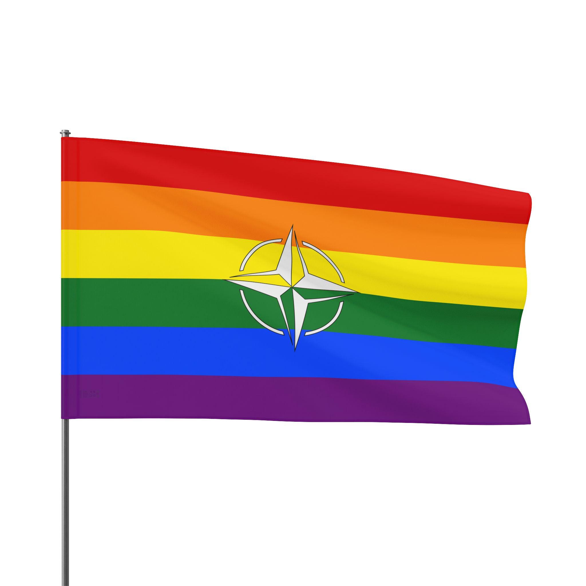 This double sided Pride flag features the compass symbol of NATO, showing solidarity for LGBTQ+ people at home and abroad. Vibrant colors and lightweight polyester make it a versatile and durable addition to any pride celebration or event.