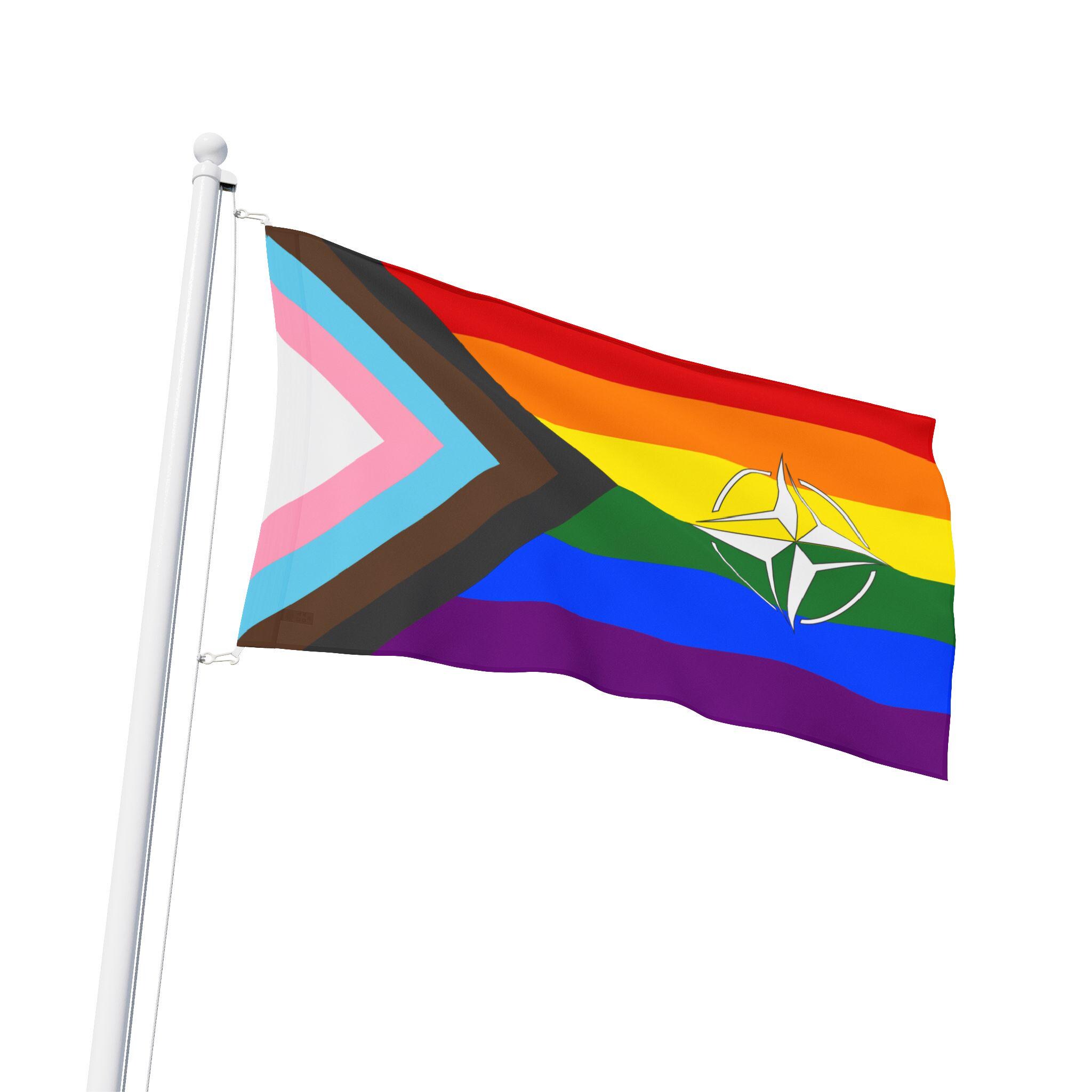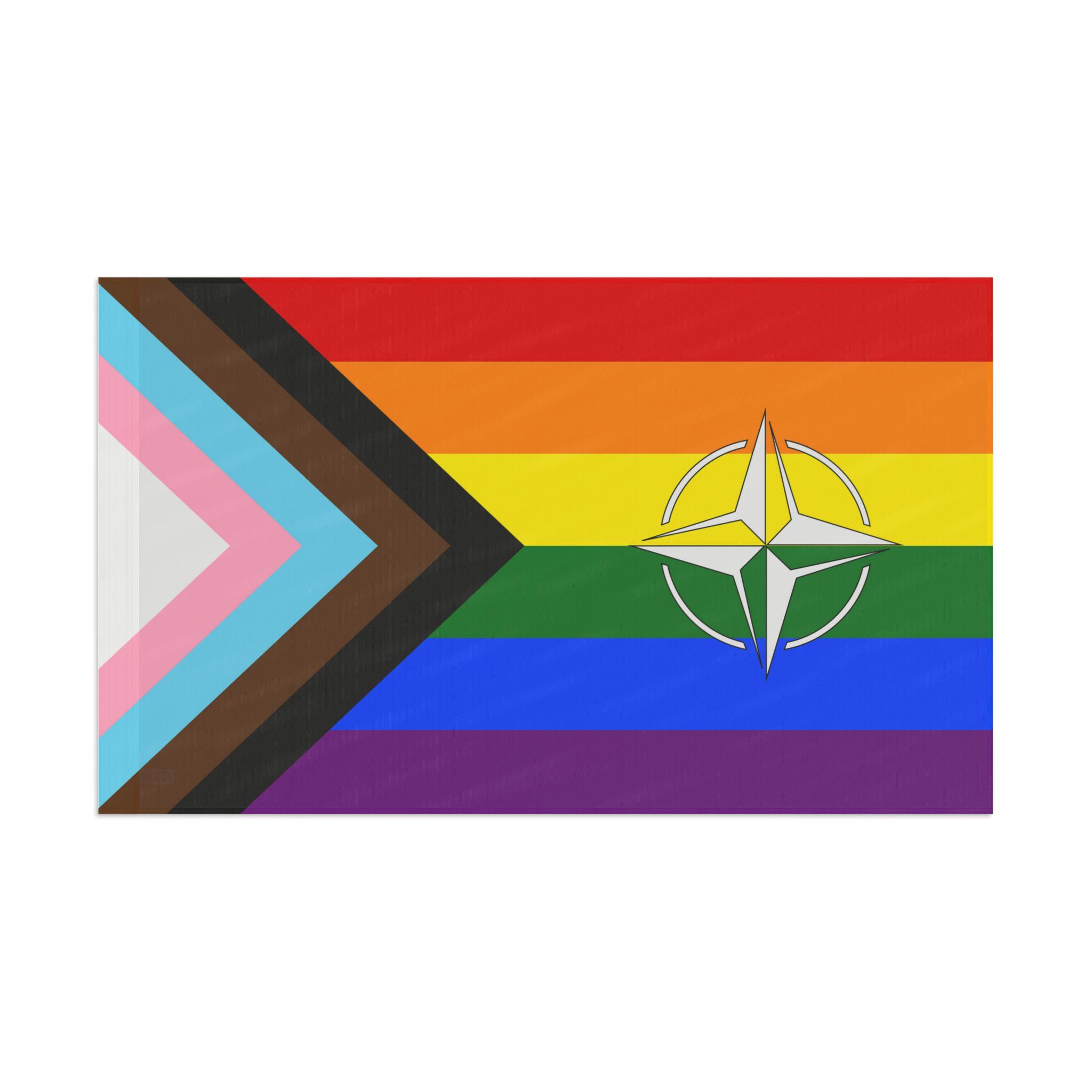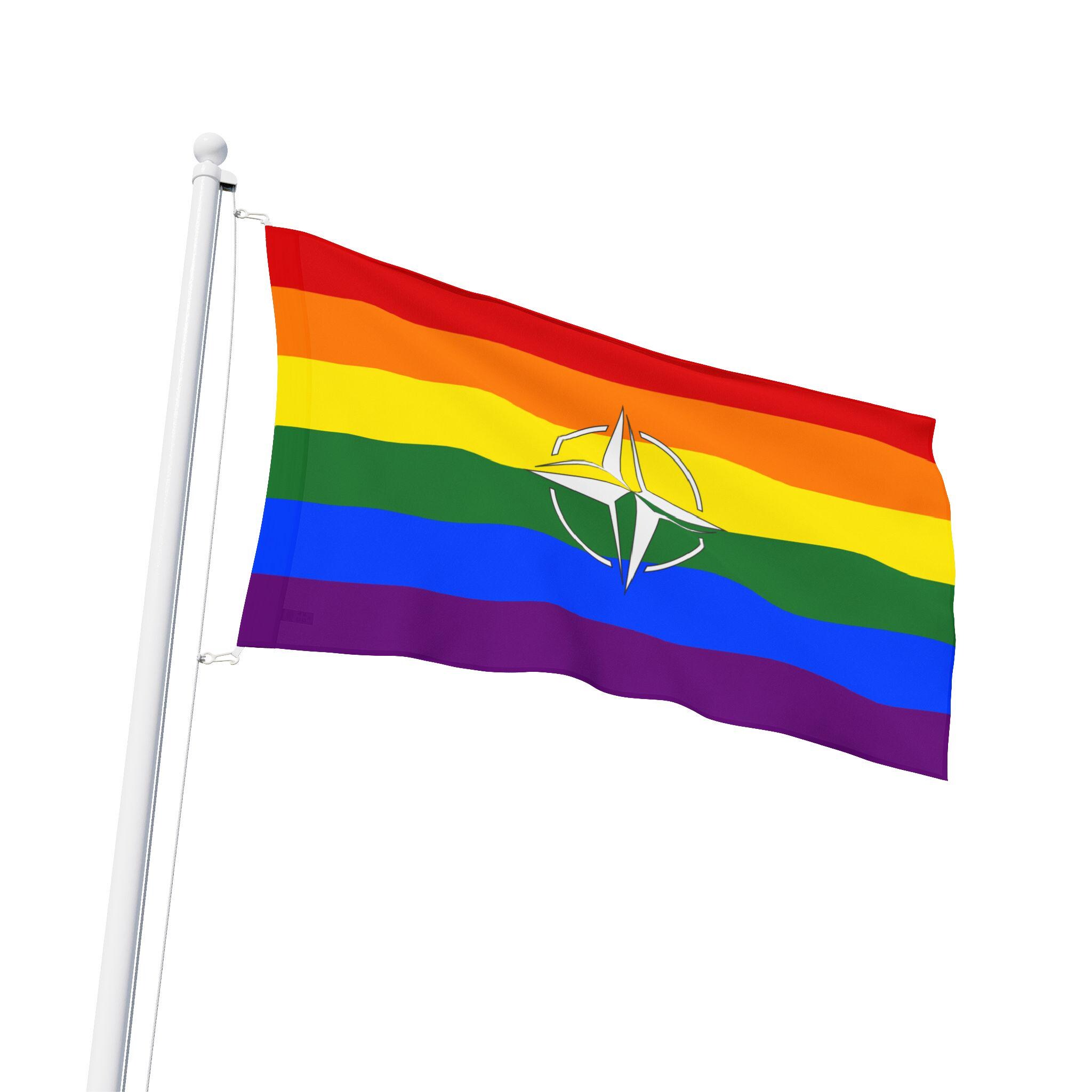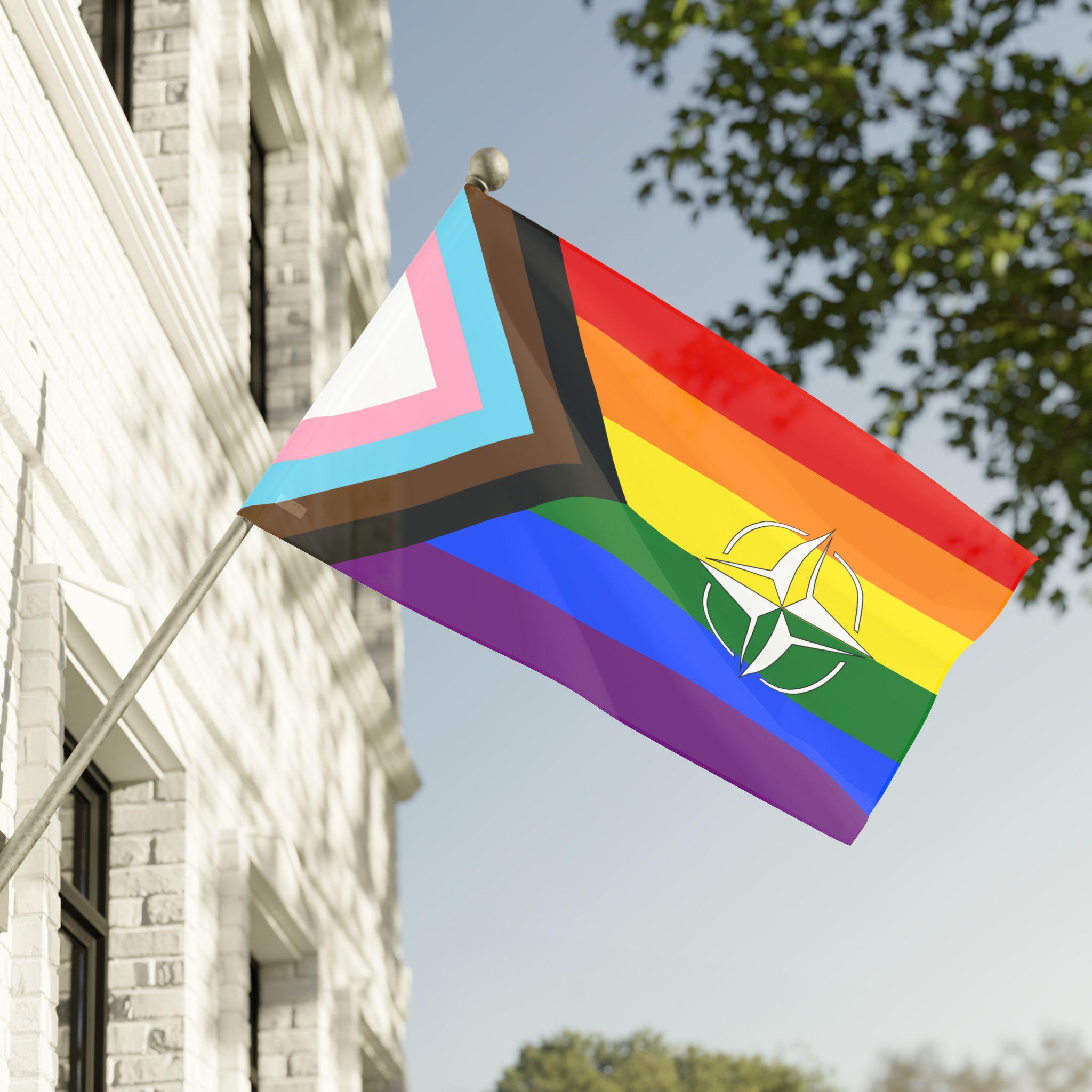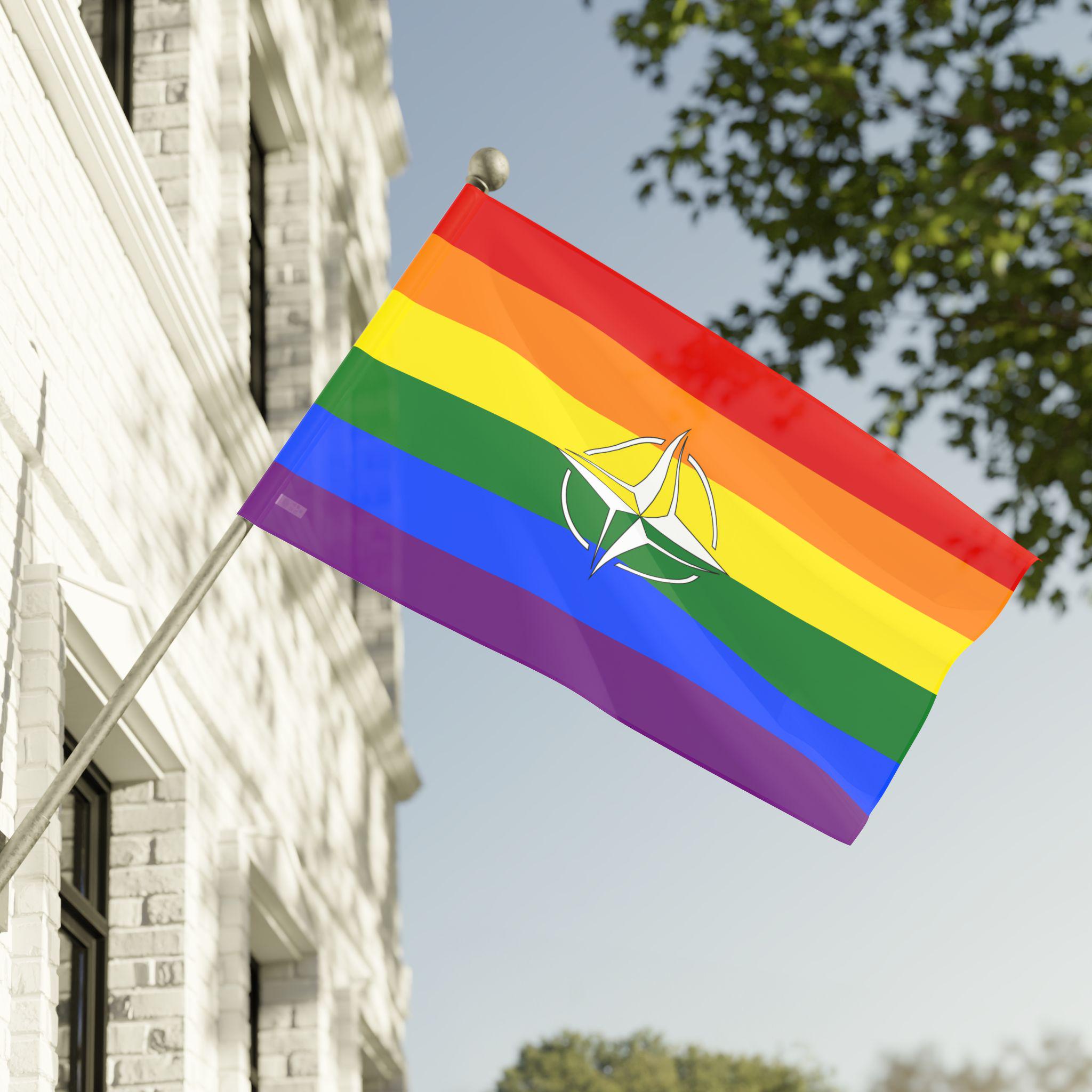 This double sided Pride flag features the compass symbol of NATO, showing solidarity for LGBTQ+ people at home and abroad. Vibrant colors and lightweight polyester make it a versatile and durable addition to any pride celebration or event.