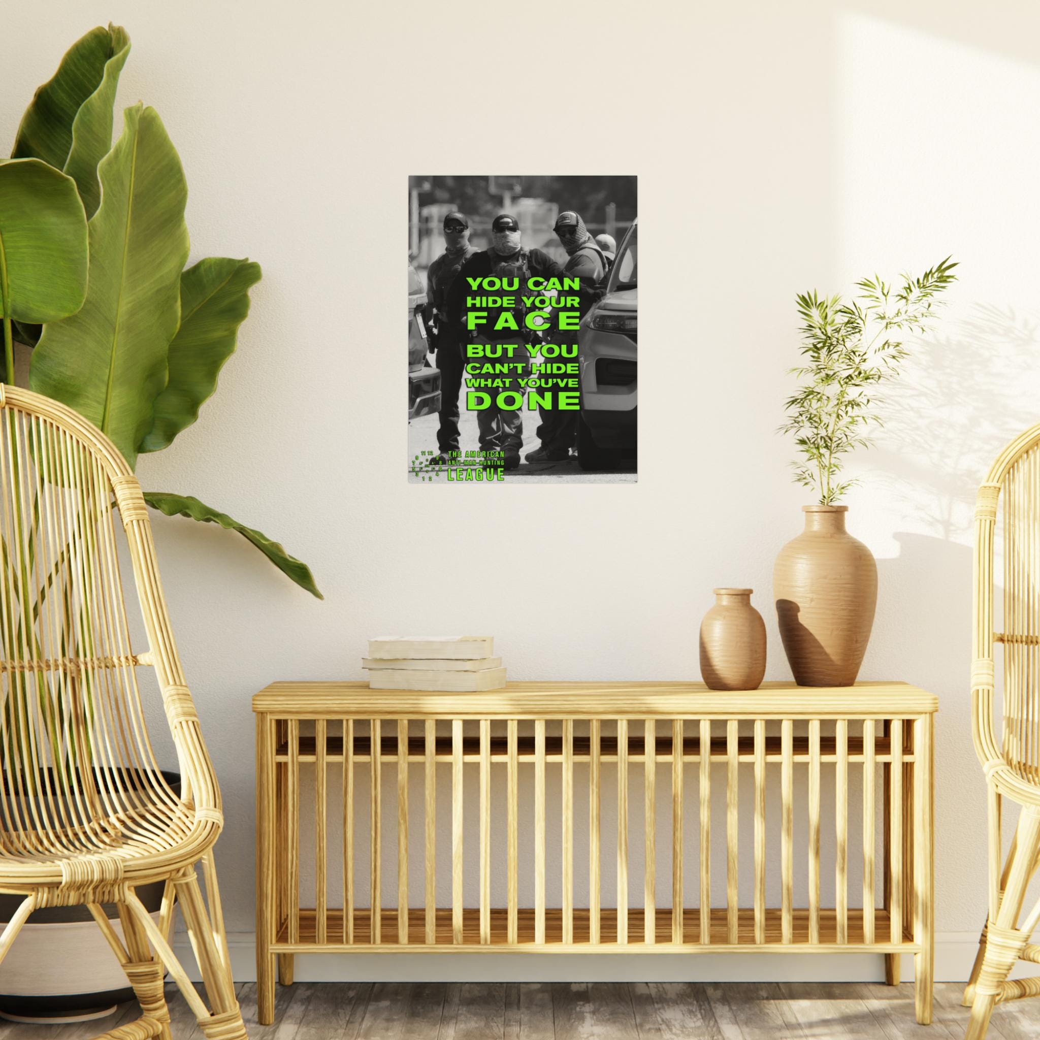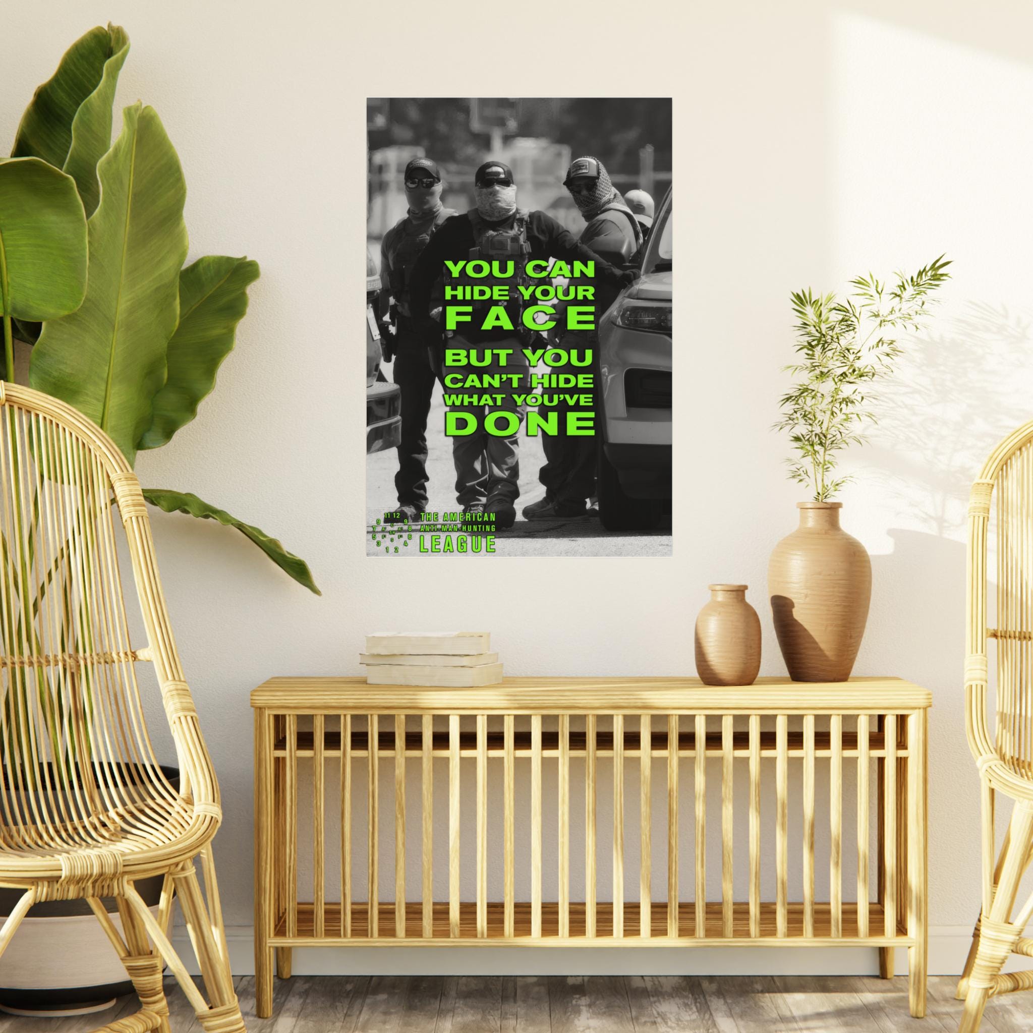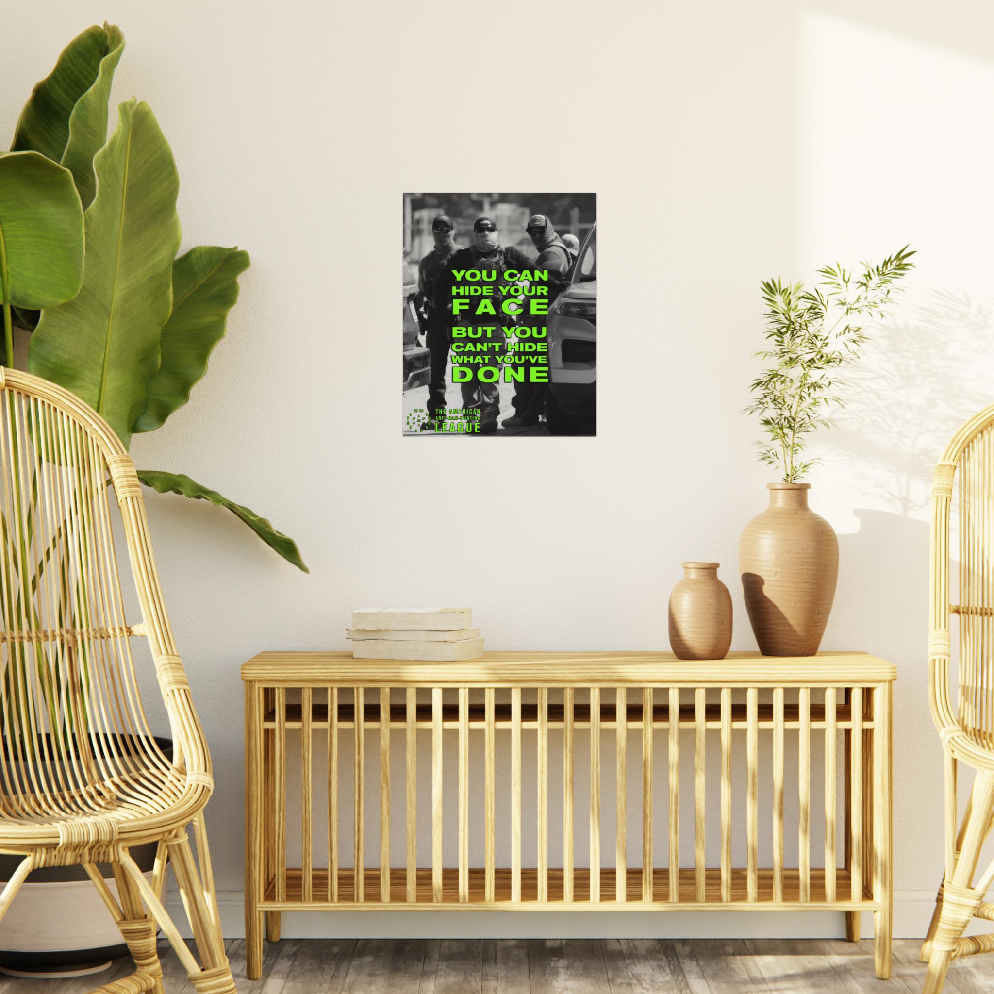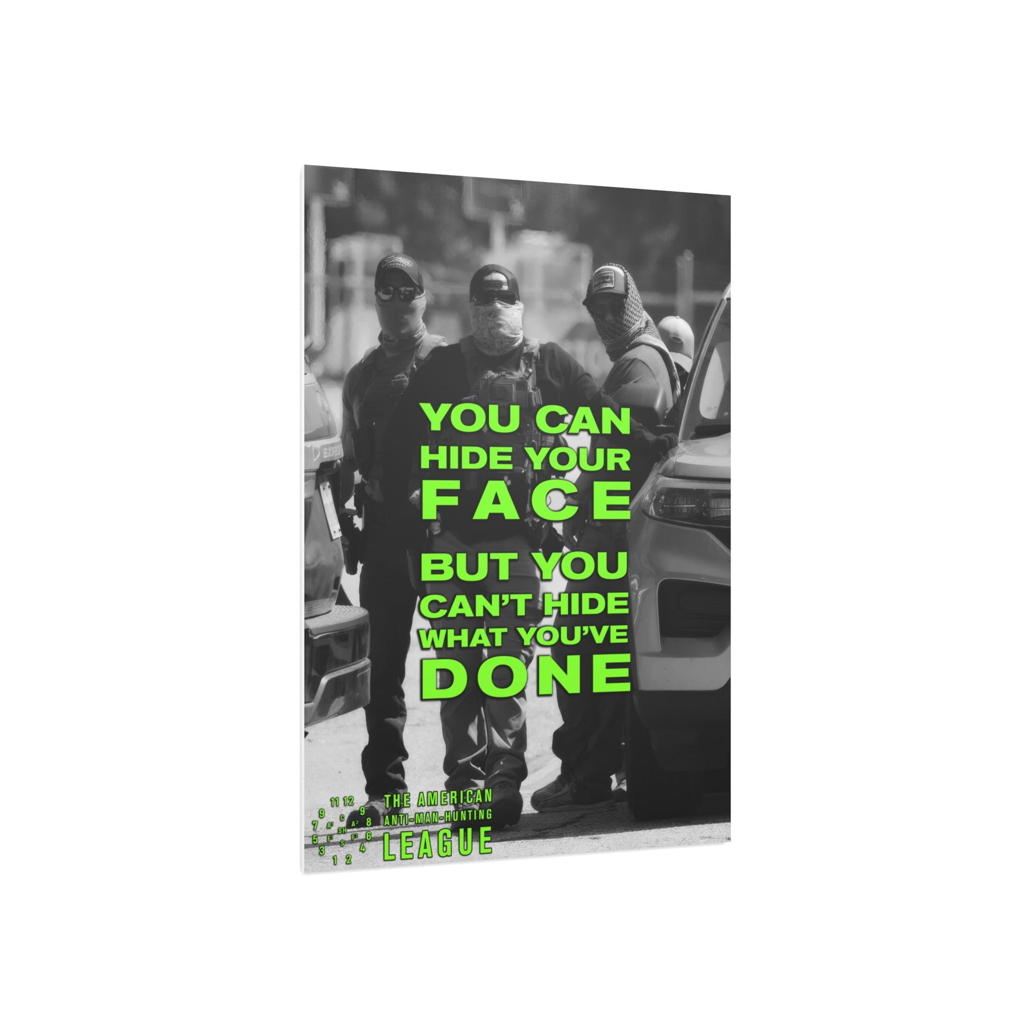 The Artwork: A black and white photograph captures three anonymous, masked ICE agents. Their anonymity is challenged by the superimposed text, rendered in a jarring, acid green sans-serif font: "YOU CAN HIDE YOUR FACE, BUT YOU CAN'T HIDE WHAT YOU'VE DONE." This statement transforms them from faceless agents into accountable individuals.