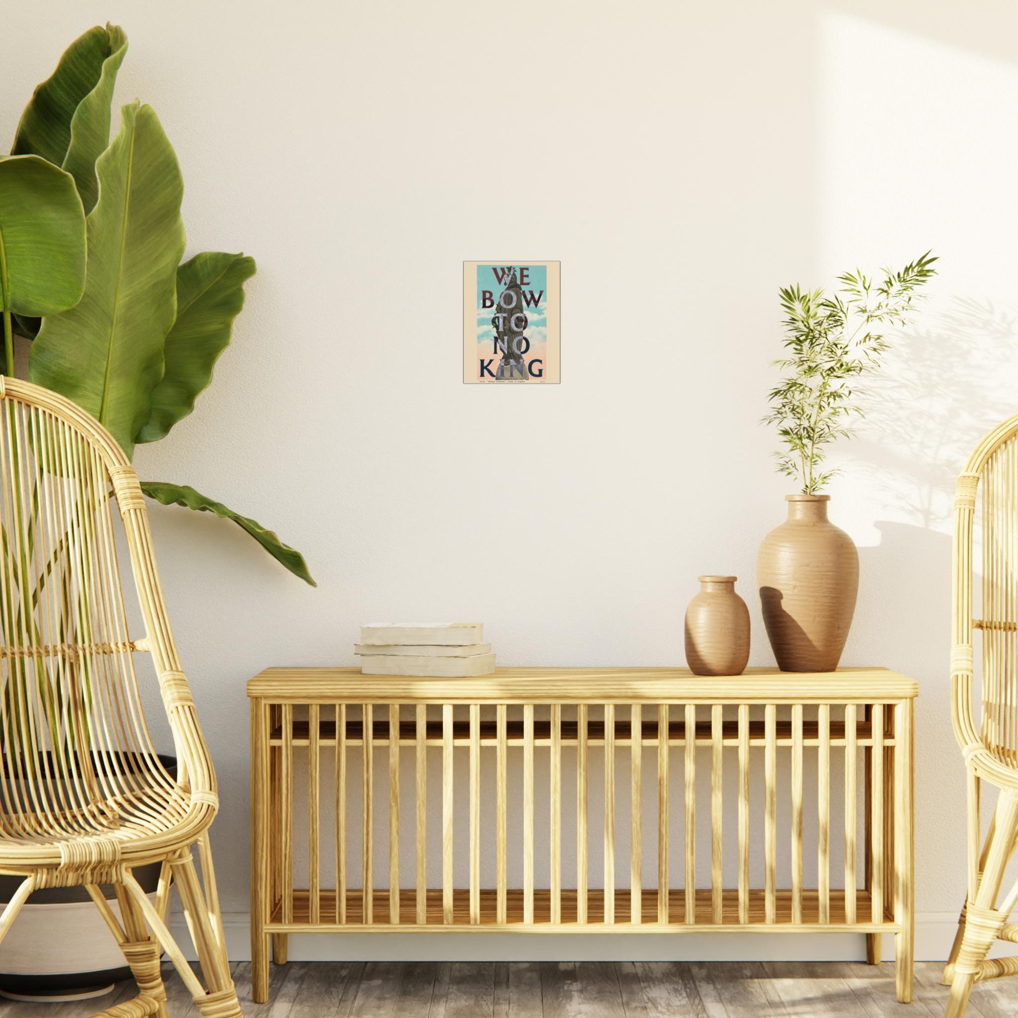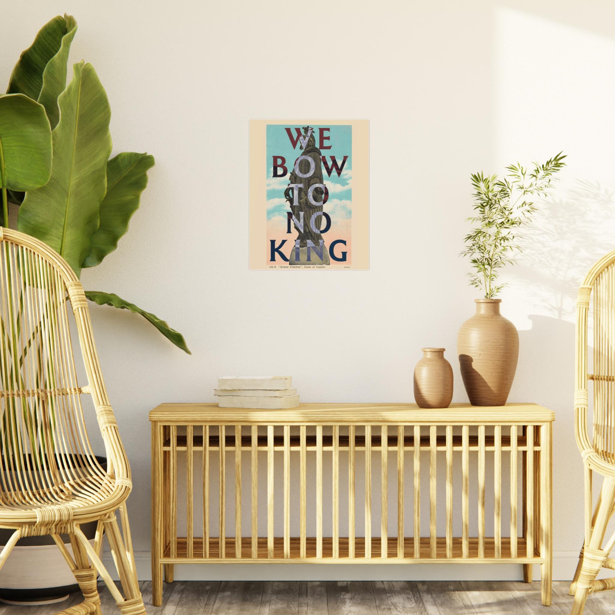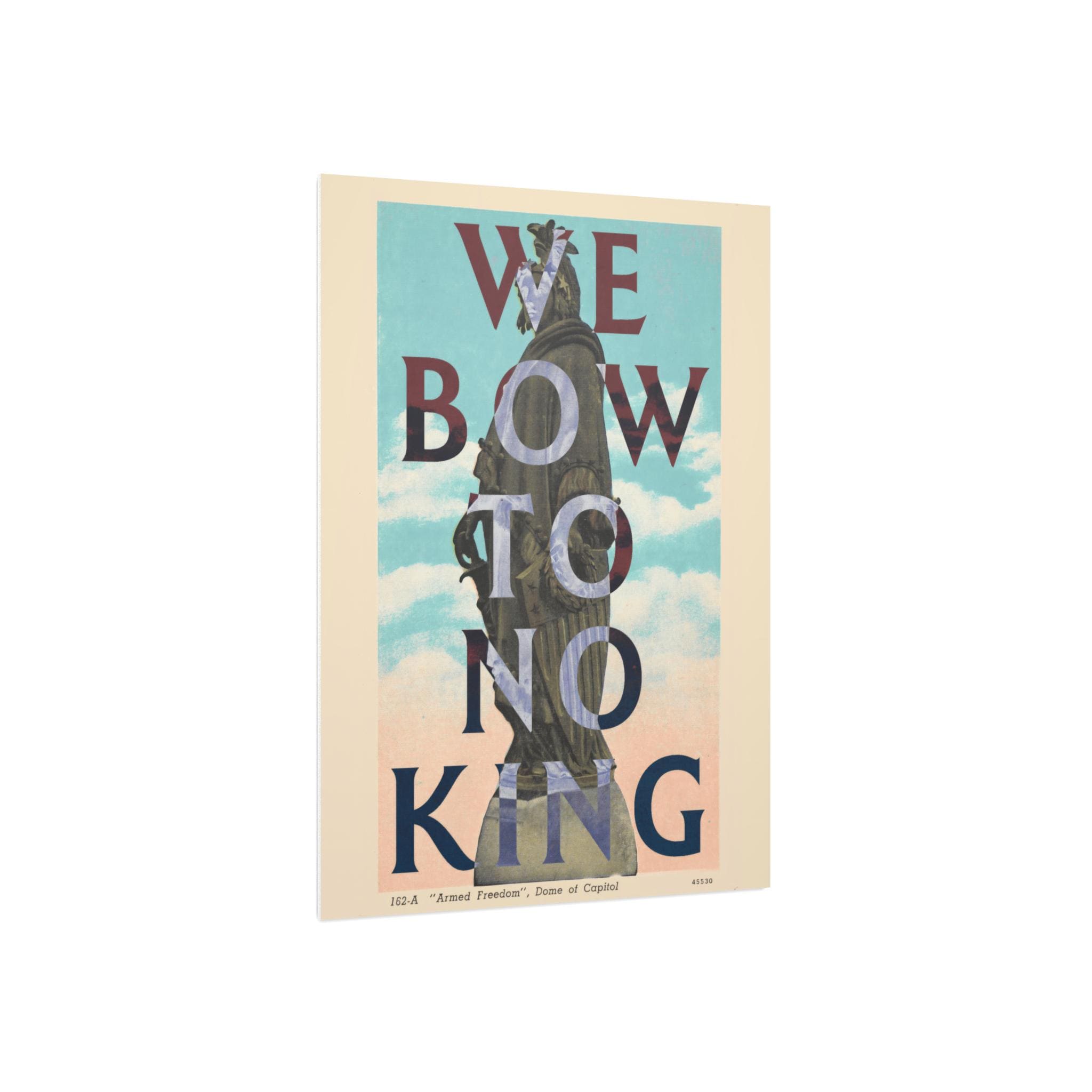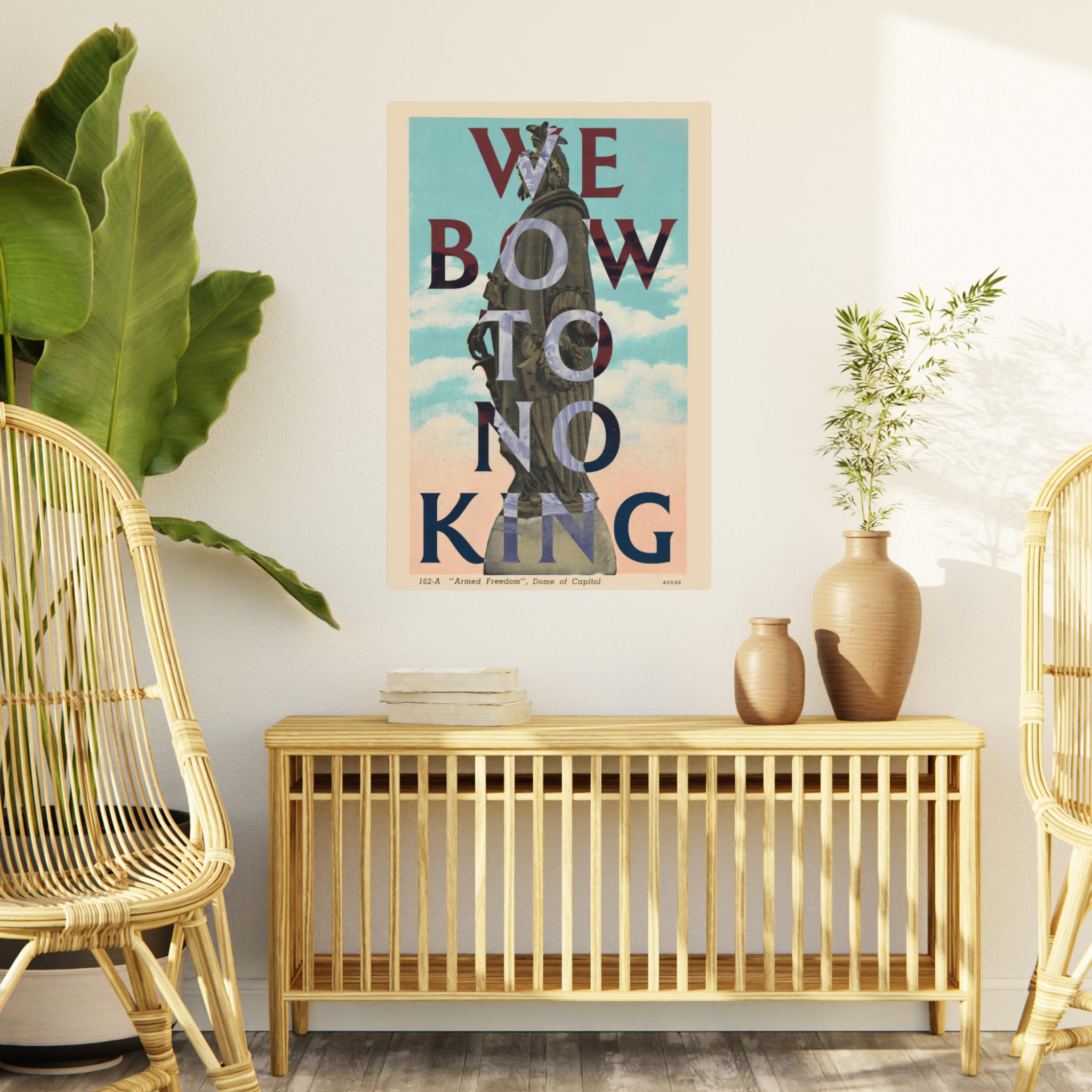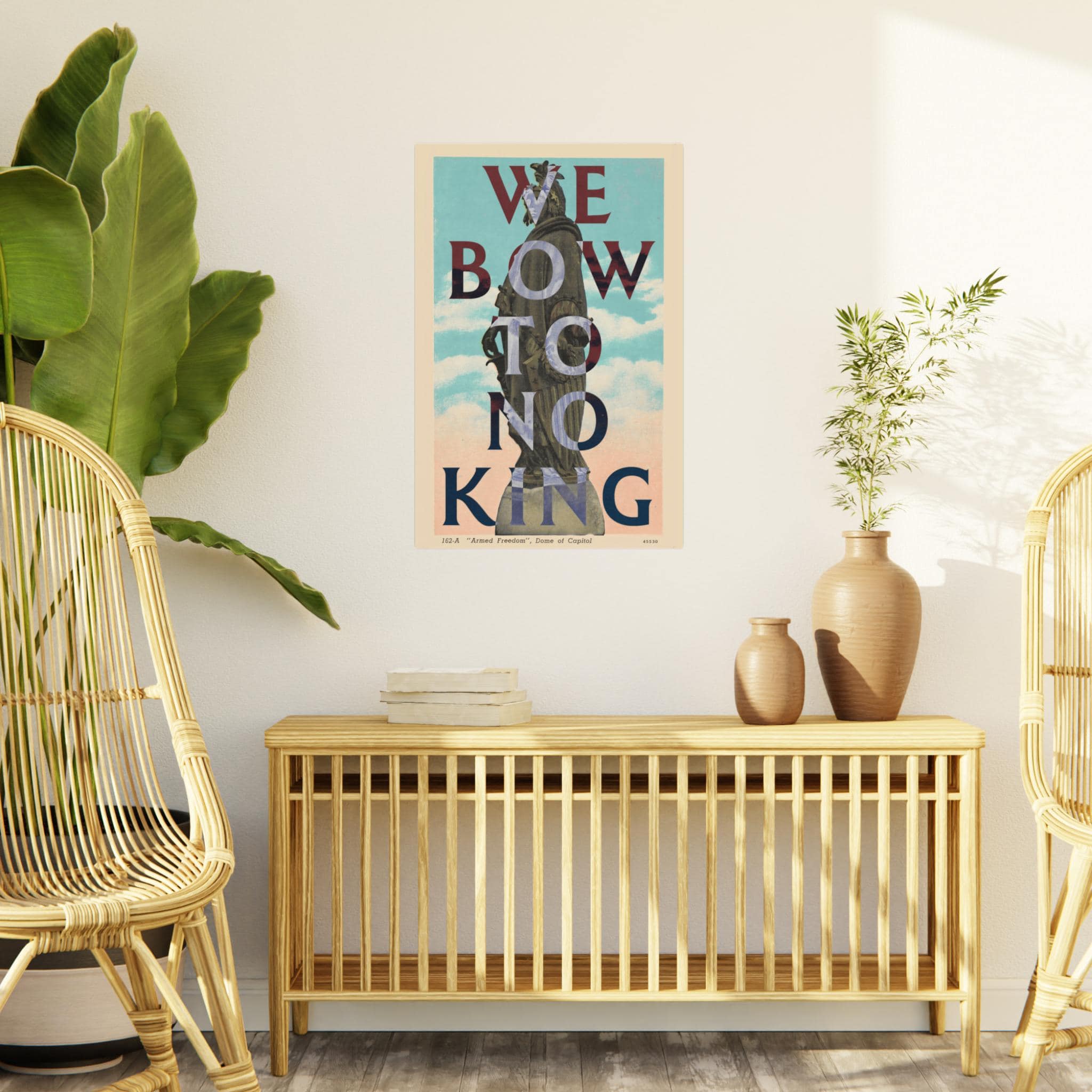 Using the elegant Winsel font, the text "WE BOW TO NO KING" is superimposed, creating a visual effect where the colors of the underlying statue are inverted within the letters. This technique highlights the message, making it an integral part of the image itself. It's a tribute to the core tenet of American democracy: a rejection of monarchy and authoritarian rule.