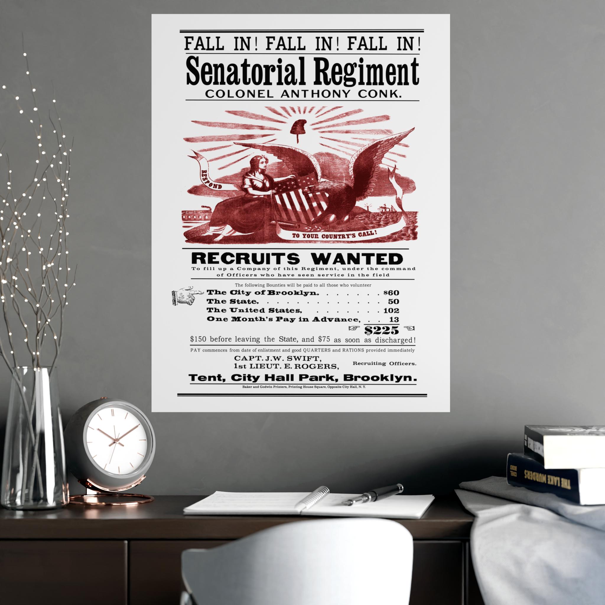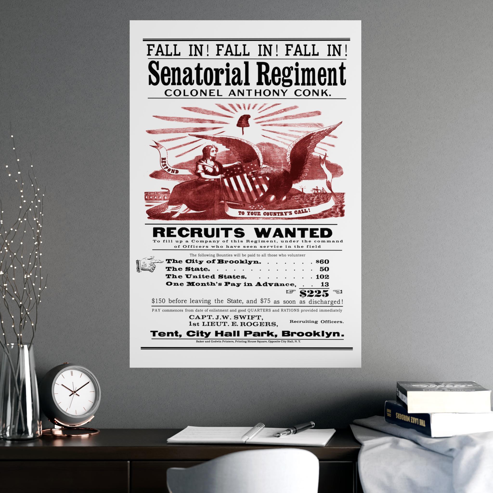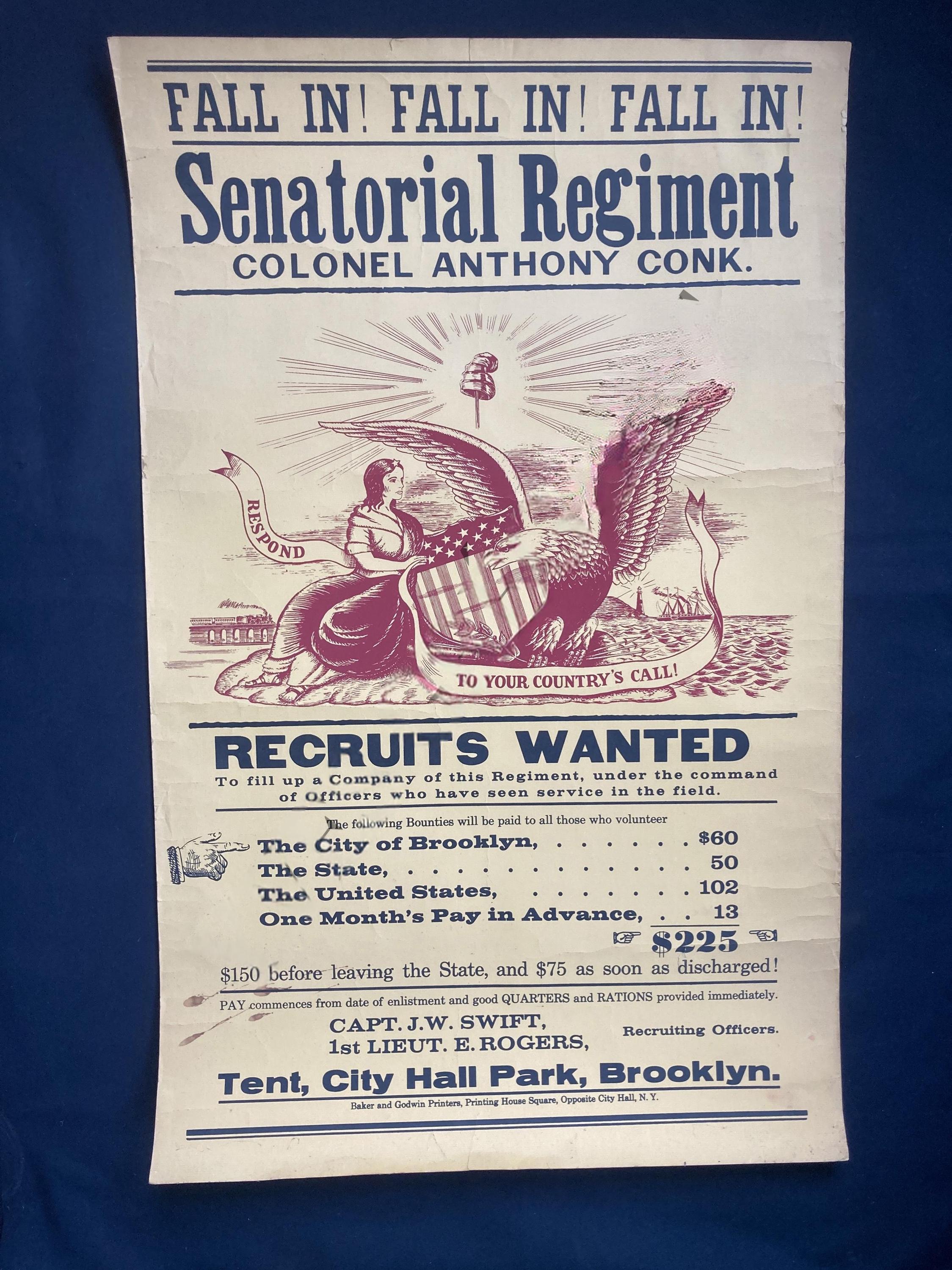 This black and white poster with a vibrant, red-ink illustration is more than just a call to arms; it's a fascinating window into the life of Civil War-era New York. Reproduced from an original by the esteemed printers Baker & Godwin, it sought to enlist men into the "Senatorial Regiment" under Colonel Anthony Conk with a powerful combination of patriotic imagery and a truly impressive bounty.