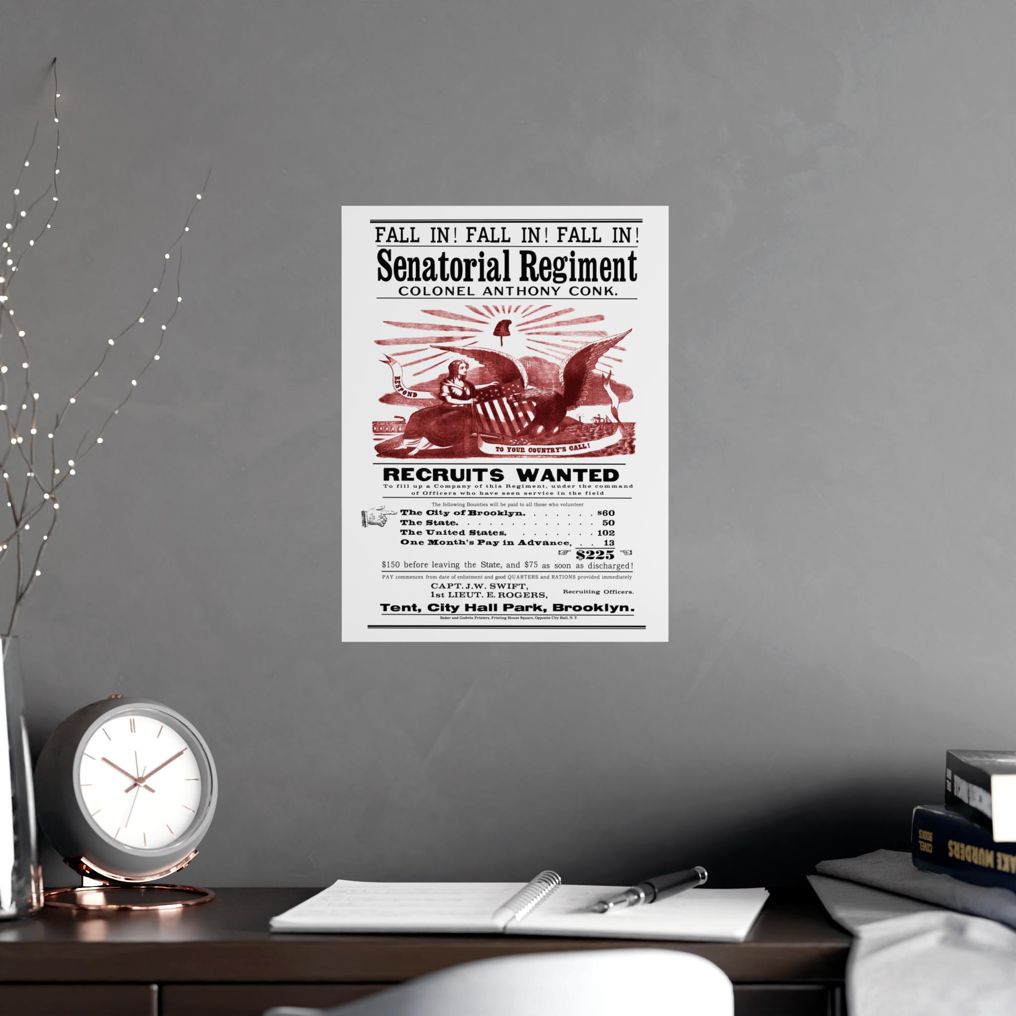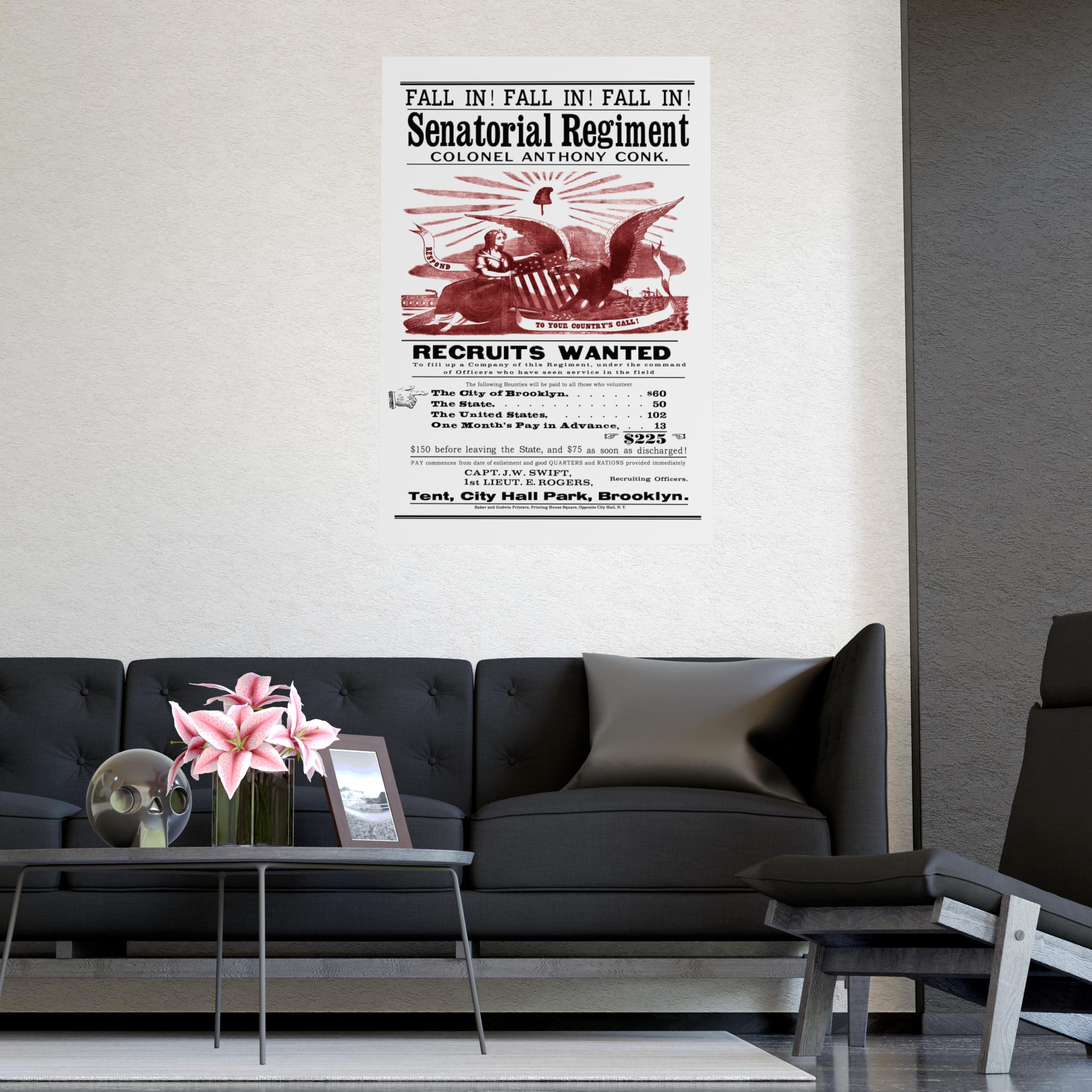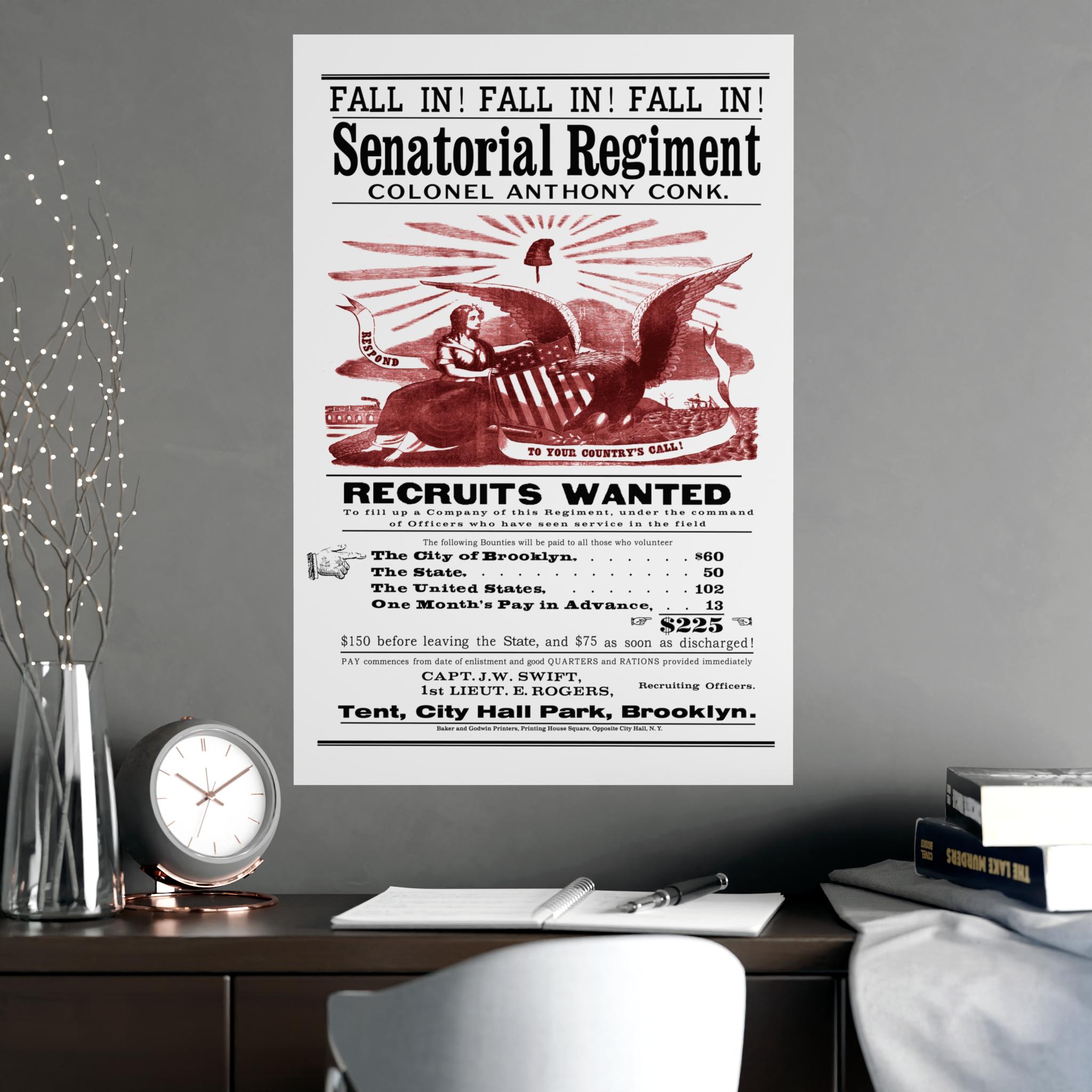 This black and white poster with a vibrant, red-ink illustration is more than just a call to arms; it's a fascinating window into the life of Civil War-era New York. Reproduced from an original by the esteemed printers Baker & Godwin, it sought to enlist men into the "Senatorial Regiment" under Colonel Anthony Conk with a powerful combination of patriotic imagery and a truly impressive bounty.
