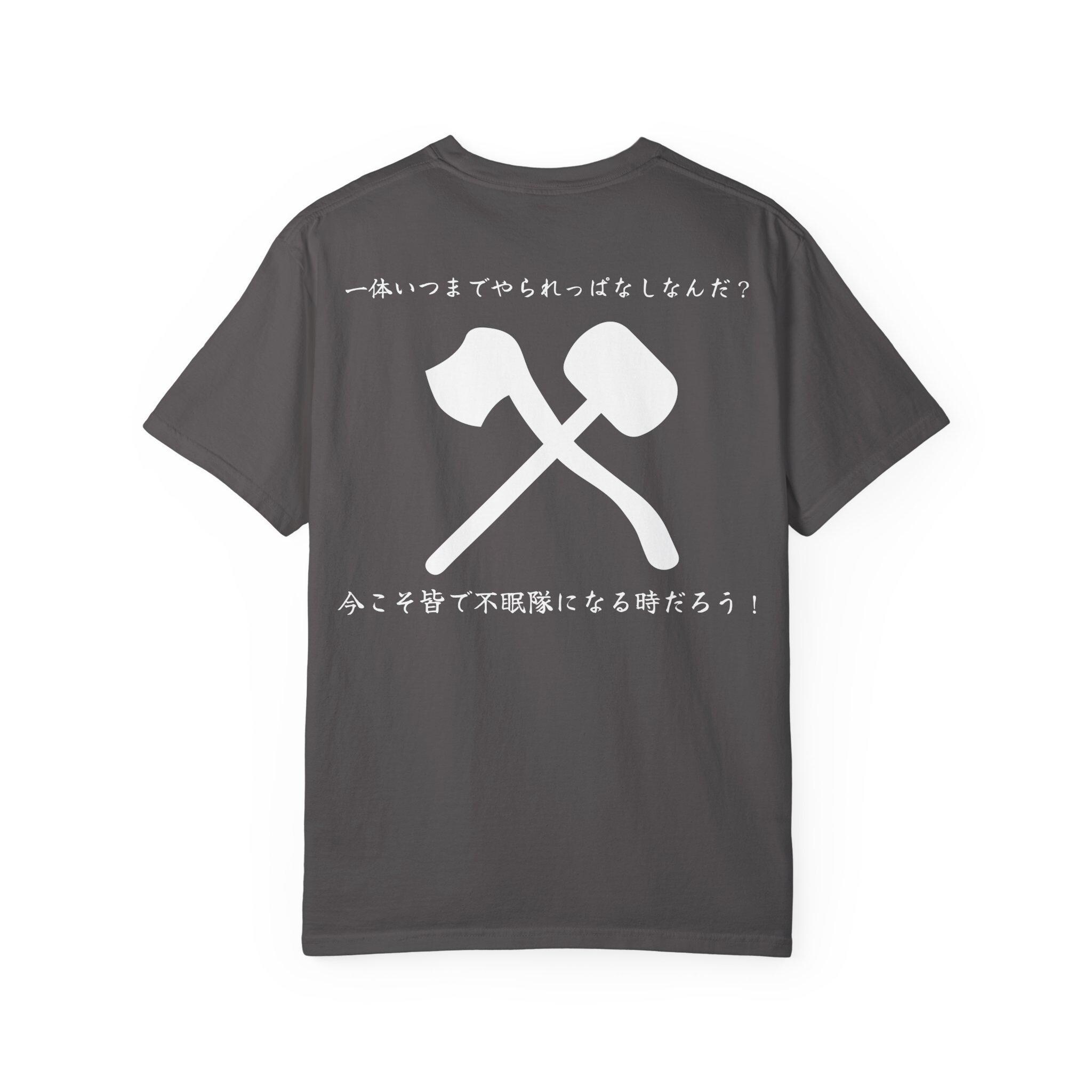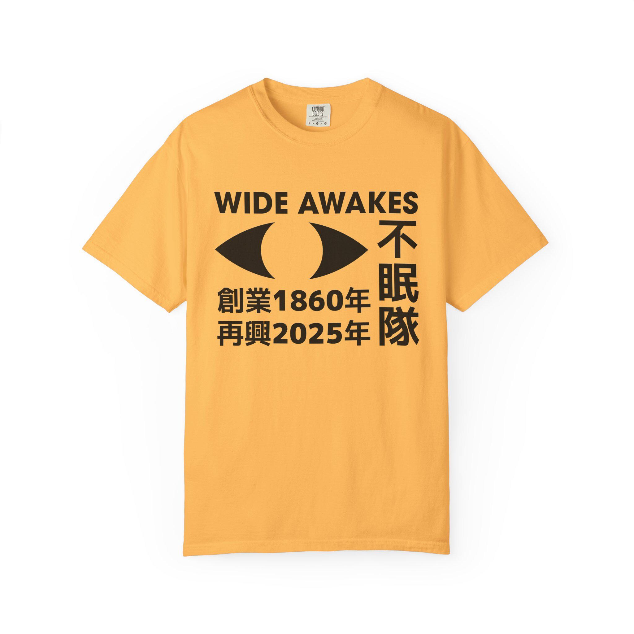The Back: The voice of the movement. The crossed axe and mallet evoke Abraham Lincoln's "Railsplitter" persona—a symbol of his connection to the common person. Above and below is a soul-stirring and fiery rhetorical question asked at an 1860 Wisconsin rally of Wide-Awakes, related to us by historians: "How long must they kick us, before we shall all be Wide-Awakes?" We chose to render this as: "一体いつまでやられっぱなしなんだ?今こそ皆で不眠隊になる時だろう!(literally "Just how long are we going to keep taking this abuse? Now is the time we should all become Wide-Awakes, surely!") It is a call to action for the vigilant, its intensity and righteousness both timeless and cross-cultural. This is more than a shirt; it's the uniform for the modern-day Wide-Awakes.