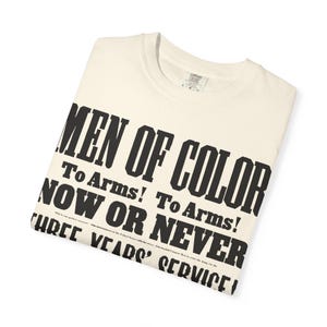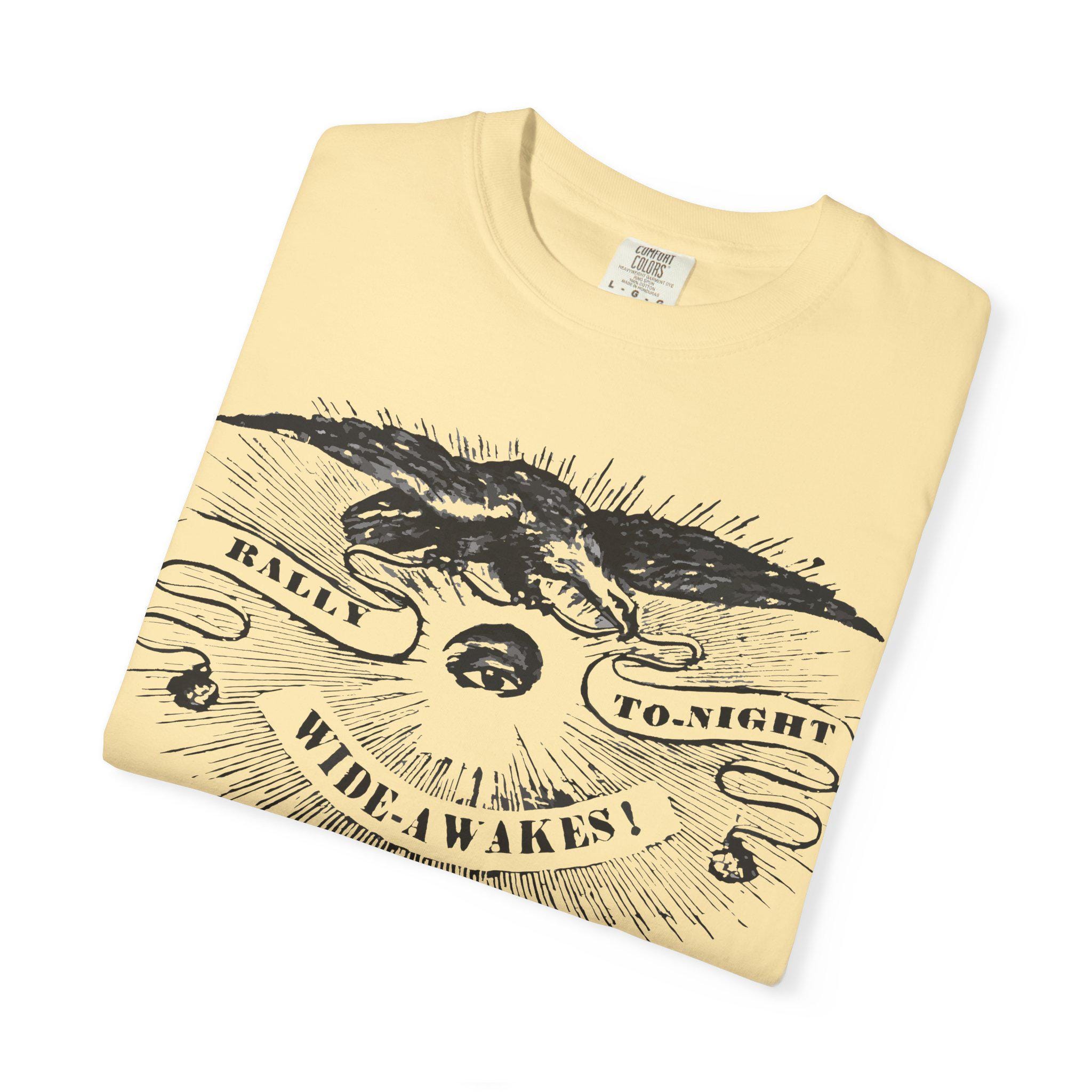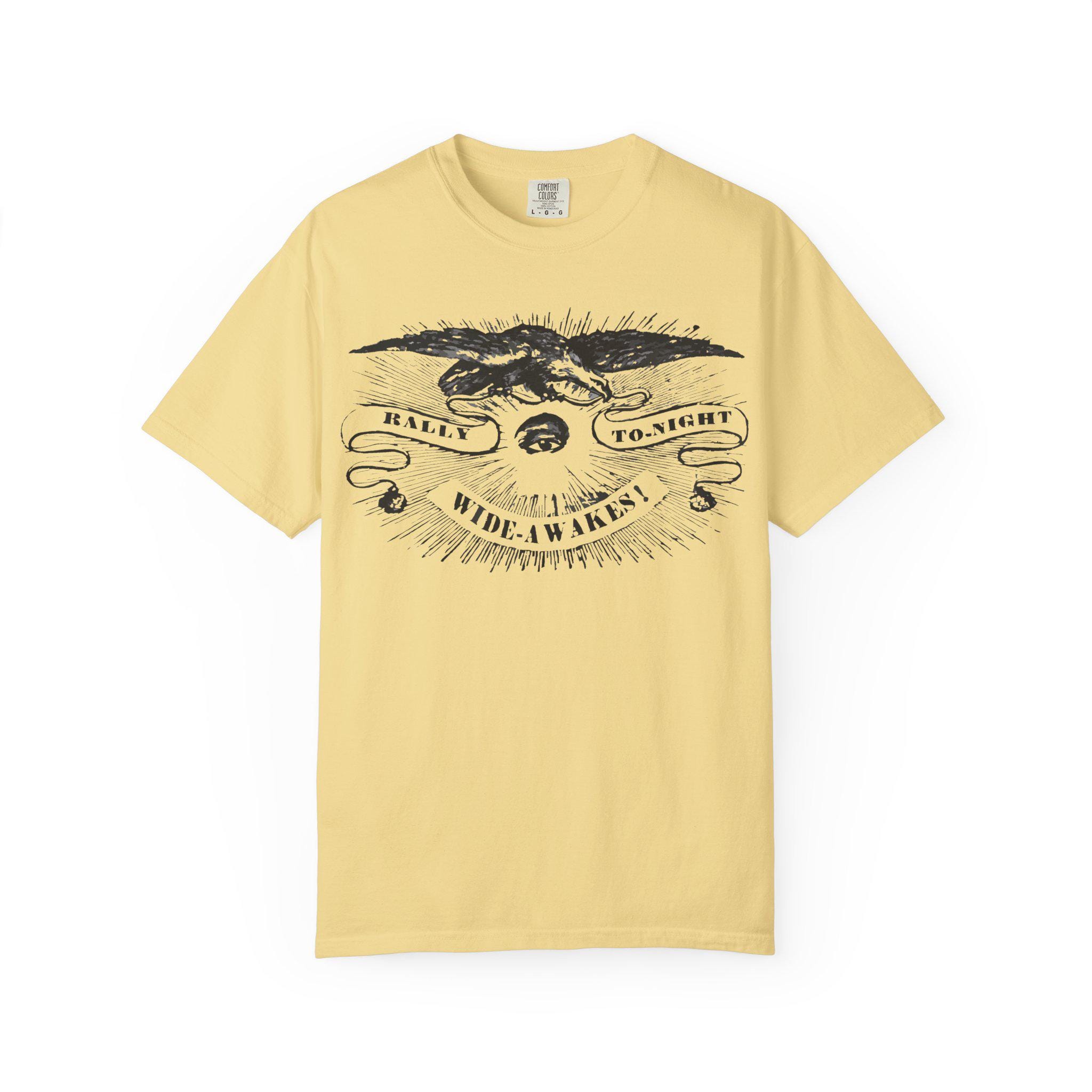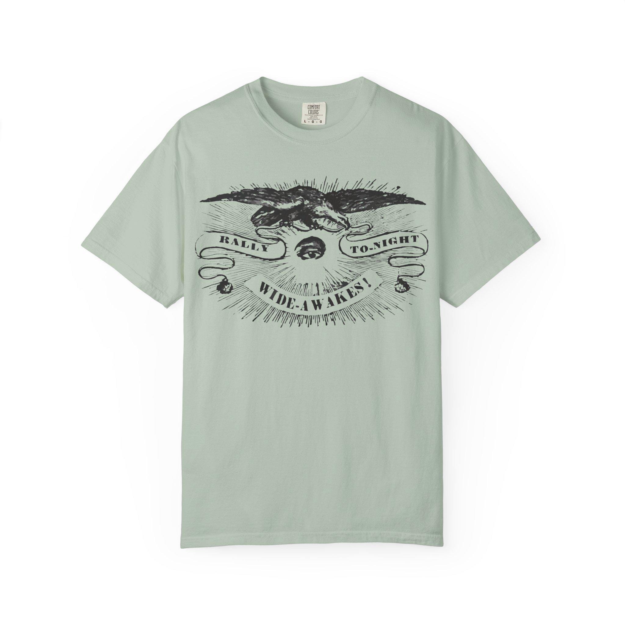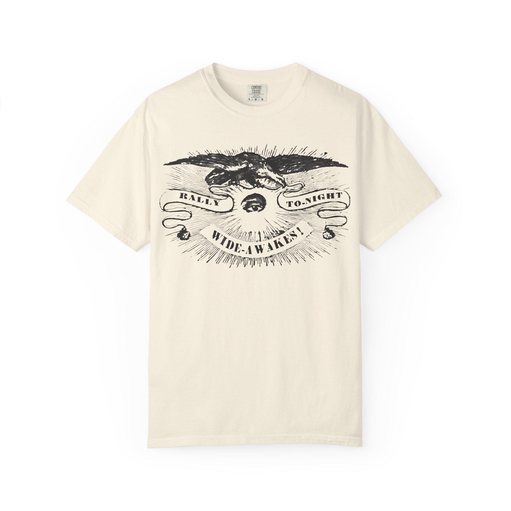 Answer the call with this powerful t-shirt, featuring an authentic political announcement from over 160 years ago. The all-seeing eye of vigilance. The eagle of the Republic. This striking etched illustration captures the passion and urgency of the Wide Awakes, the anti-slavery youth movement that helped elect Abraham Lincoln.